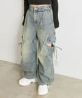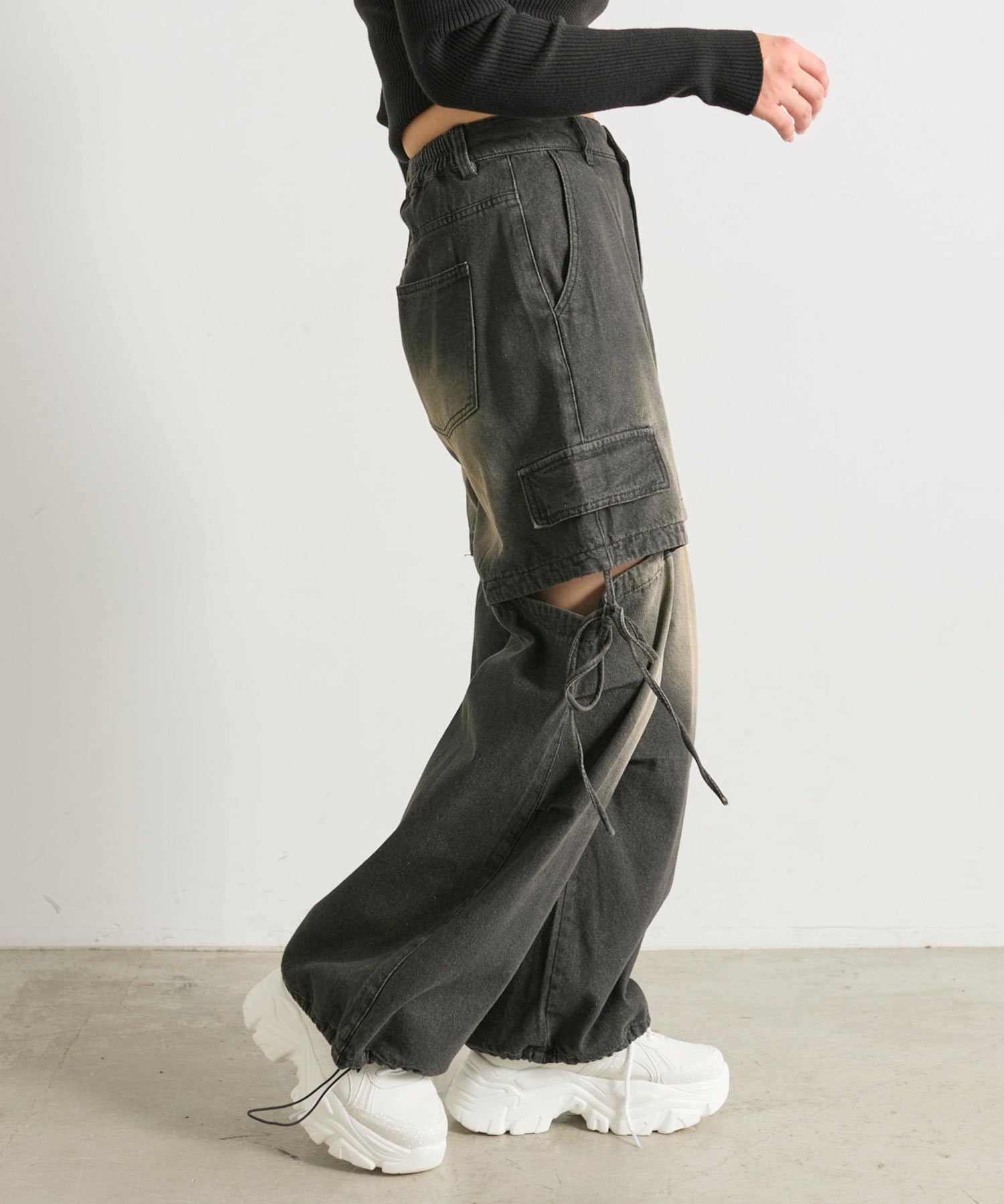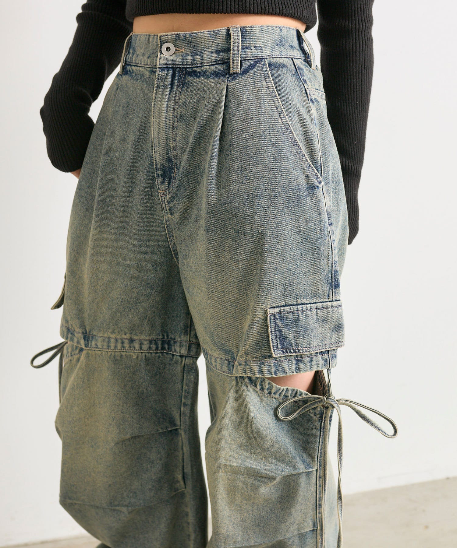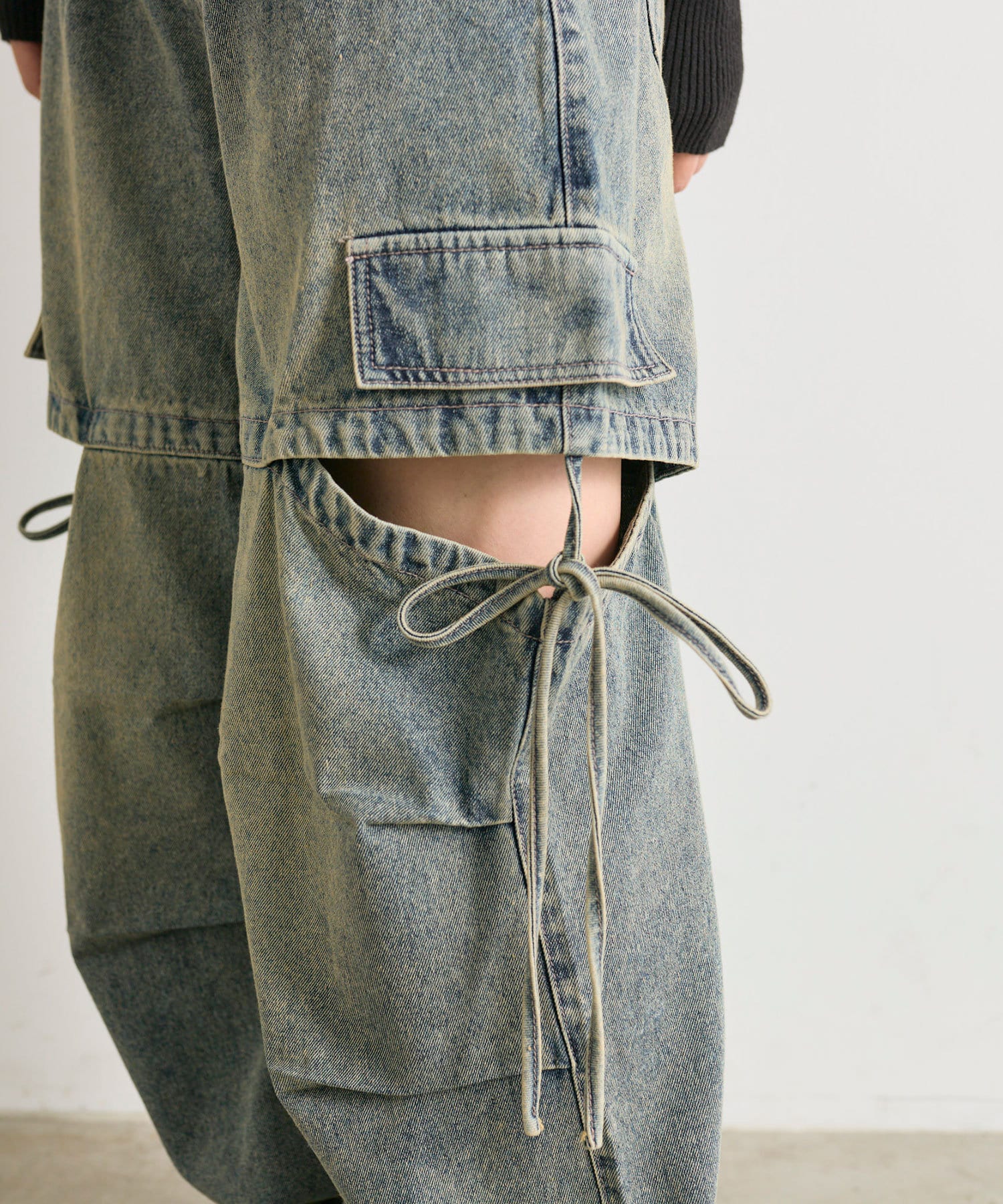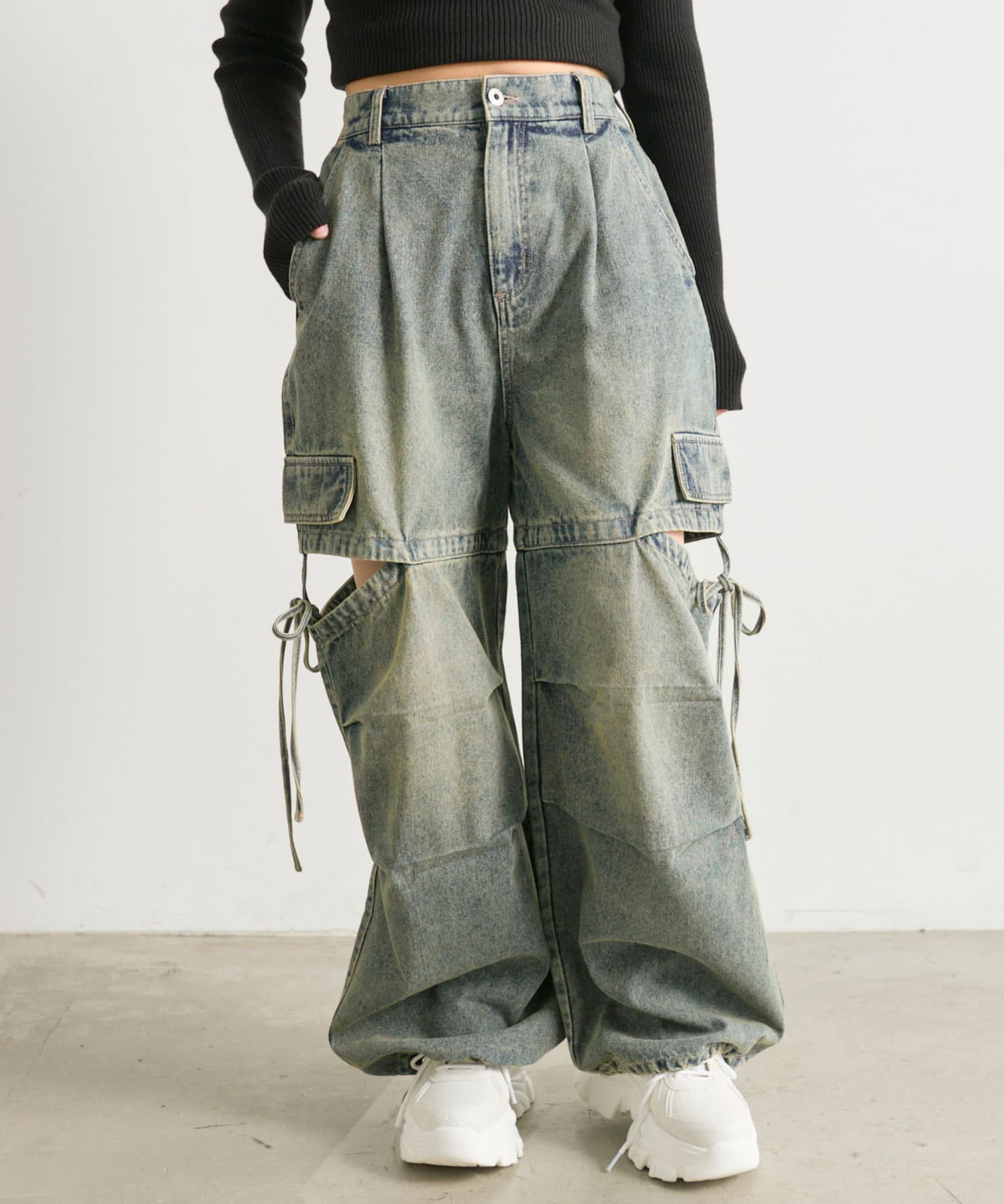 サイドの肌見せがポイントのデニムカーゴパンツ