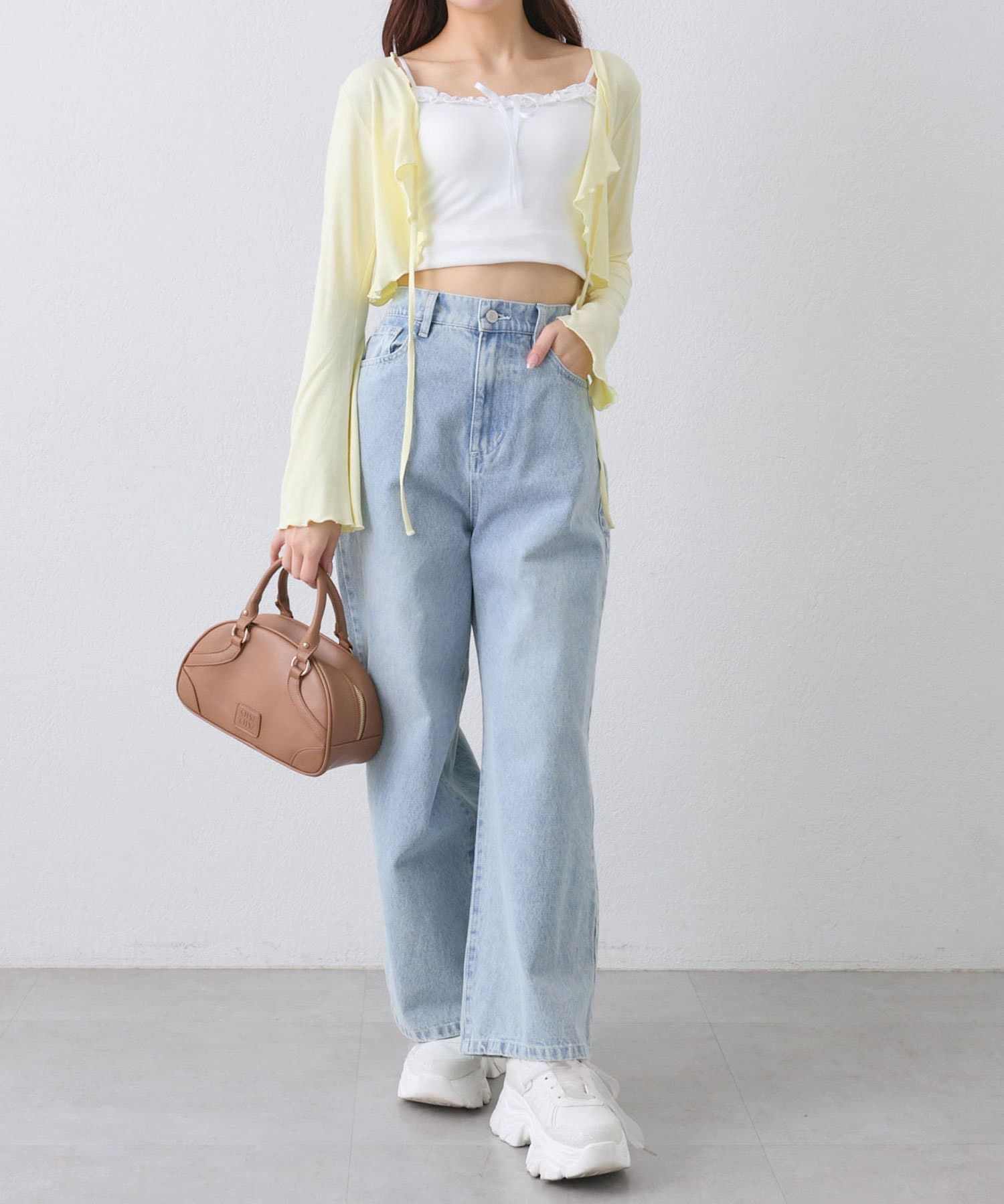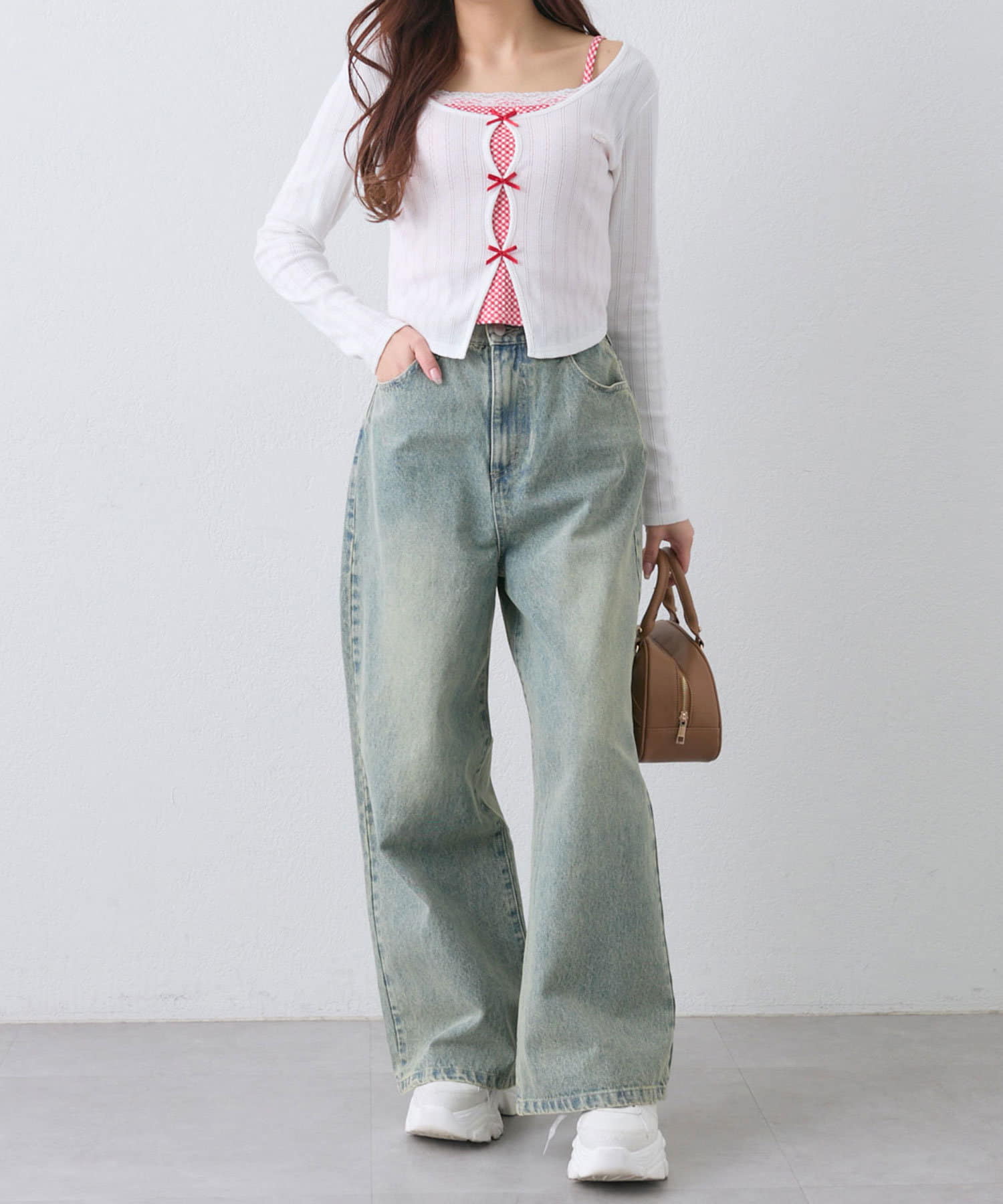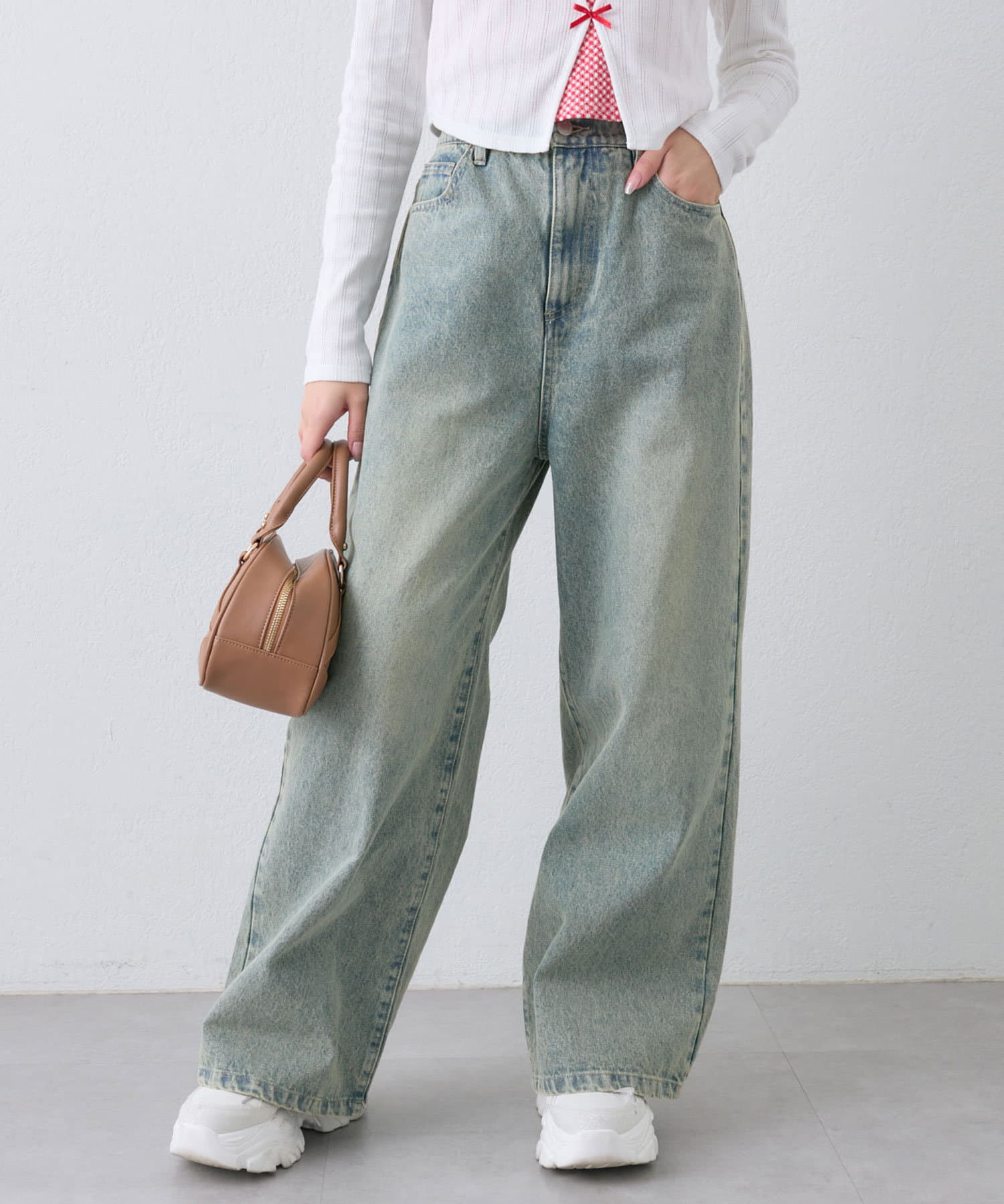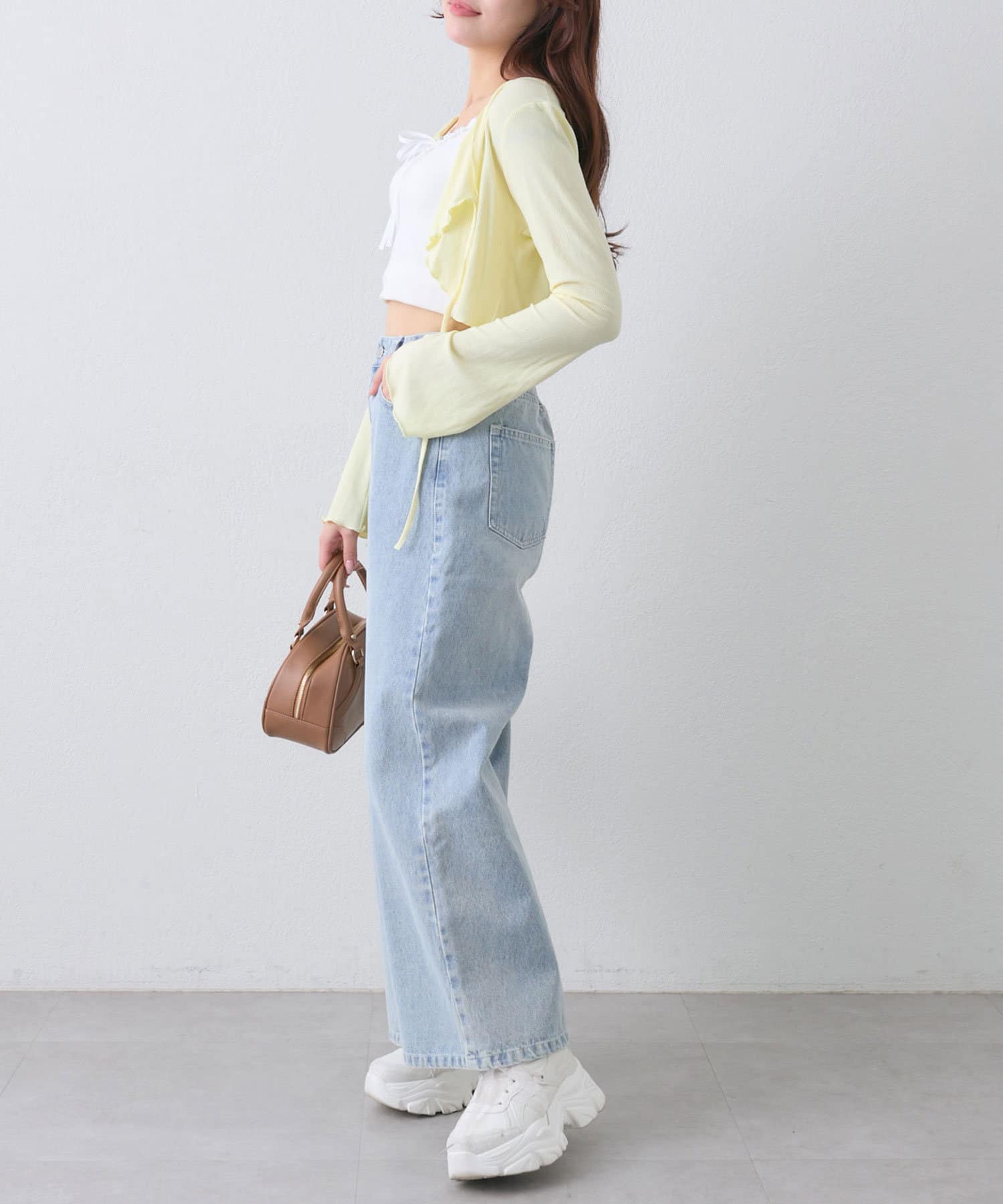 ・クロップド丈のトップスで合わせるとトレンド感のある着こなしになります。