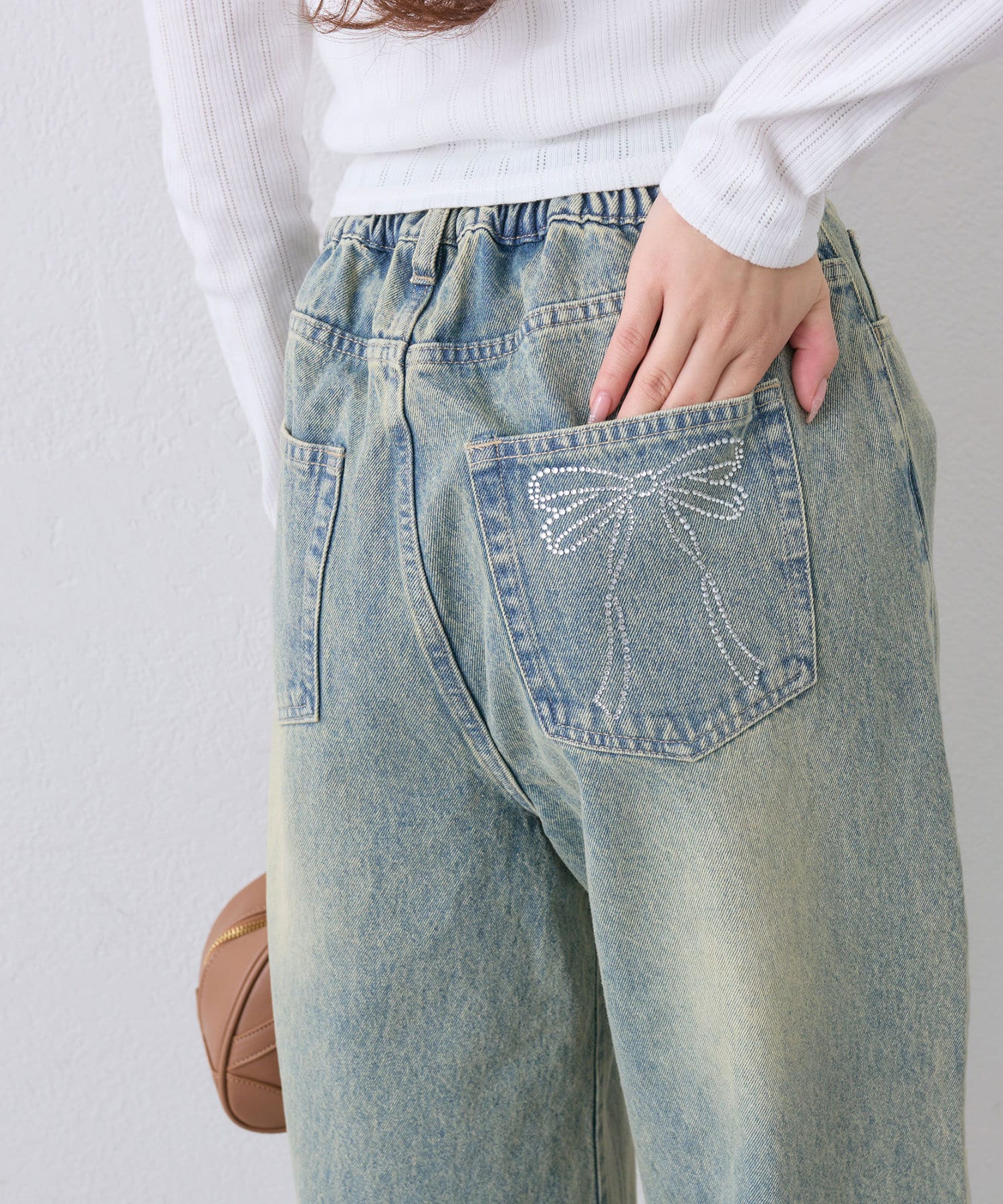・サックスはポケットにリボン刺繍、ベージュはダメージ加工、ブルー系はポケットにリボンのストーンが施されています。