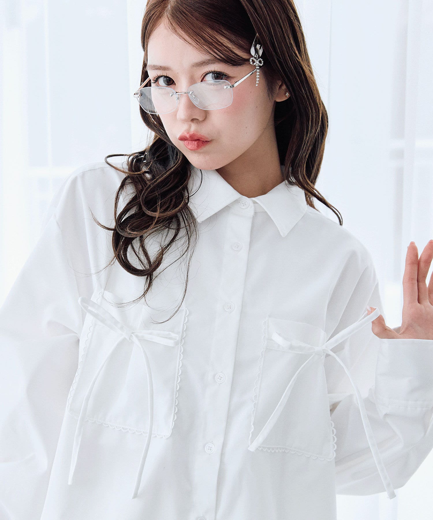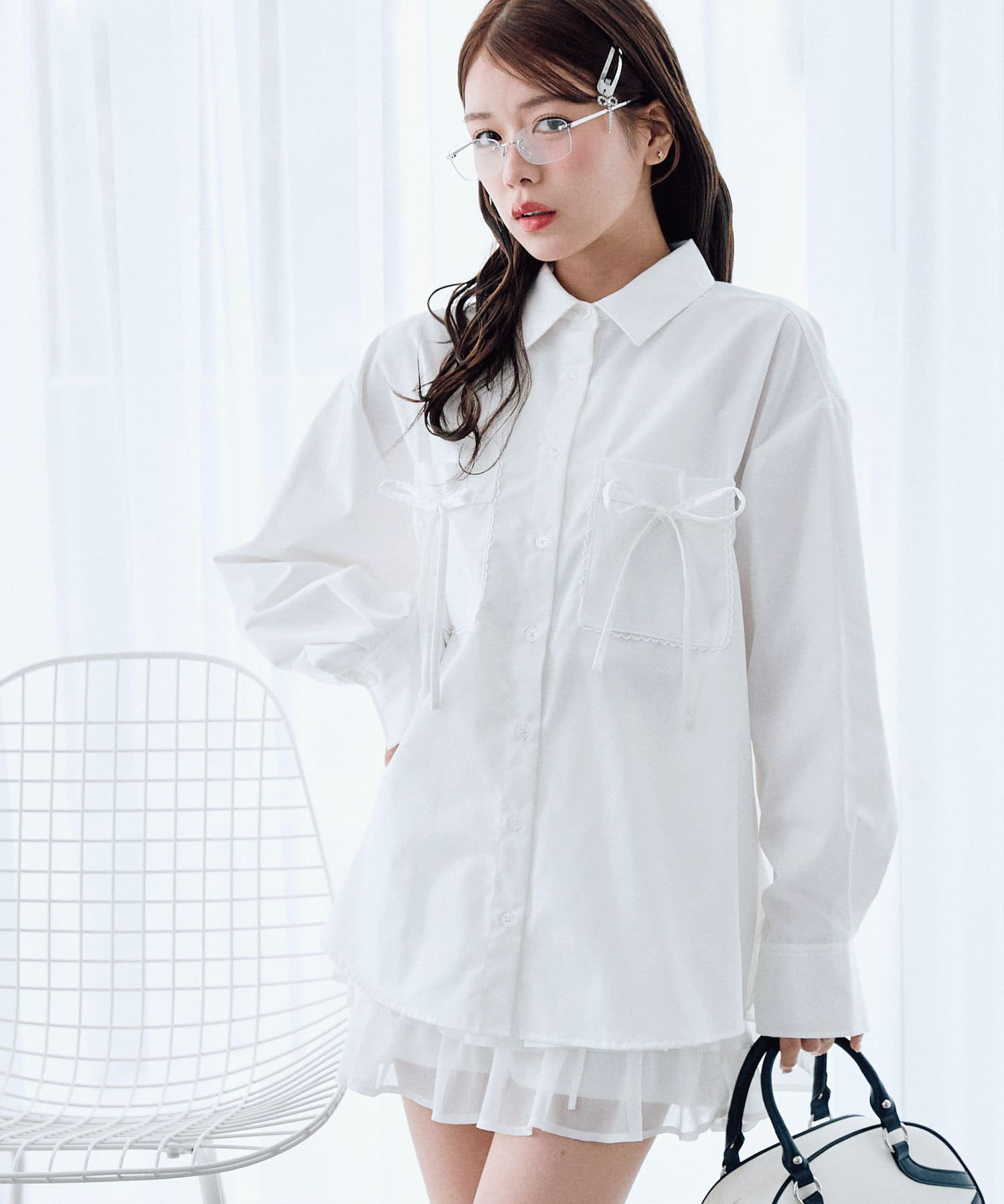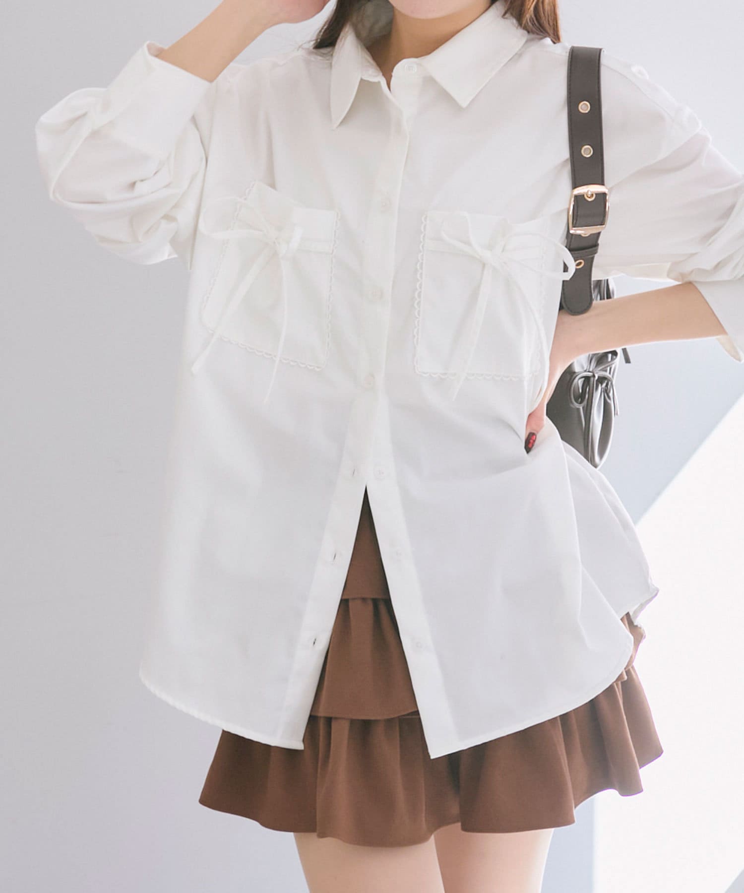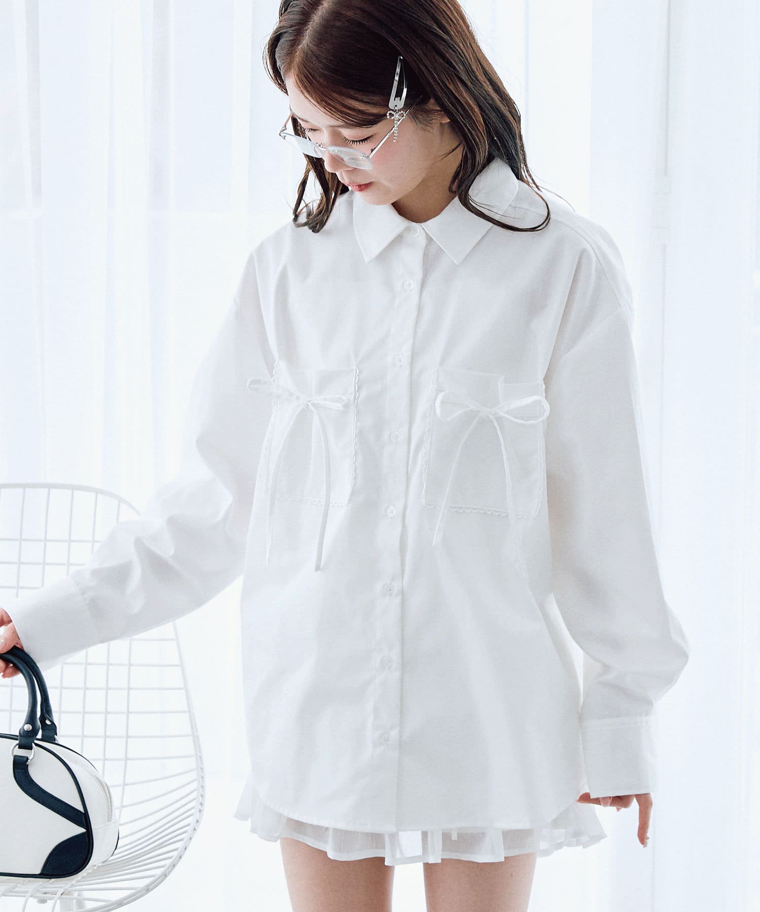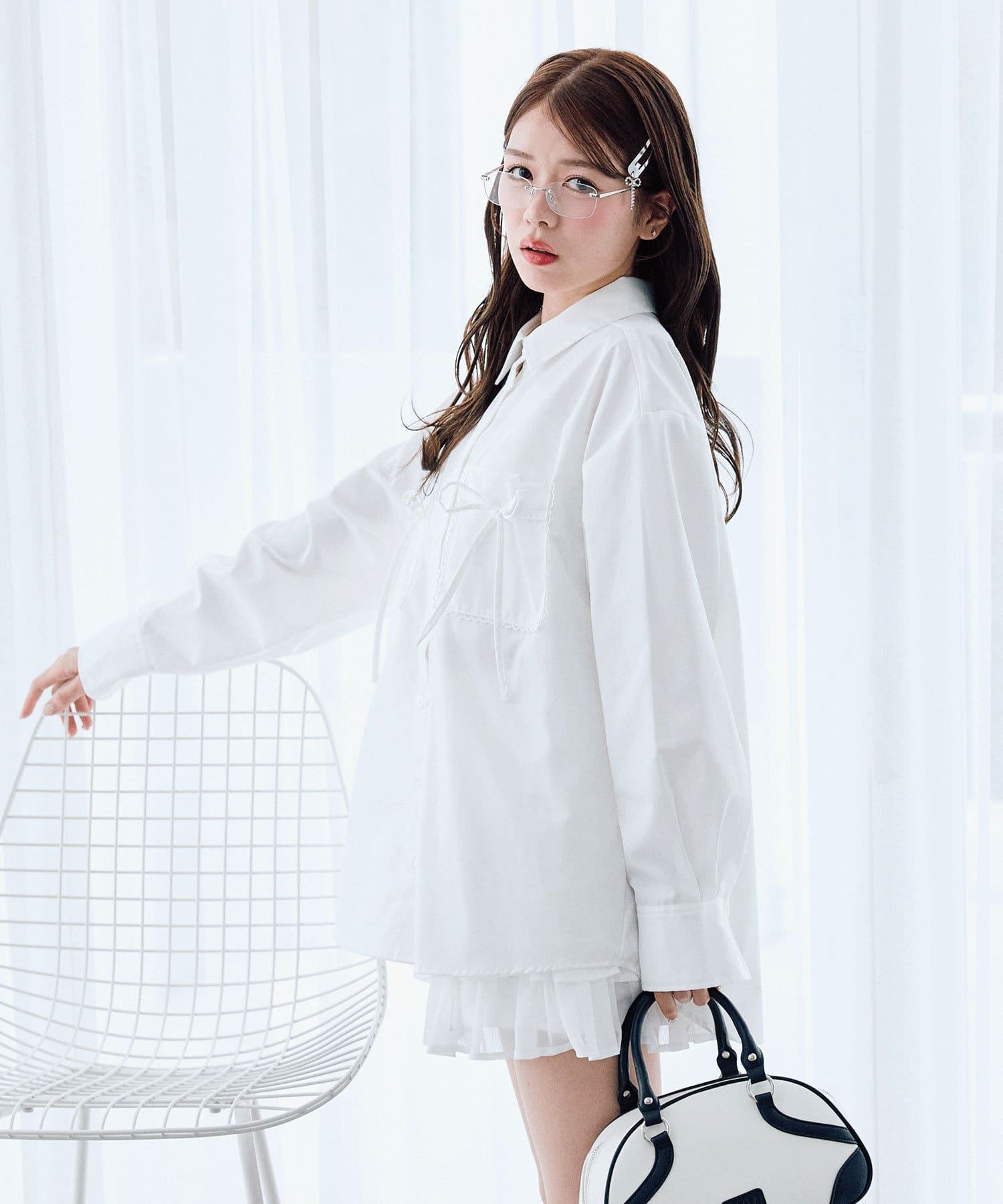 ・ポケット部分にリボンを施し、程よい甘さがプラスされたオーバーサイズのシャツ。