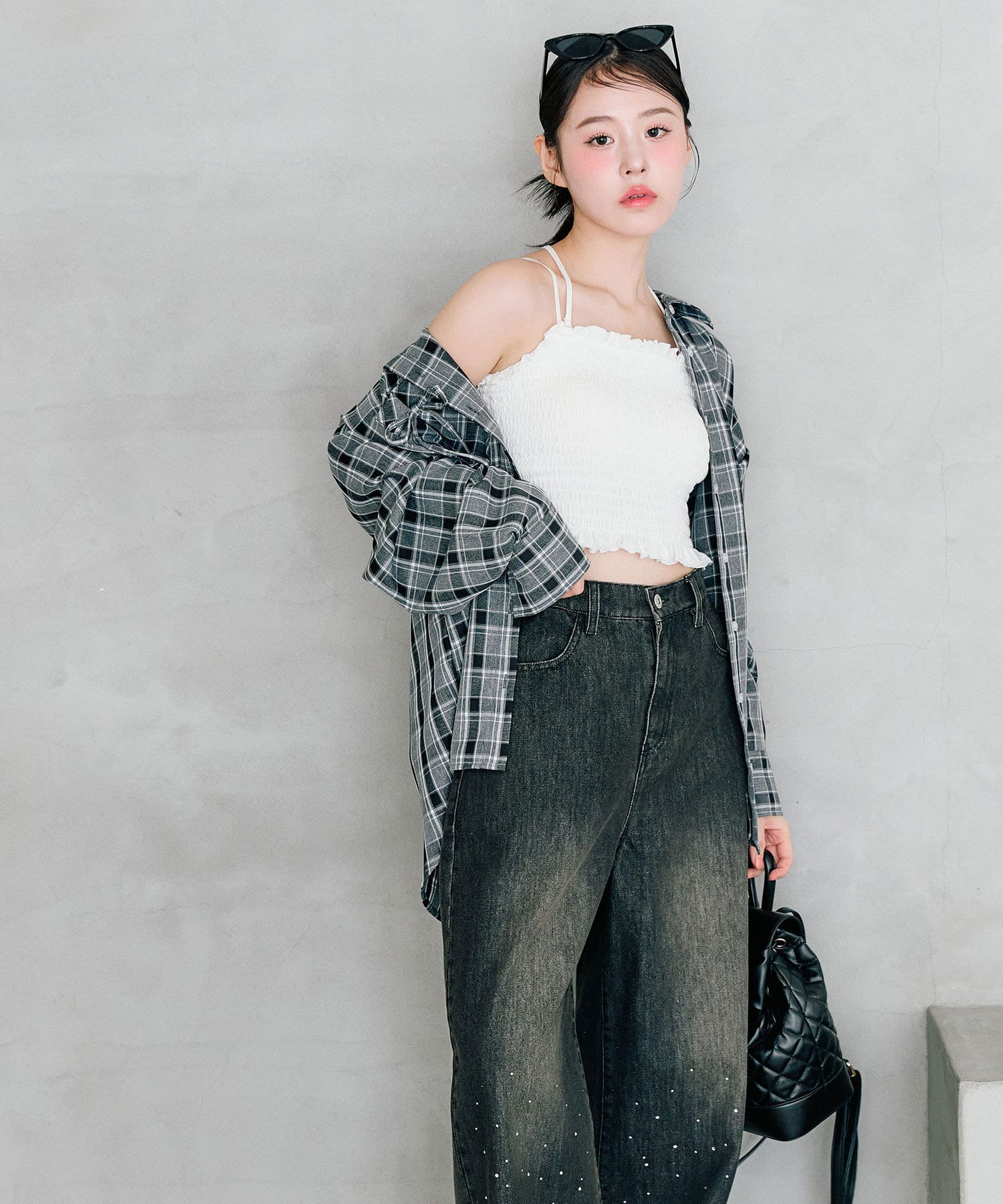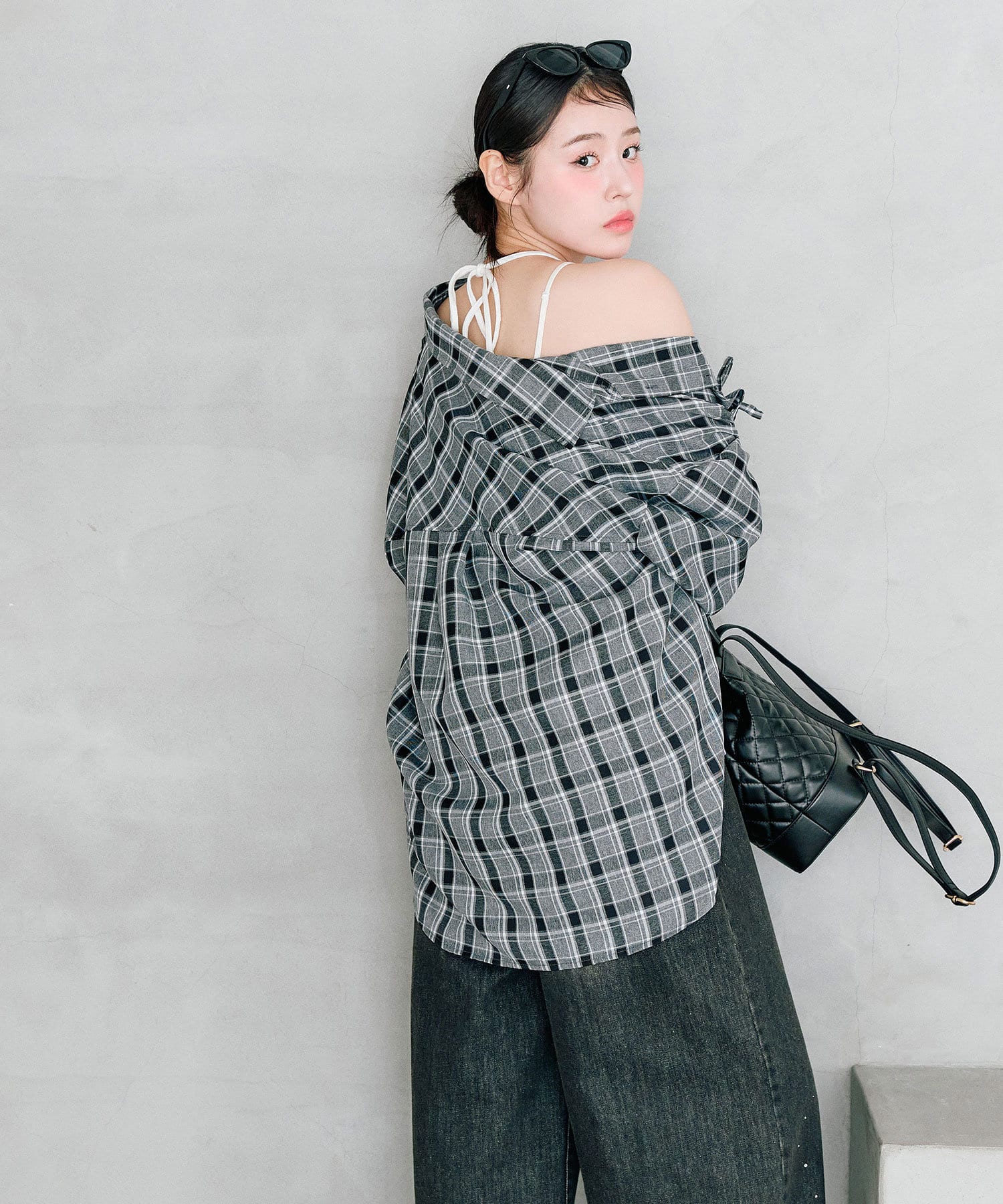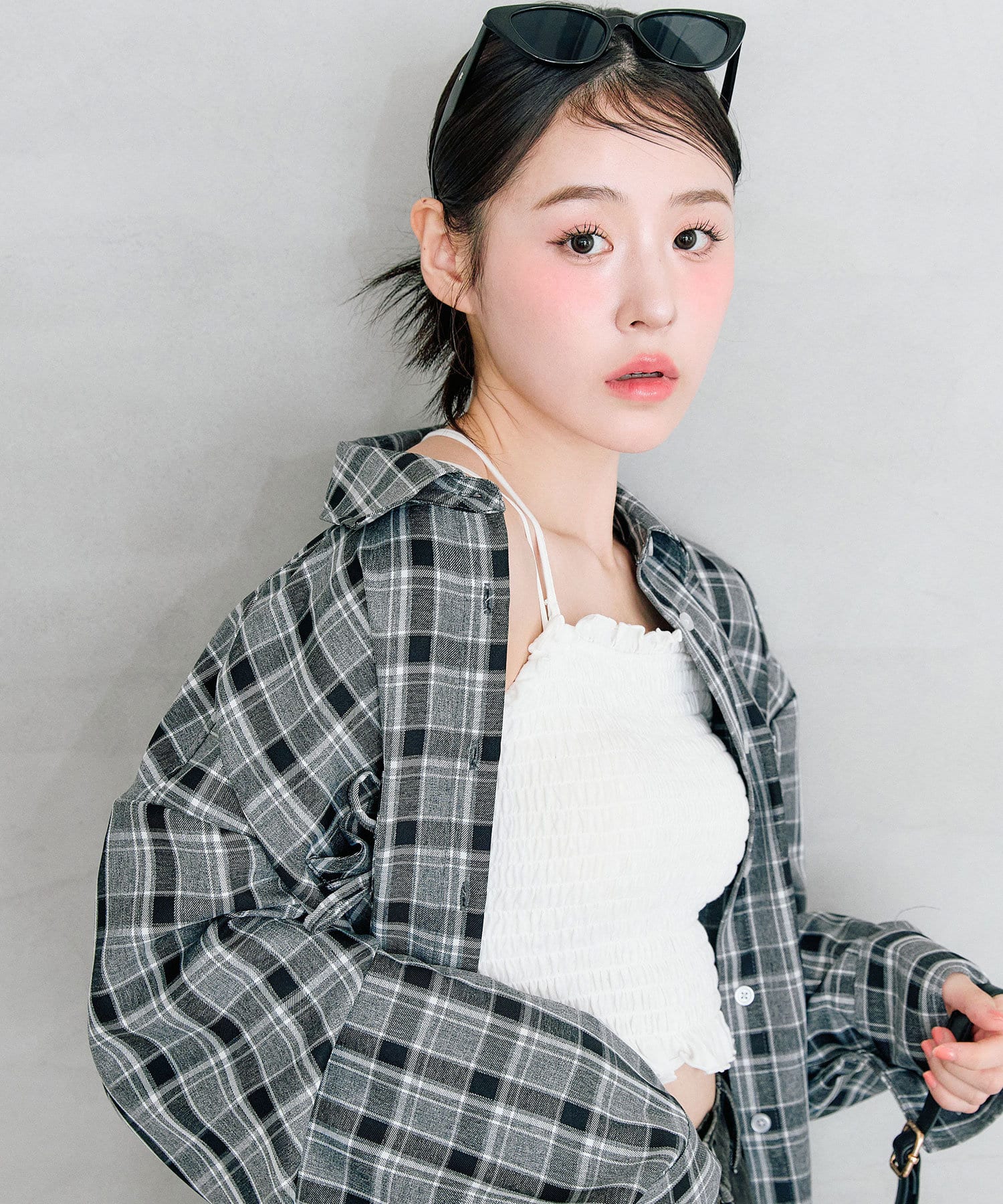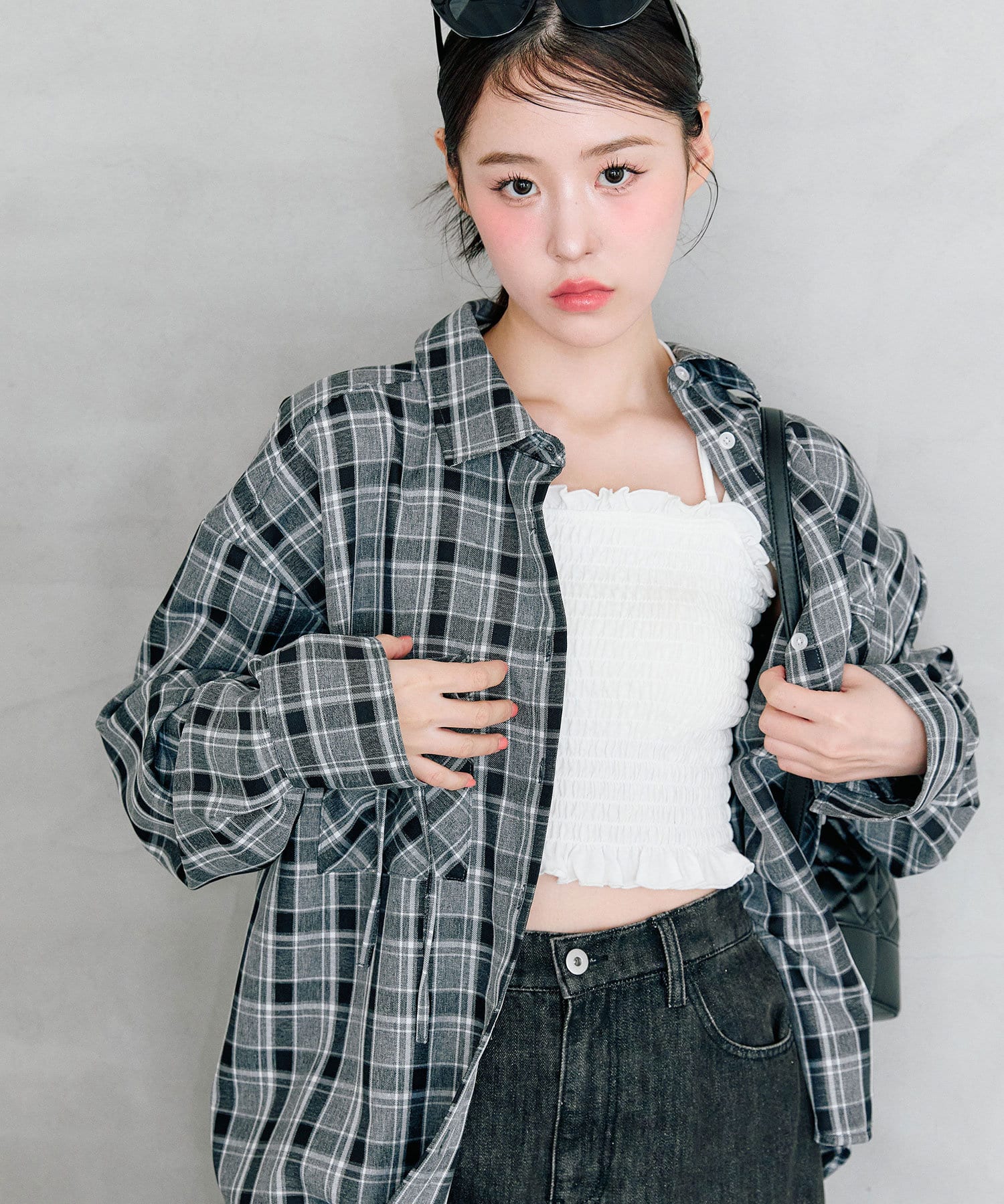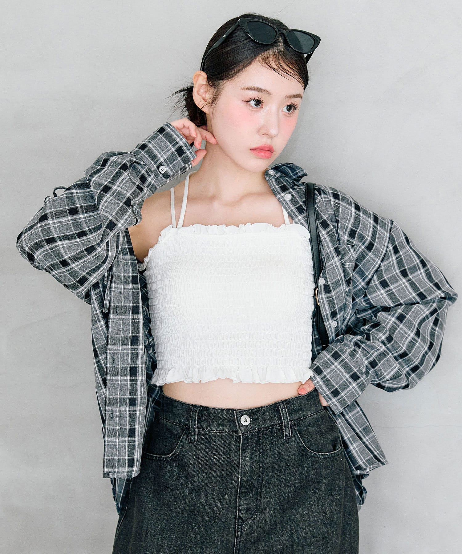 ・カップ付きインナーに前を開けて羽織った大人っぽコーデもかわいいです。