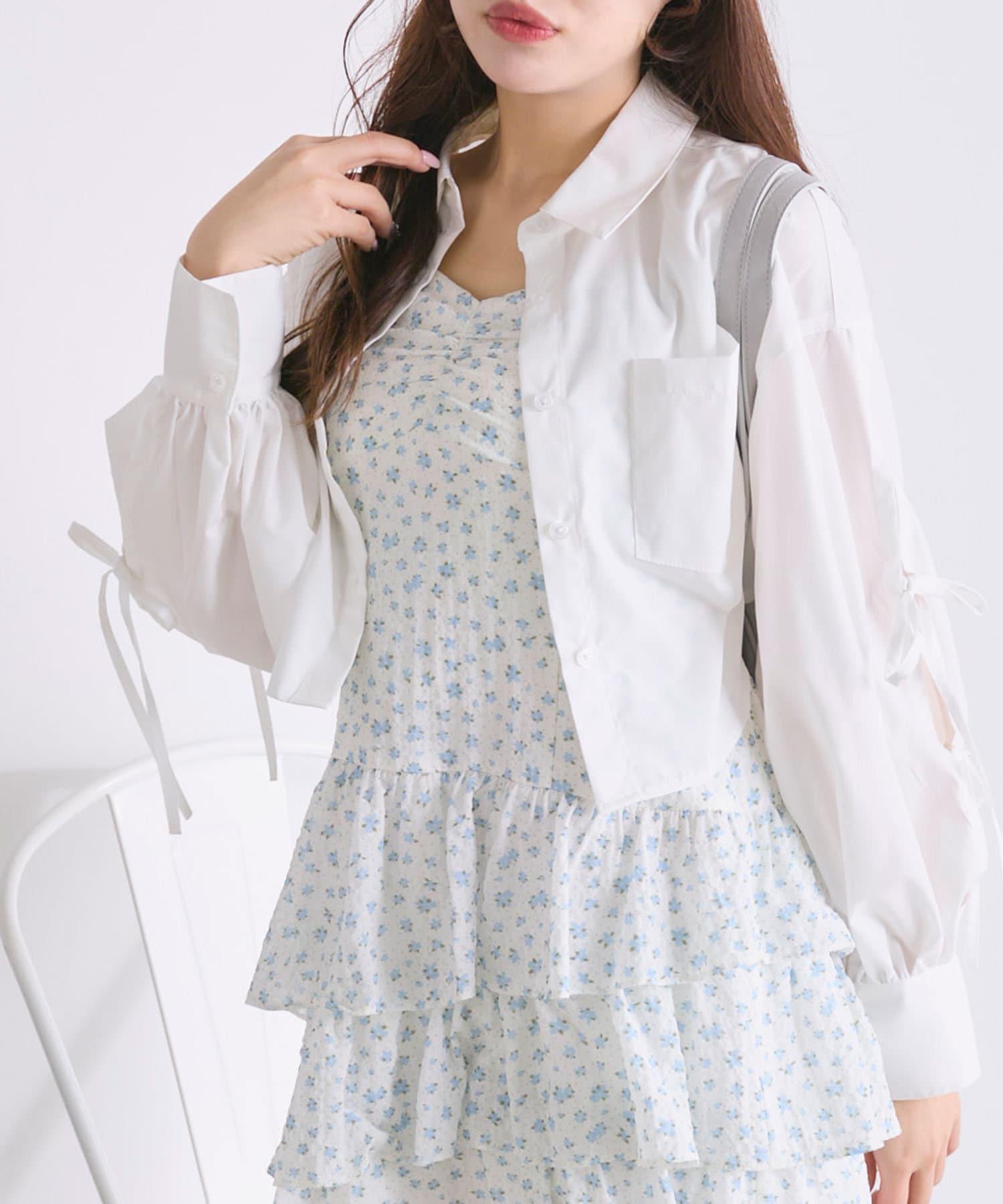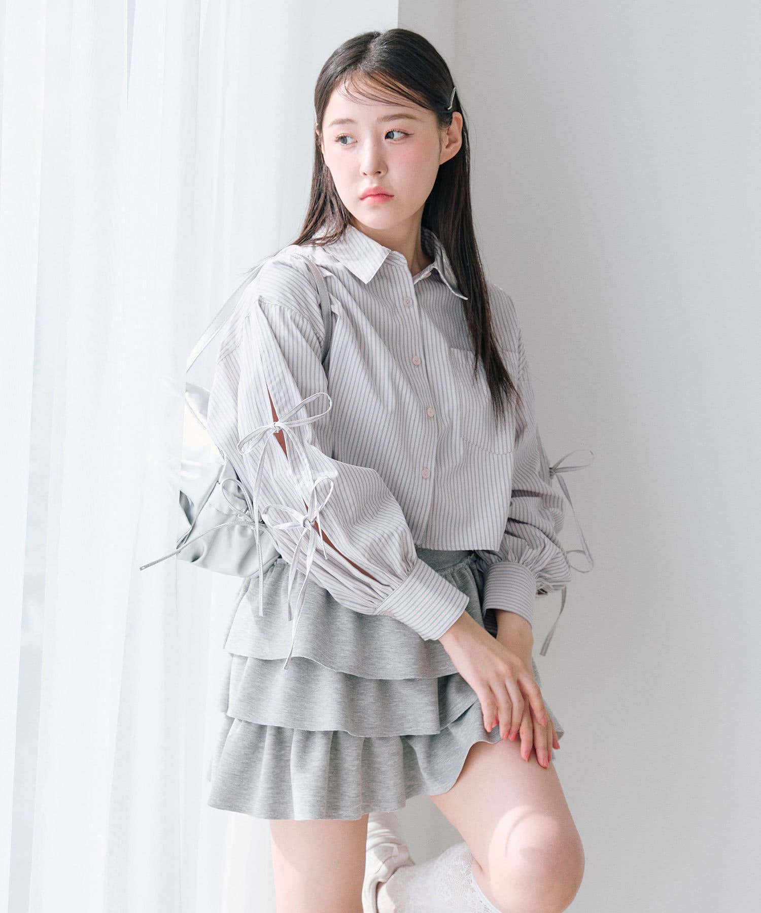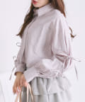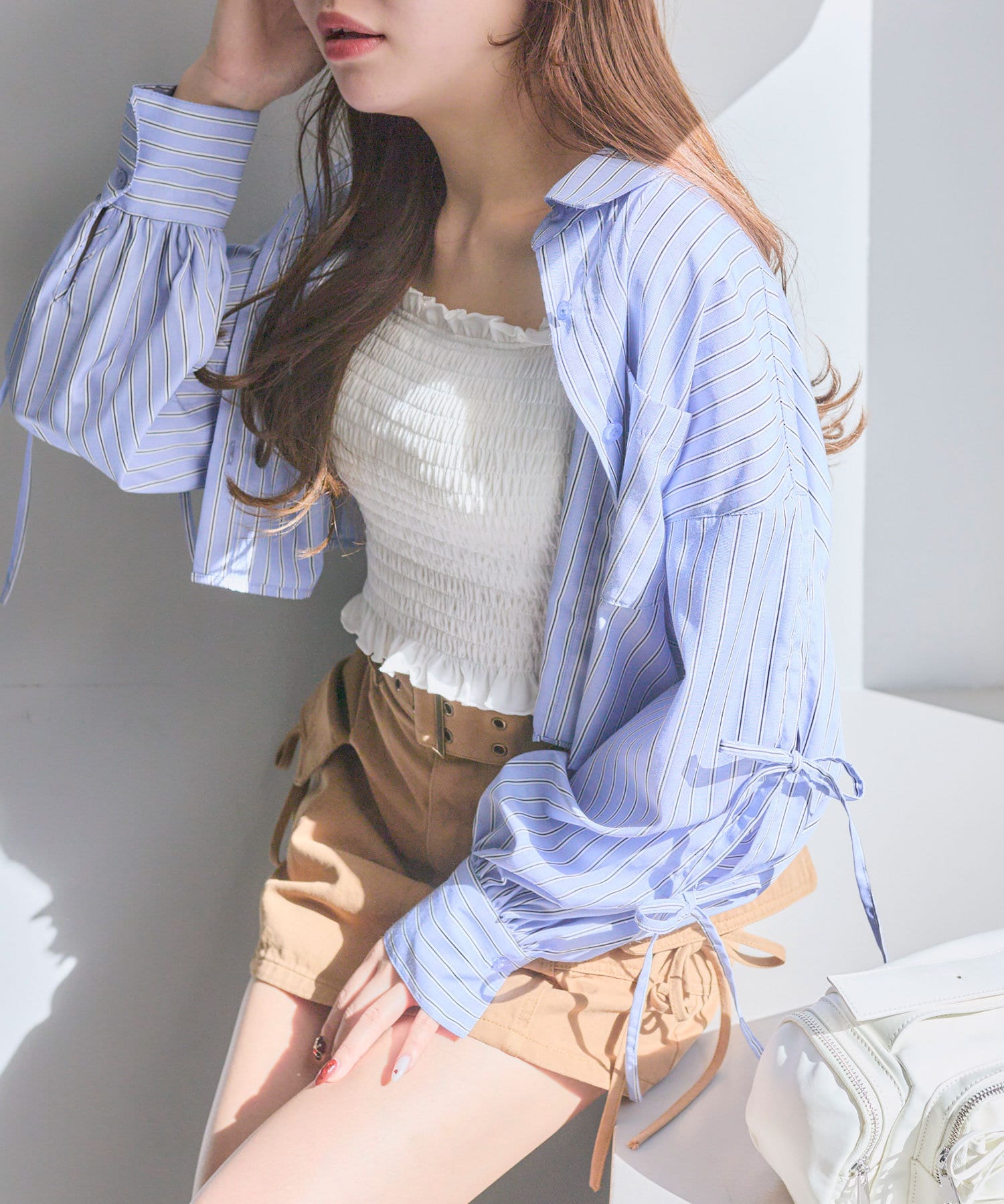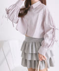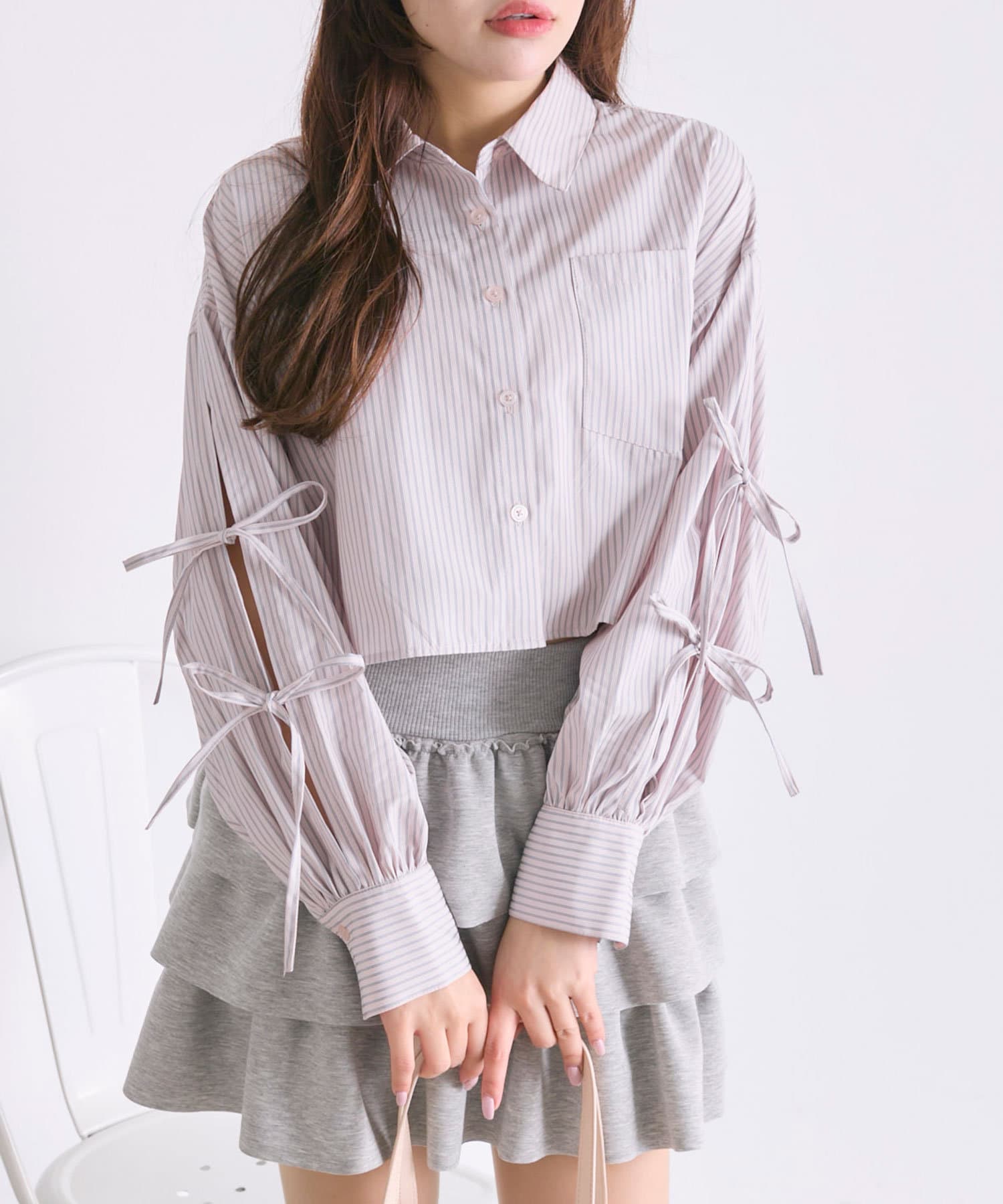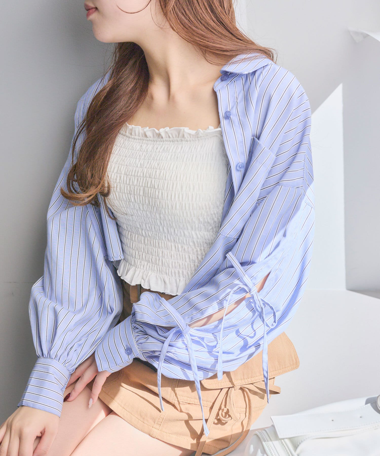 ・袖にリボン付きでスリットから程よい肌見せができるシャツ。