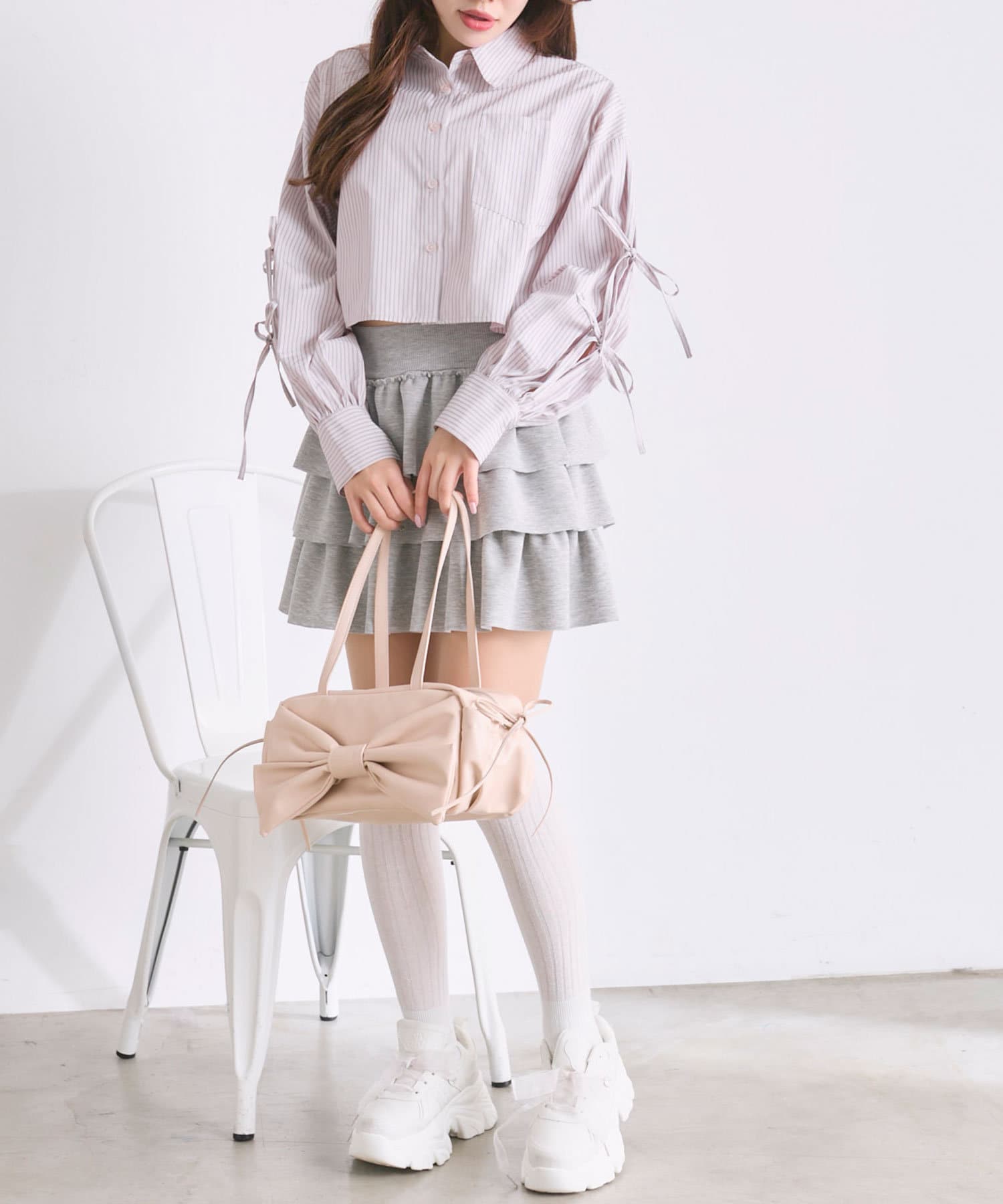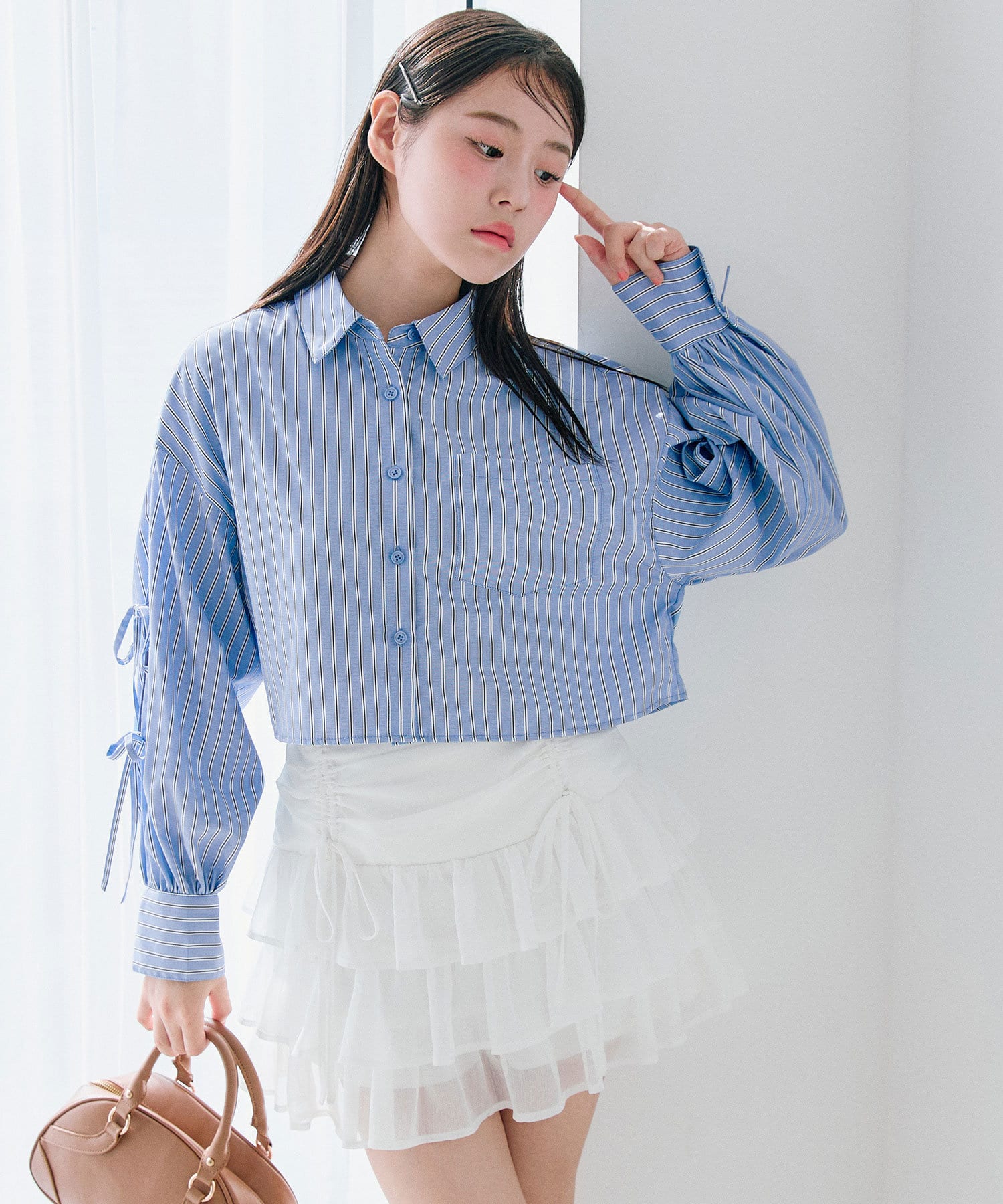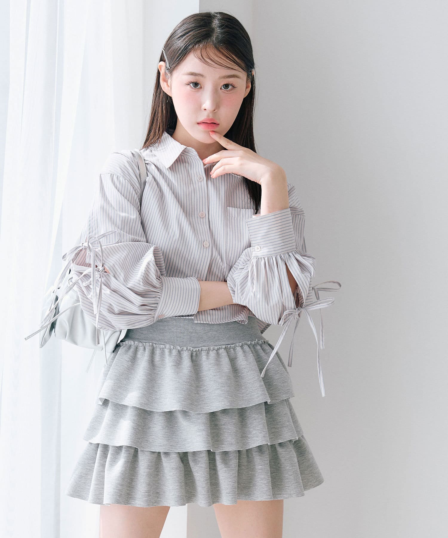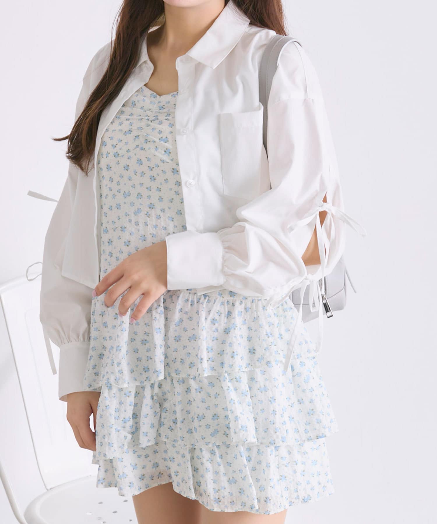 ・袖にリボン付きでスリットから程よい肌見せができるシャツ。