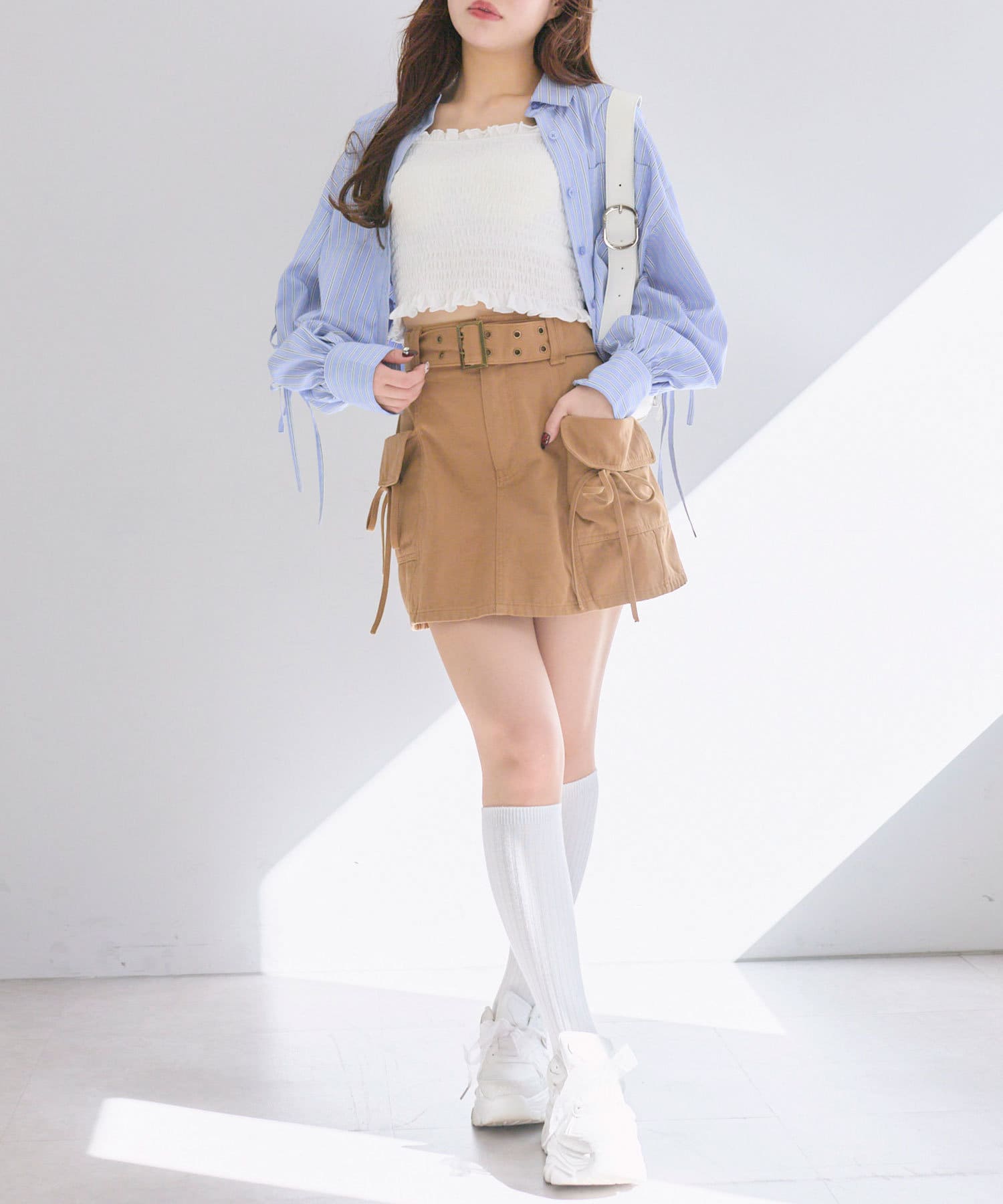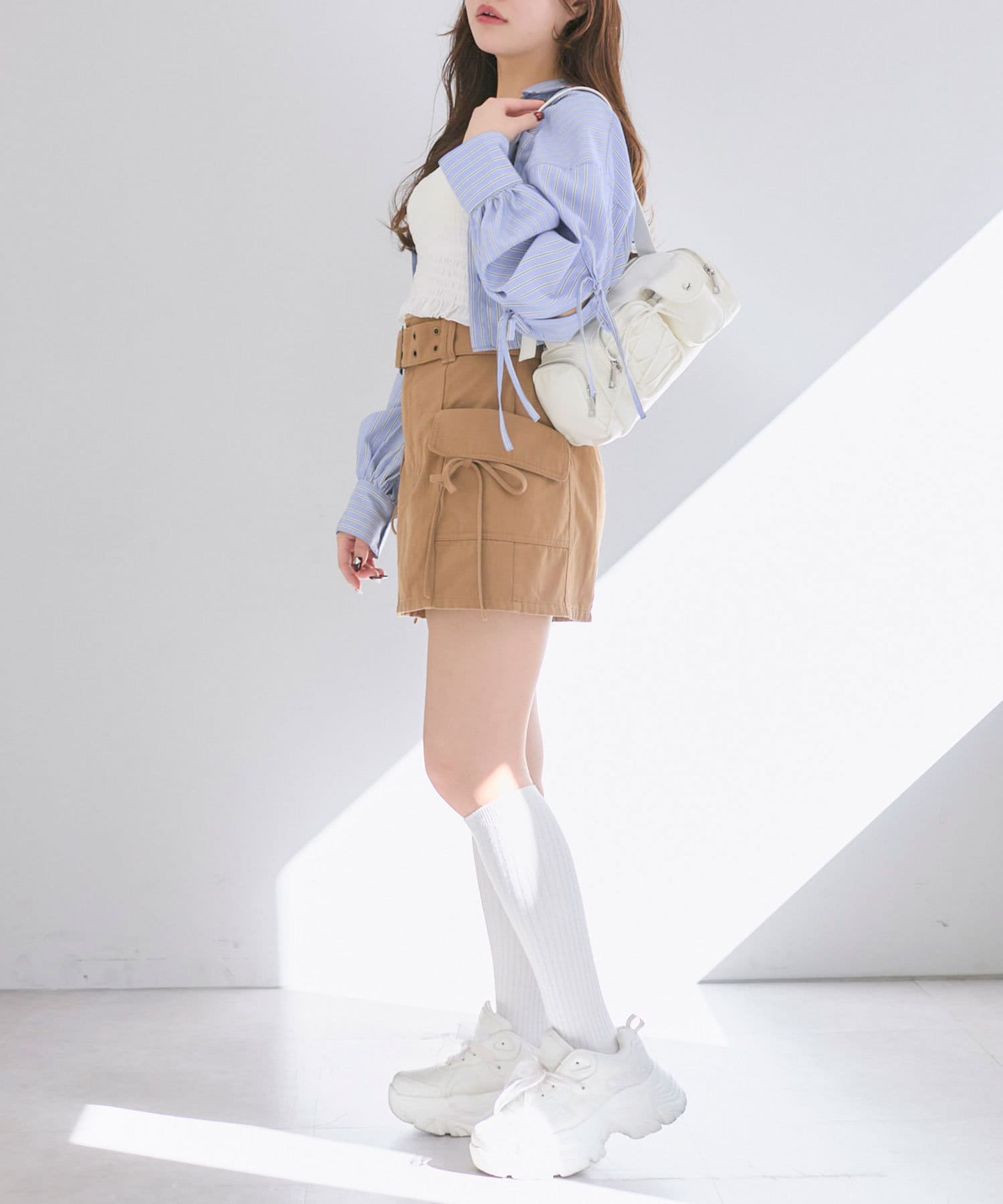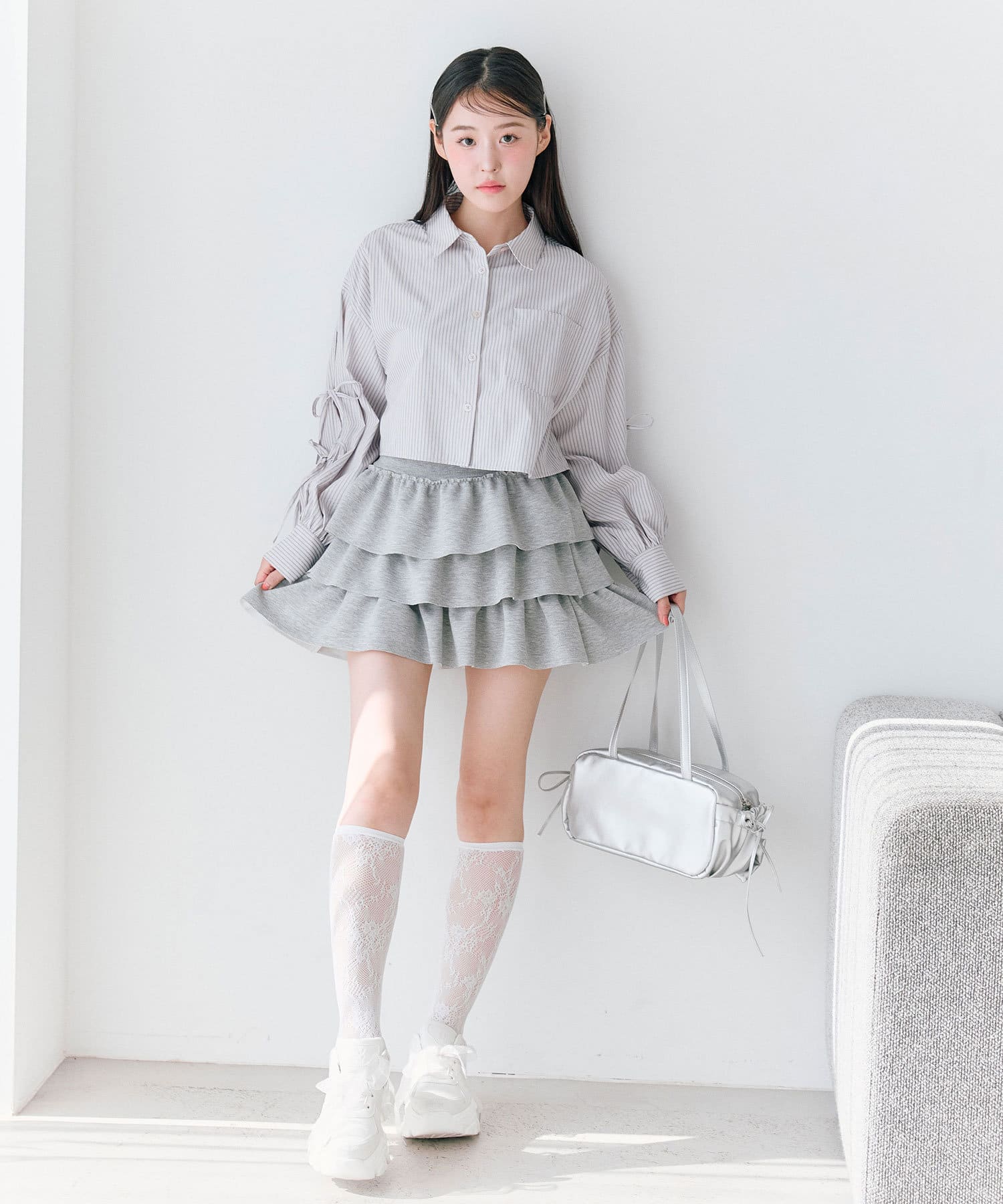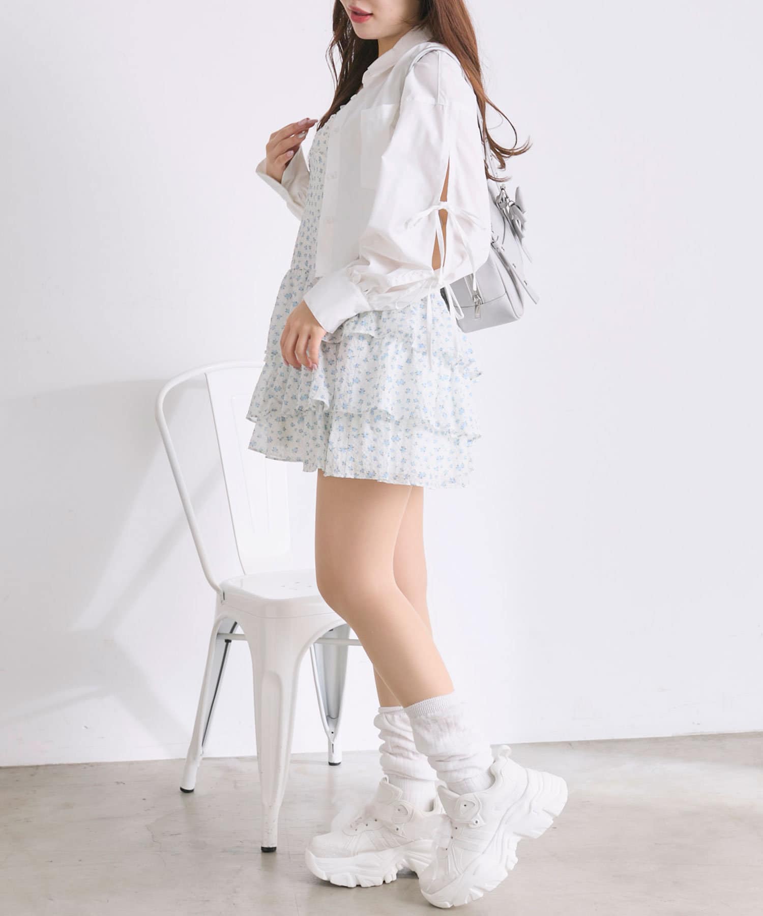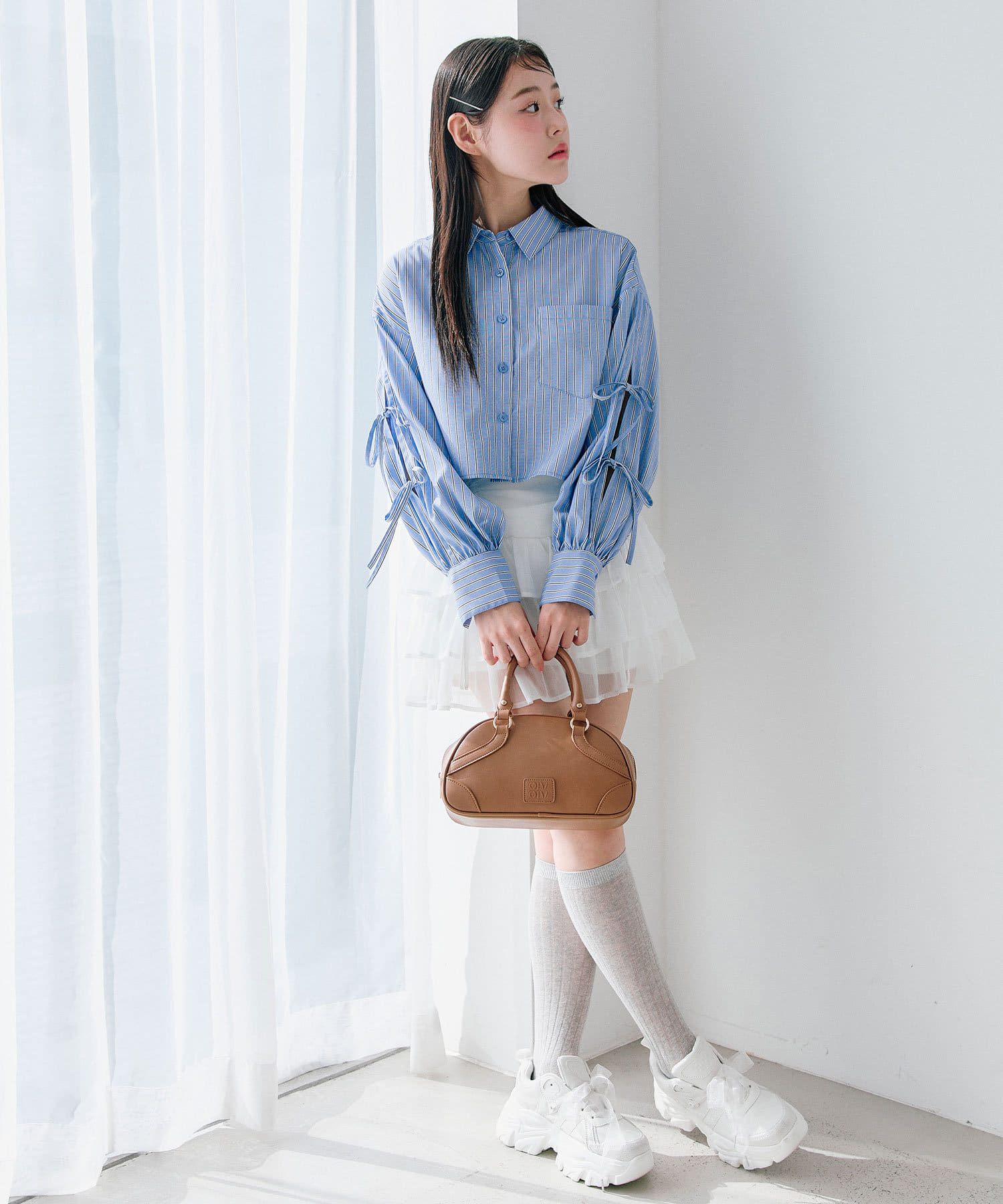 ・袖にリボン付きでスリットから程よい肌見せができるシャツ。