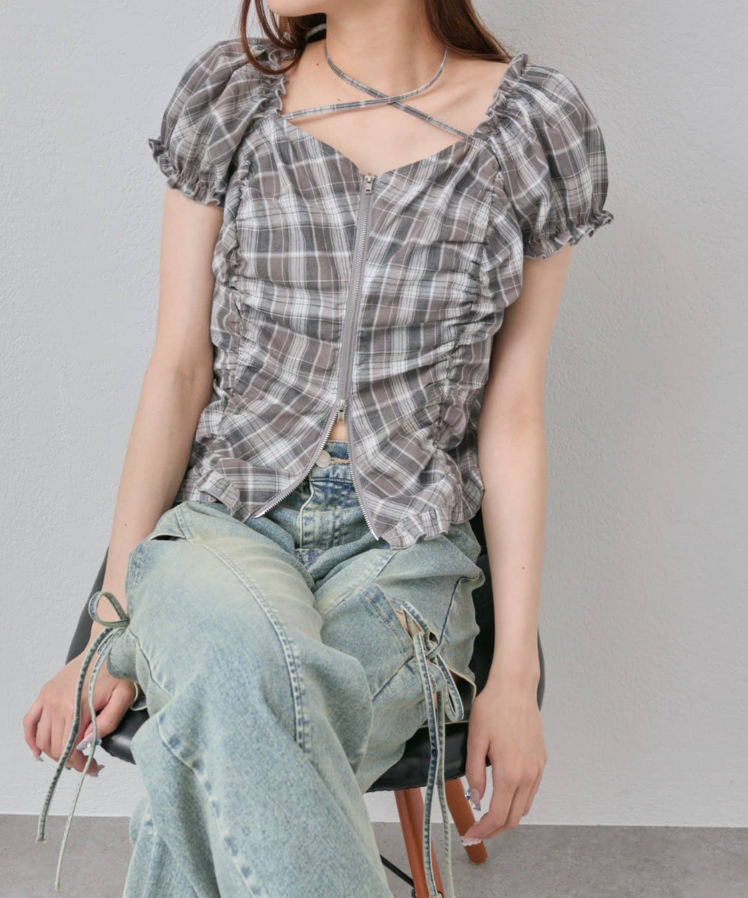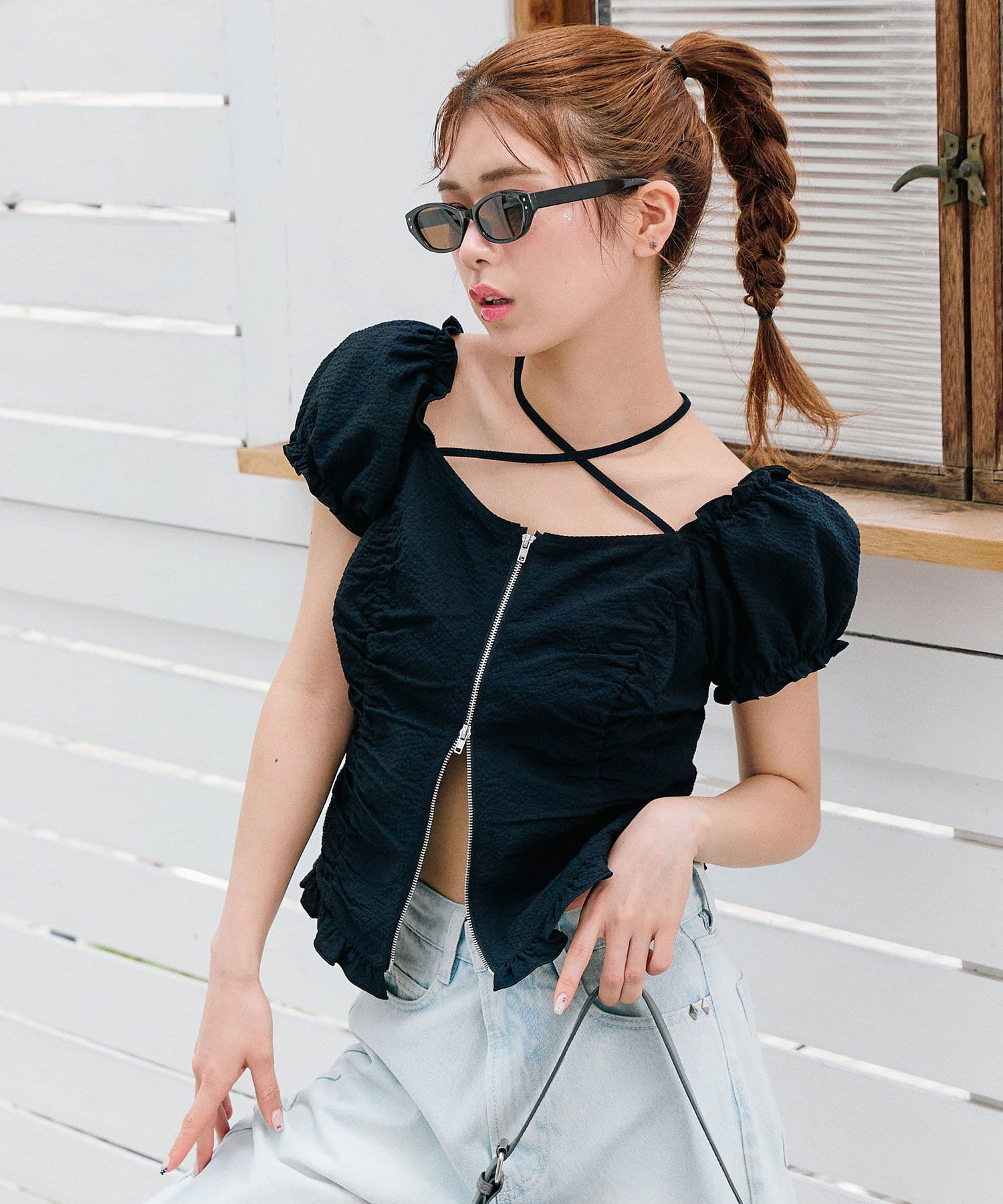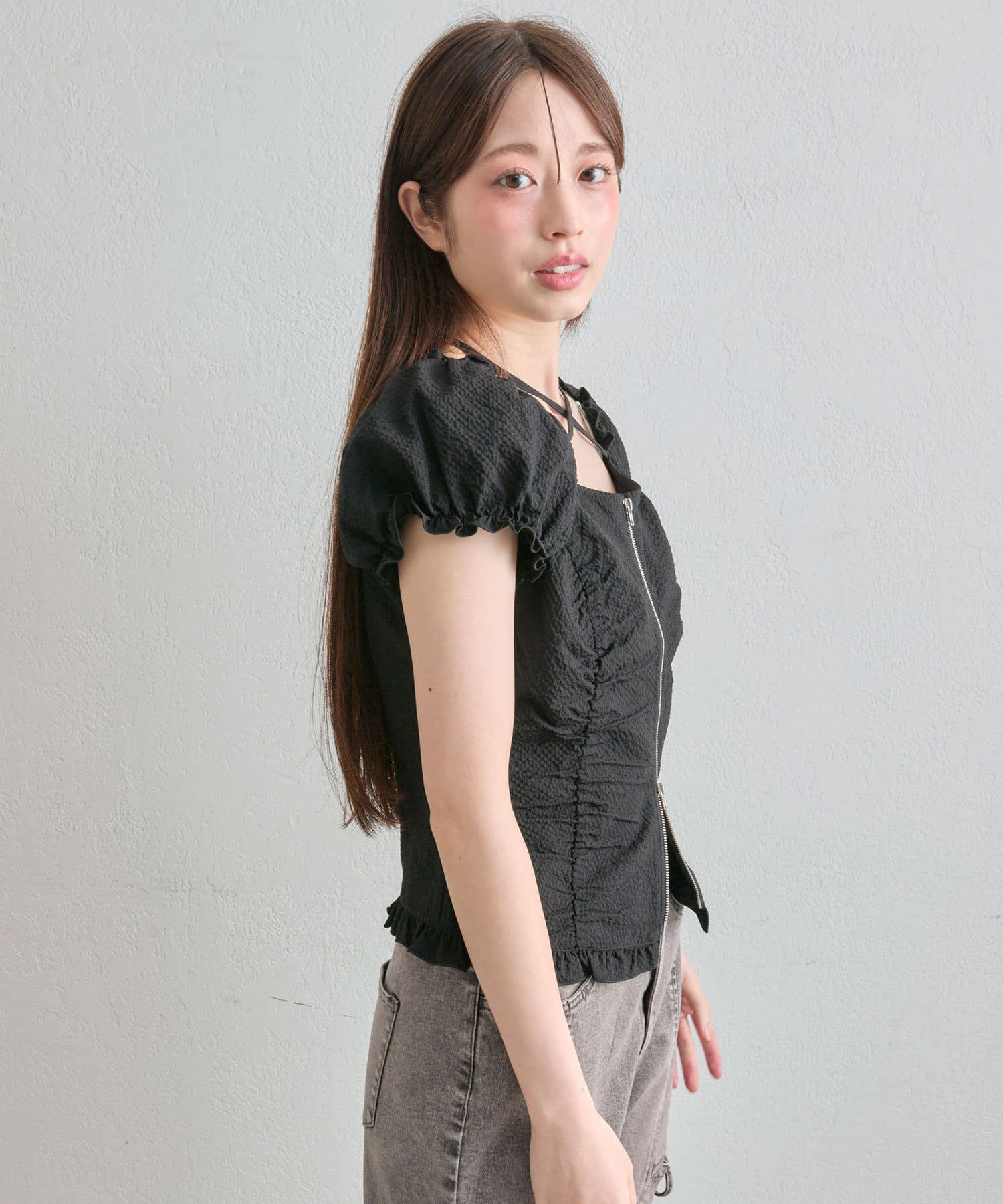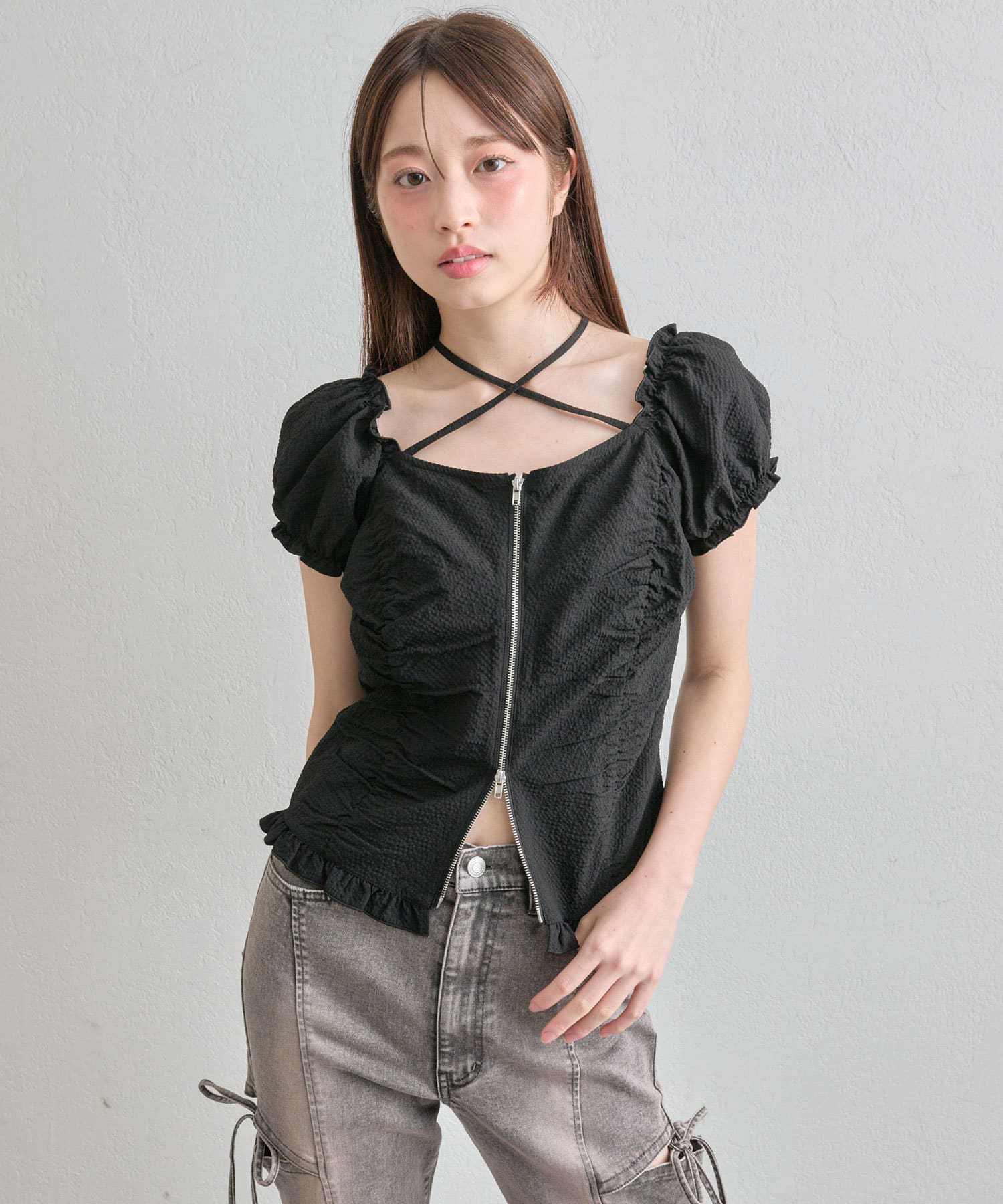 【デコルテ綺麗見え】ダブルジップオフショルブラウス
