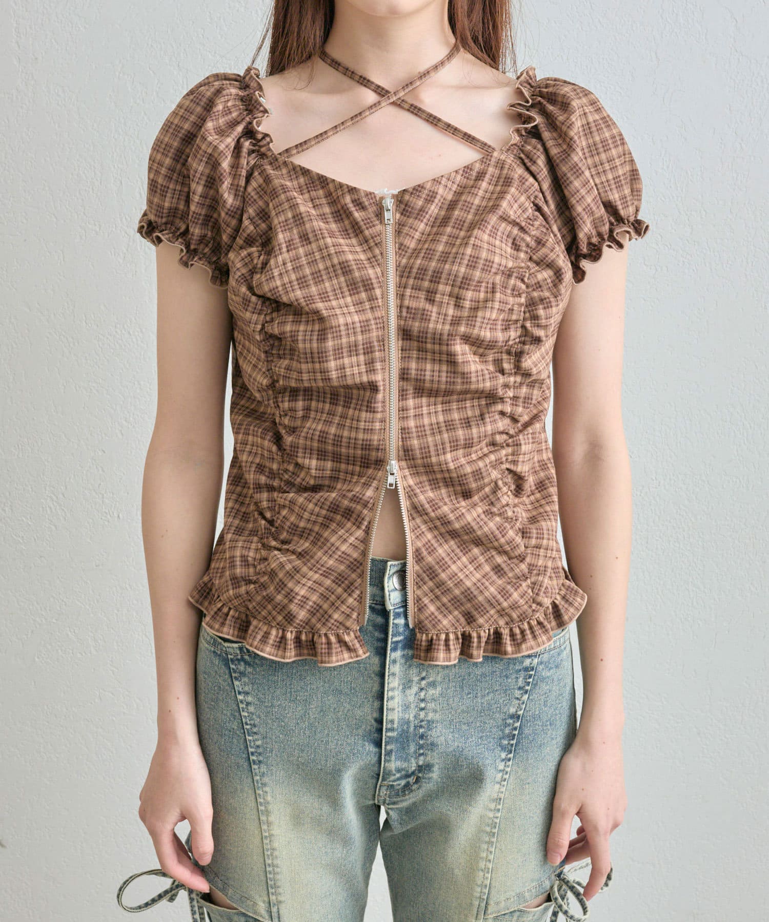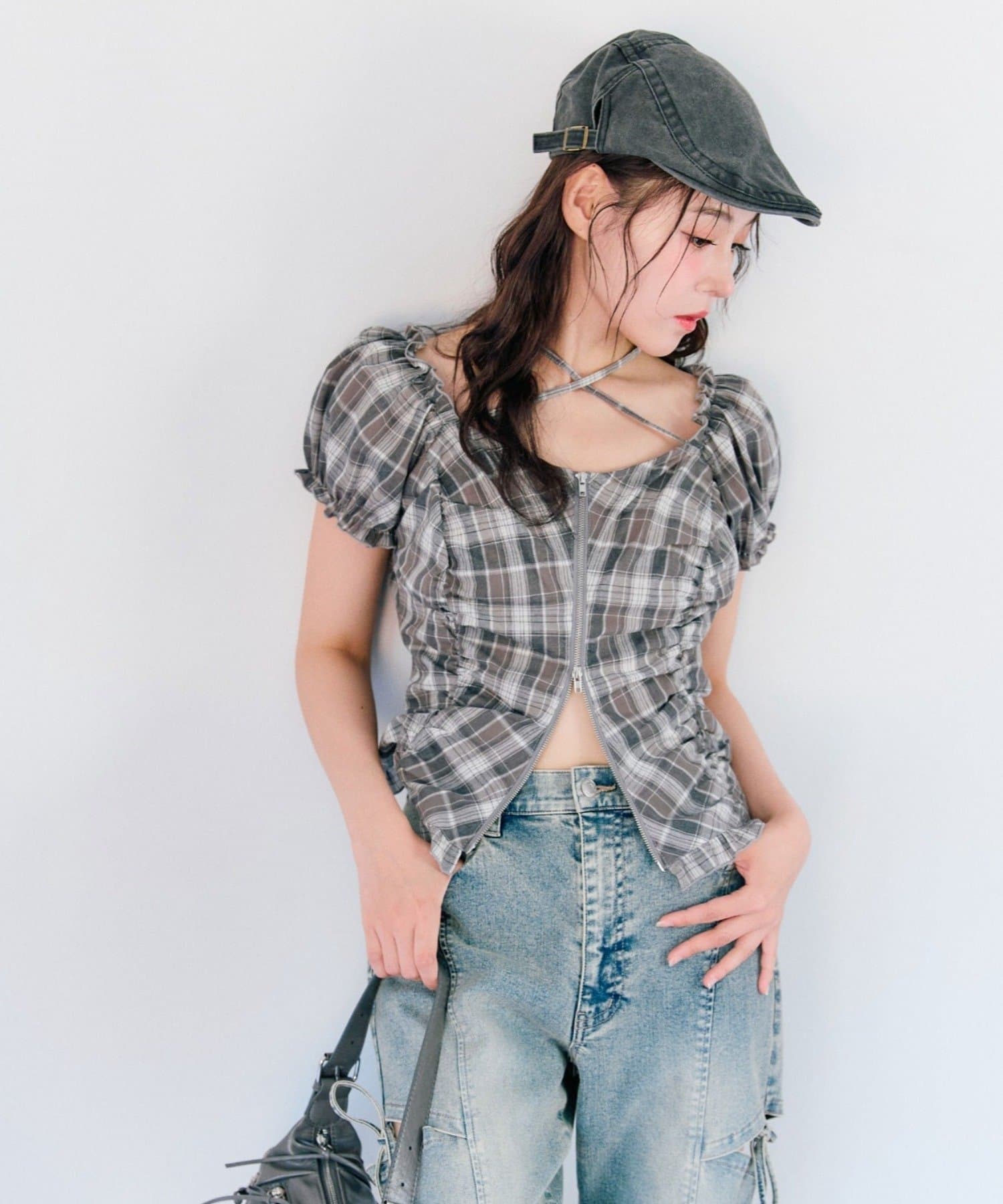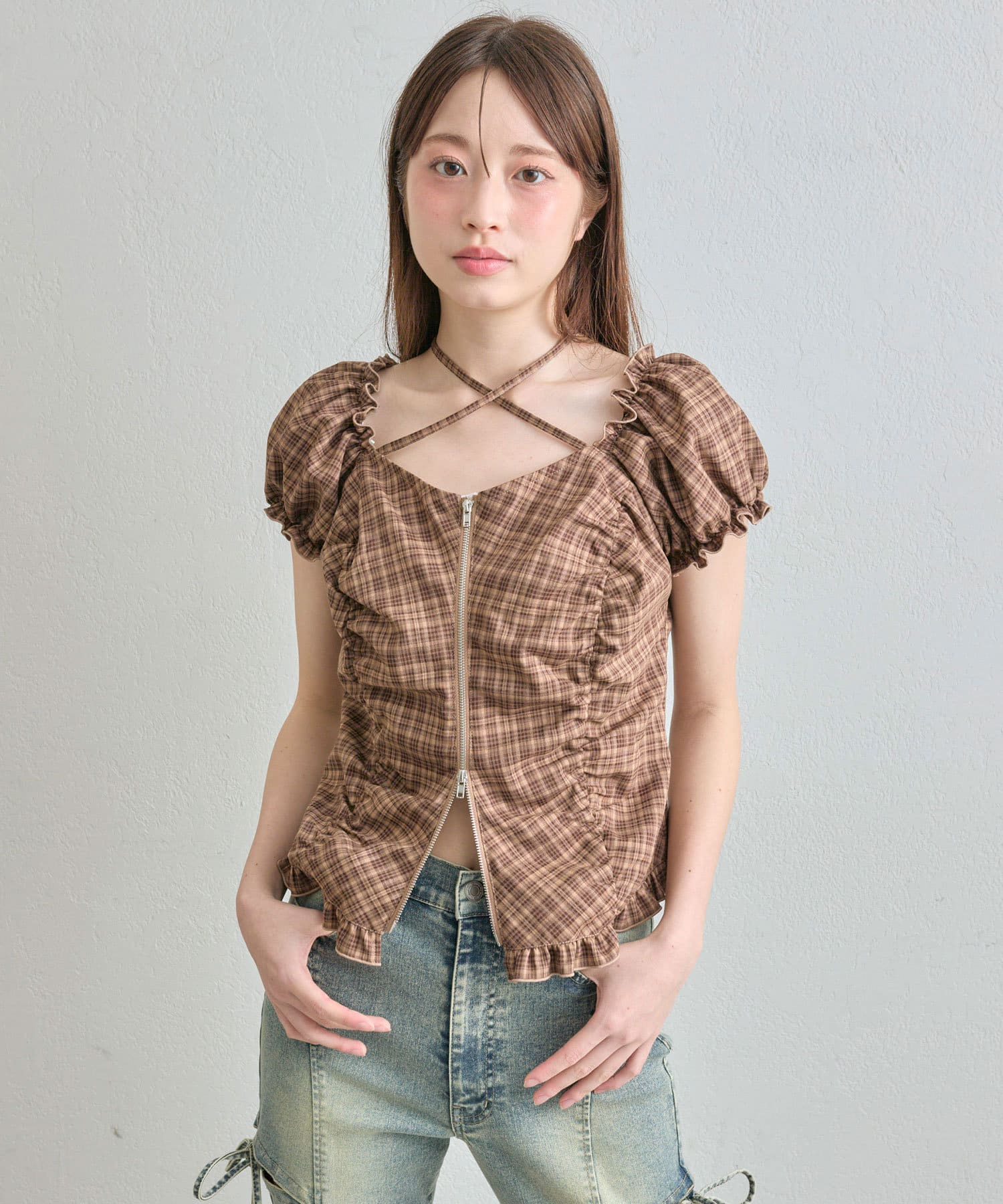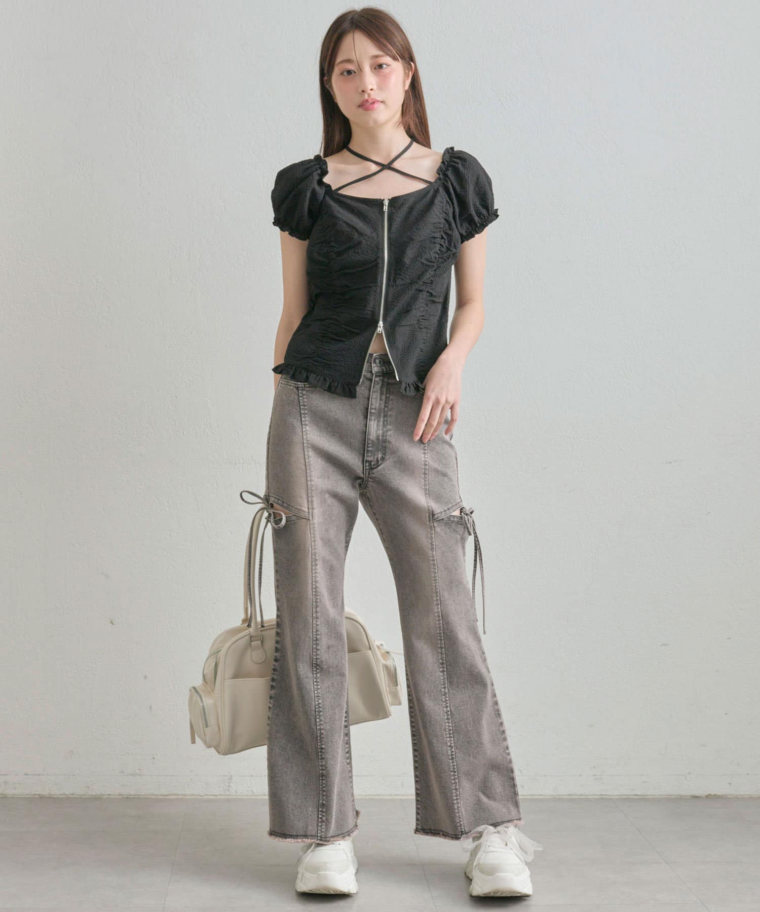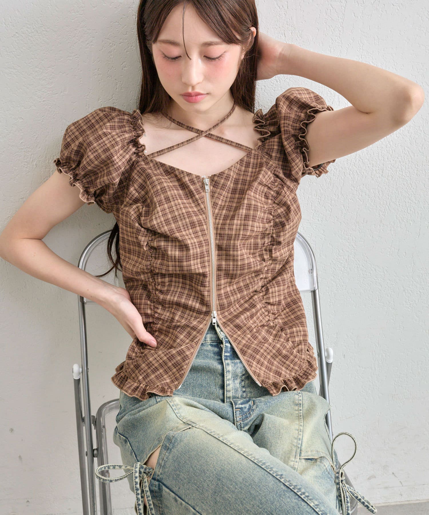 【デコルテ綺麗見え】ダブルジップオフショルブラウス