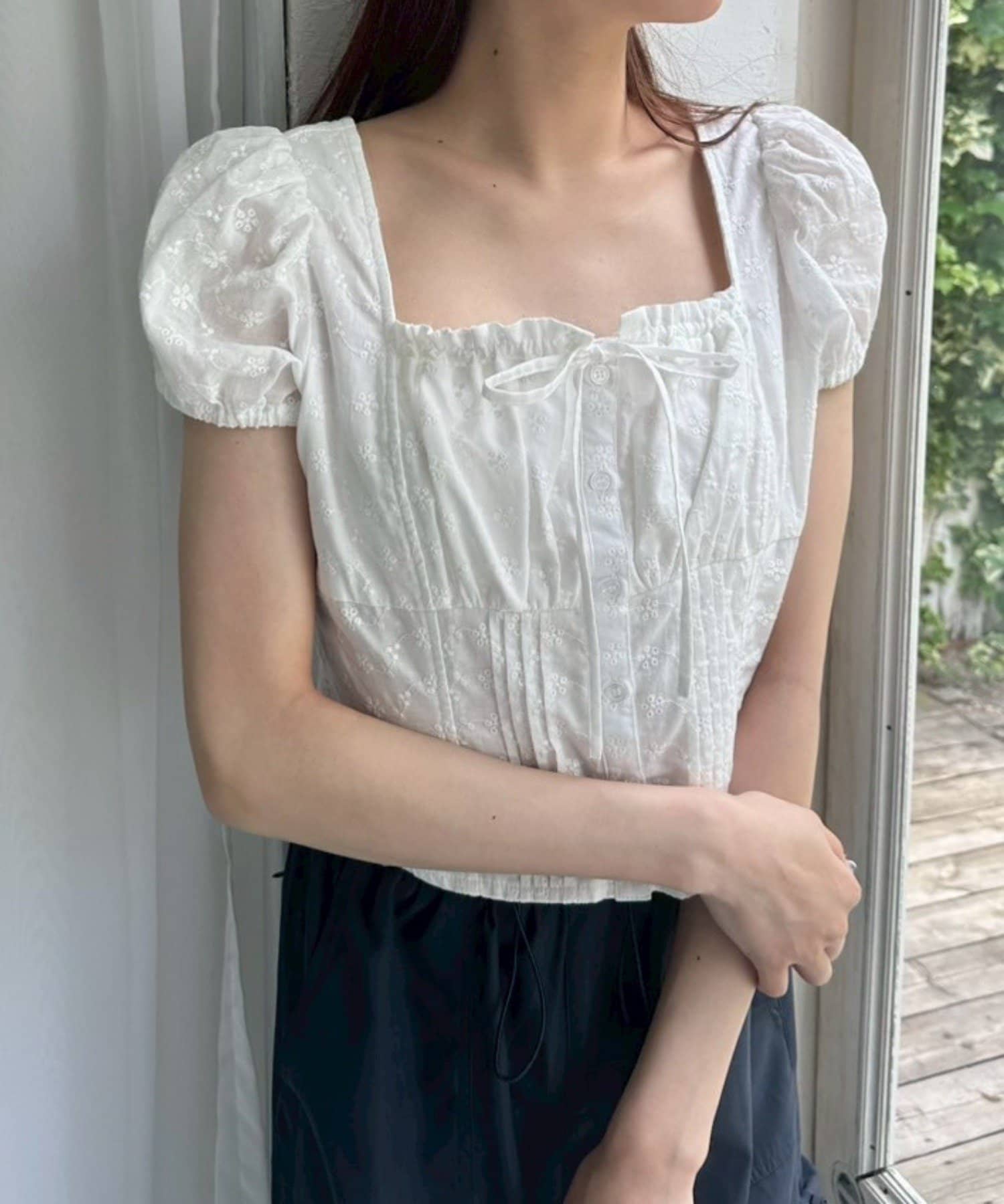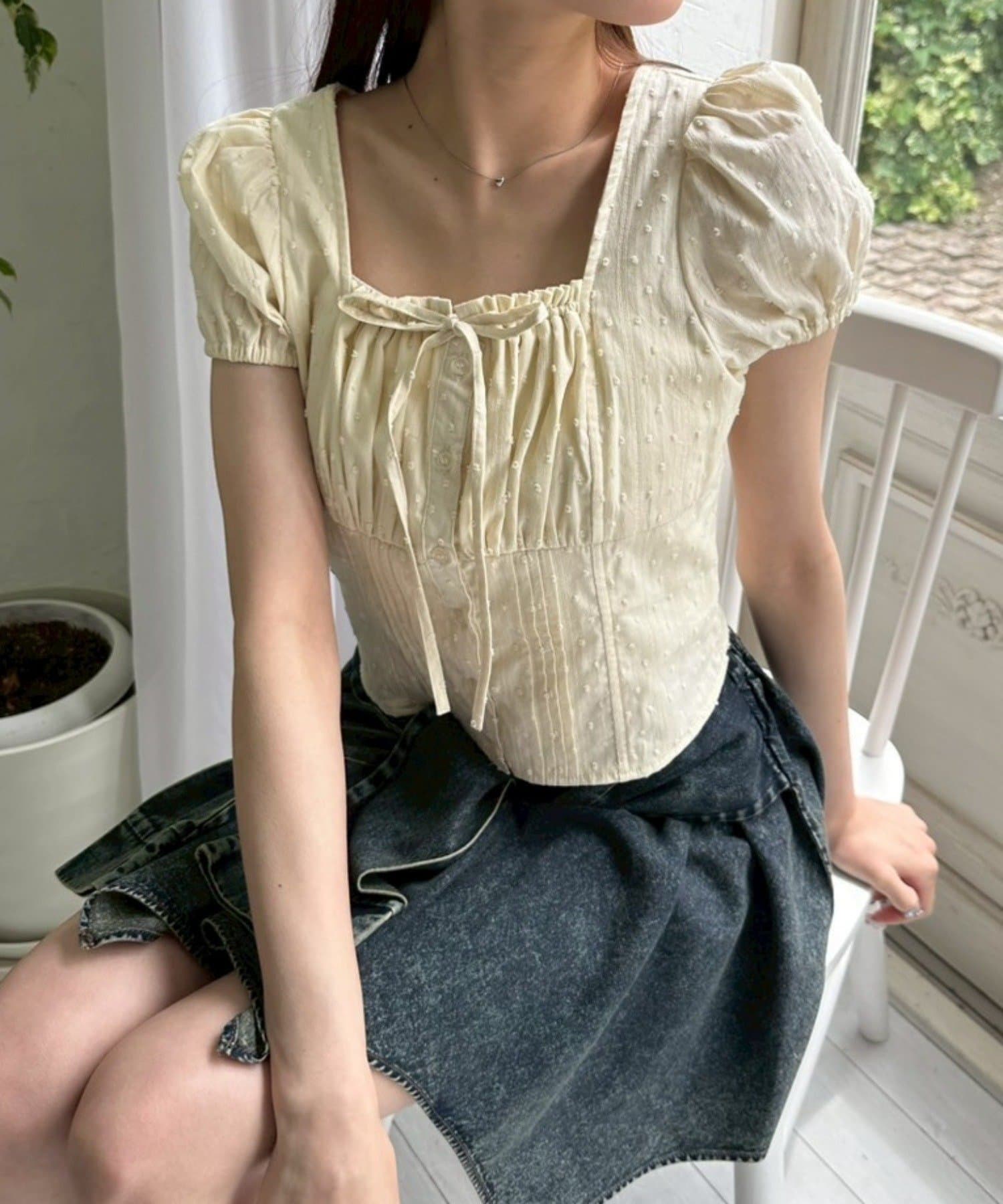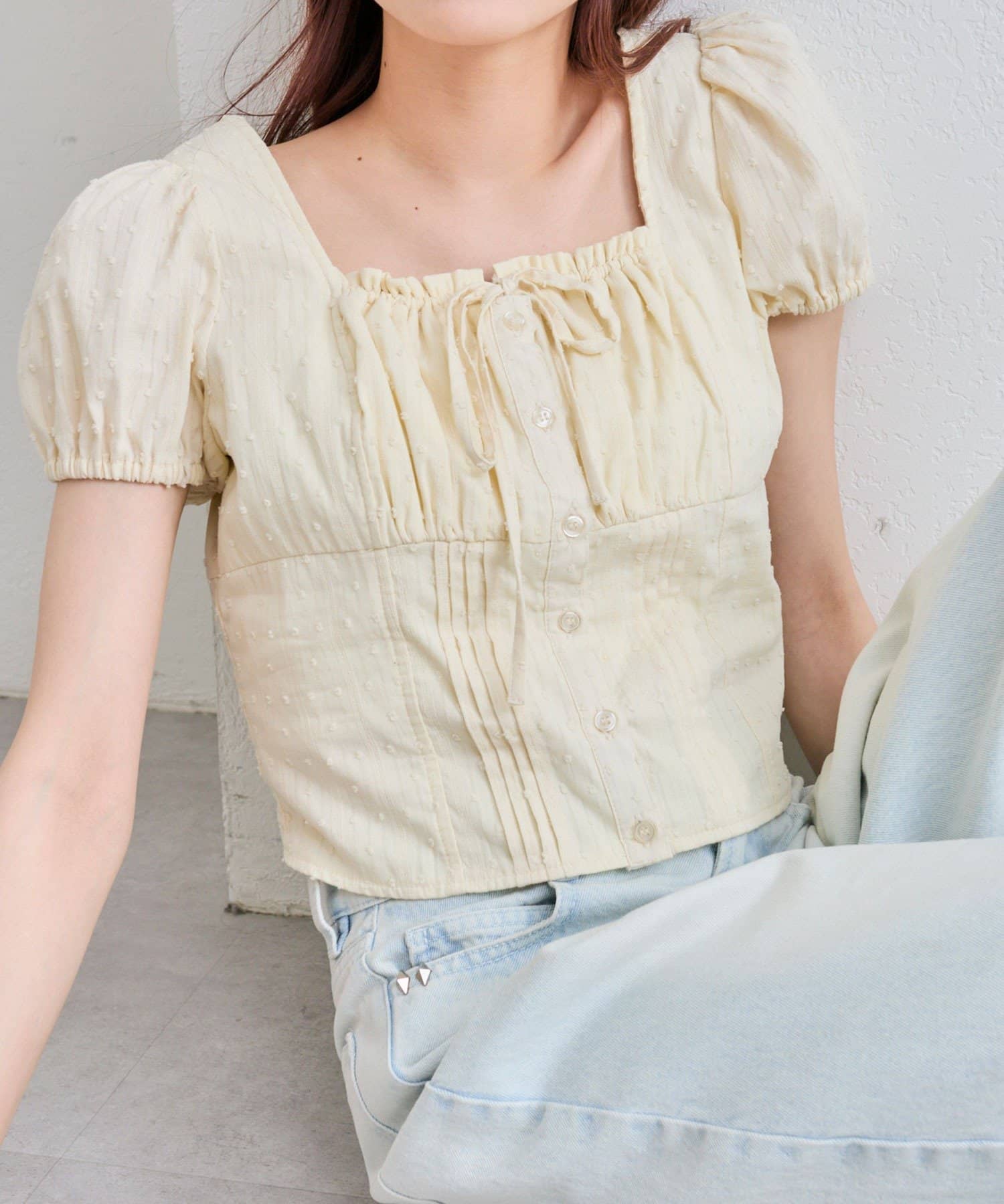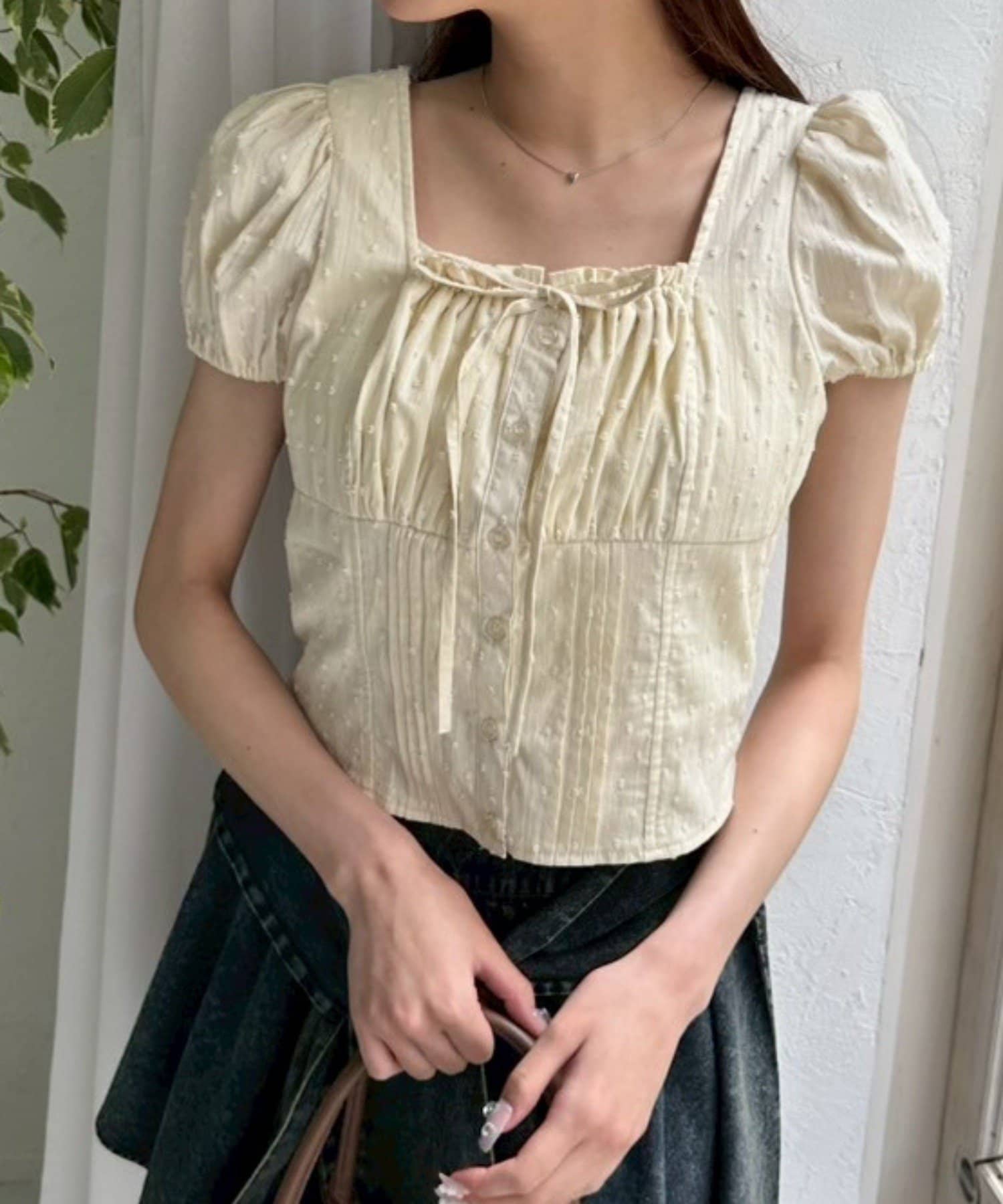 ・胸元のリボンやふわっとしたパフスリーブなど甘め要素がしっかりあるデザインです。