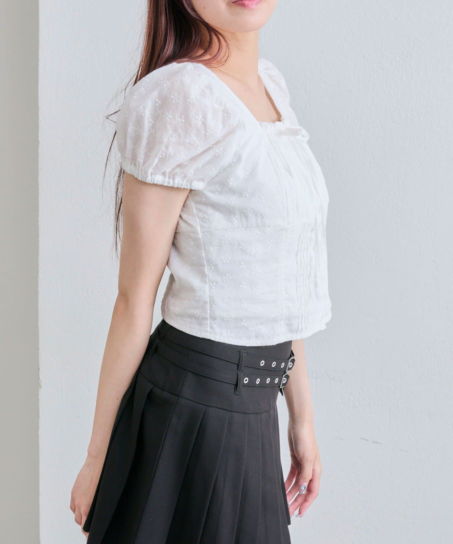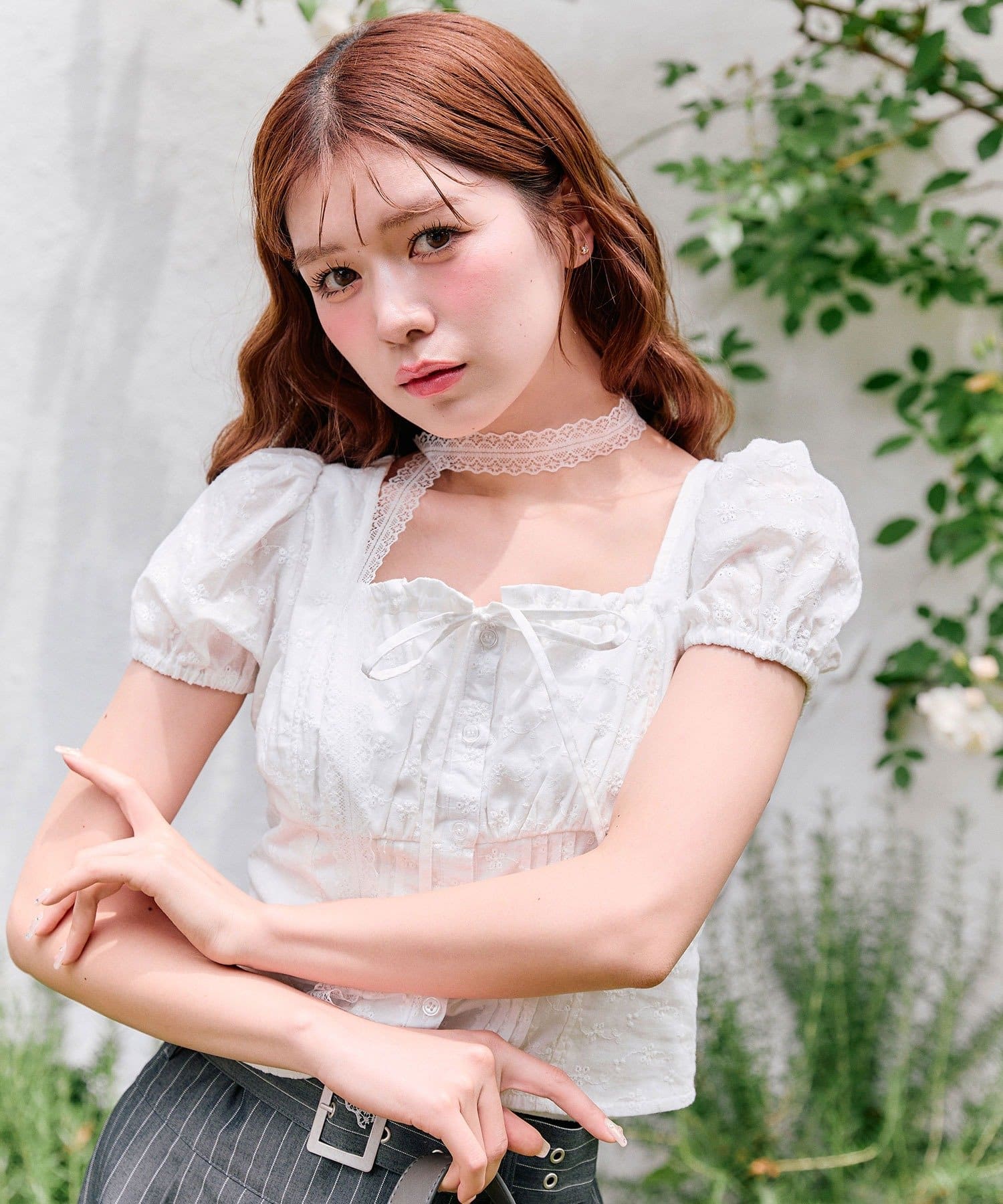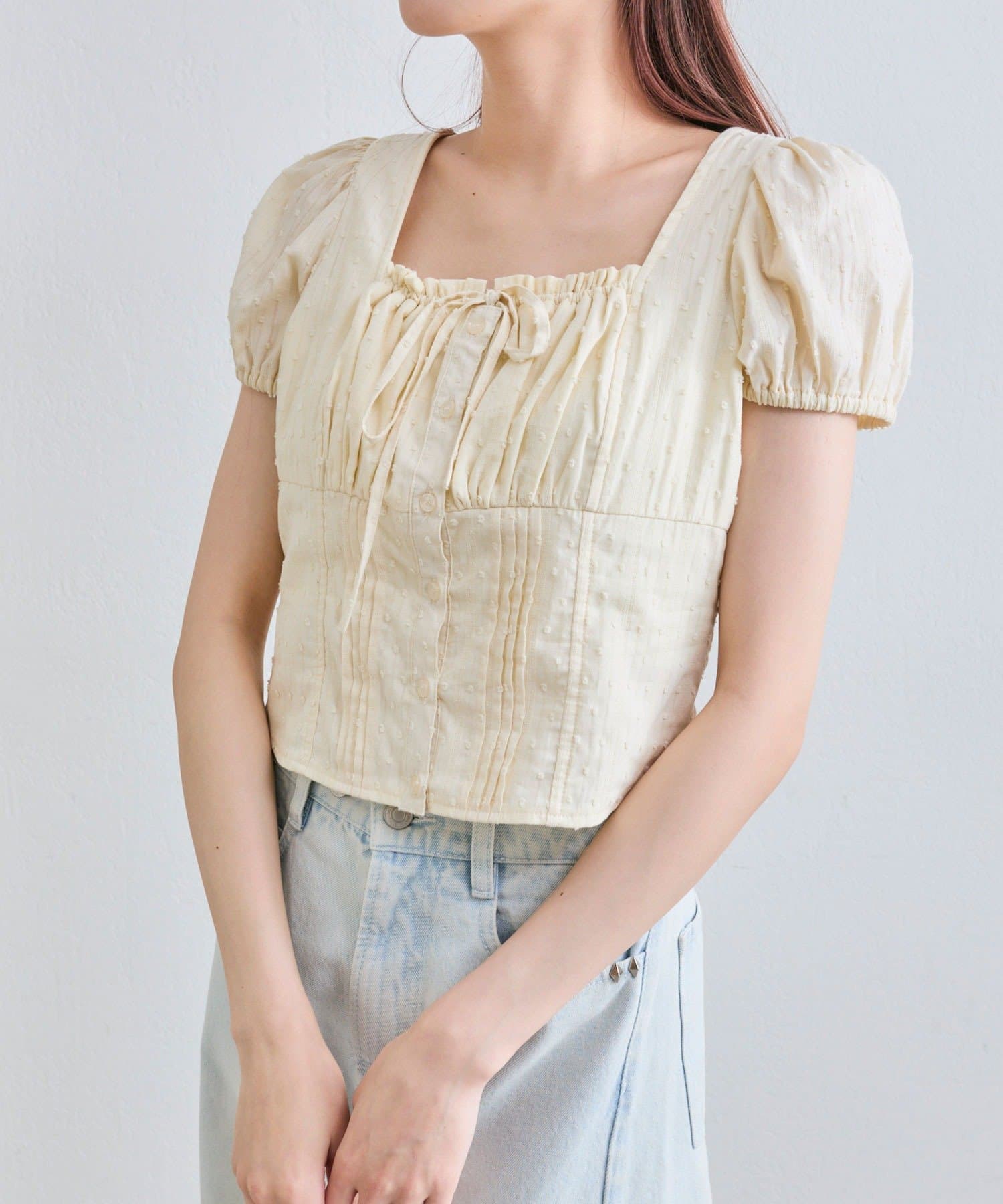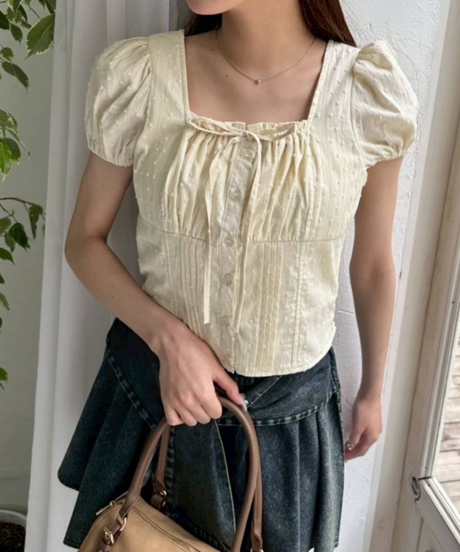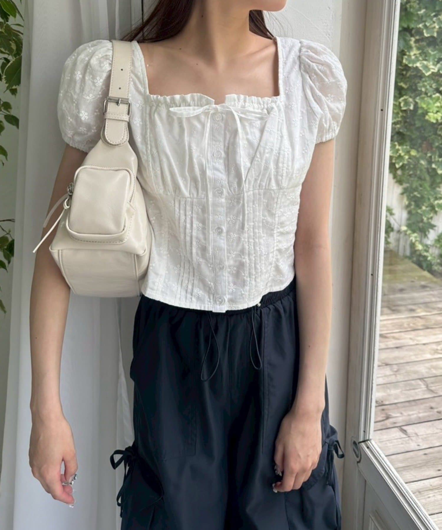 ・胸元のリボンやふわっとしたパフスリーブなど甘め要素がしっかりあるデザインです。