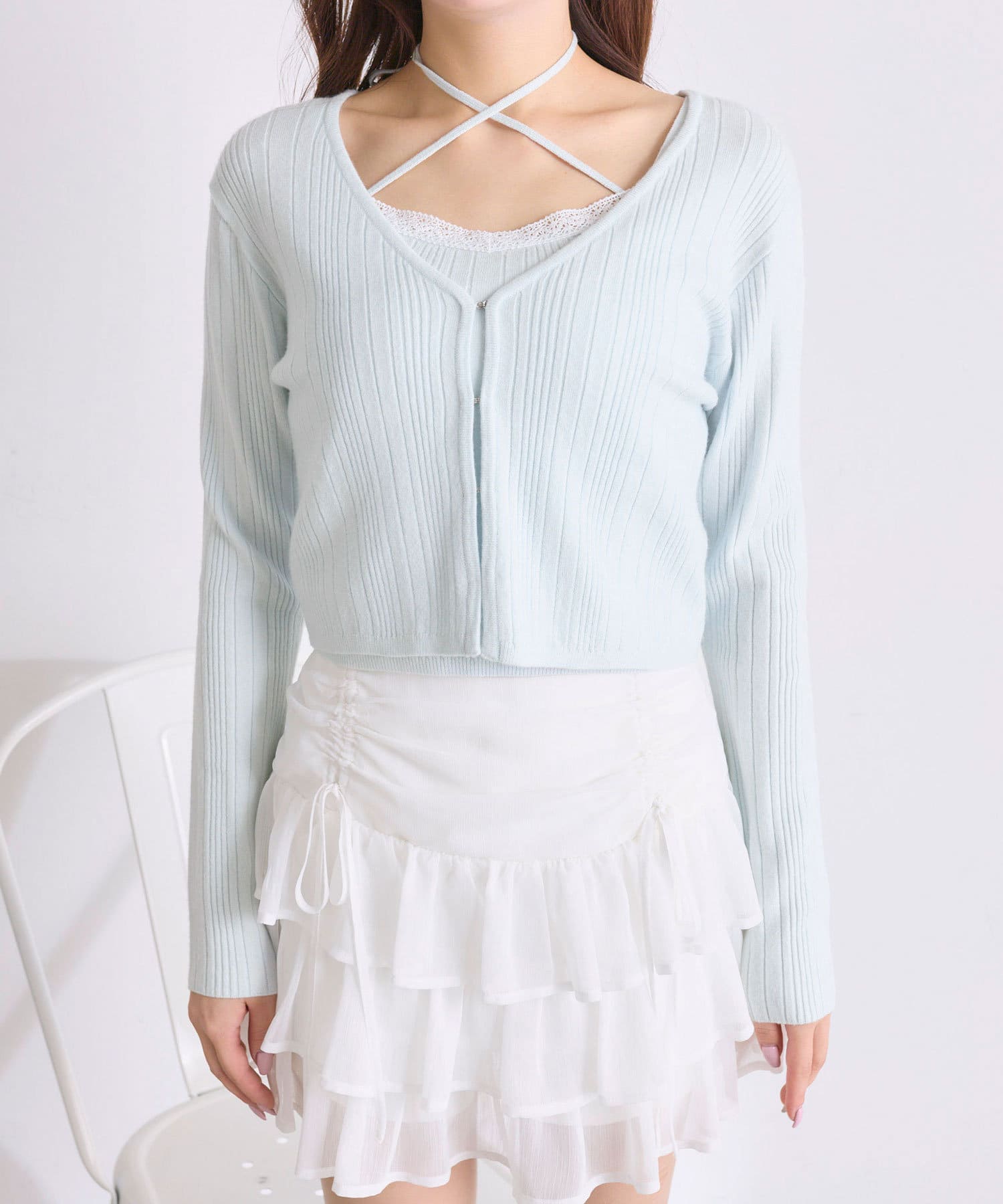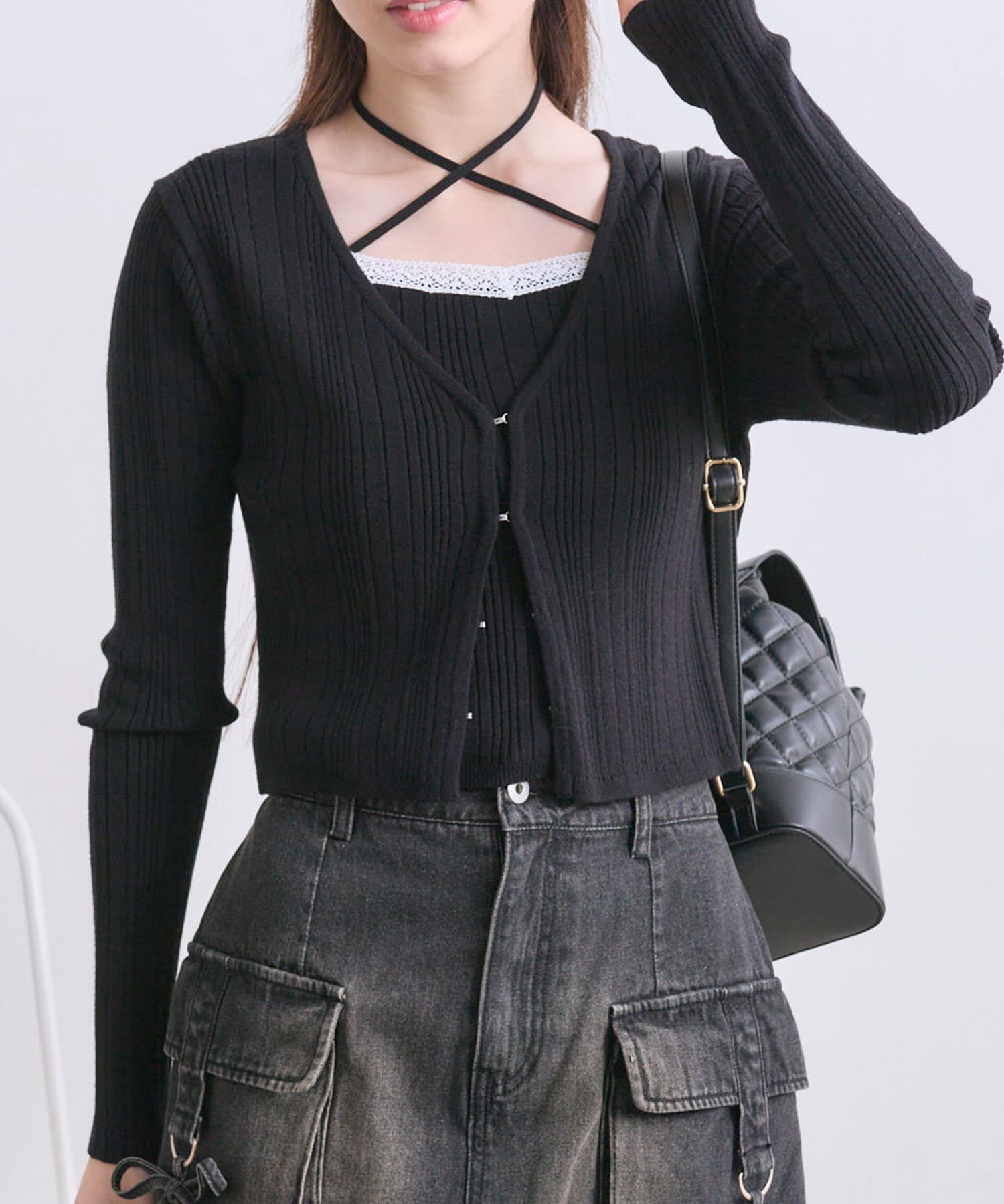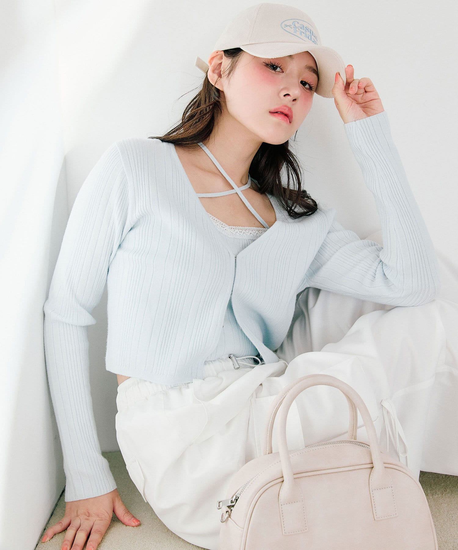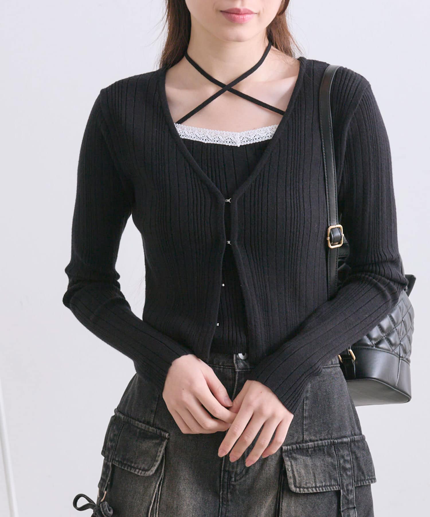 ・コンパクトなサイズ感のカーディガンとキャミインナーがセットになったアイテム。