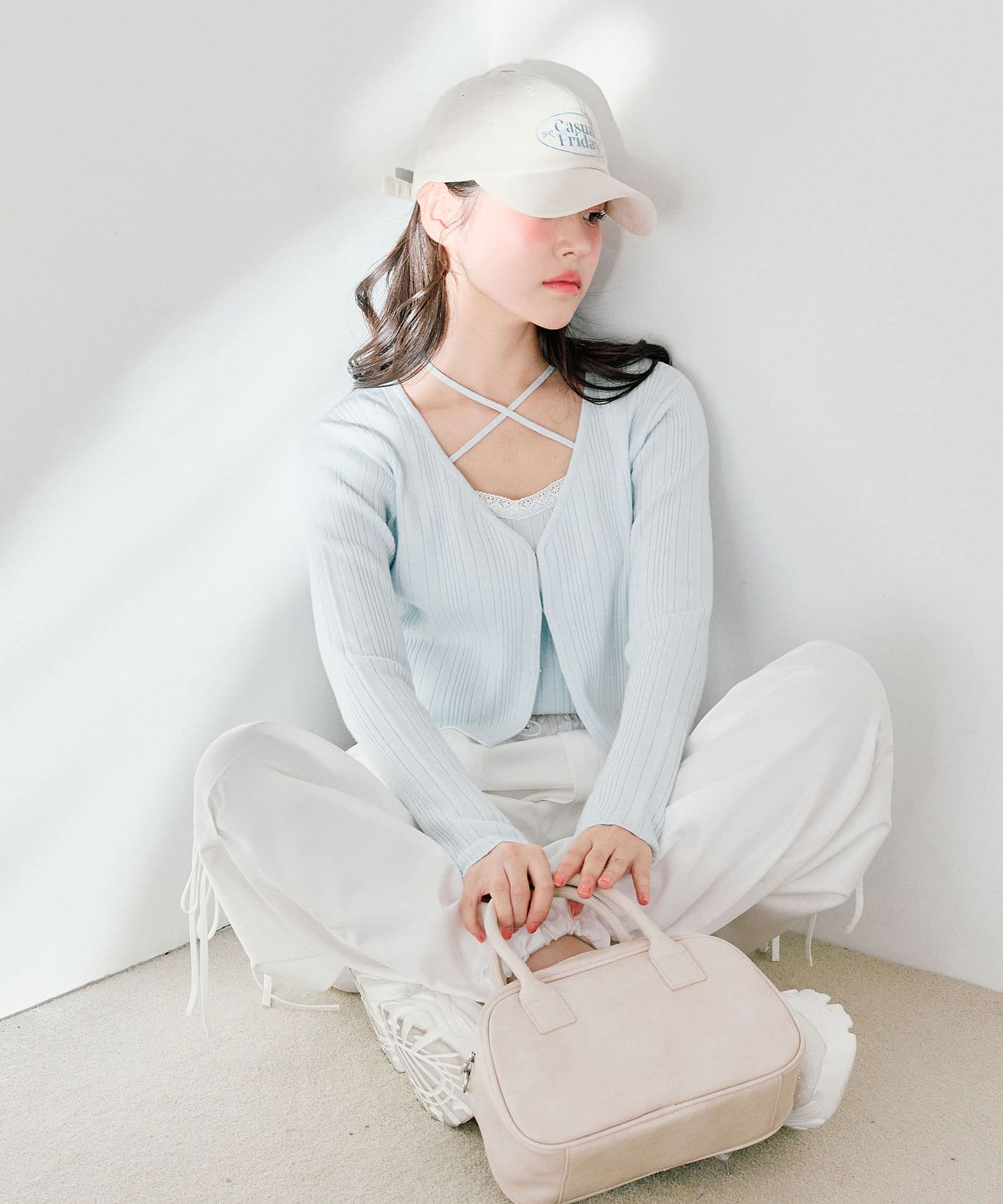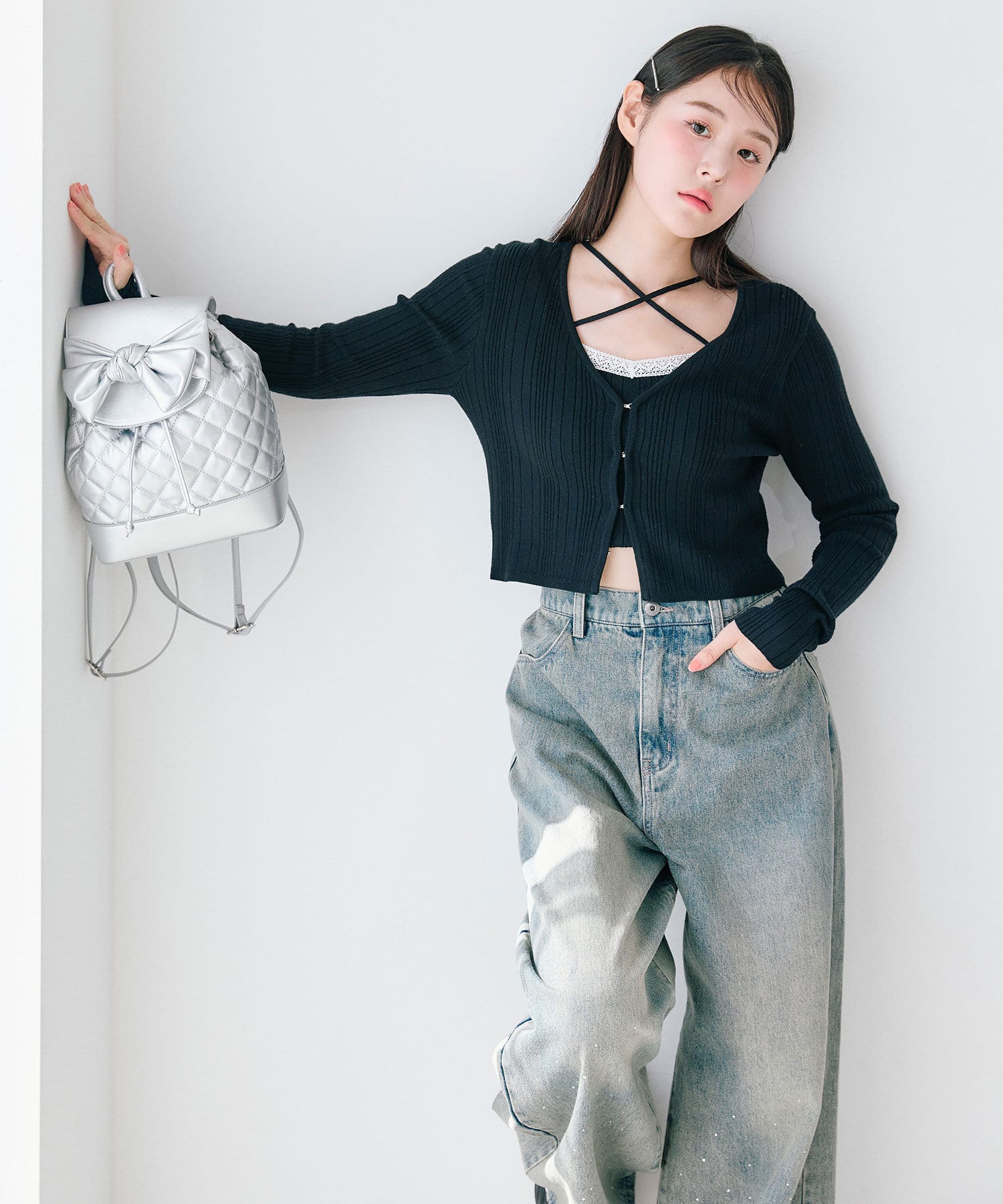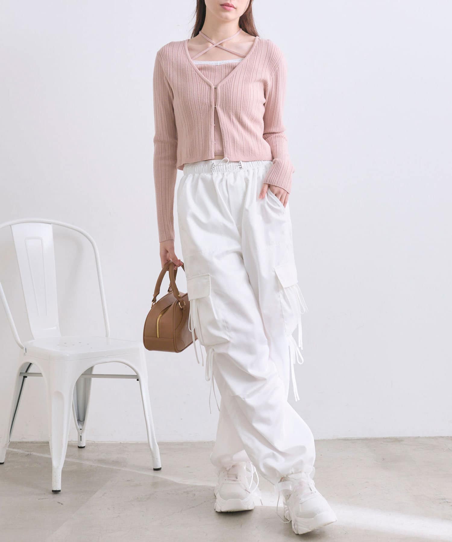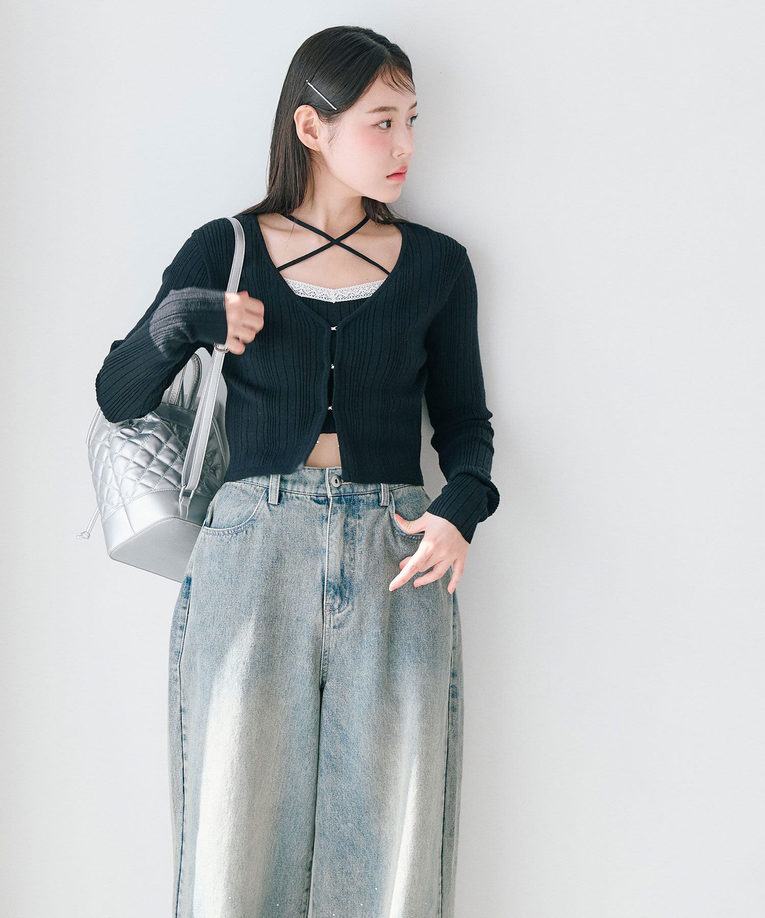 ・コンパクトなサイズ感のカーディガンとキャミインナーがセットになったアイテム。