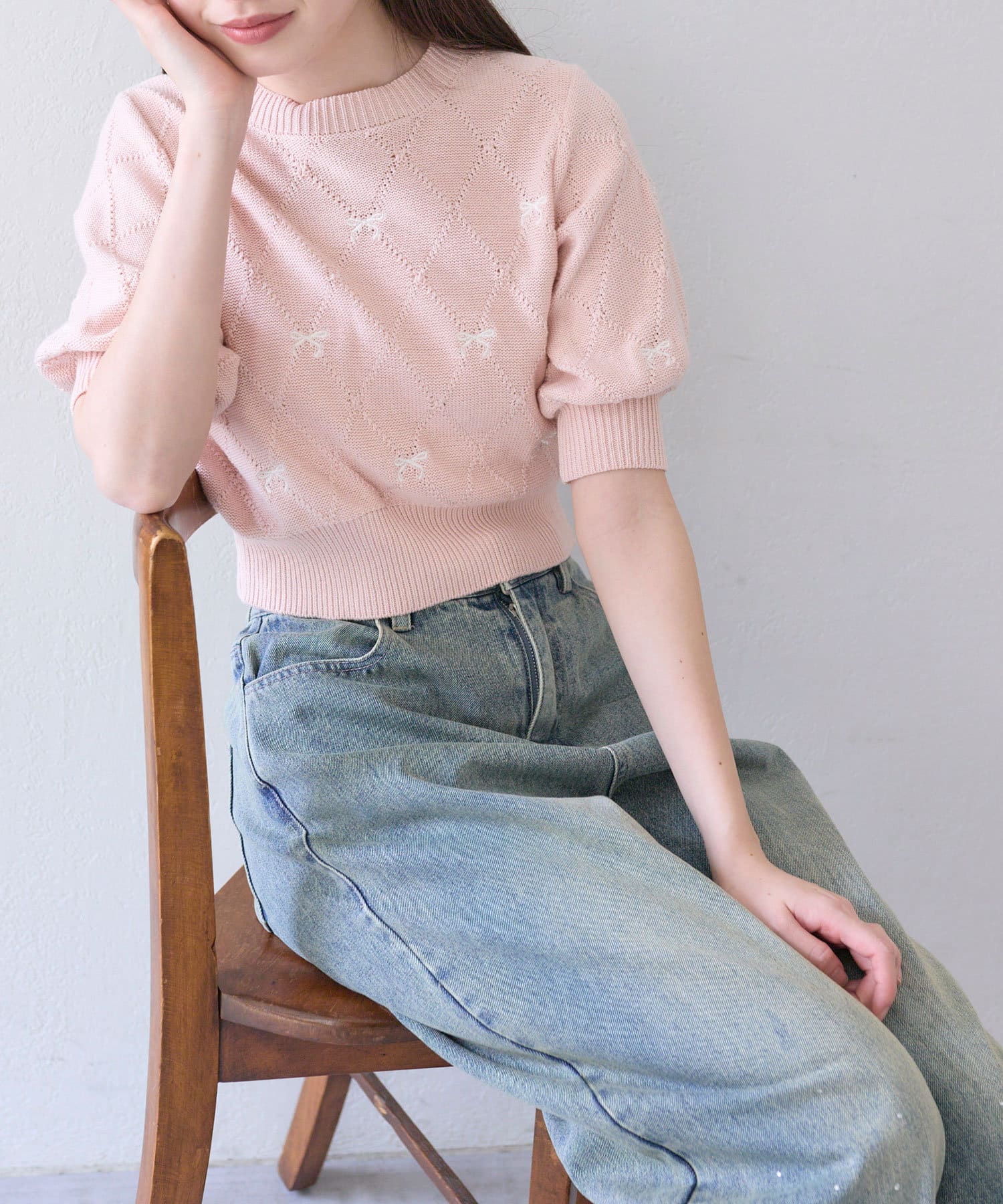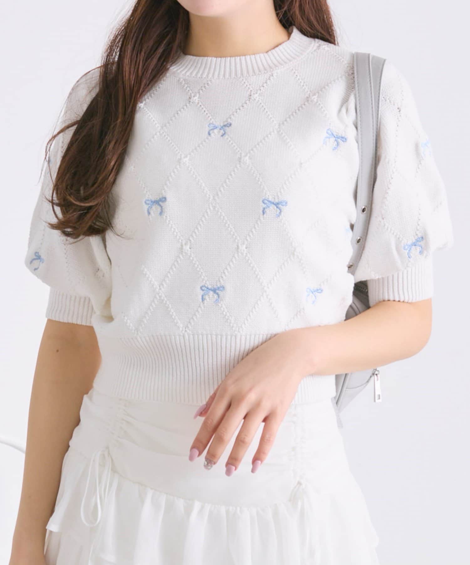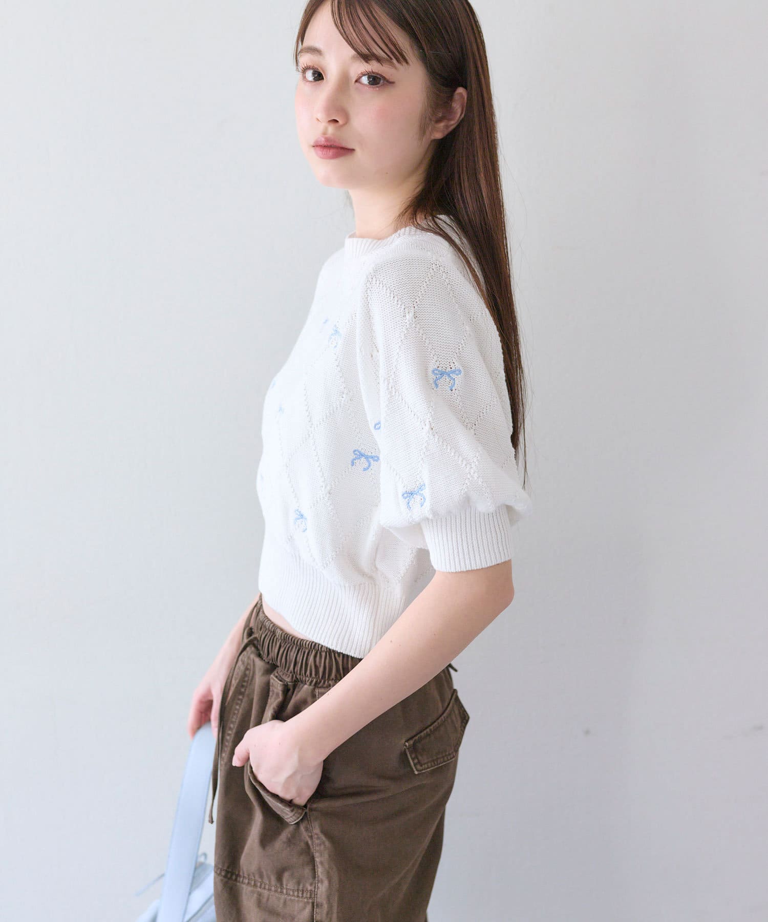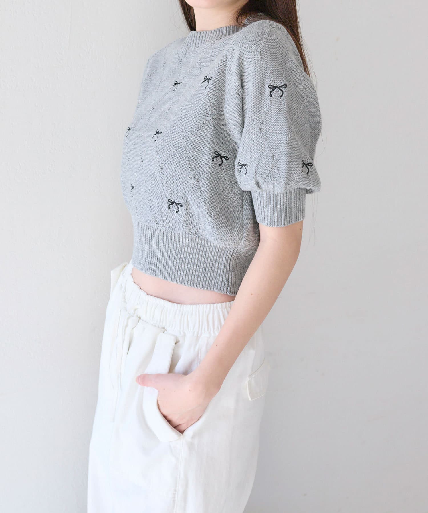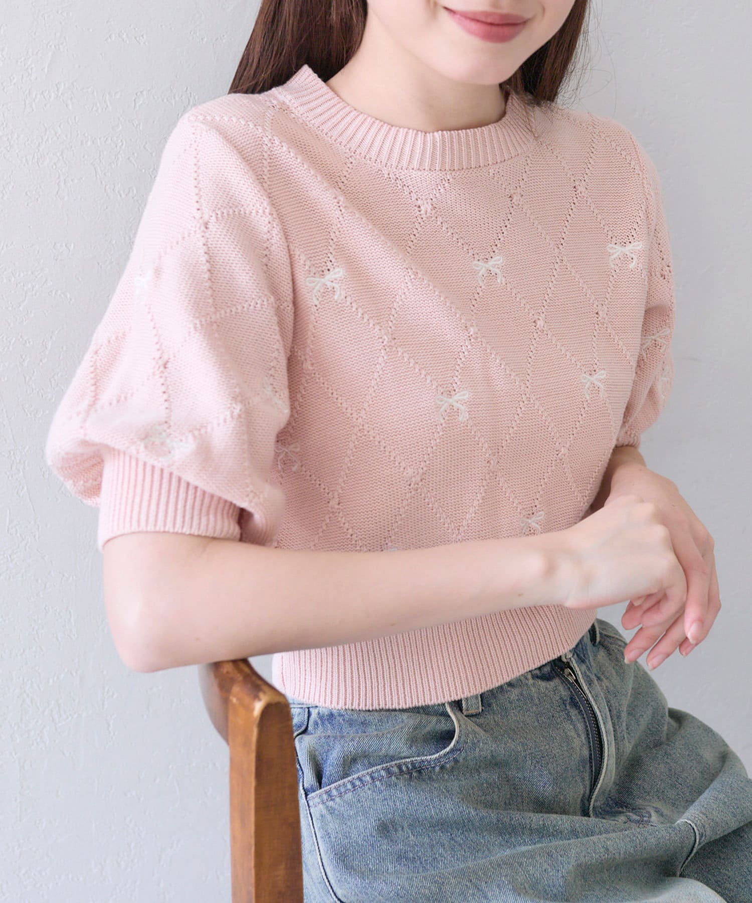・リボン刺繍がフェミニンで大人可愛いニット。