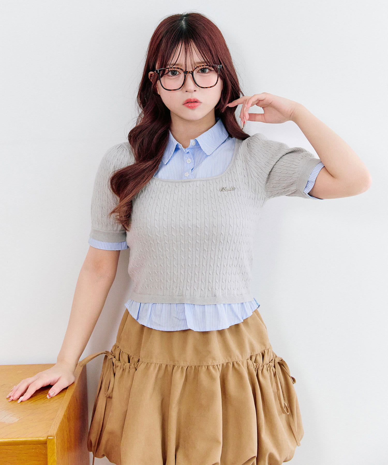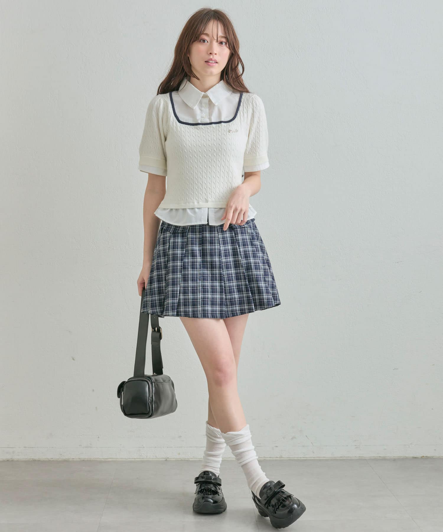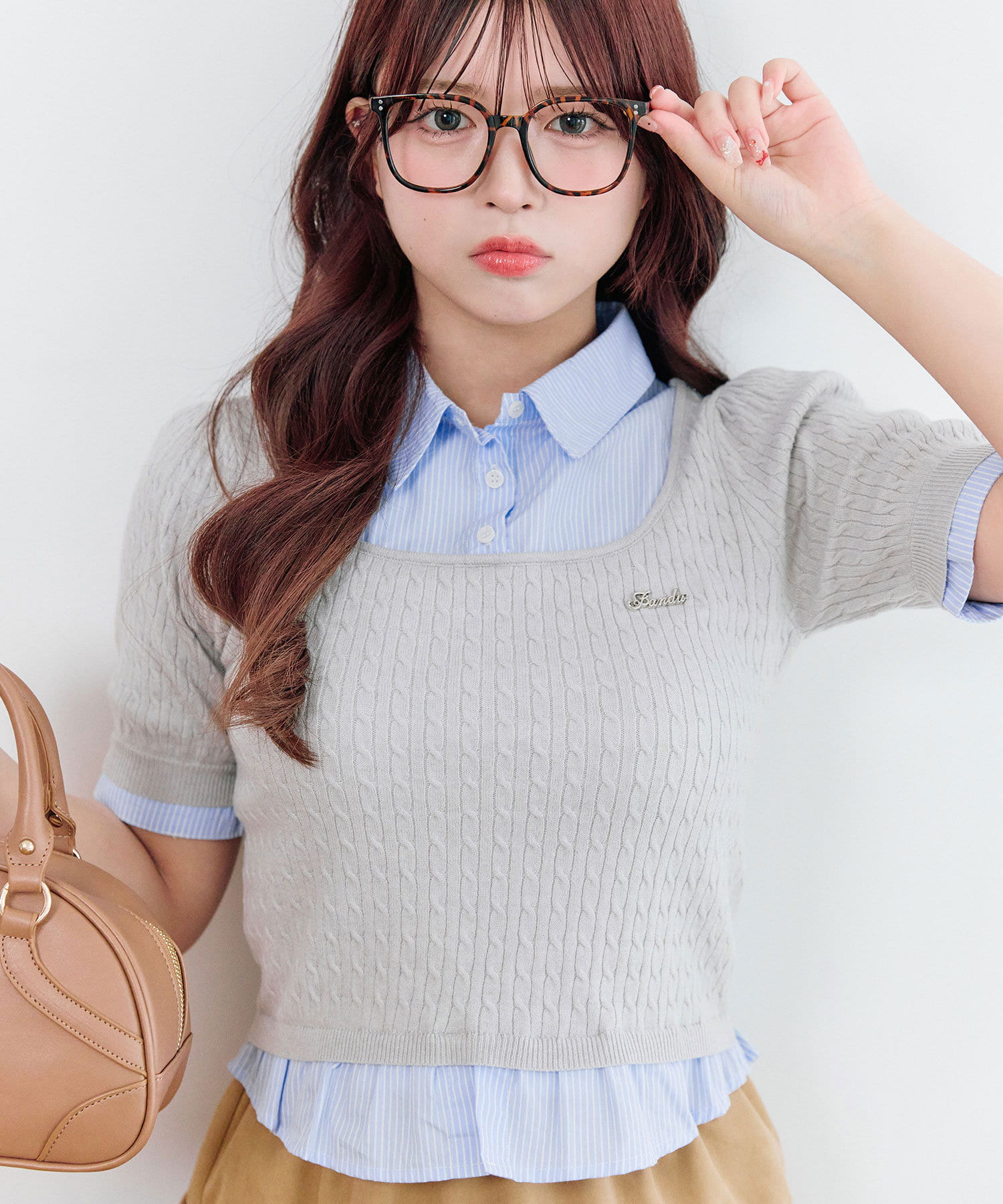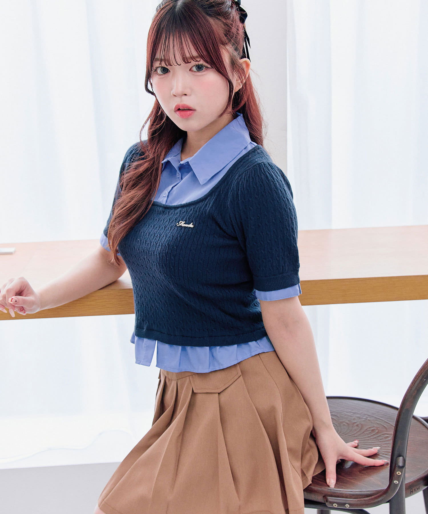 ・シャツとニットのレイヤードデザインで、1枚着るだけでトレンドコーデに仕上がります。