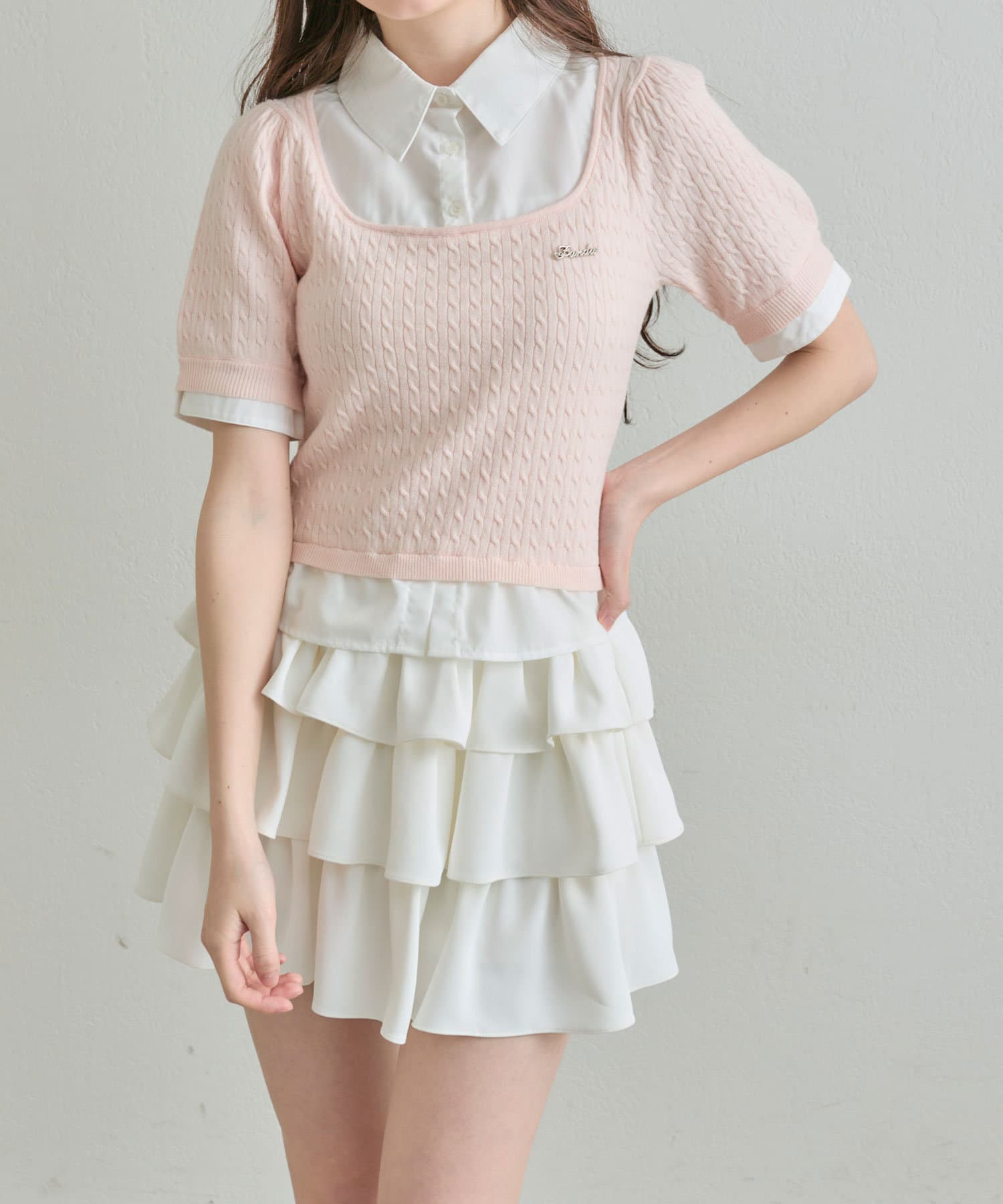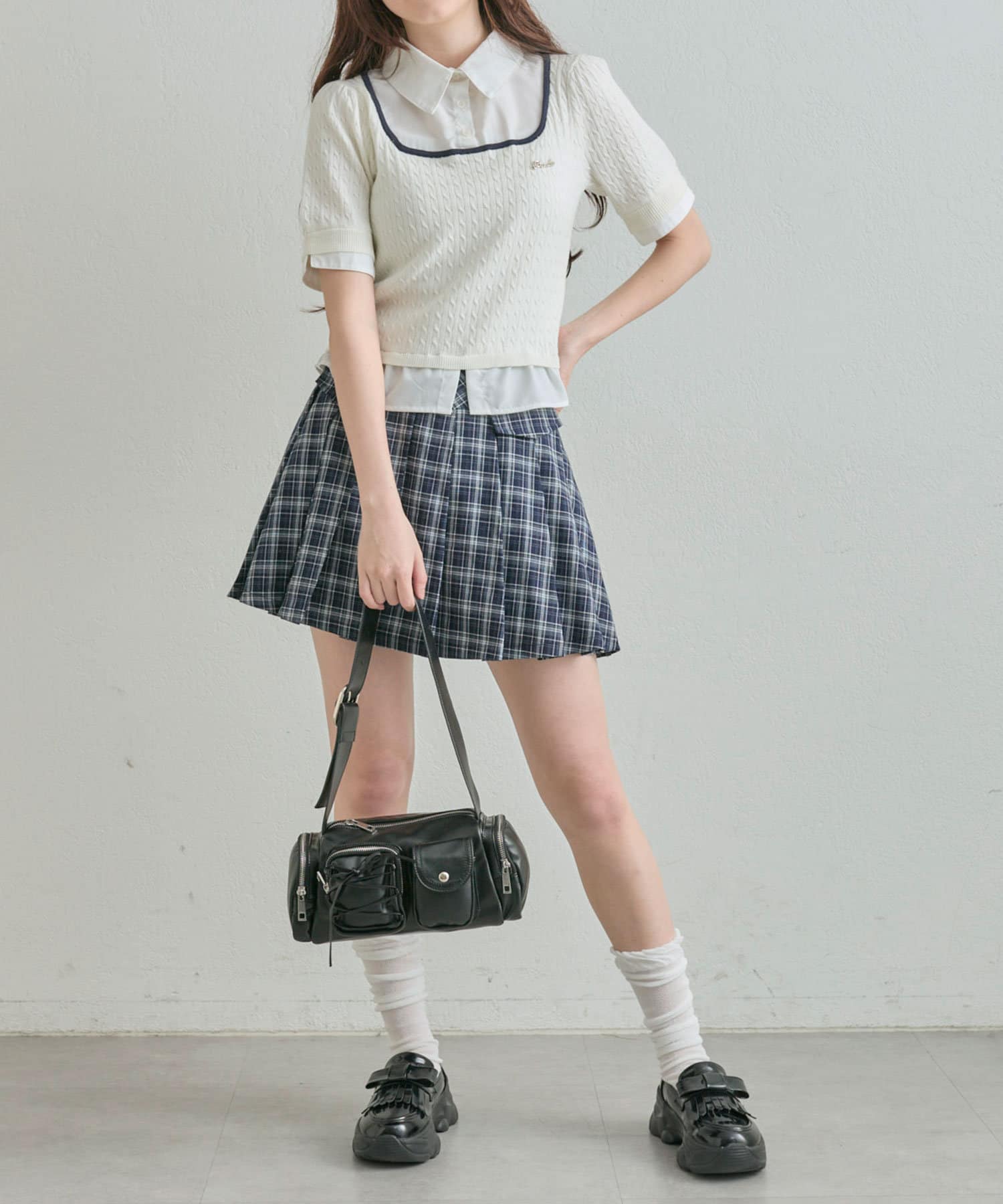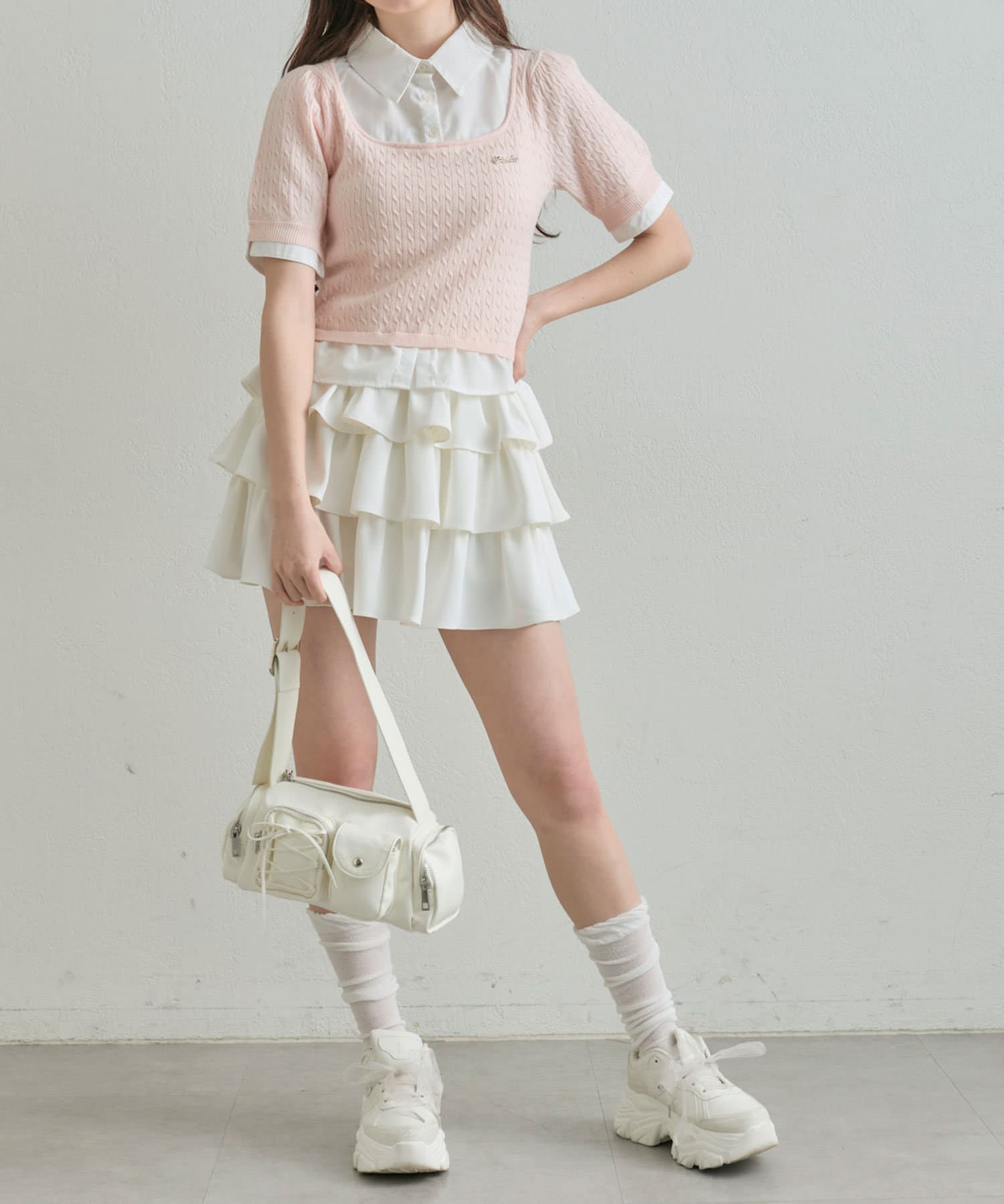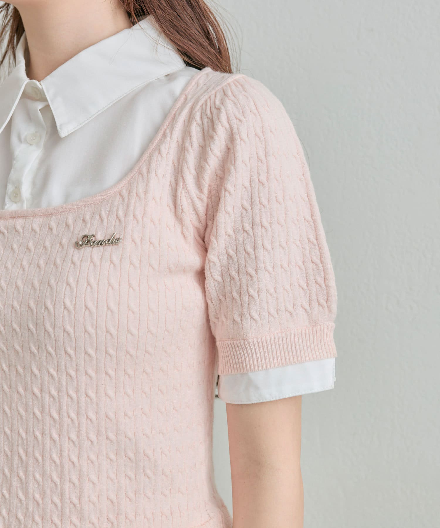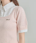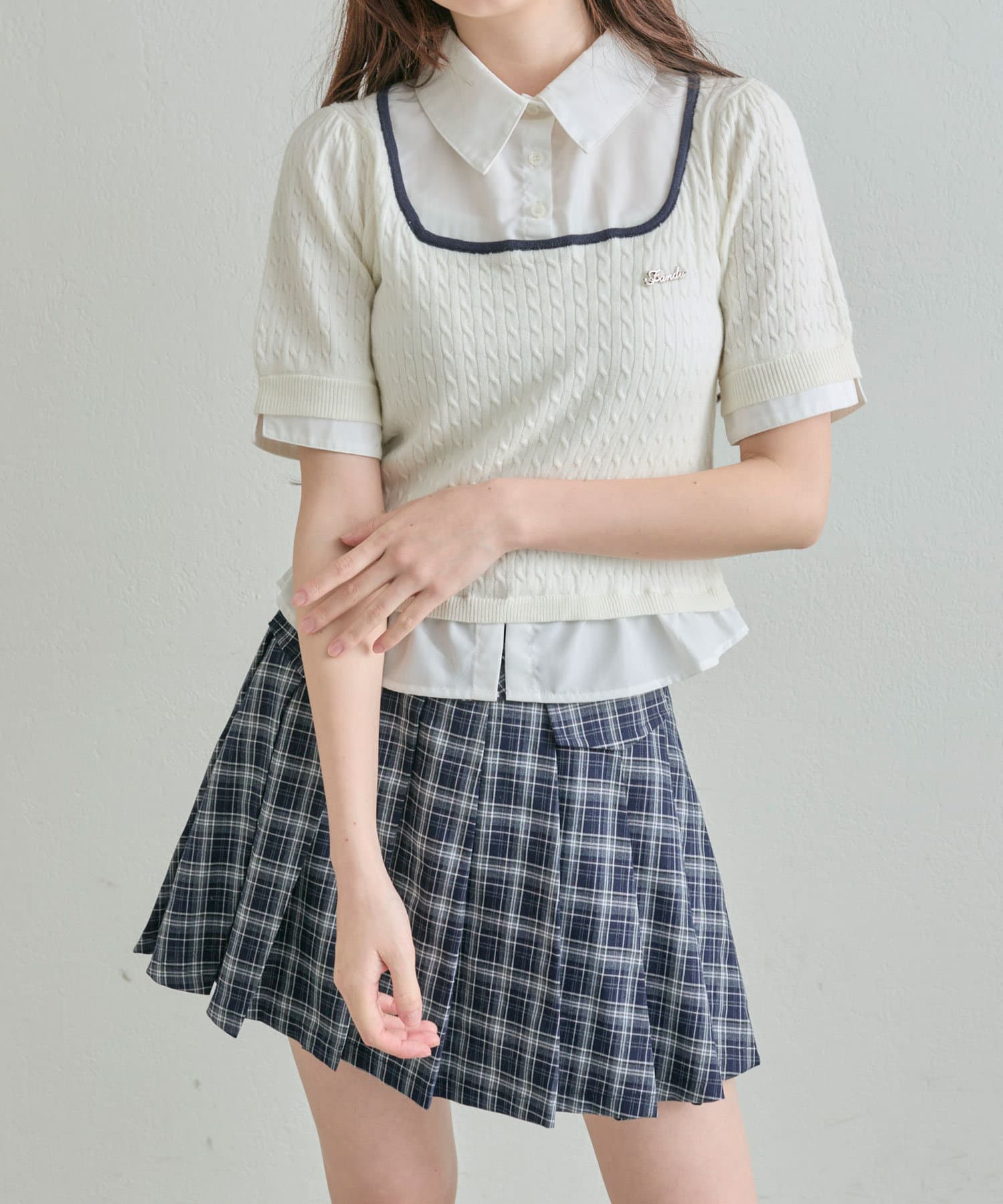 ・シャツとニットのレイヤードデザインで、1枚着るだけでトレンドコーデに仕上がります。