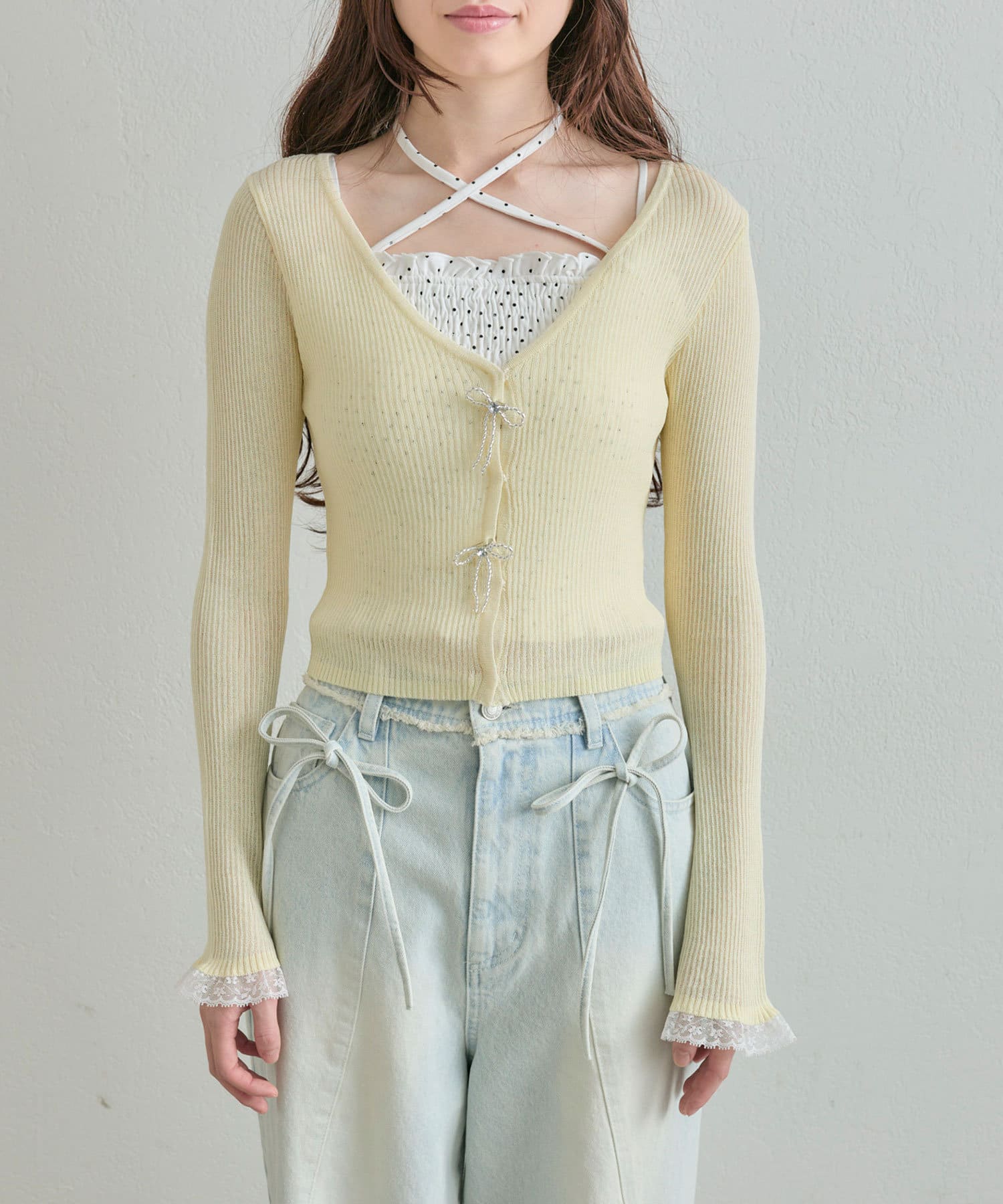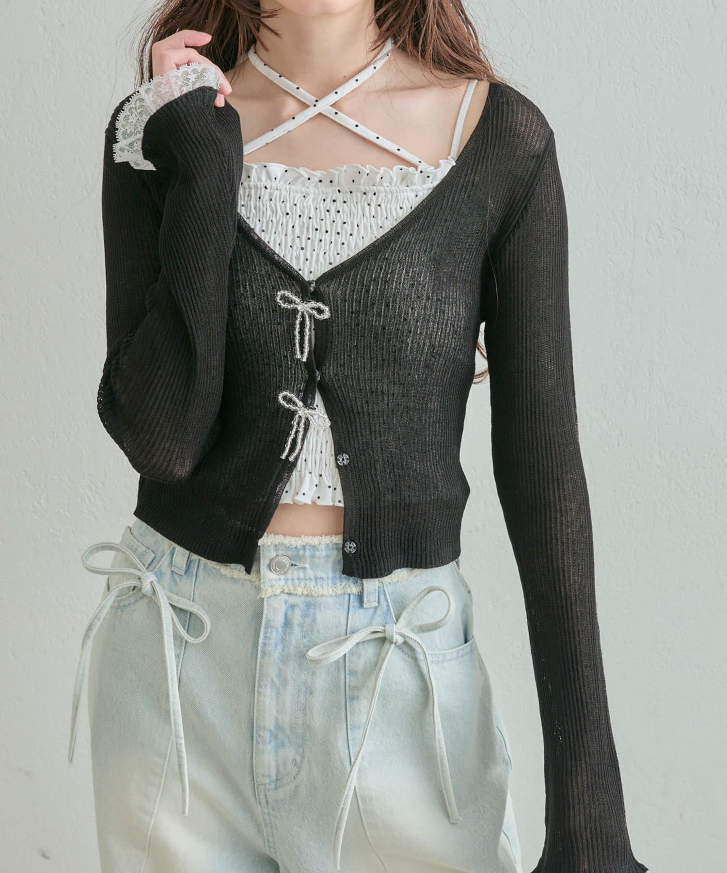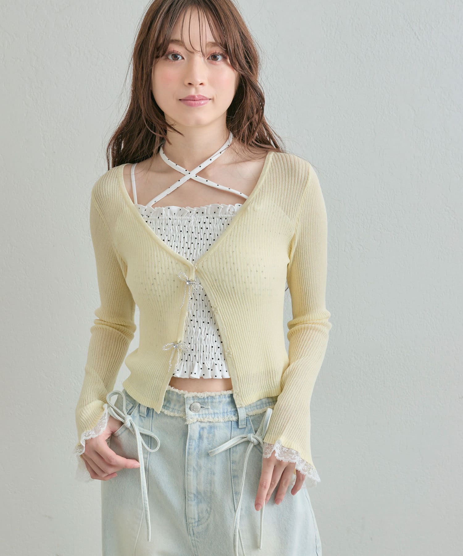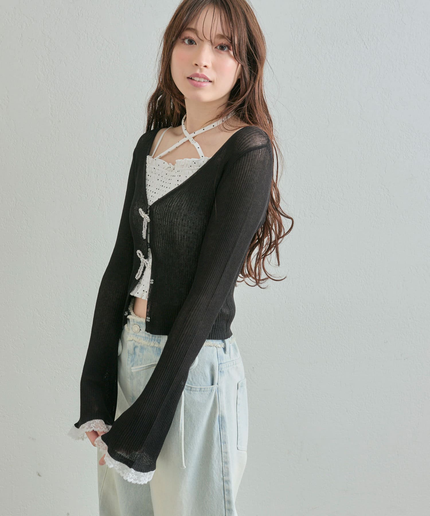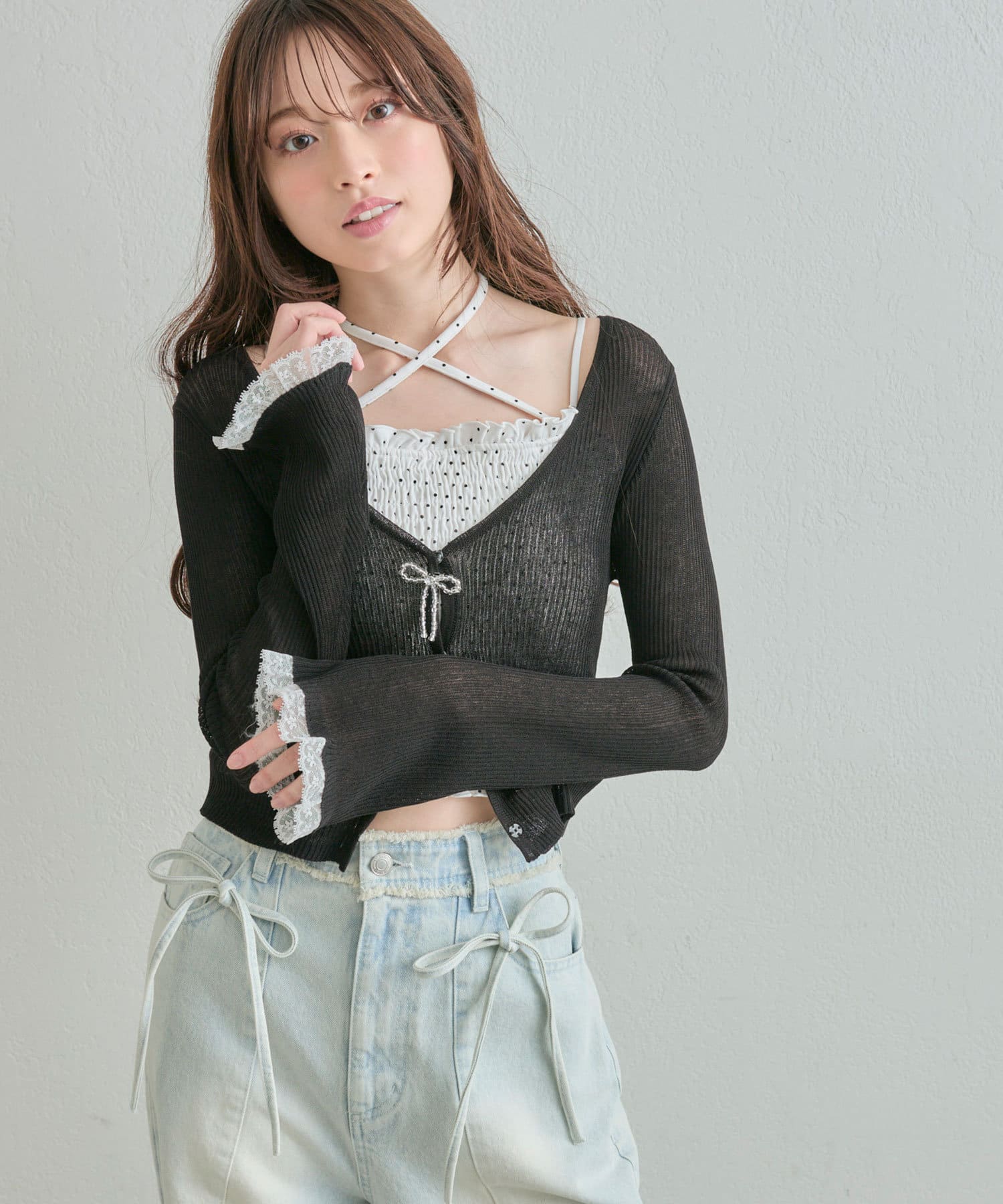 品番 1051050180 素材 ニット部分 レーヨン89% ナイロン11% レース部分 ナイロン100% 原産国 中国 サイズ FREE カテゴリ トップス > カーディガン/ボレロ タイプ レディース ギフト ラッピング 可 取り扱い - アイテムサイズ