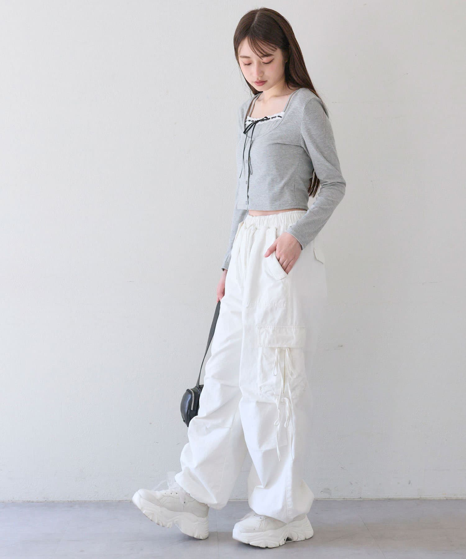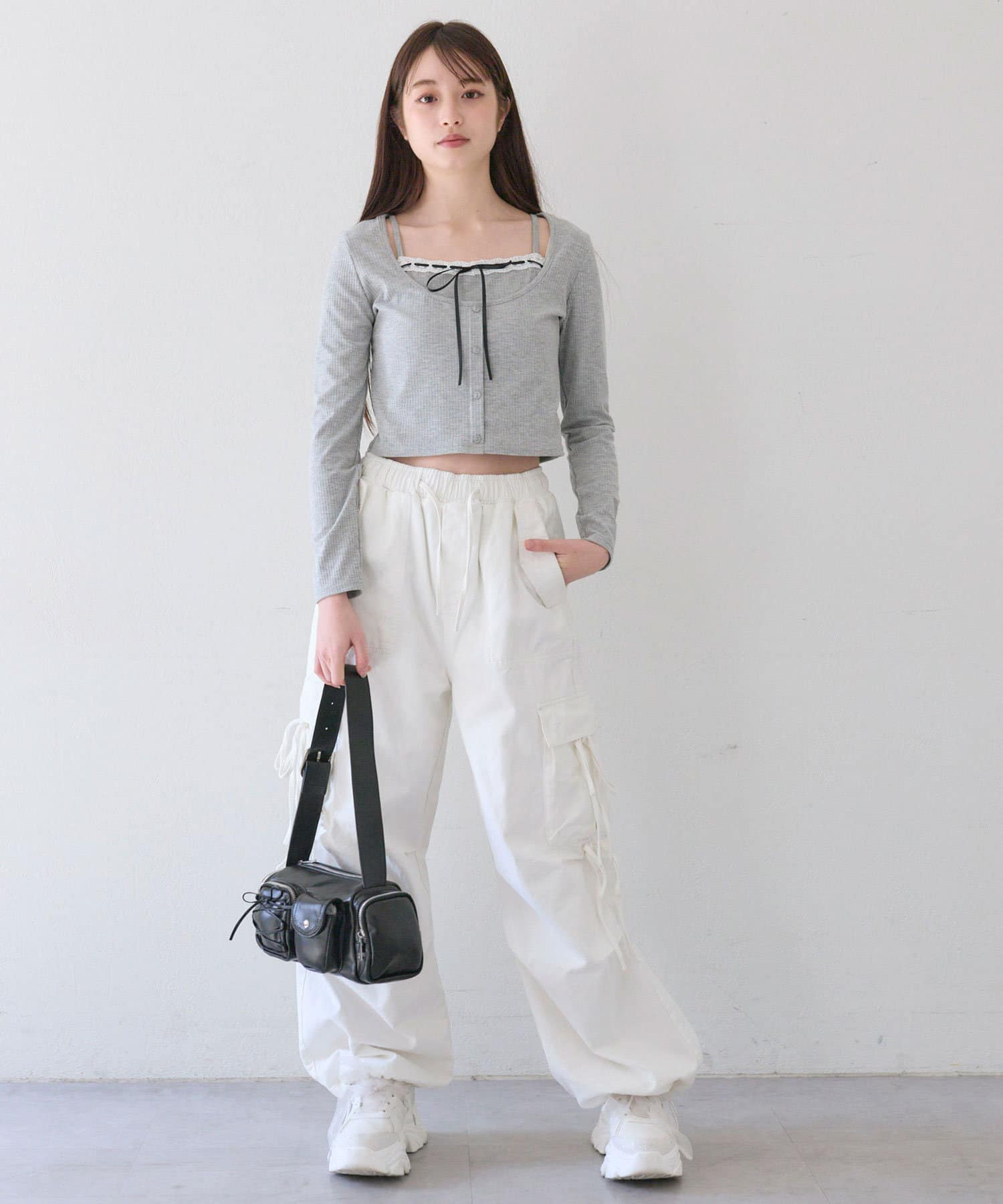 ・インナーはカップ付きのキャミを合わせると、下着のラインを気にせず着れます。