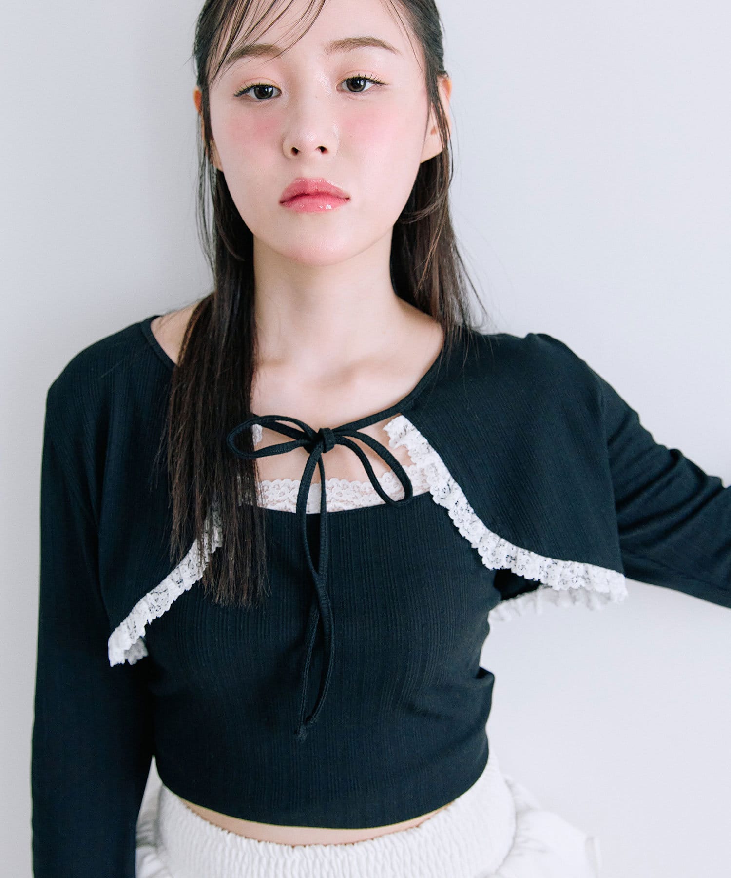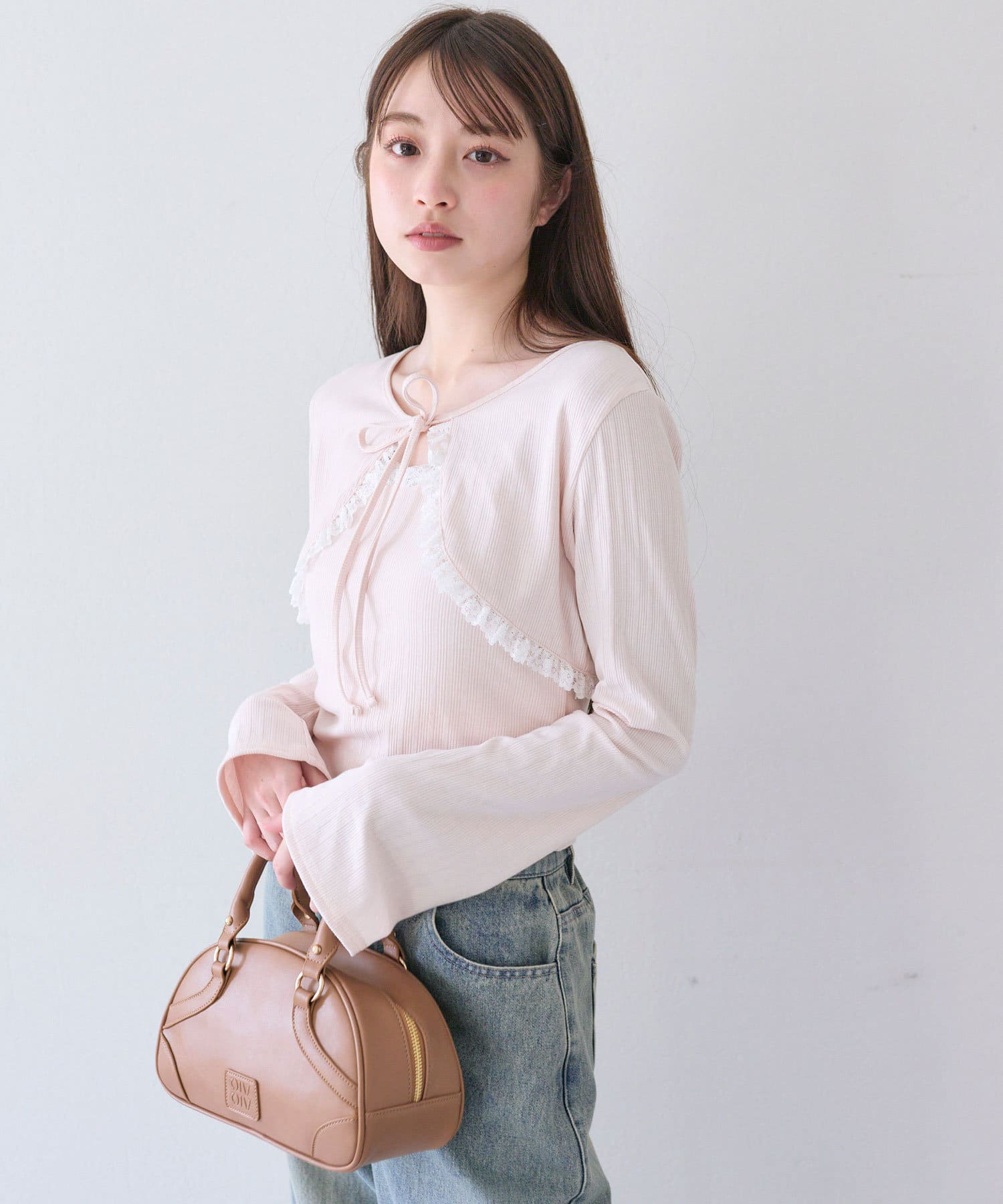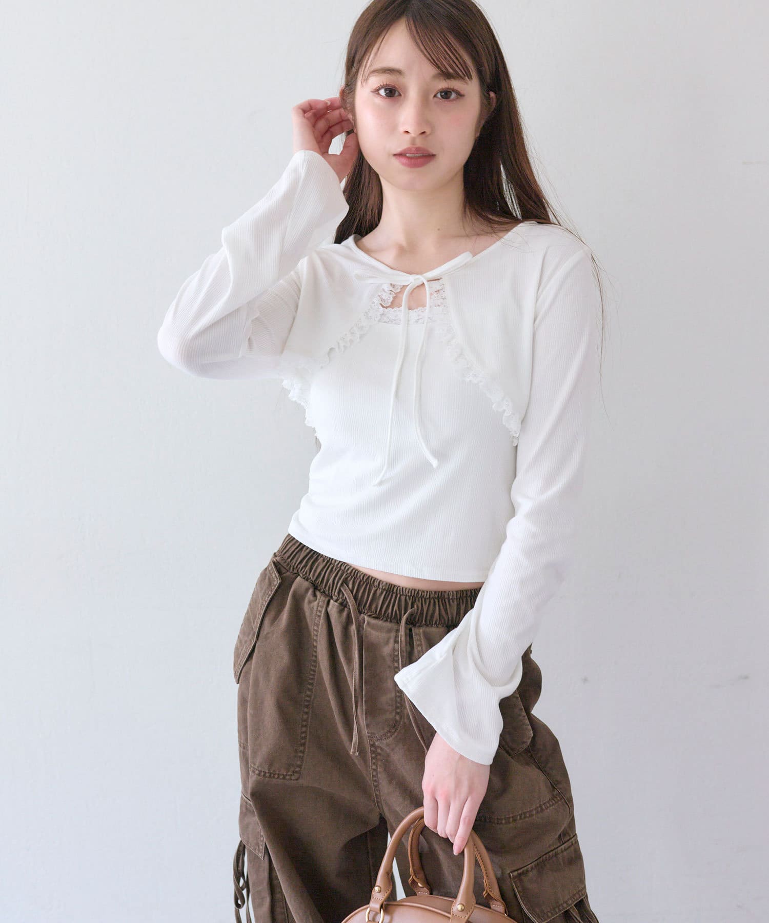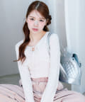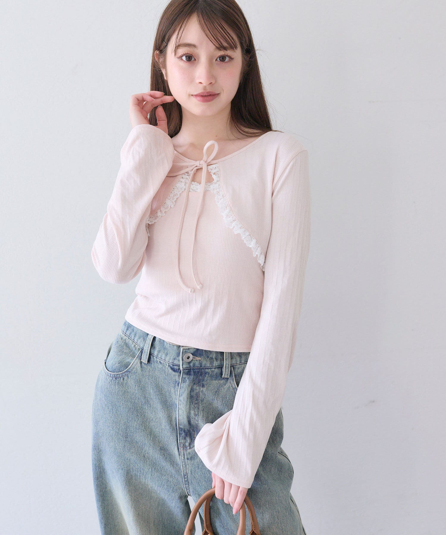 ・リボンとレースがフェミニンな印象の、ガーリーさと上品さを兼ね備えたキャミとボレロのセット。