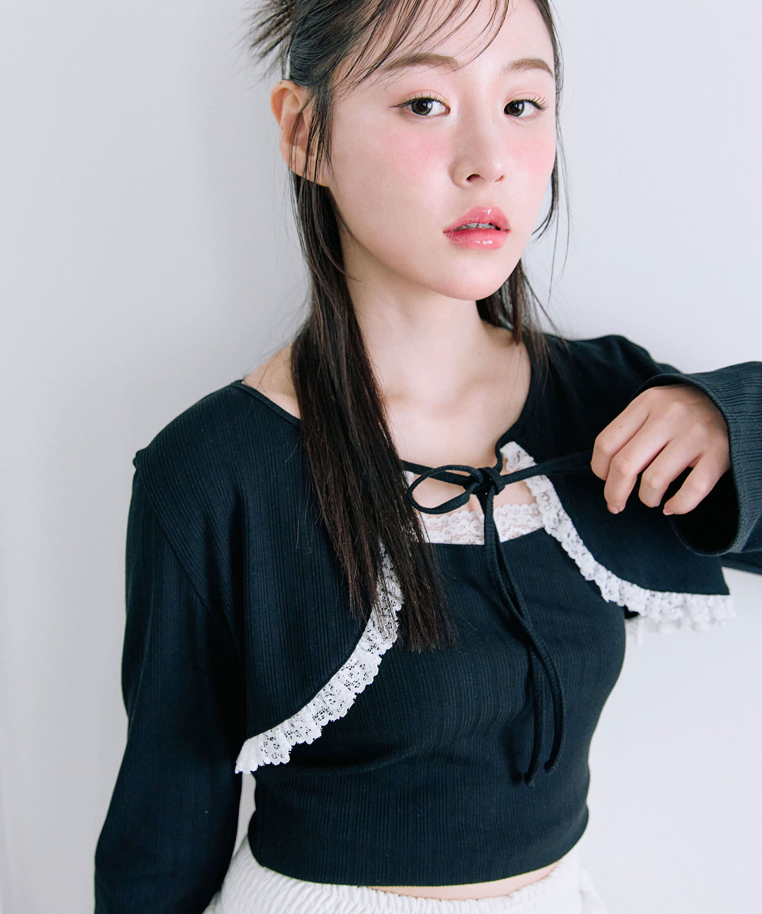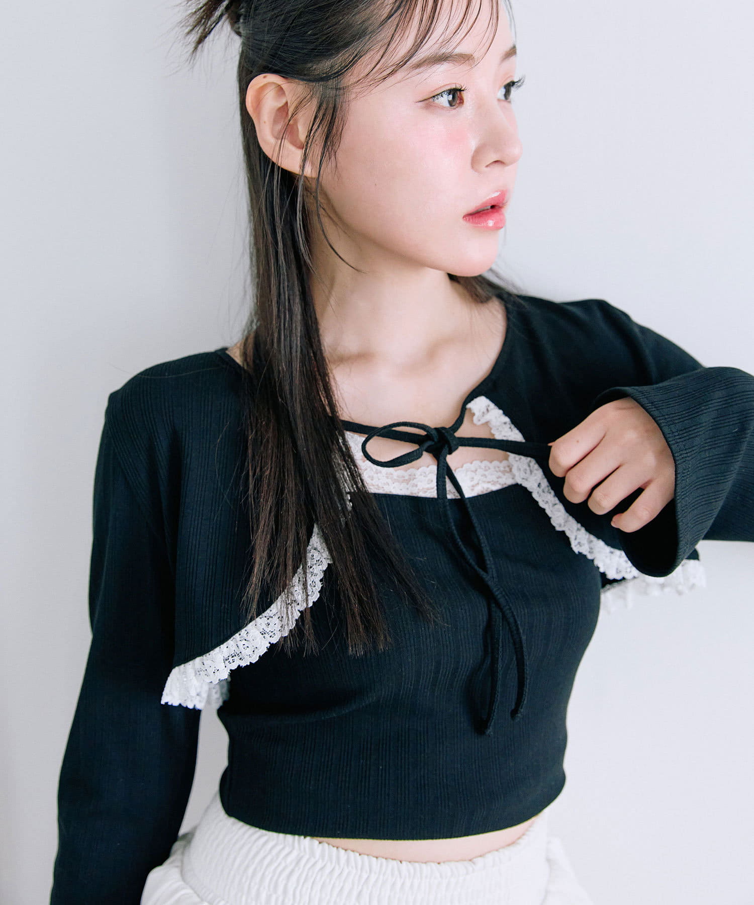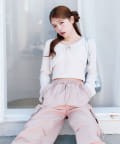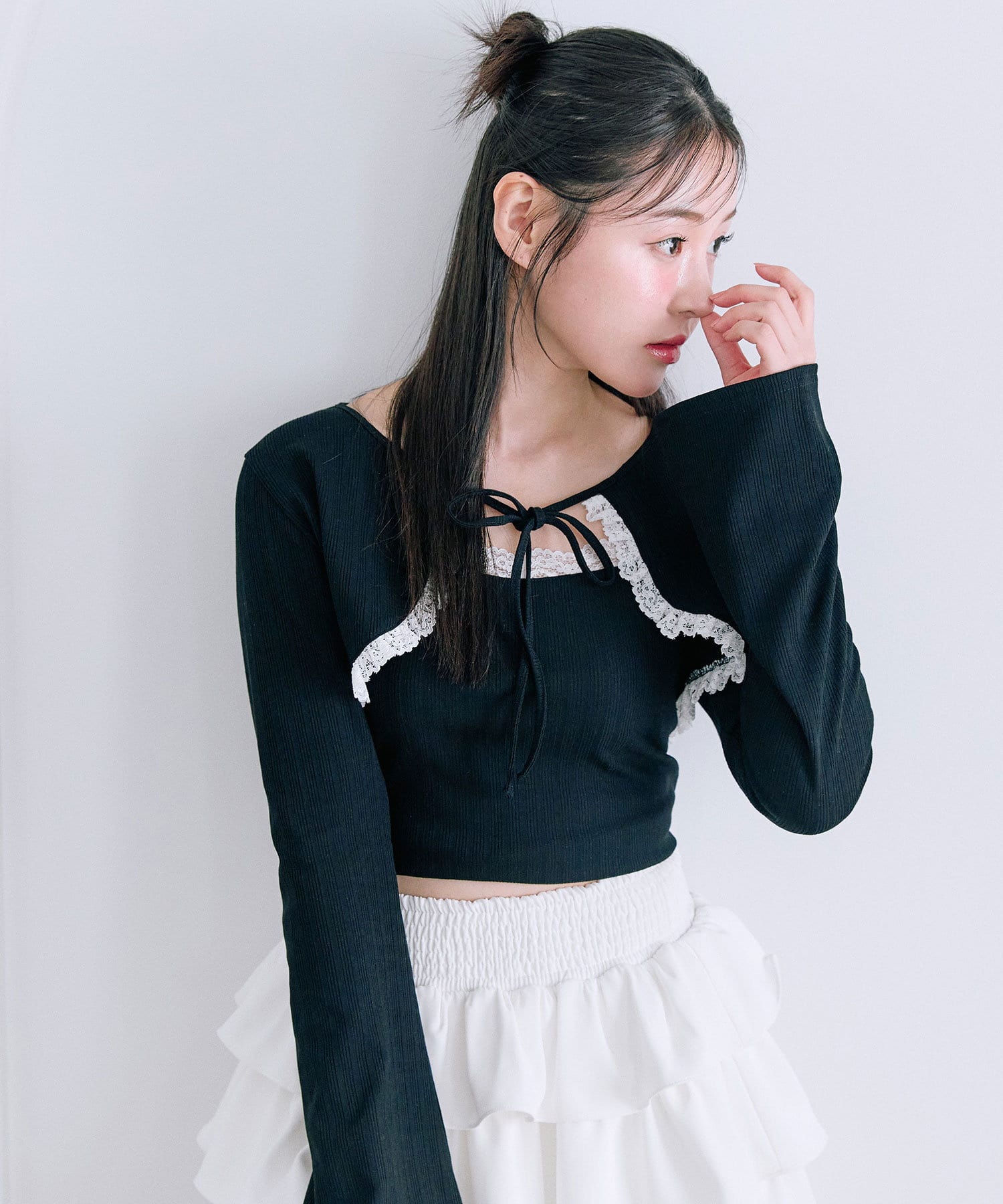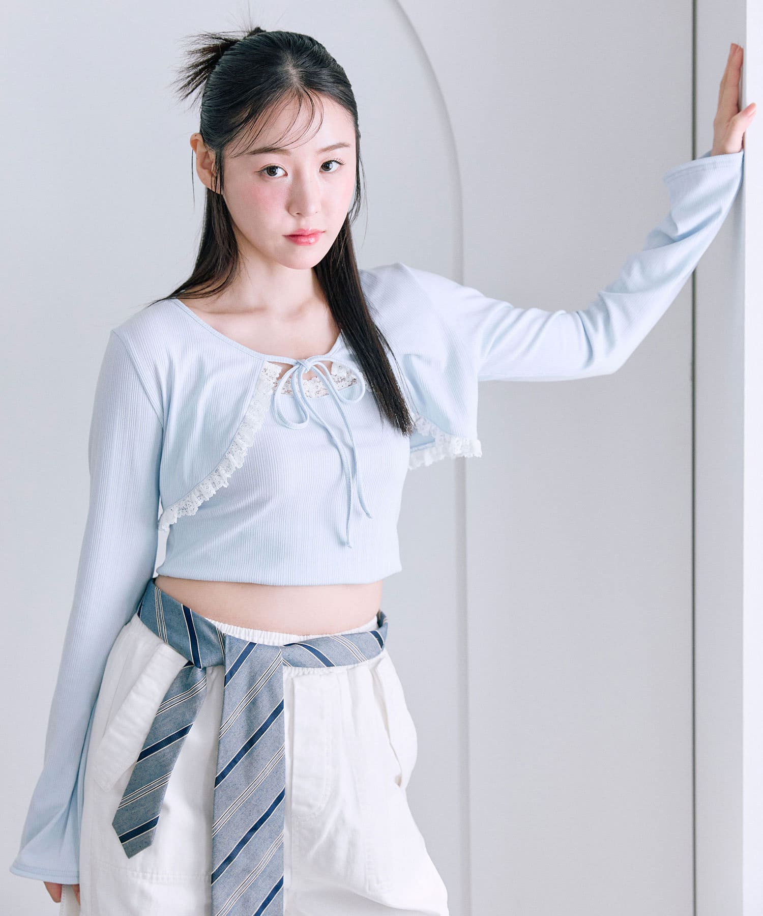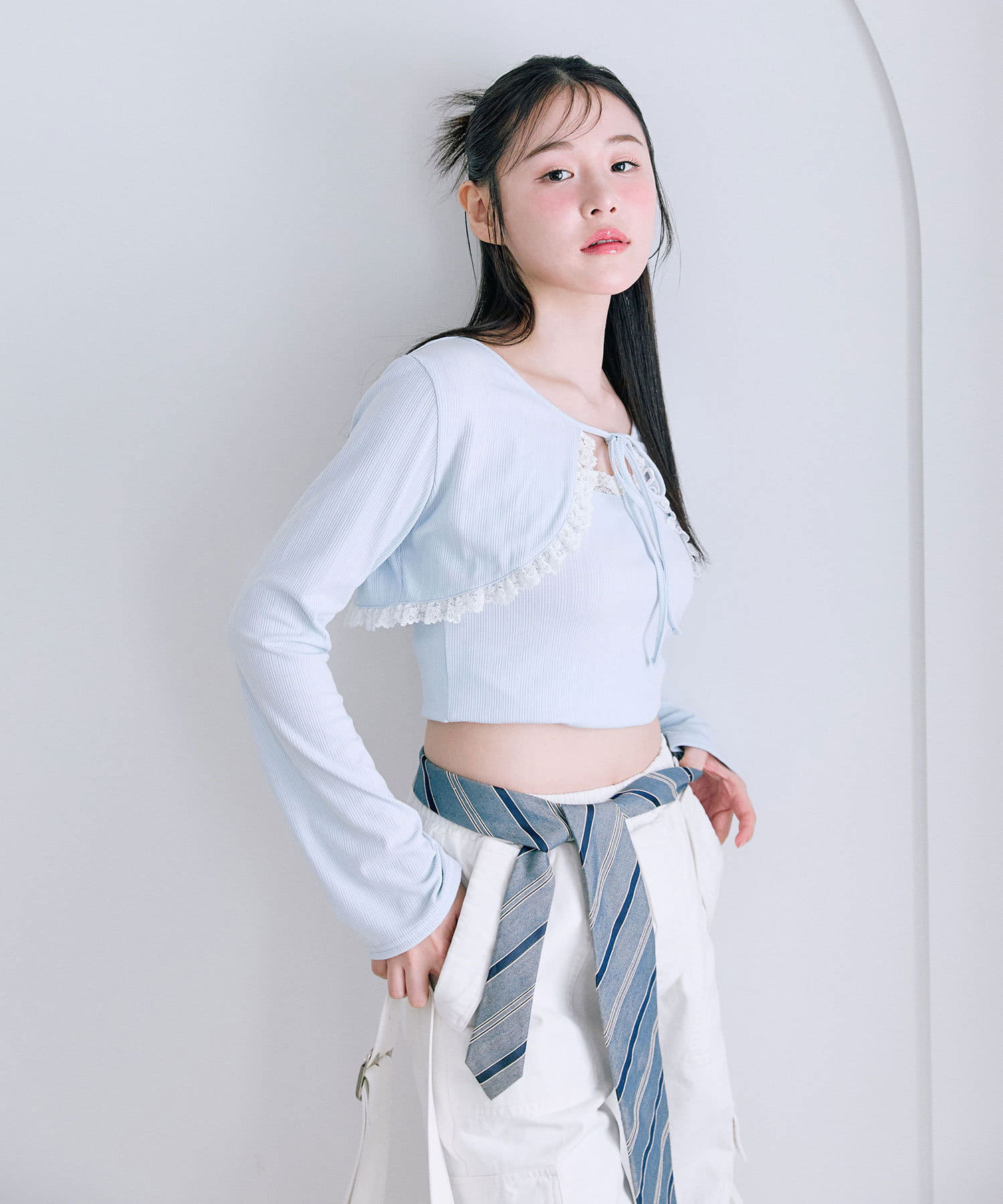 ・リボンとレースがフェミニンな印象の、ガーリーさと上品さを兼ね備えたキャミとボレロのセット。
