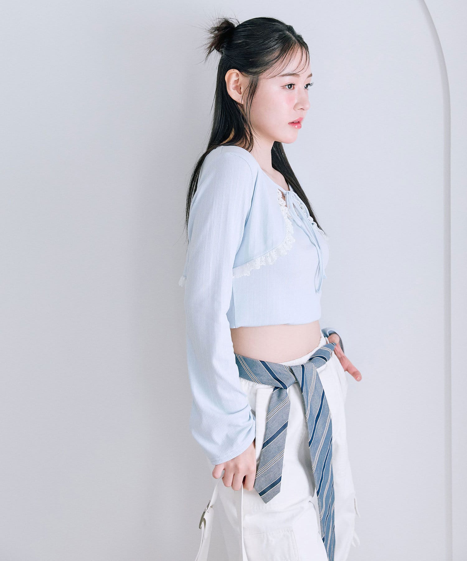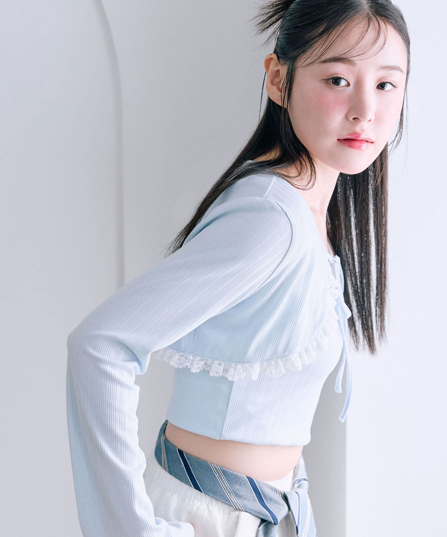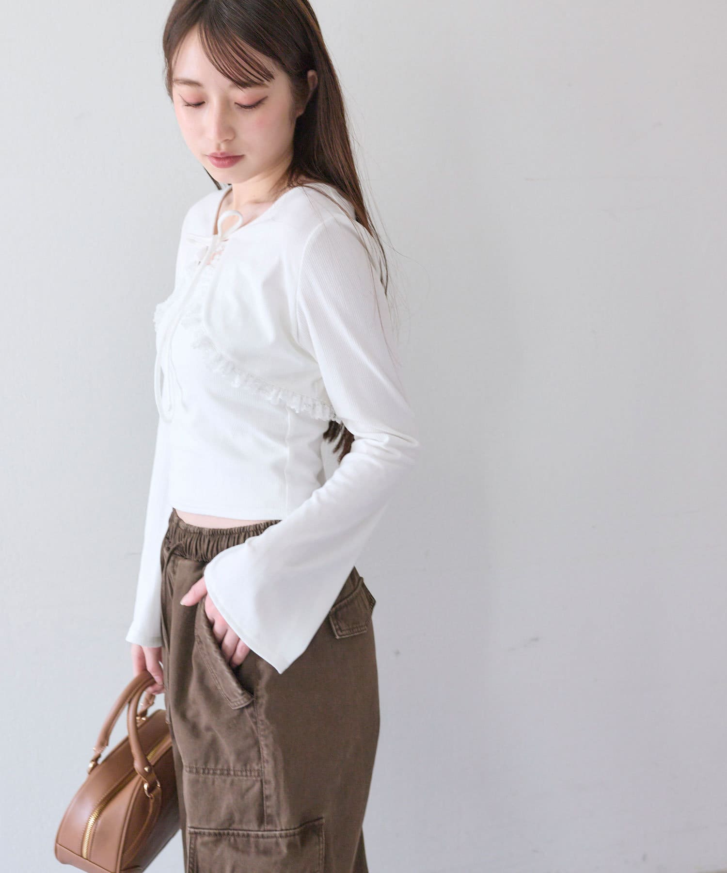 ・キャミインナーはカーディガンに合わせると、胸元のレースがコーデを華やかにします。