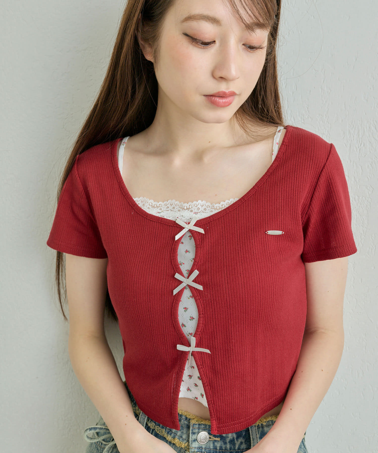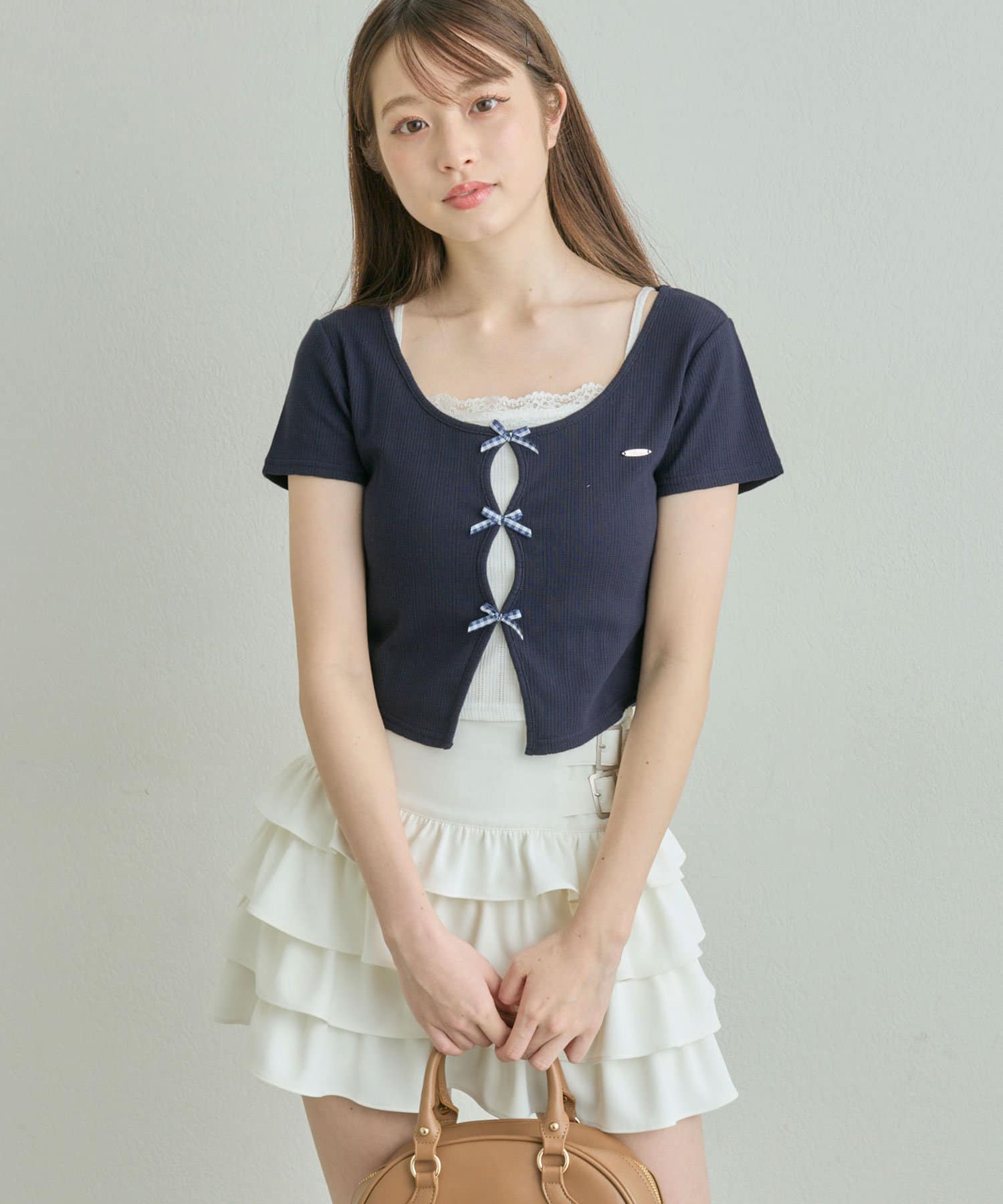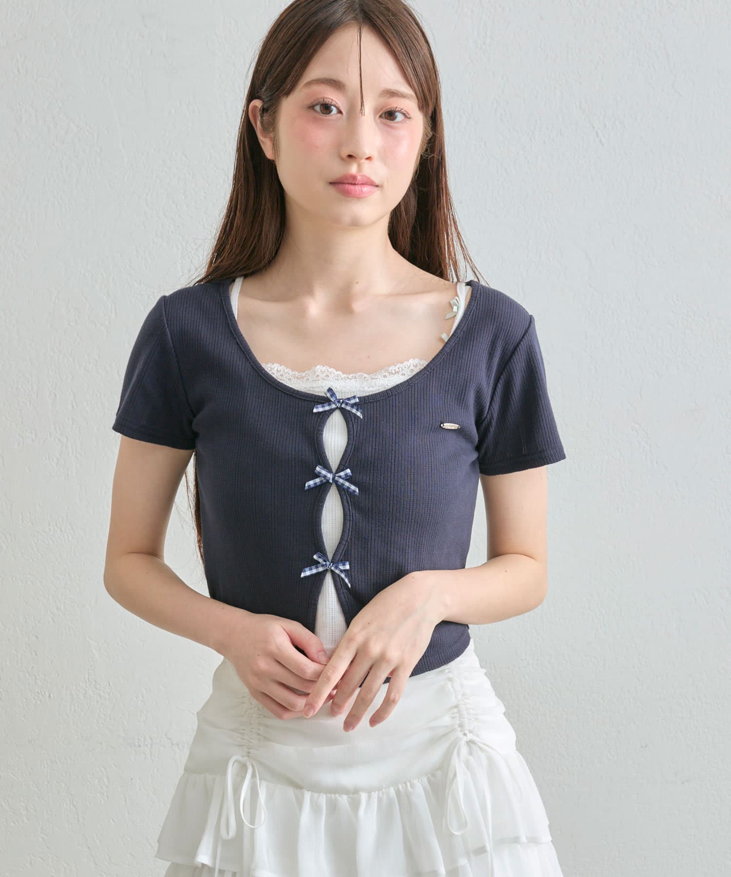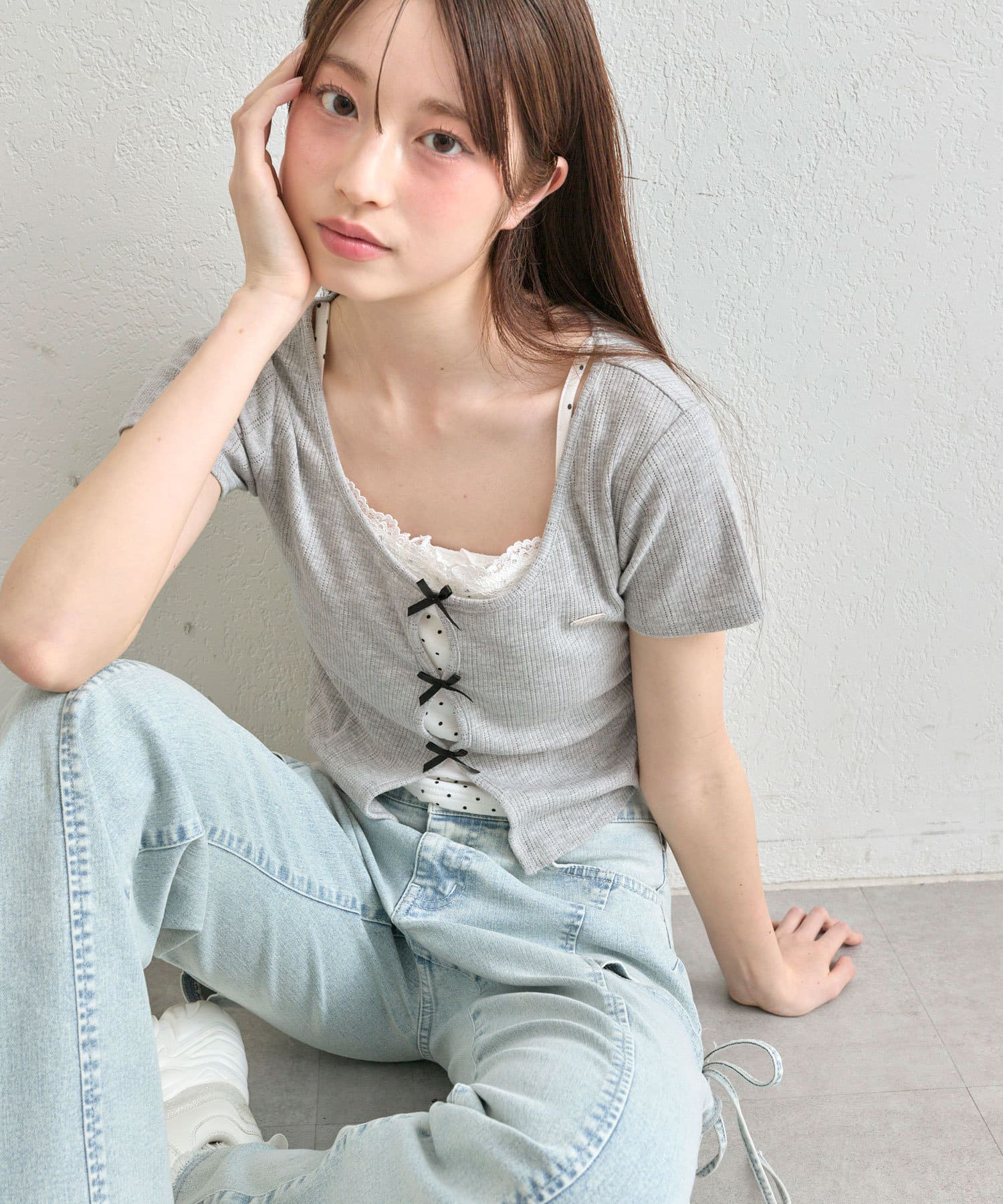 ・小さいリボンに胸元のレースなどかわいい要素たくさんのトップス。