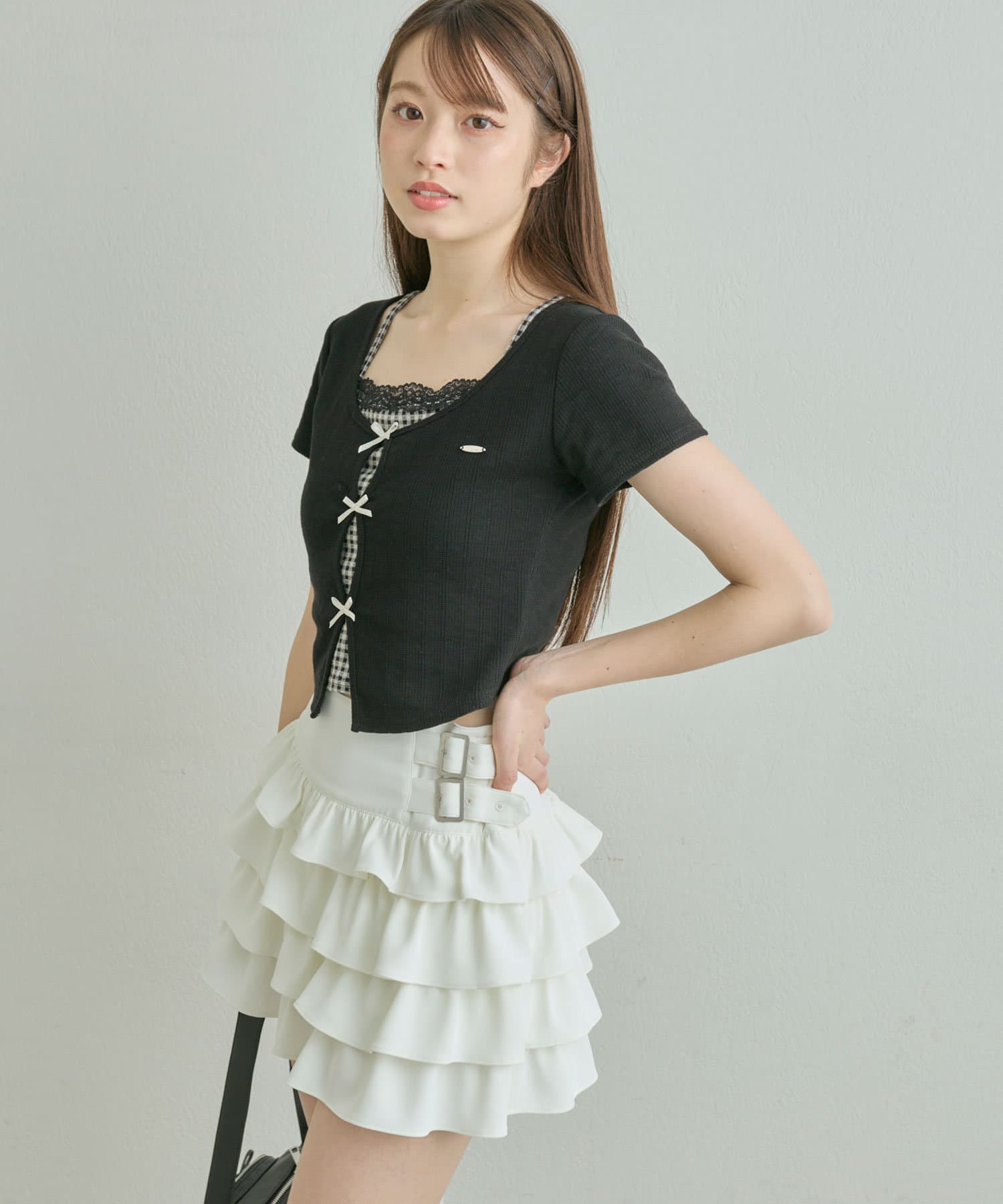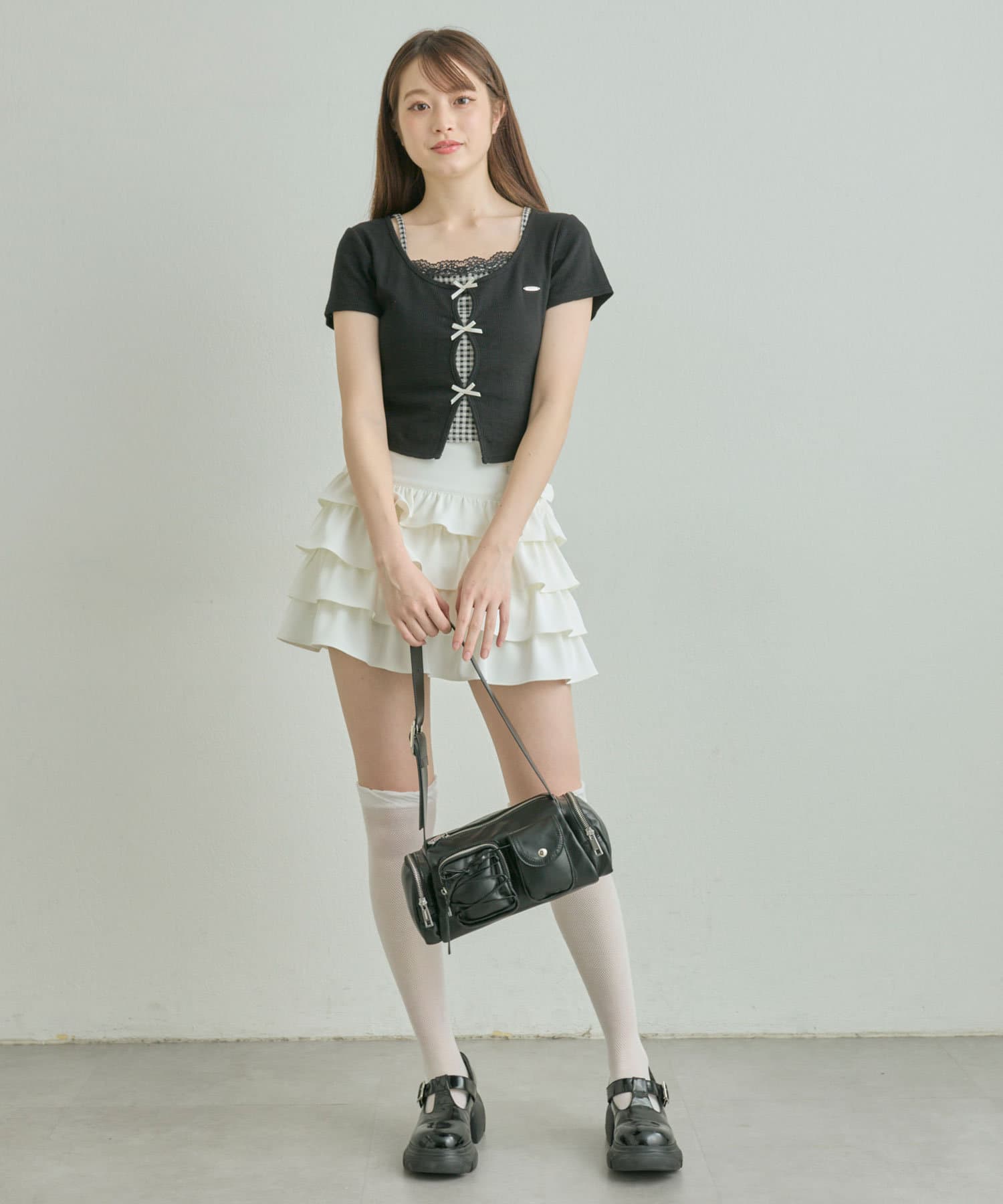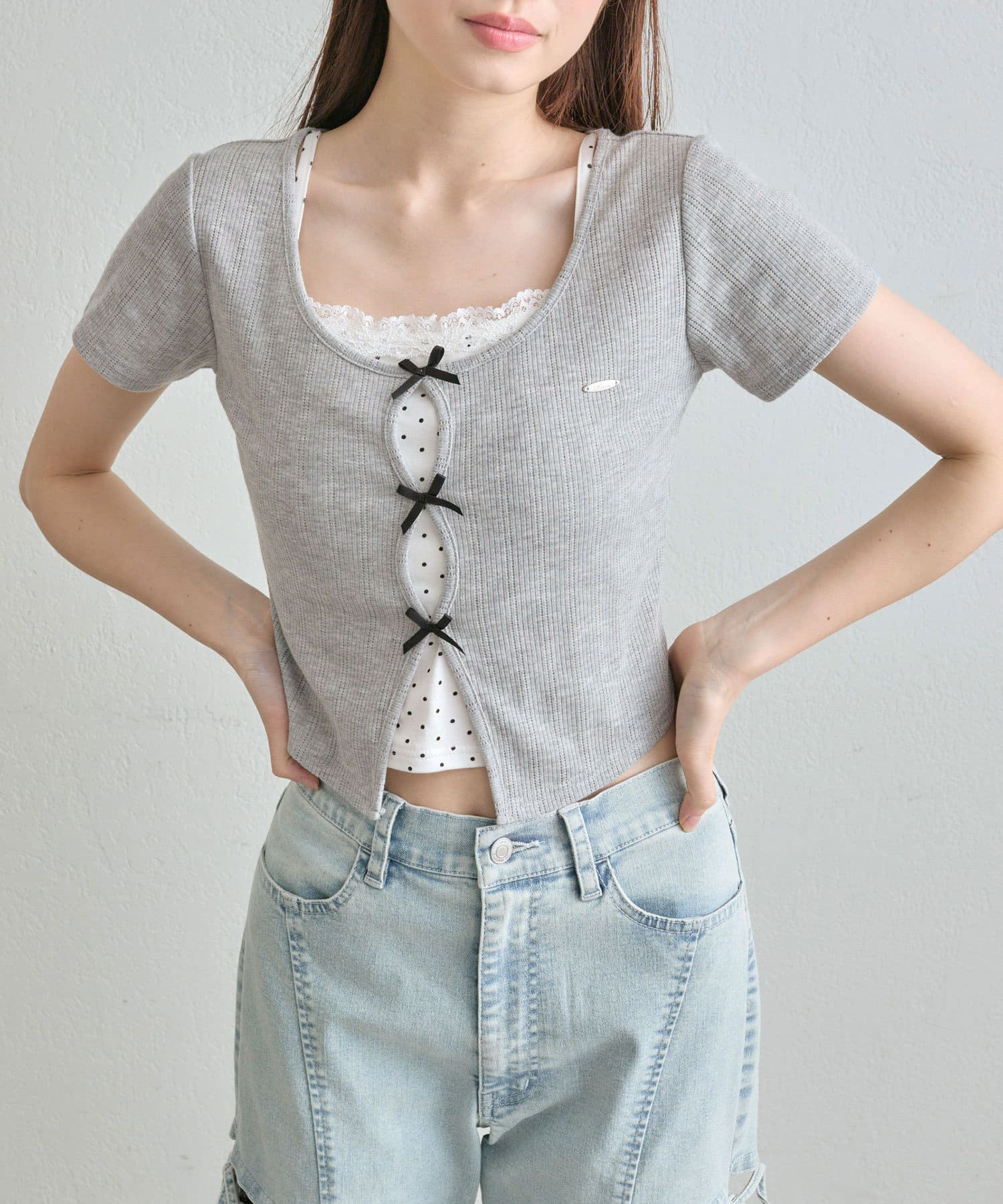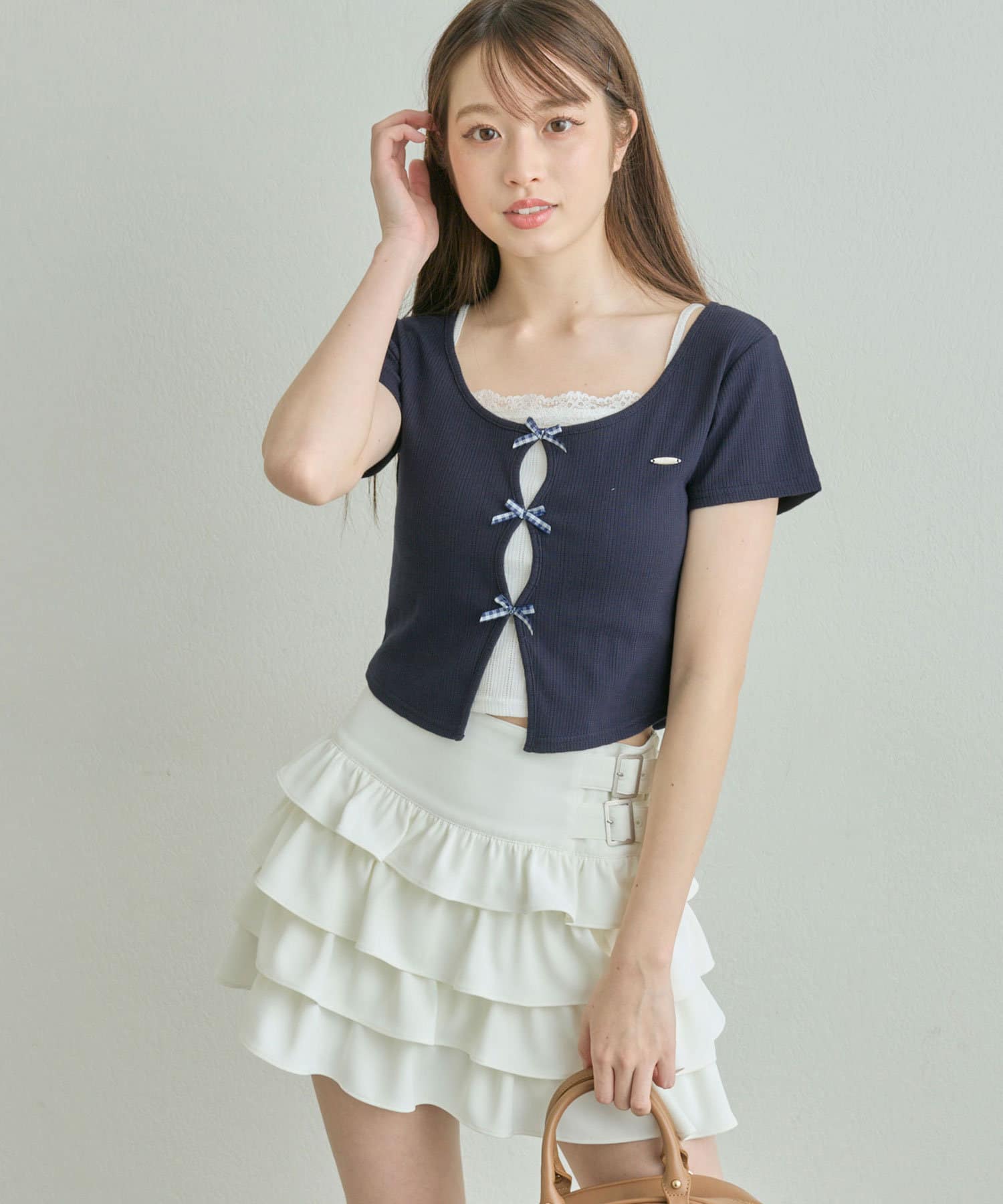・小さいリボンに胸元のレースなどかわいい要素たくさんのトップス。