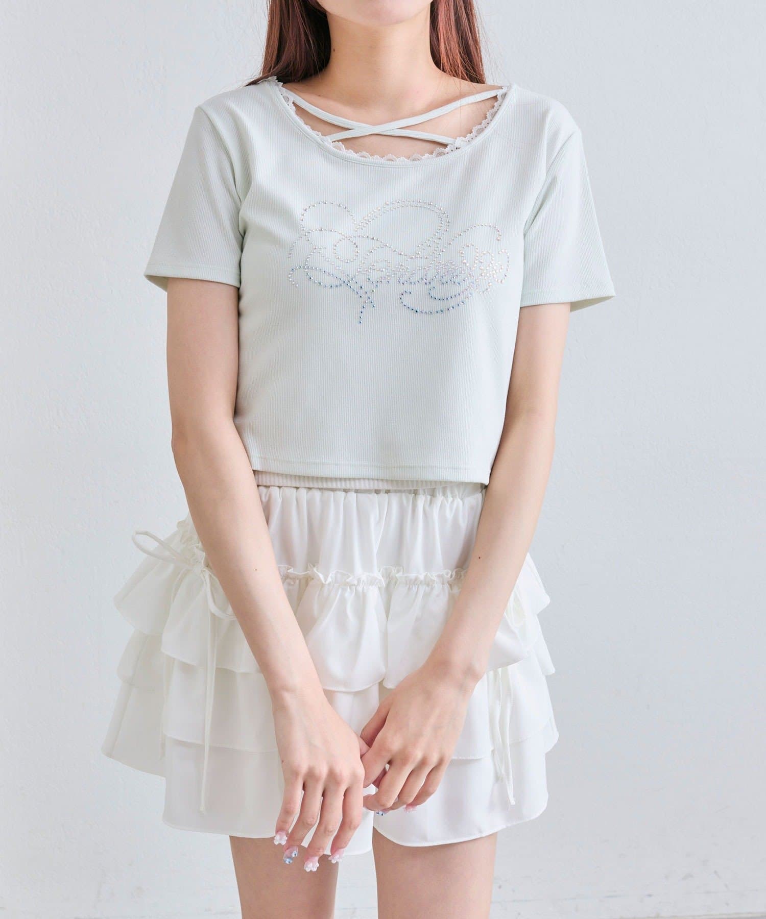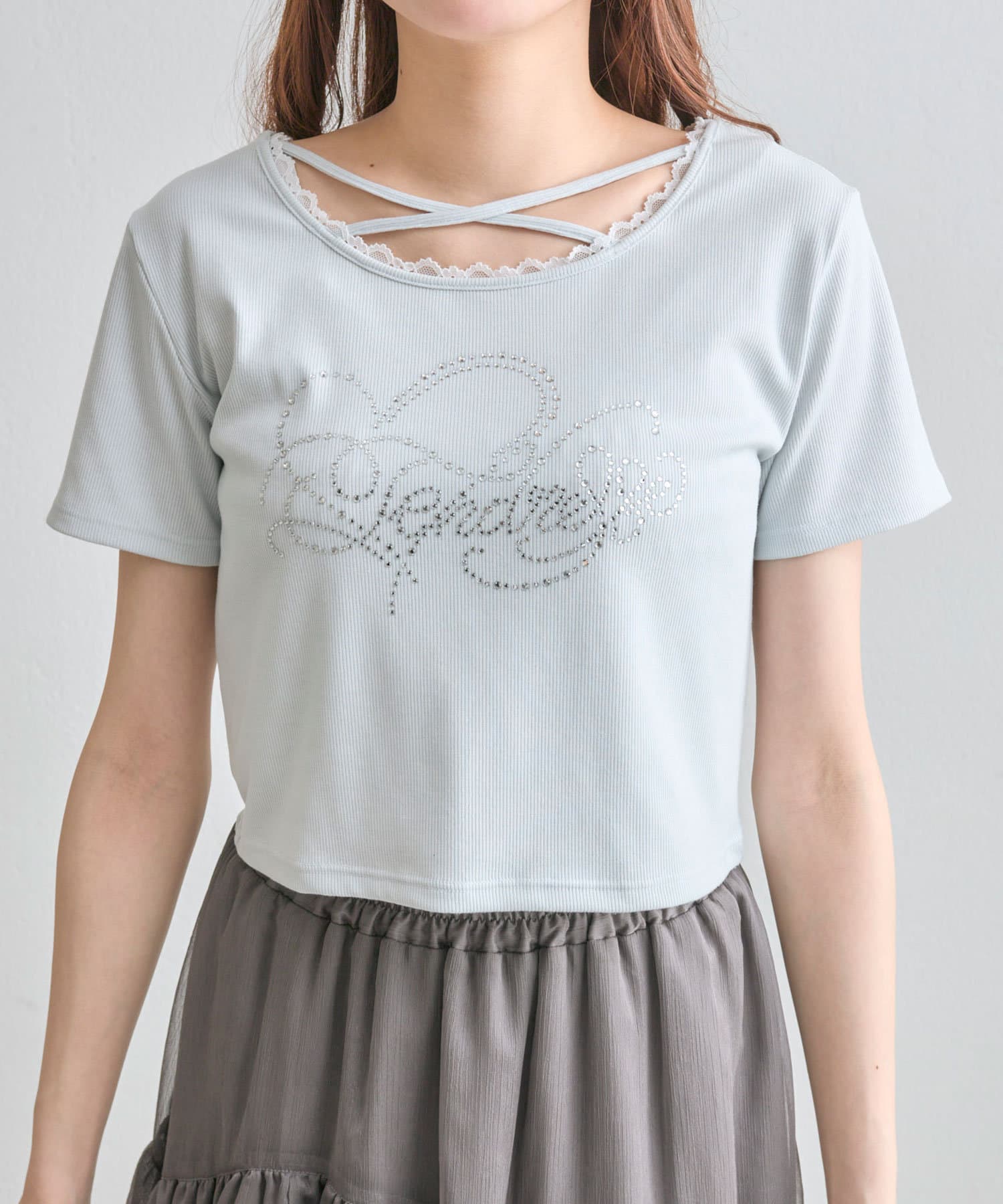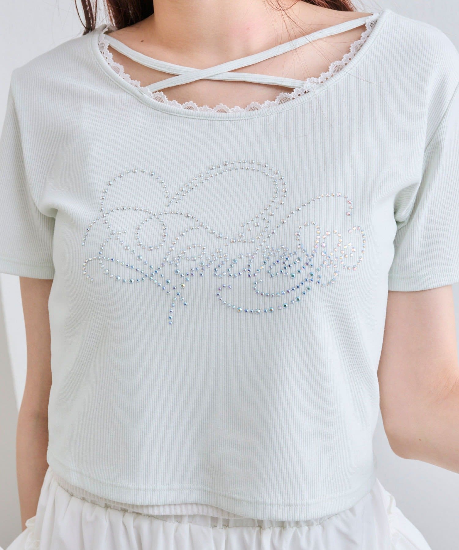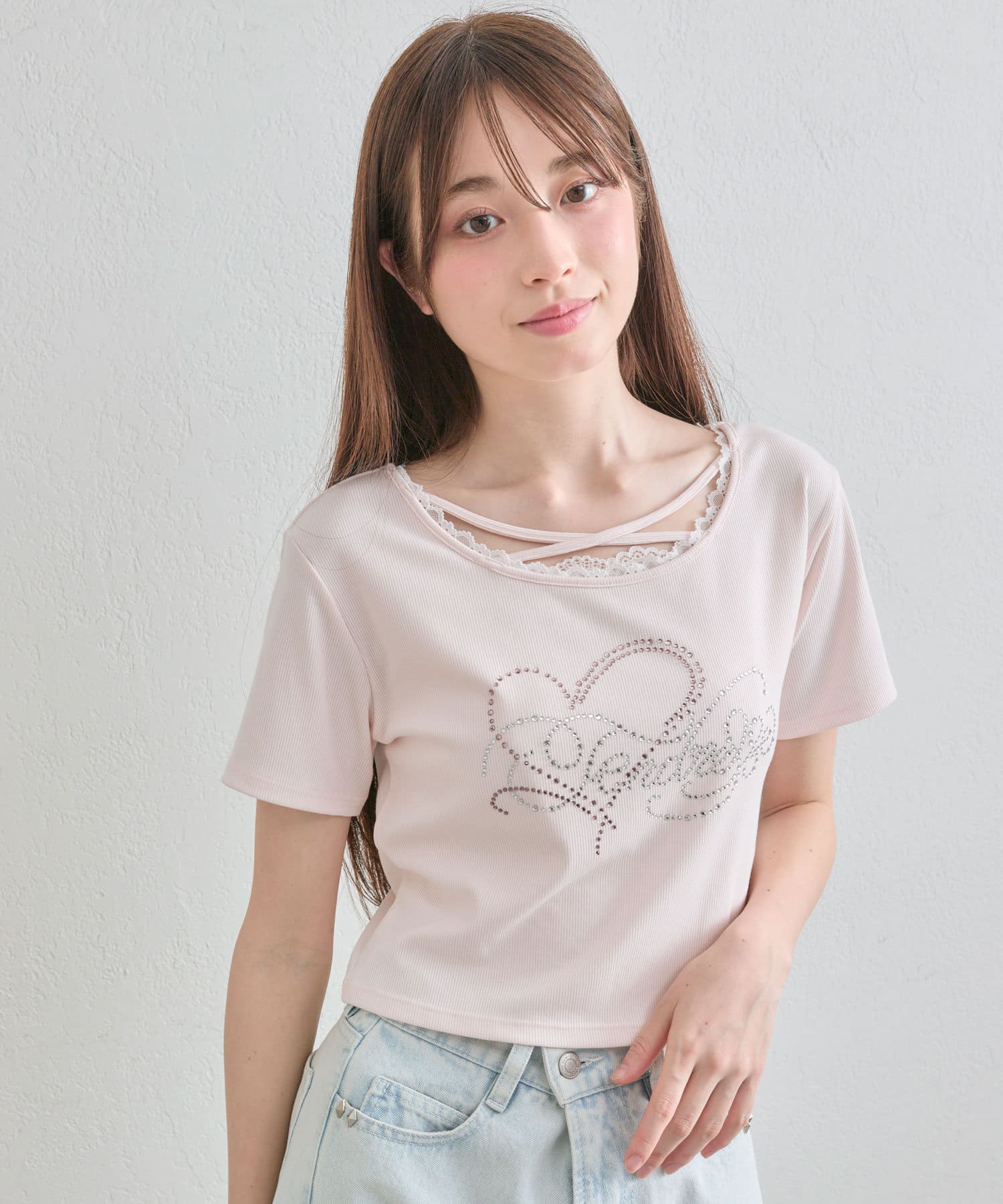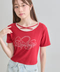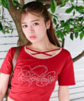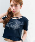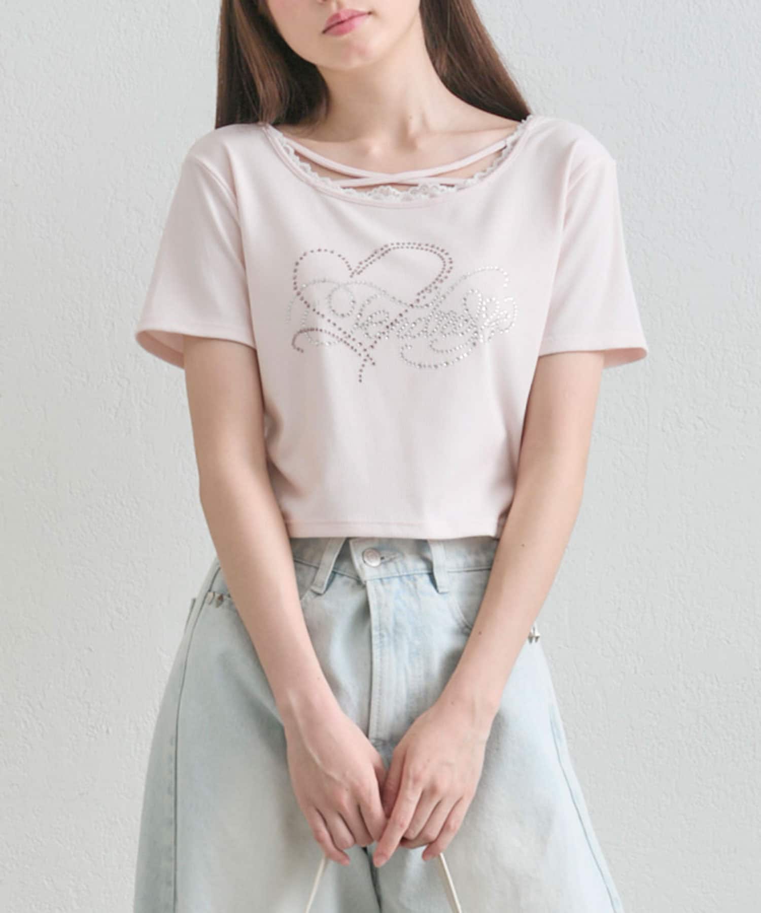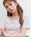 ・レースやきらきらロゴ、フロントのクロスデザインなど、かわいい要素たっぷりなガーリーTシャツ。