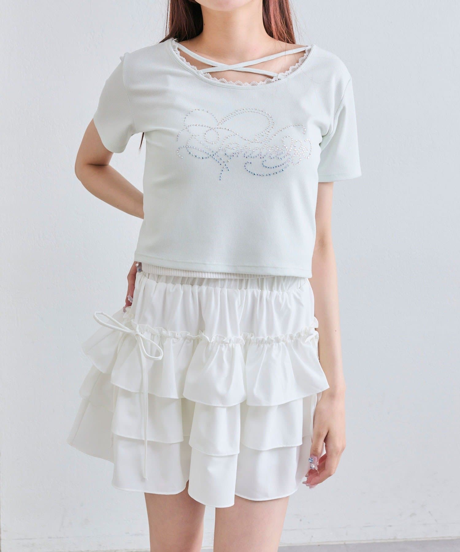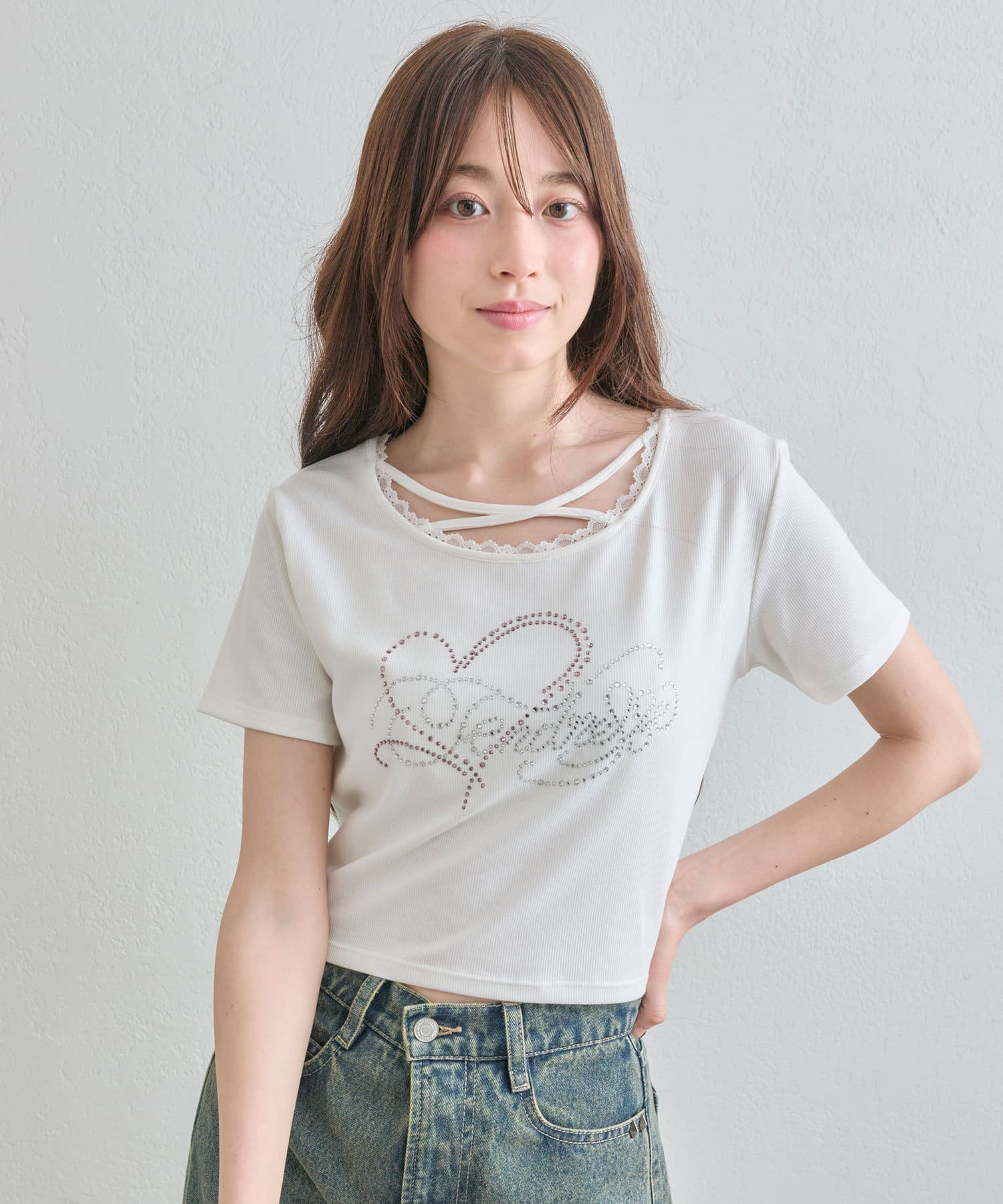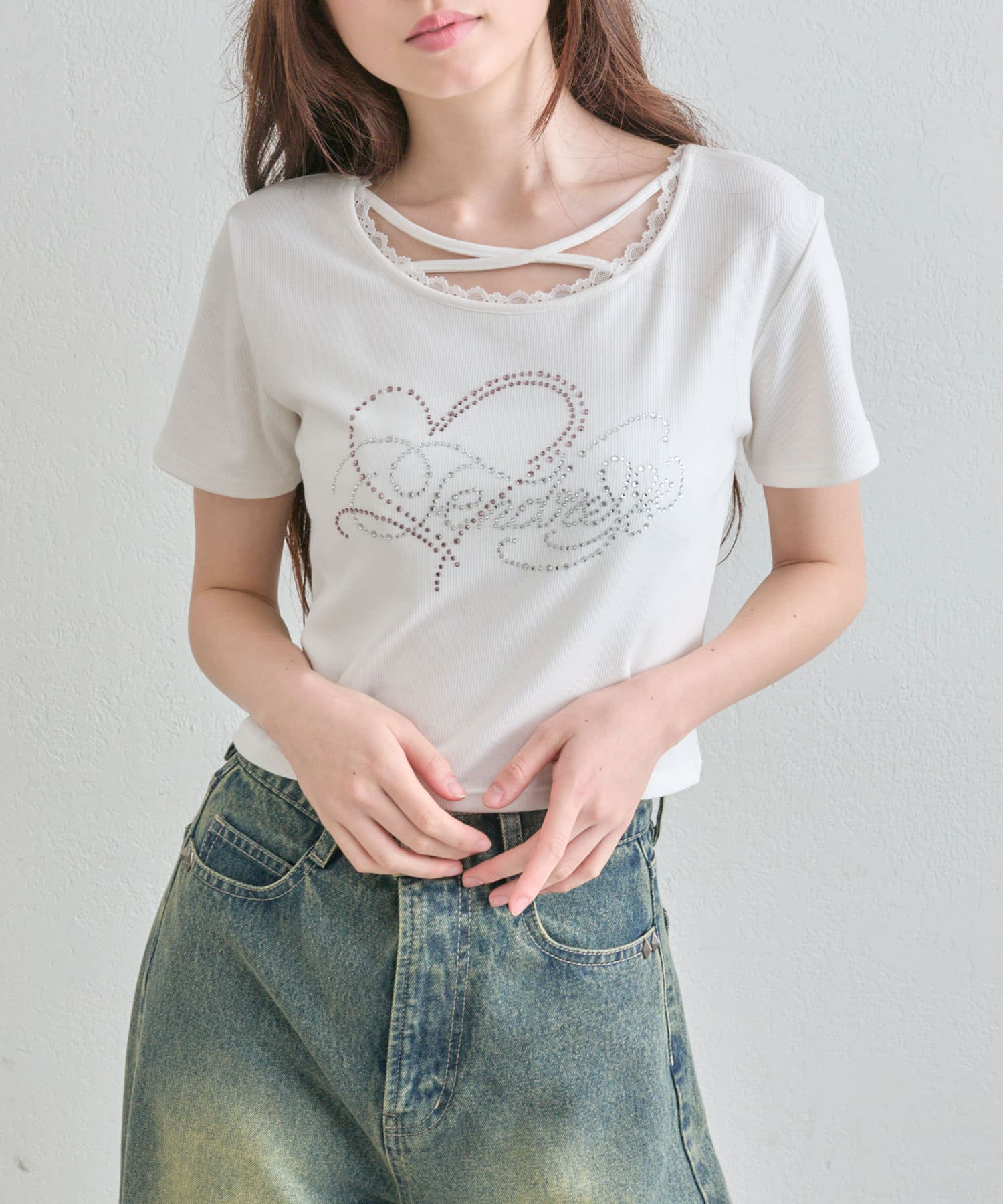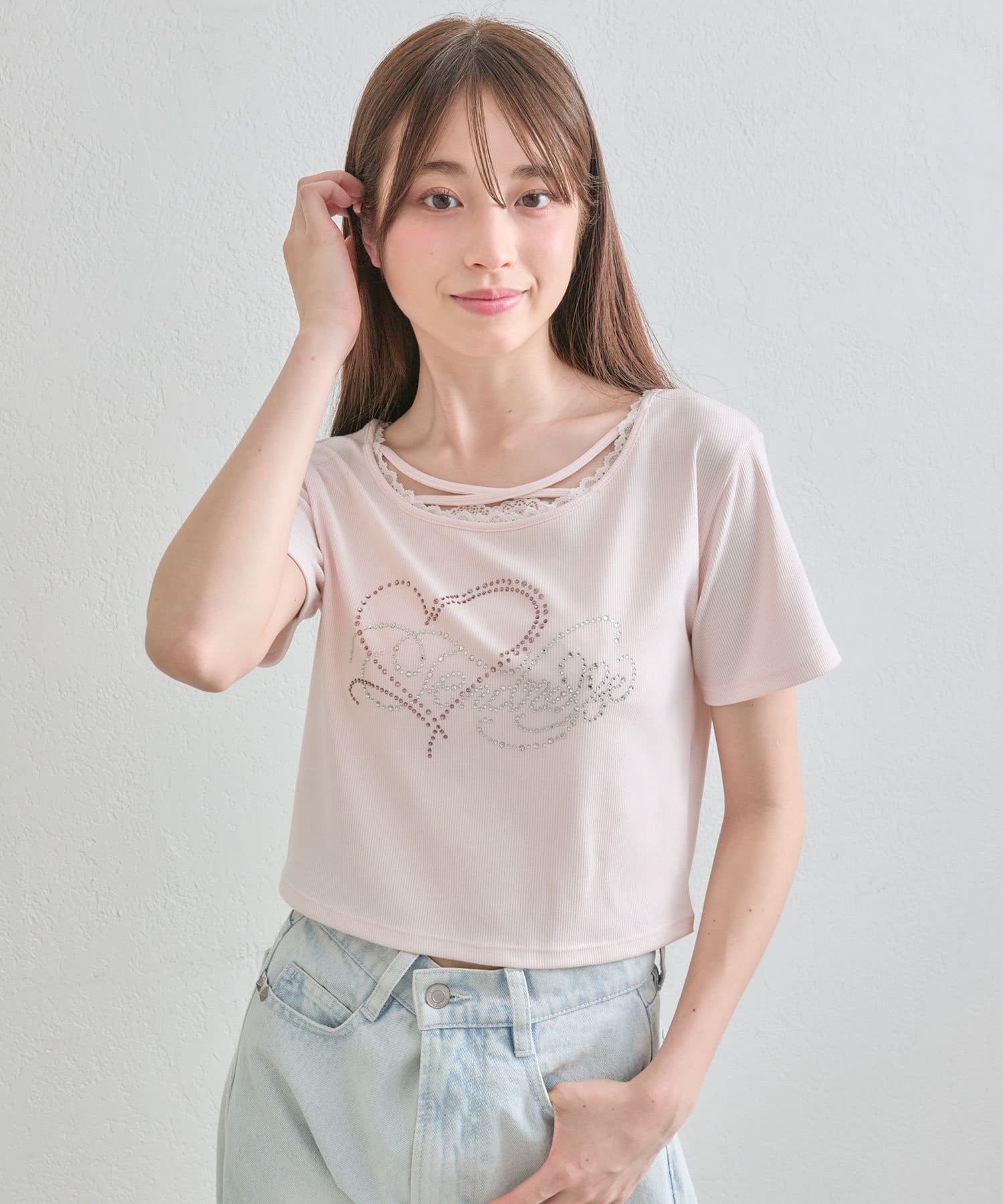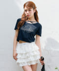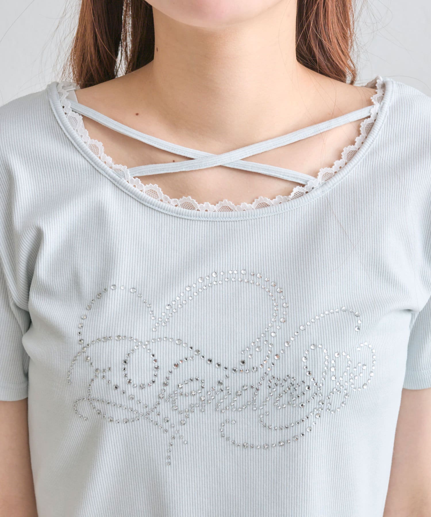 ・レースやきらきらロゴ、フロントのクロスデザインなど、かわいい要素たっぷりなガーリーTシャツ。