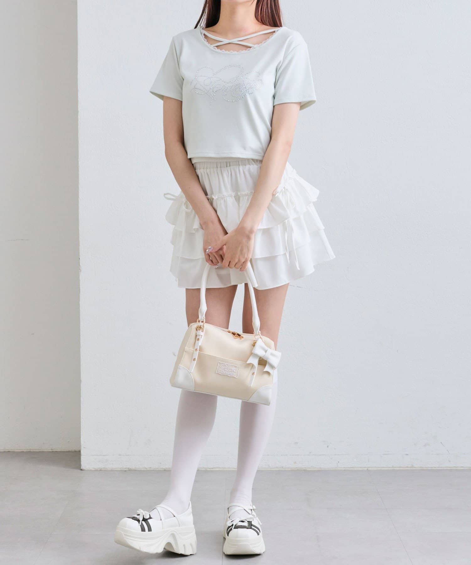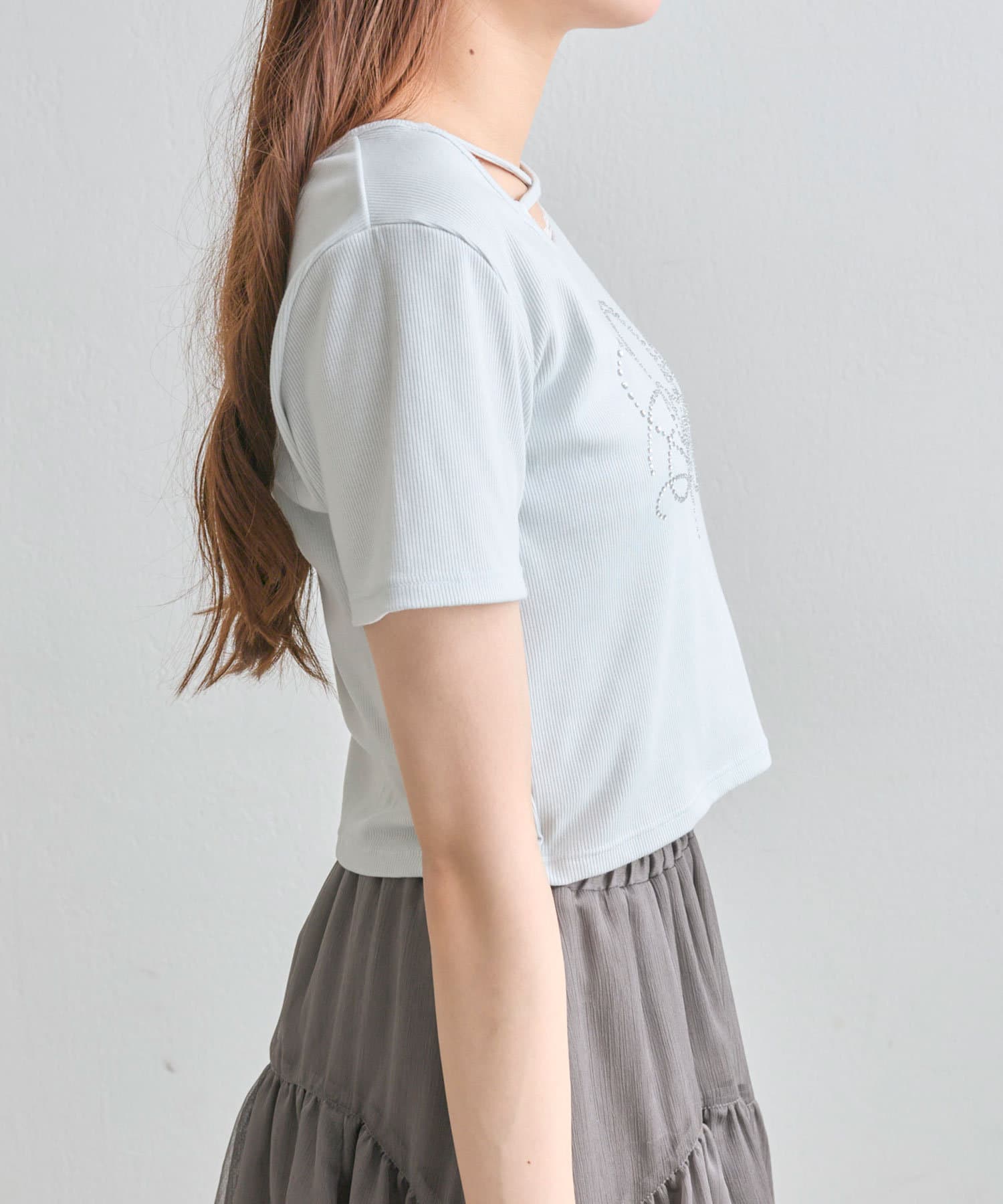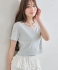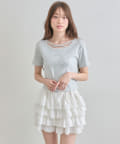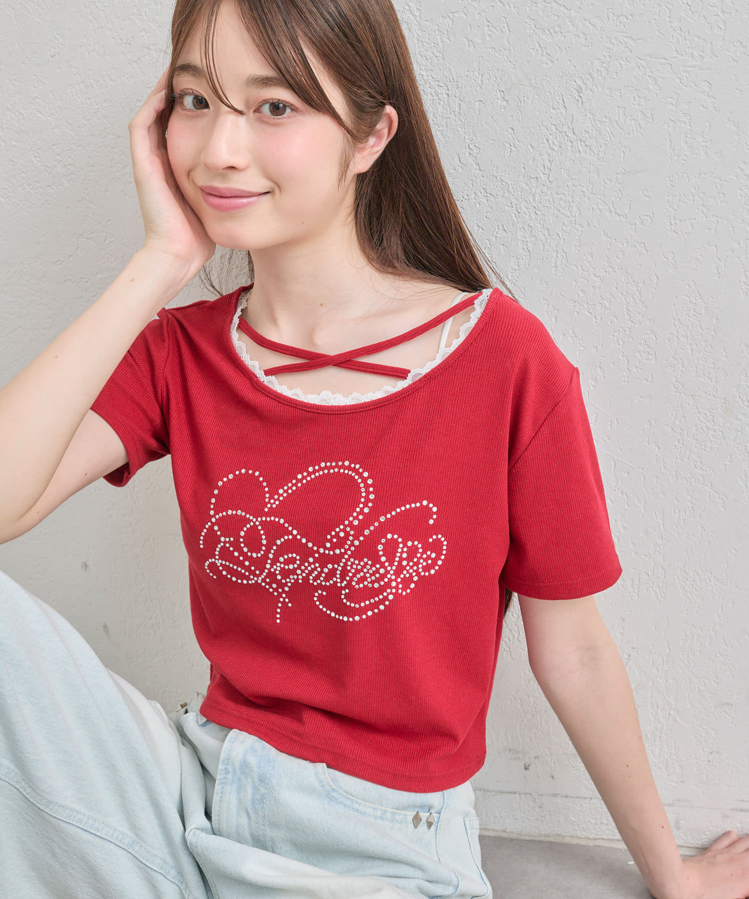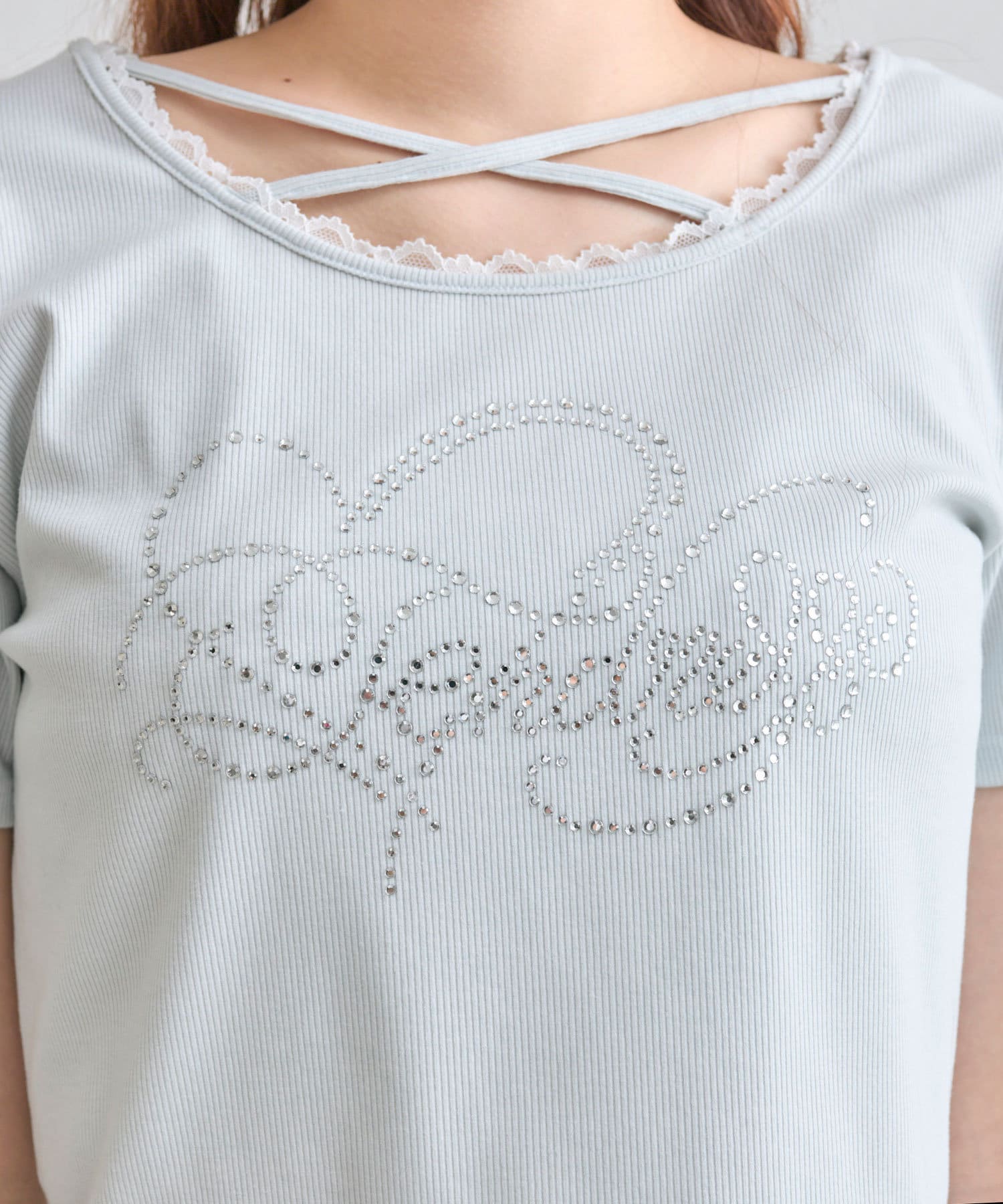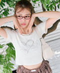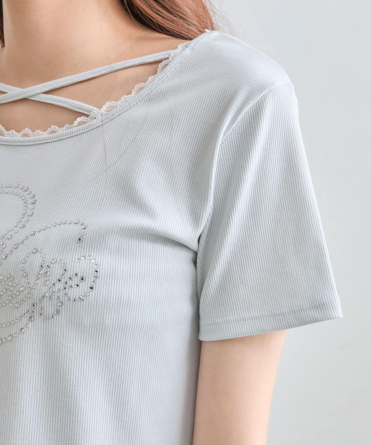 ・レースやきらきらロゴ、フロントのクロスデザインなど、かわいい要素たっぷりなガーリーTシャツ。