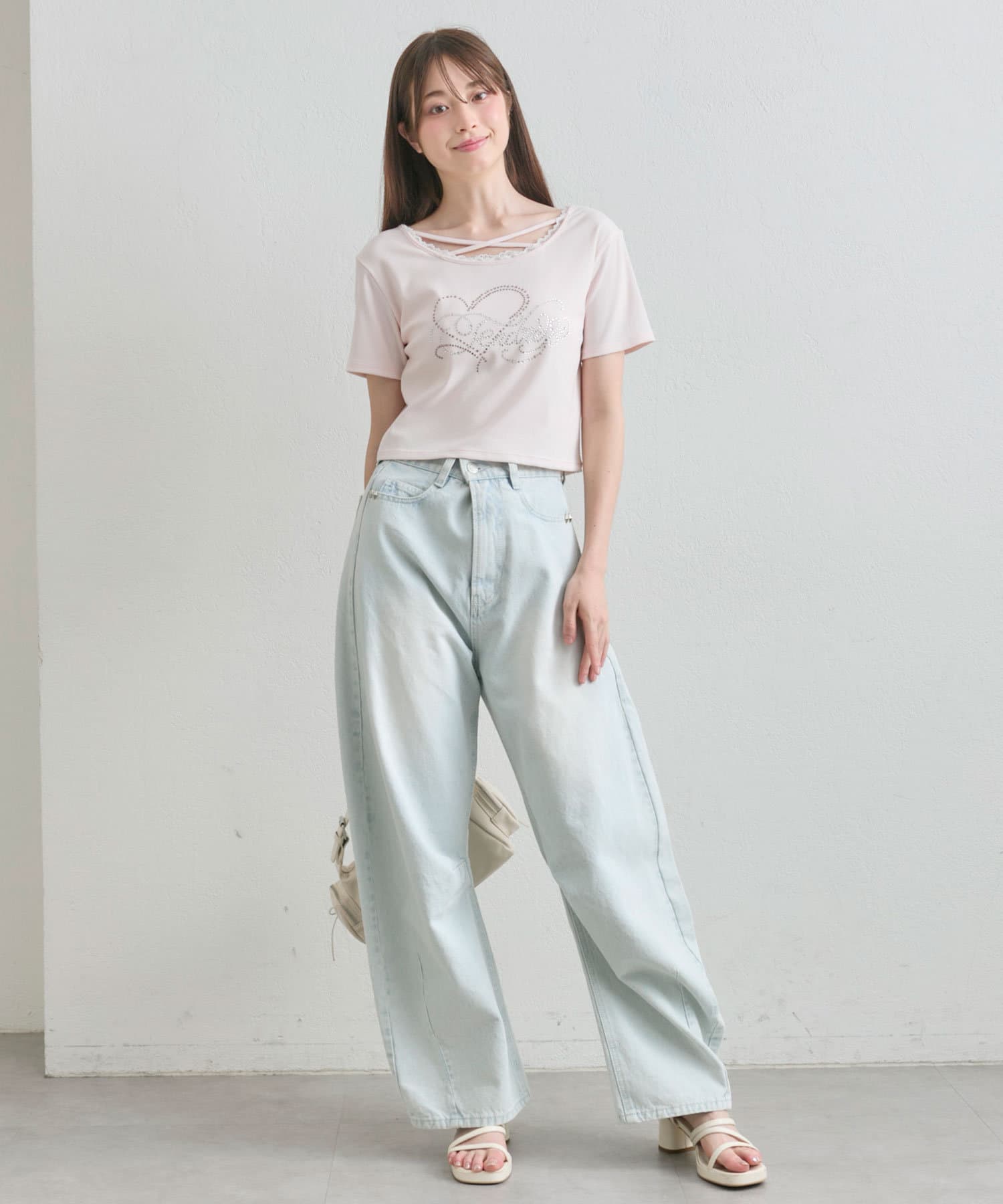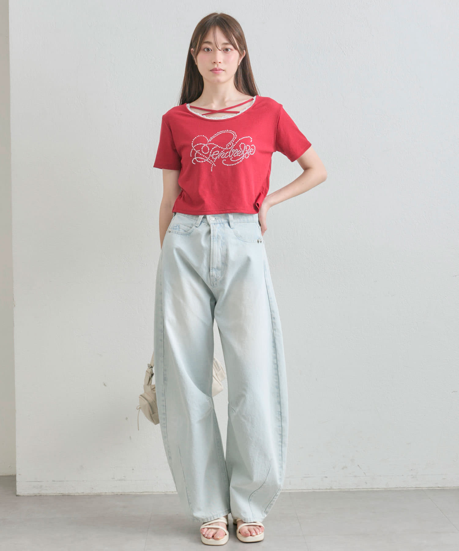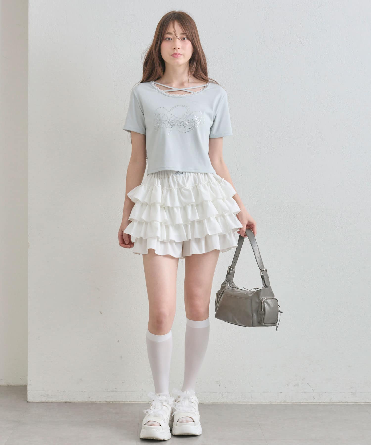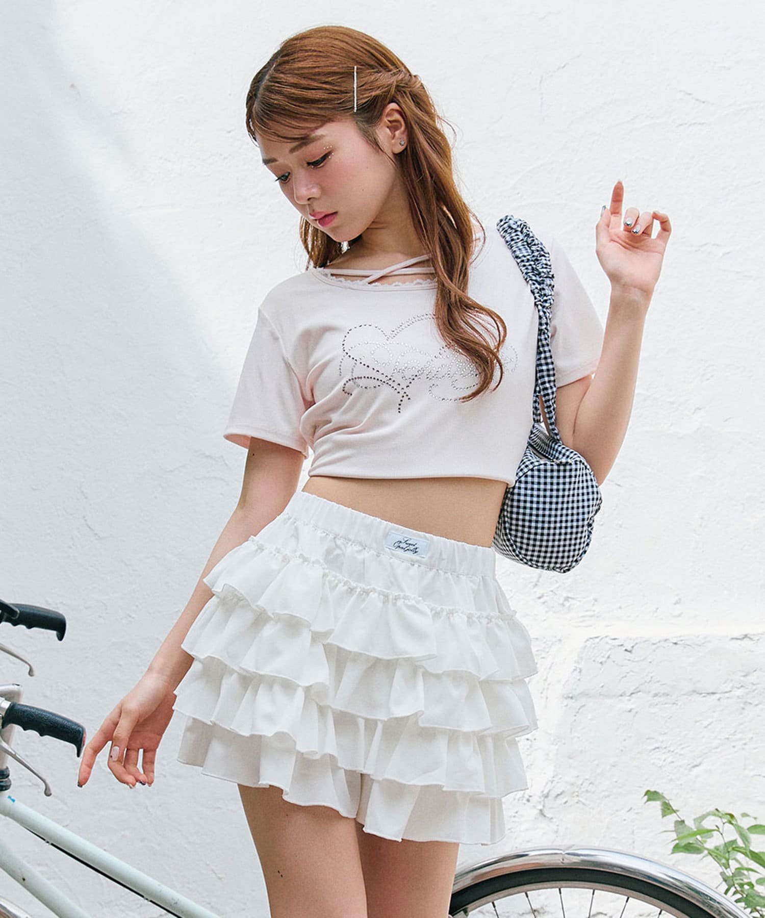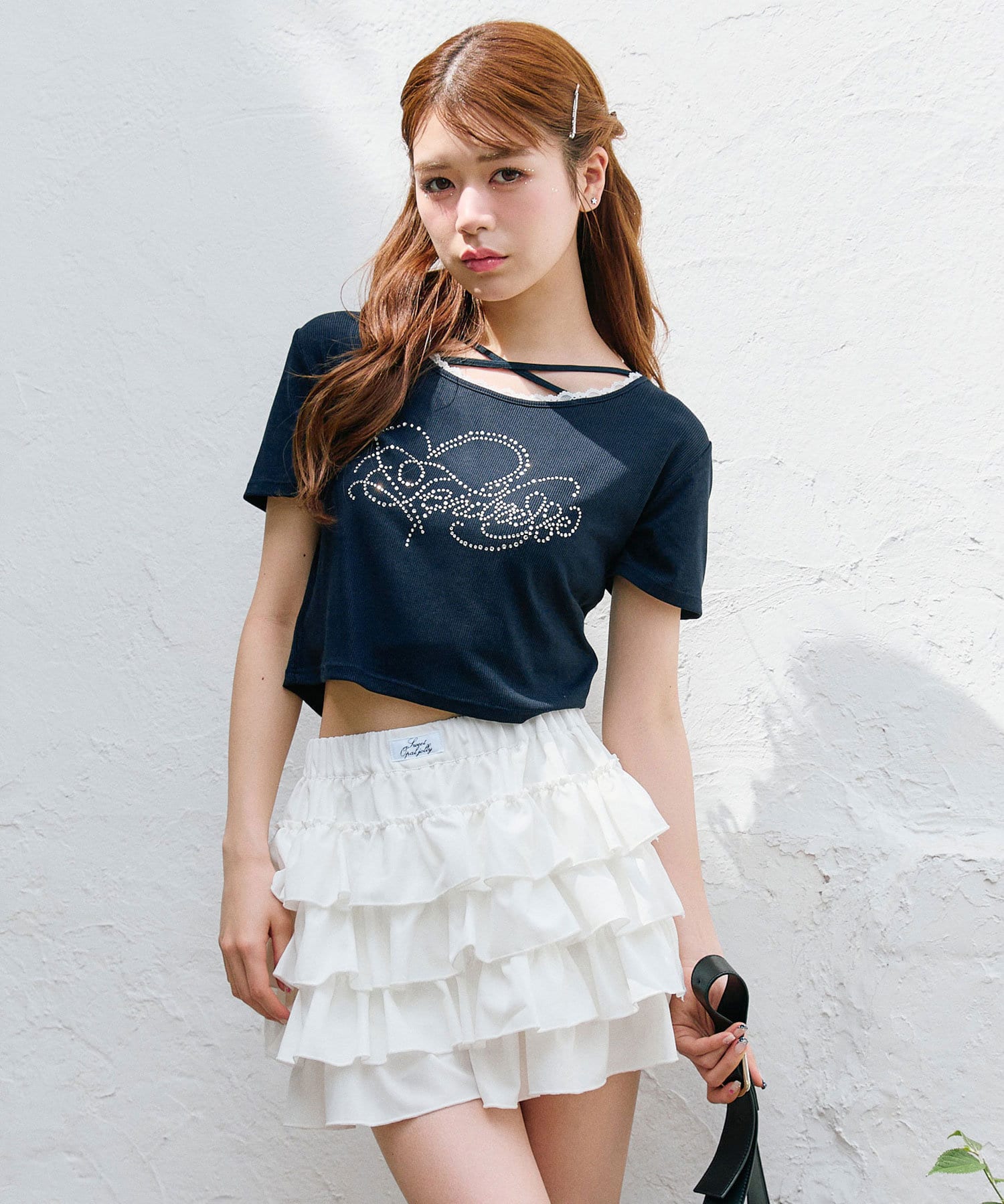 ・レースやきらきらロゴ、フロントのクロスデザインなど、かわいい要素たっぷりなガーリーTシャツ。