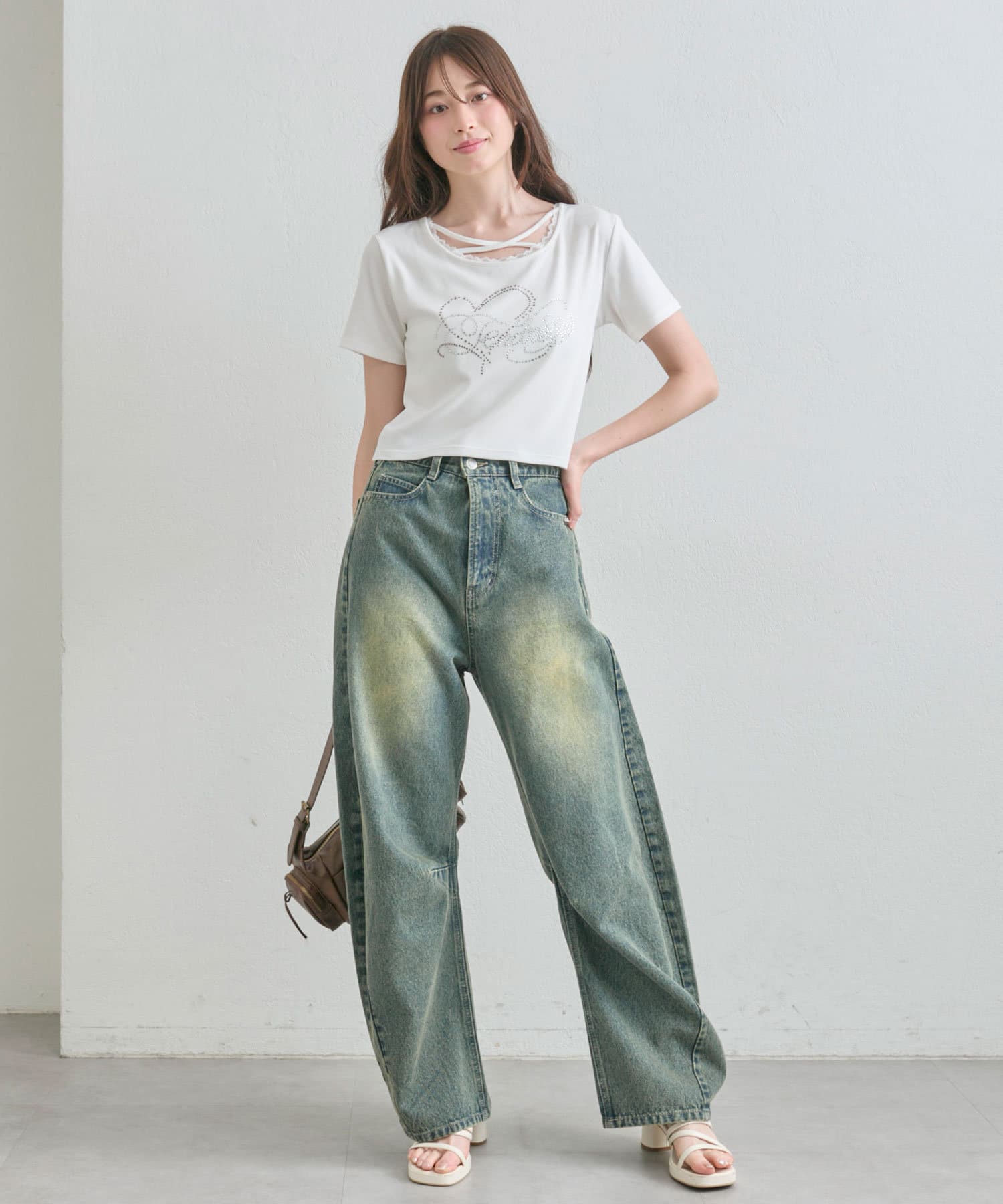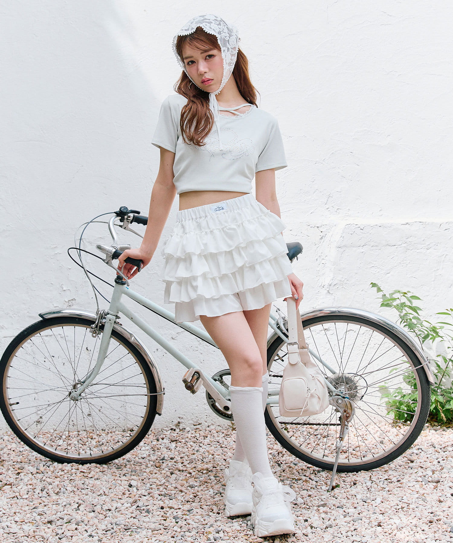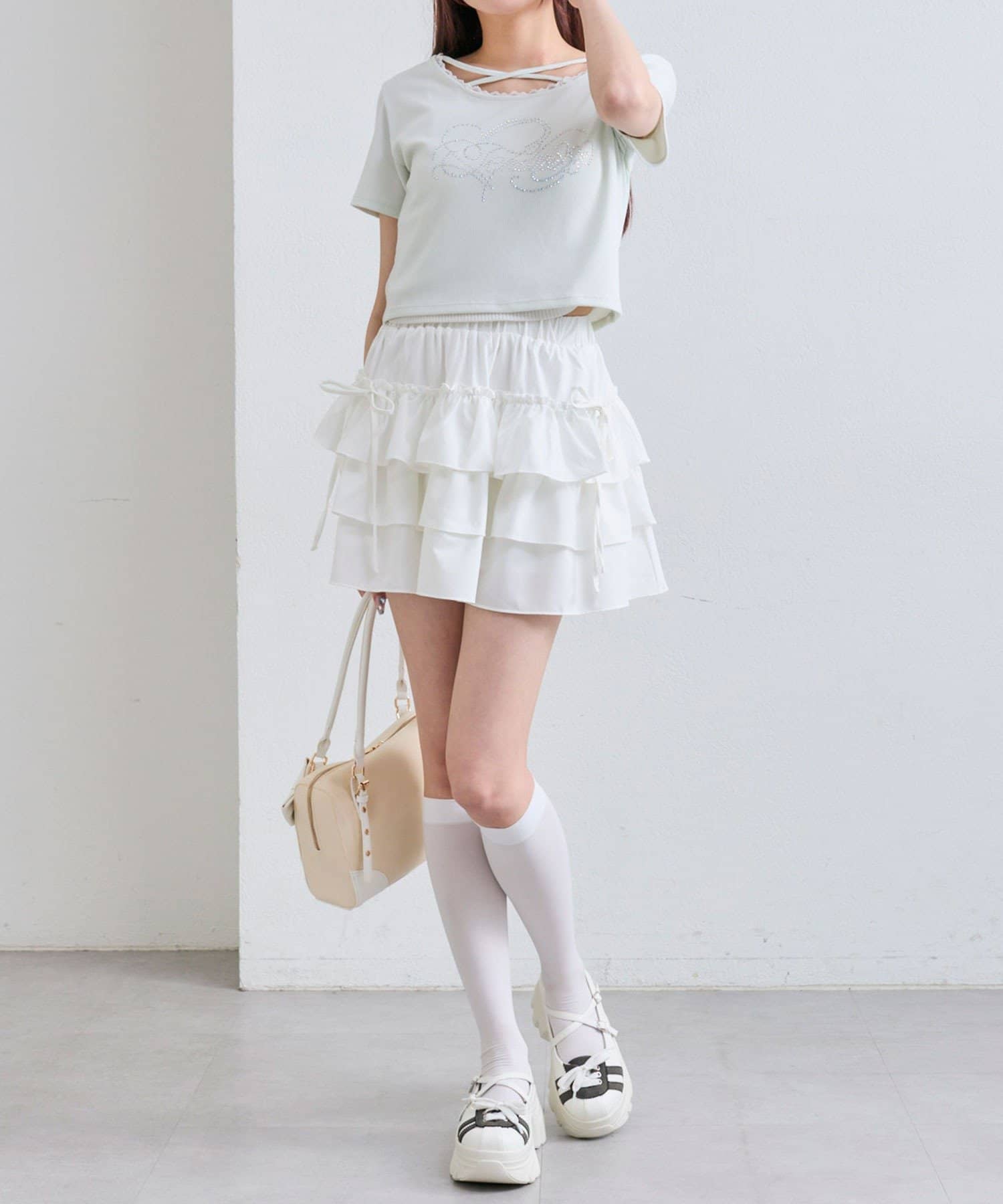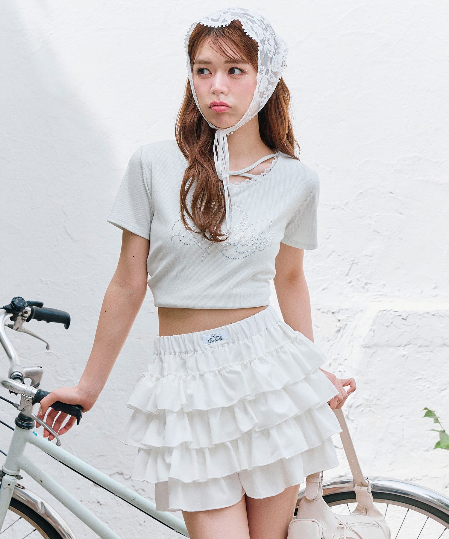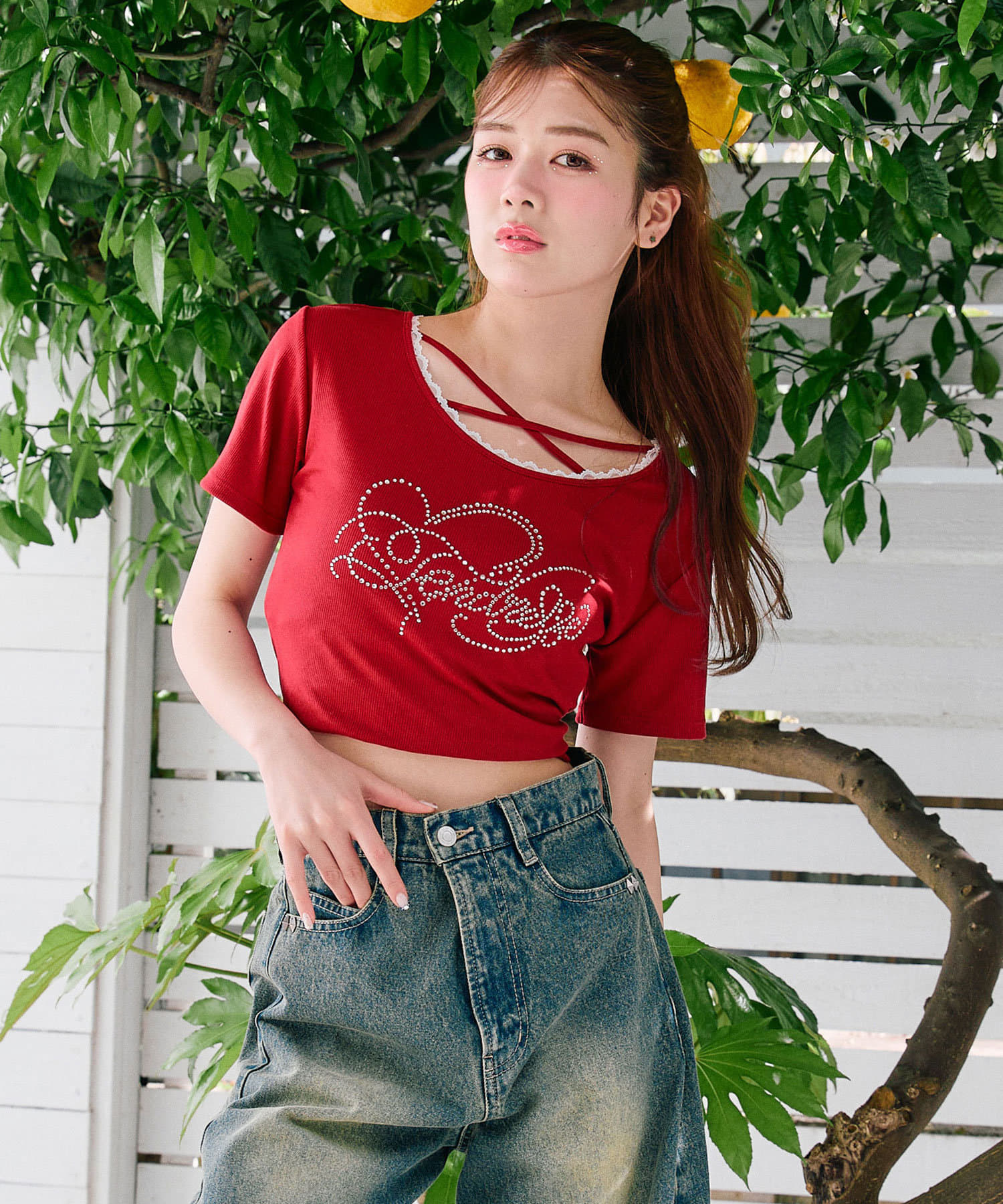 ・レースやきらきらロゴ、フロントのクロスデザインなど、かわいい要素たっぷりなガーリーTシャツ。