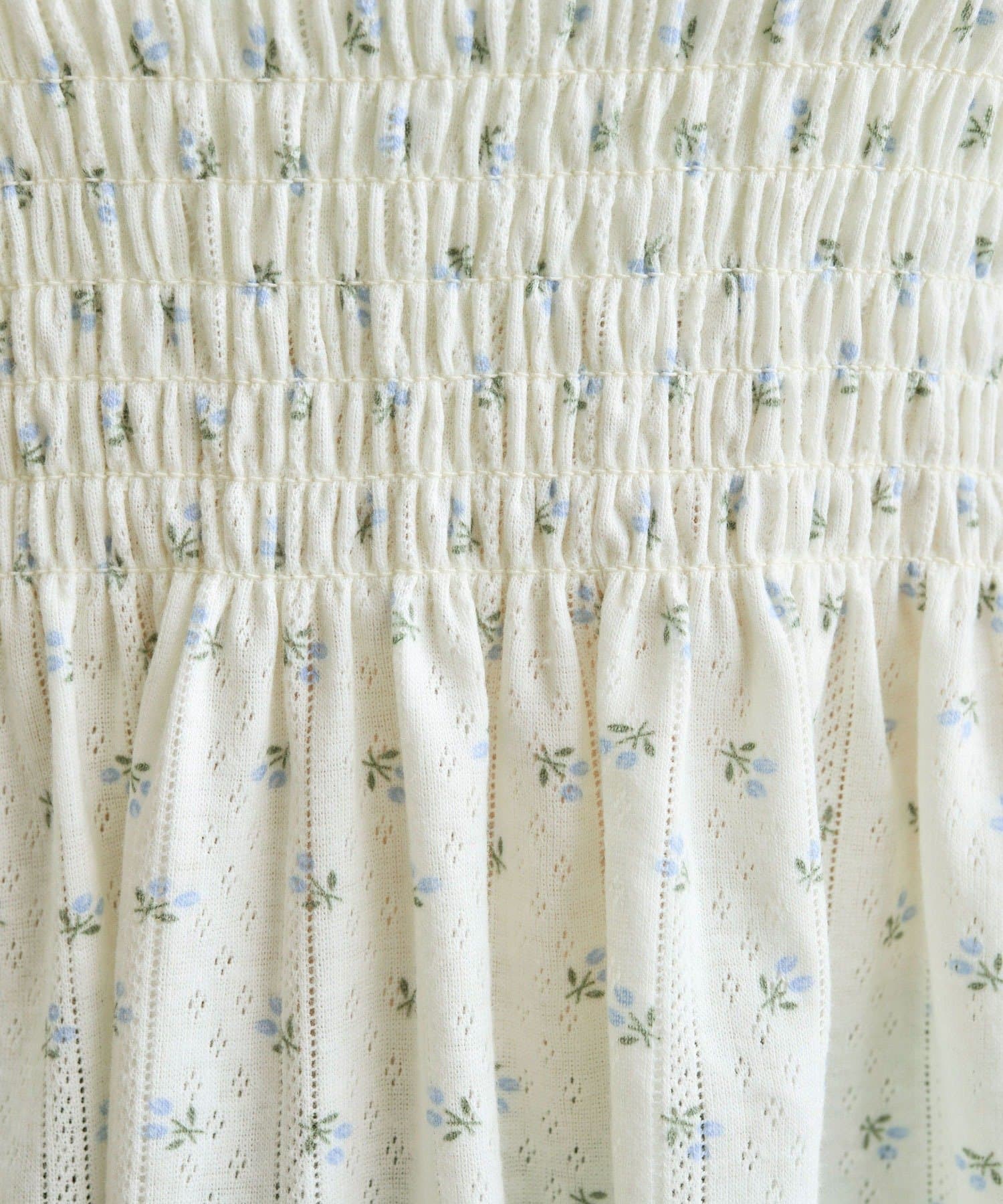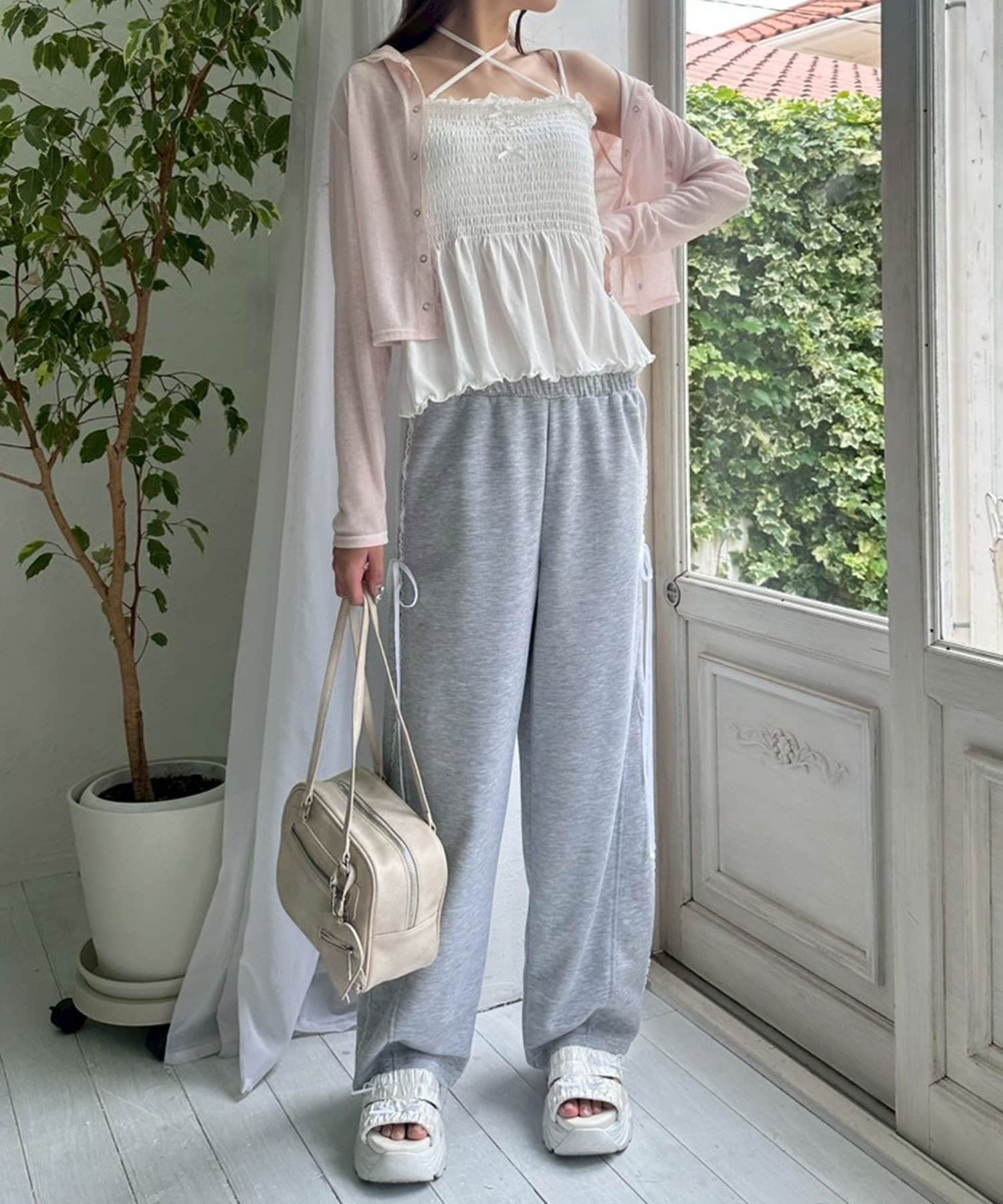 ・胸元はシャーリングで伸縮性が抜群なので、体にフィットして華奢見えします。