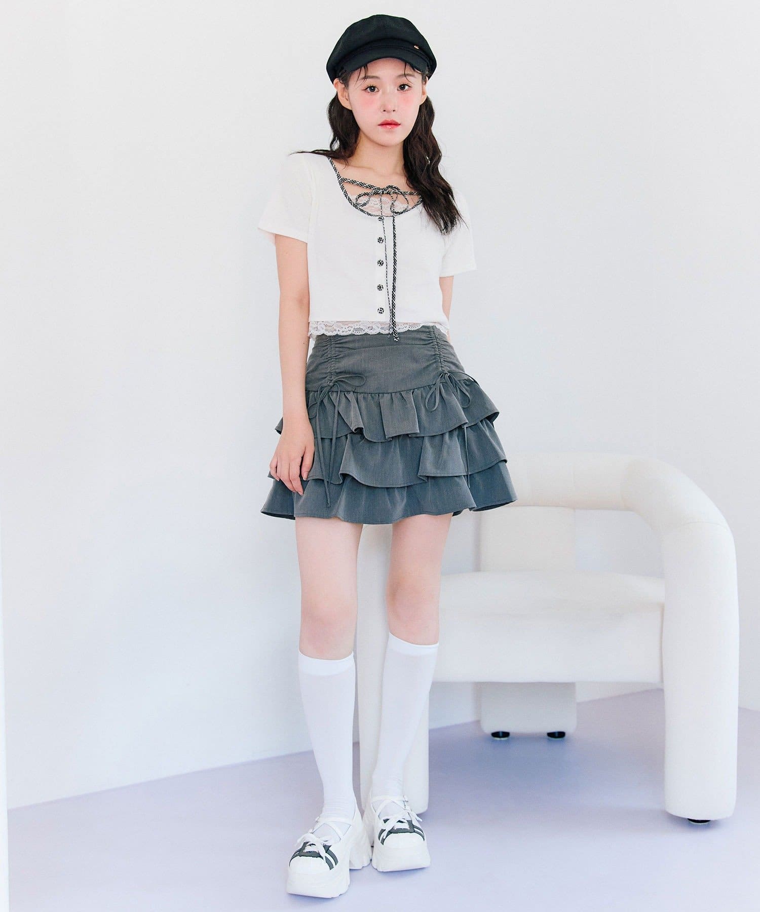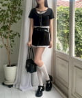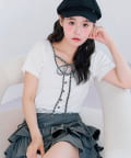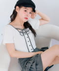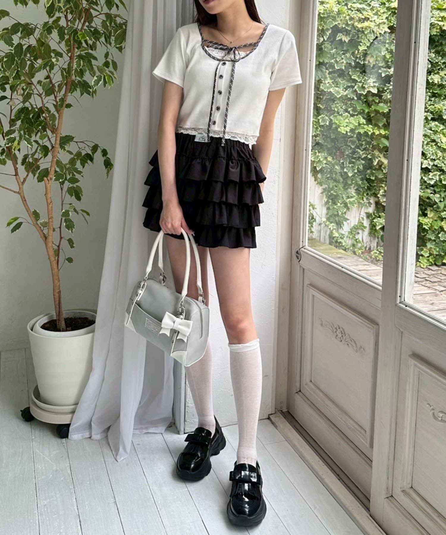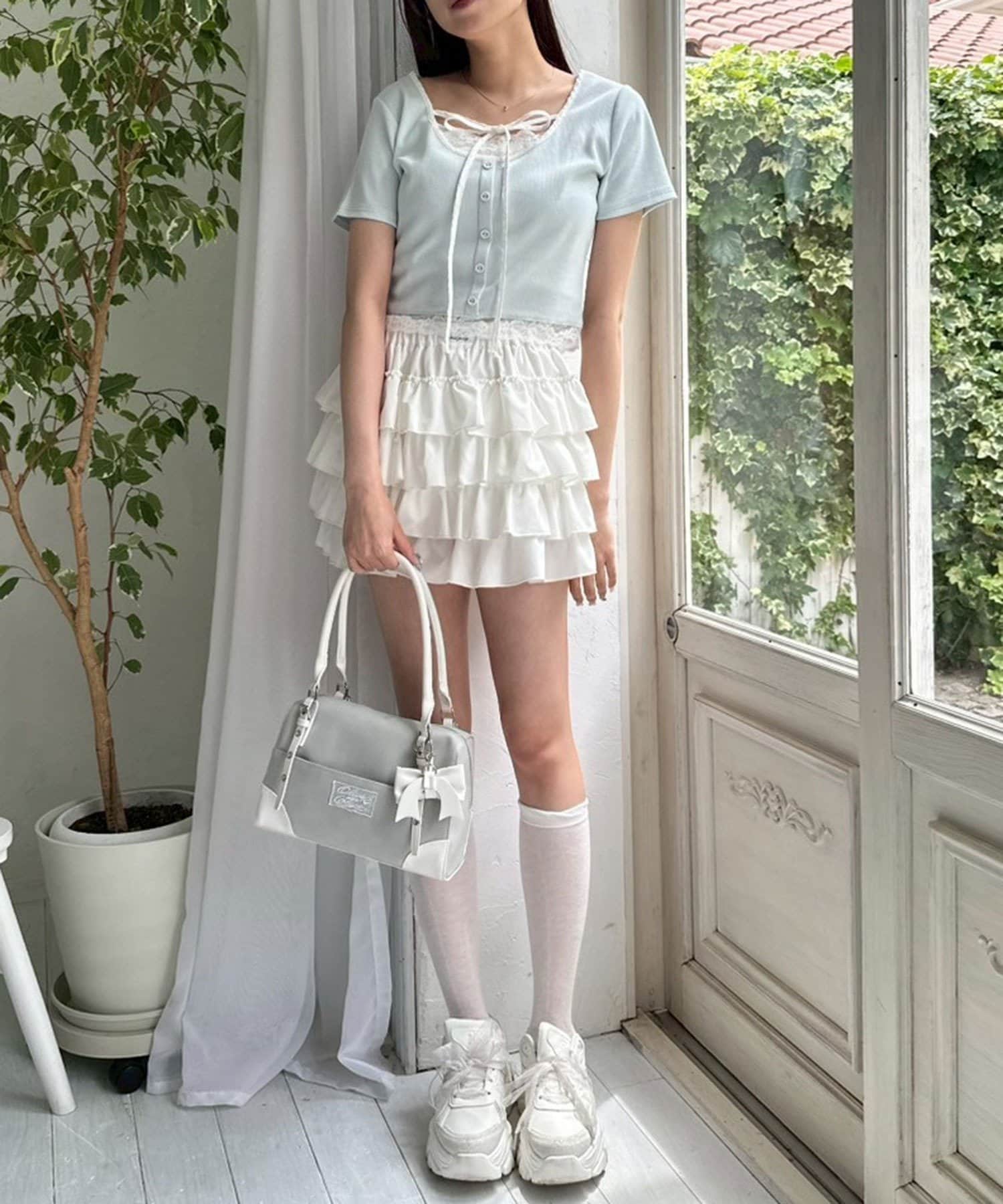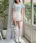・ミニスカートと合わせてガーリーコーデがおすすめ。