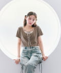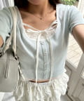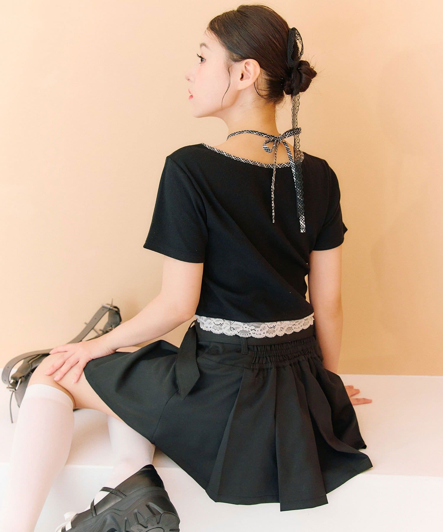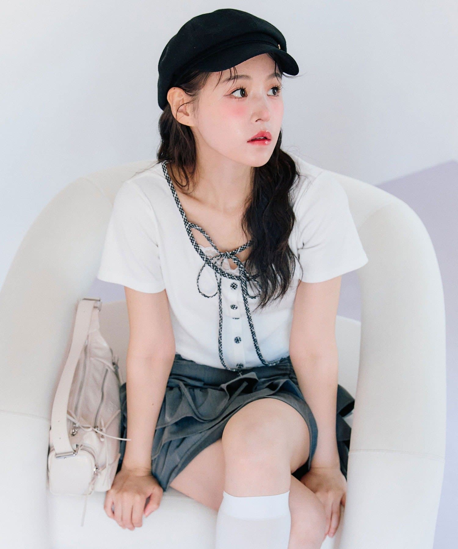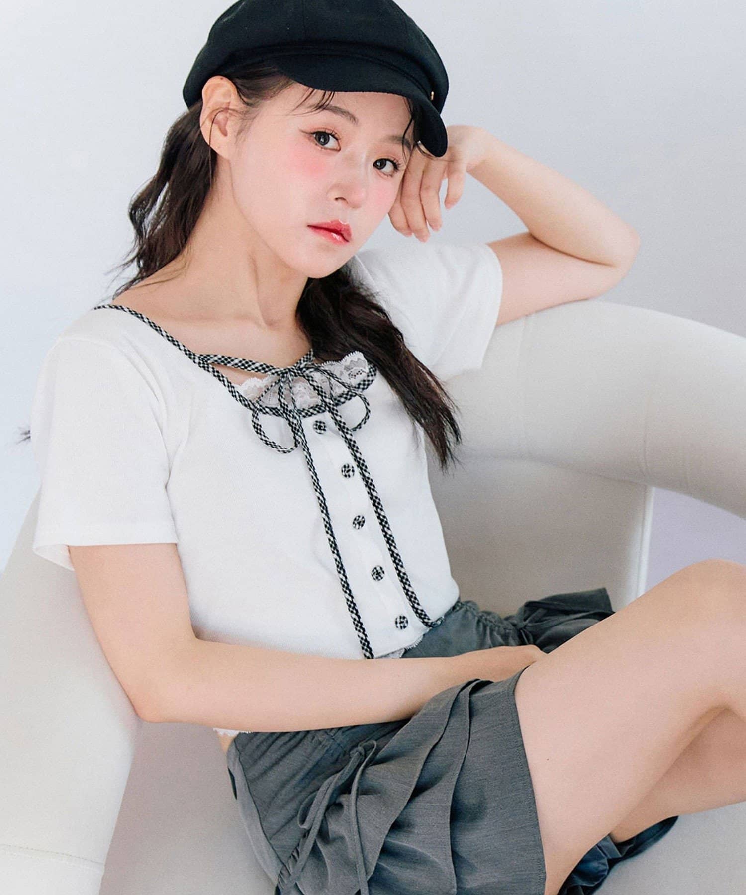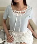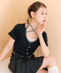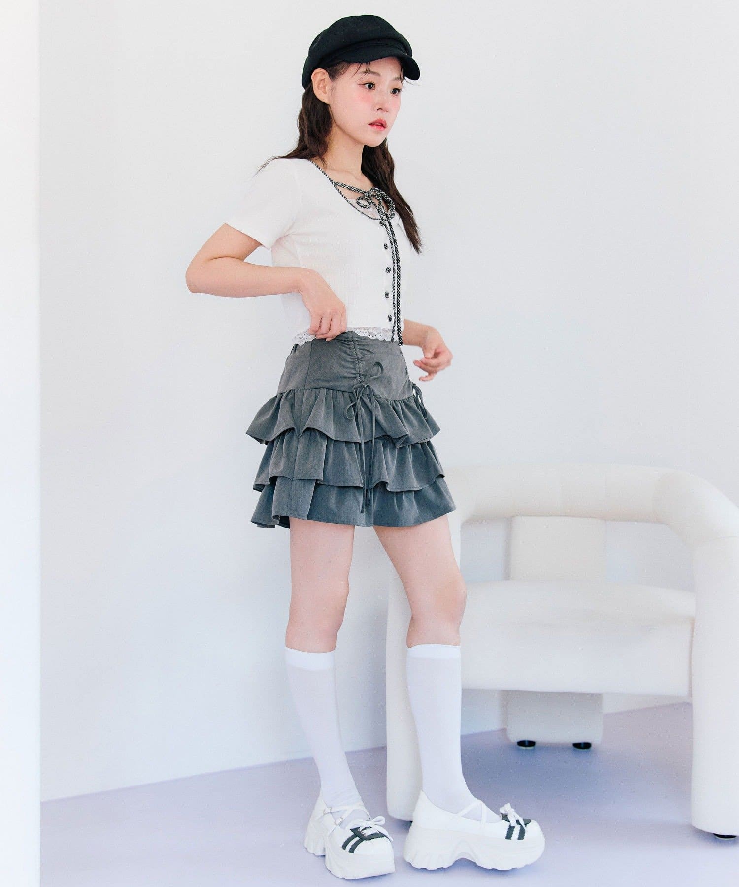 ・ミニスカートと合わせてガーリーコーデがおすすめ。
