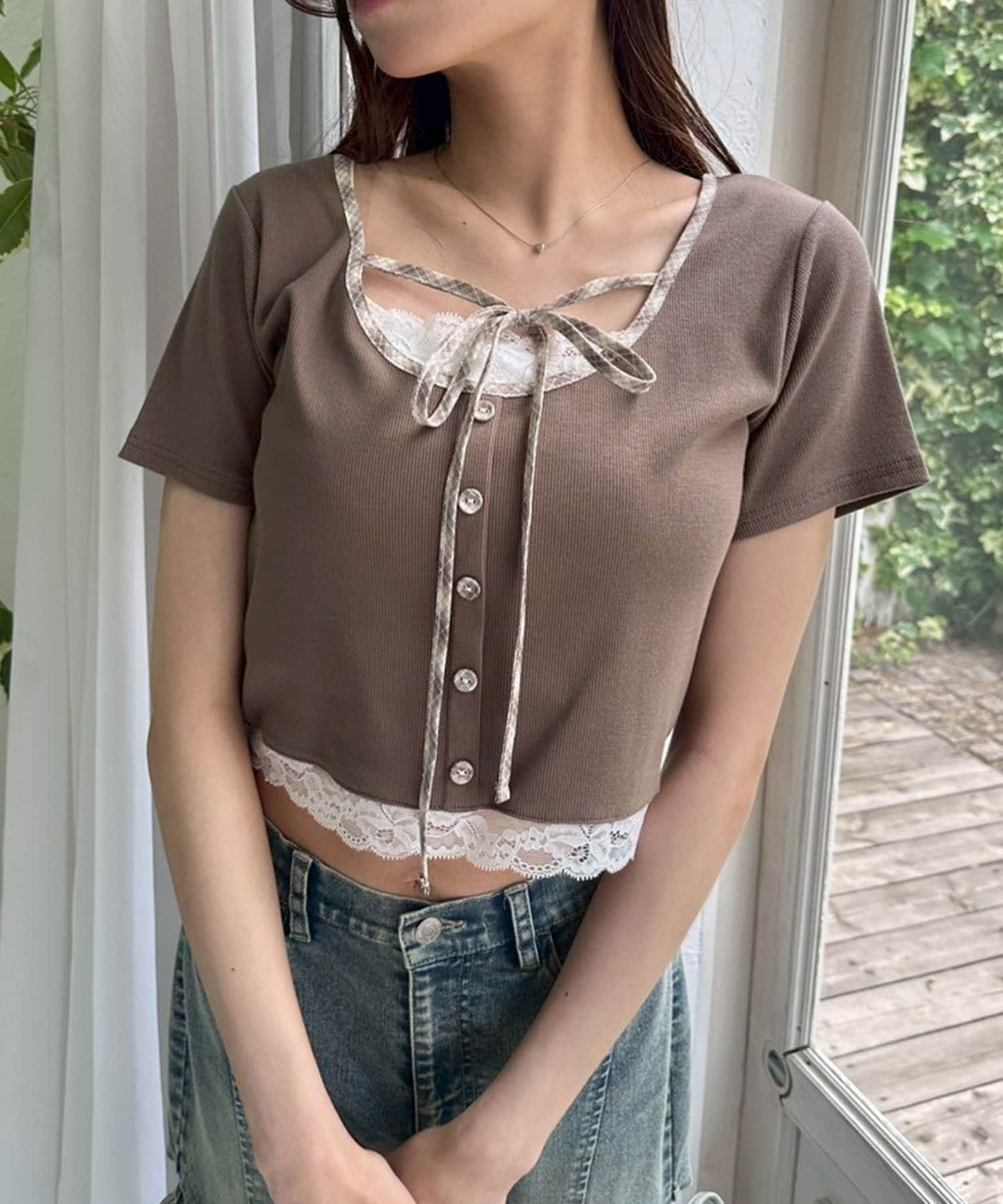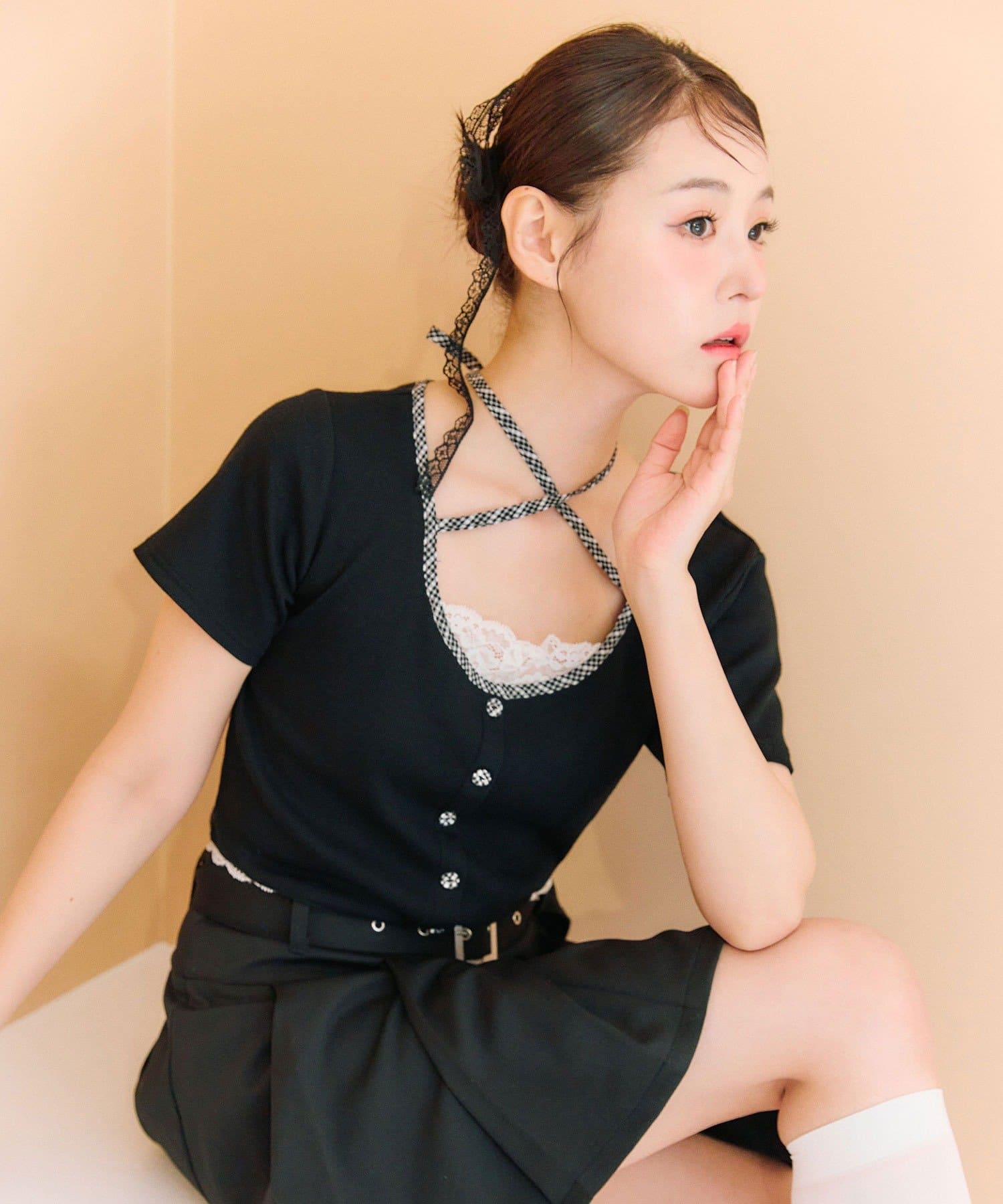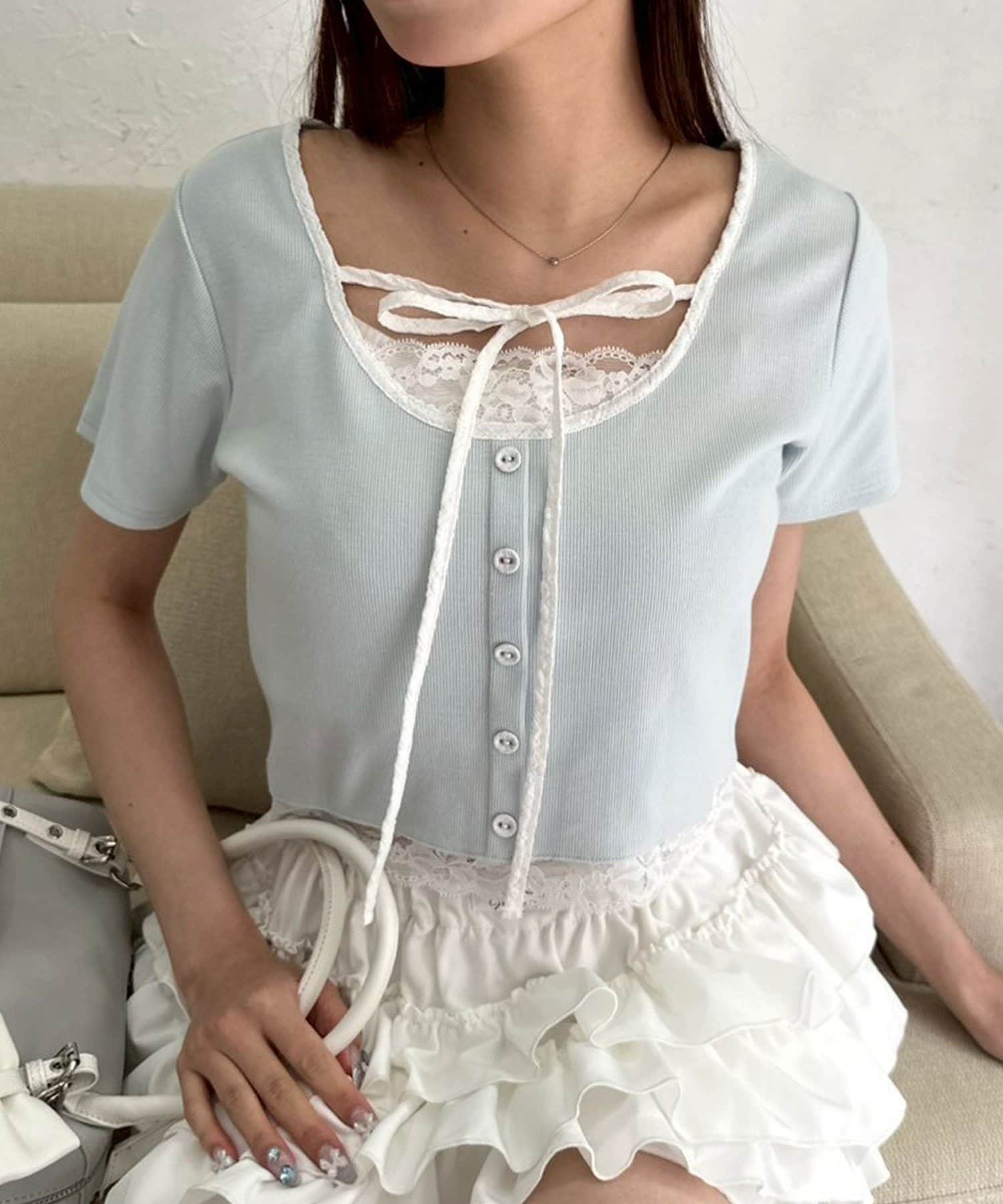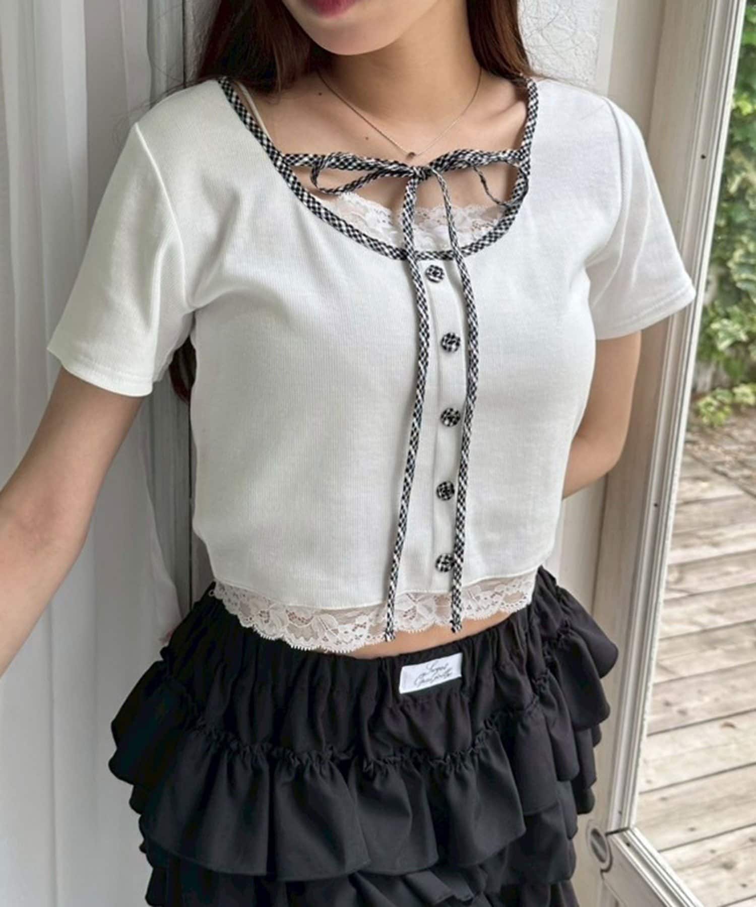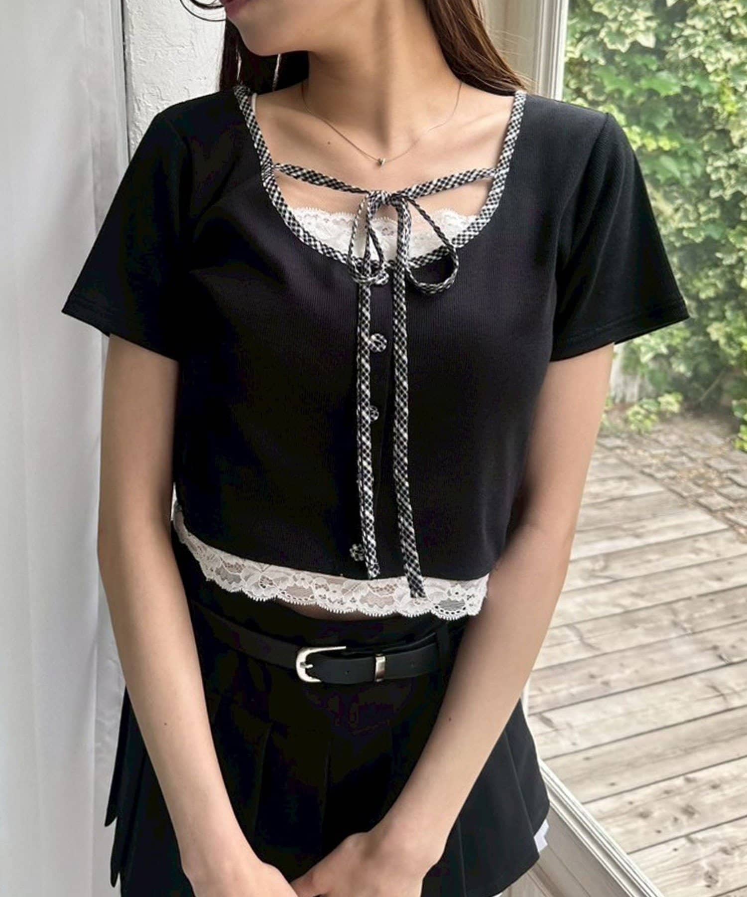 ・胸元と裾にはレースがあしらわれ、レースインナーをレイヤードしている風に見えます。