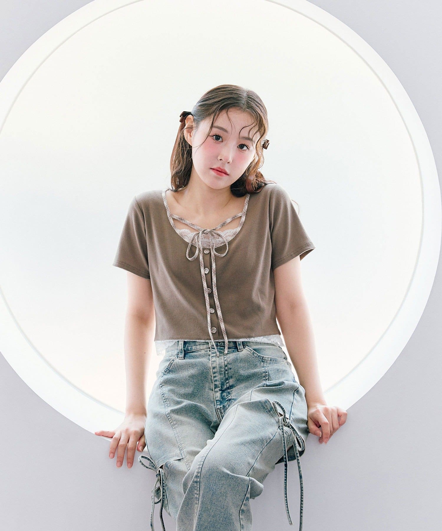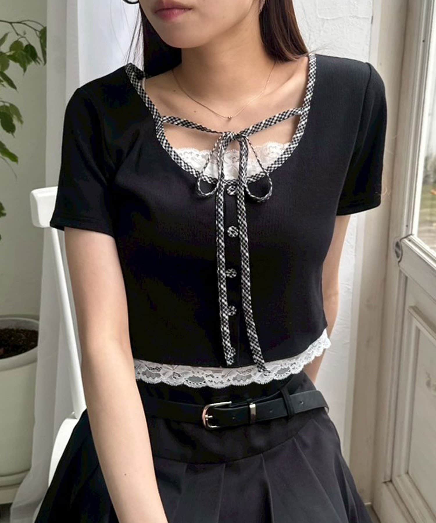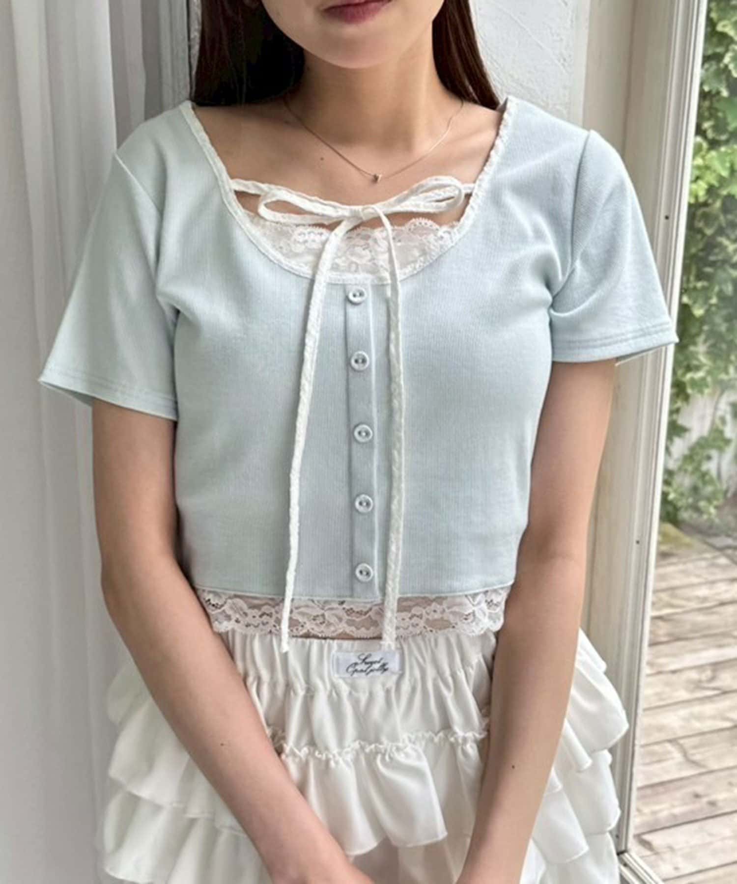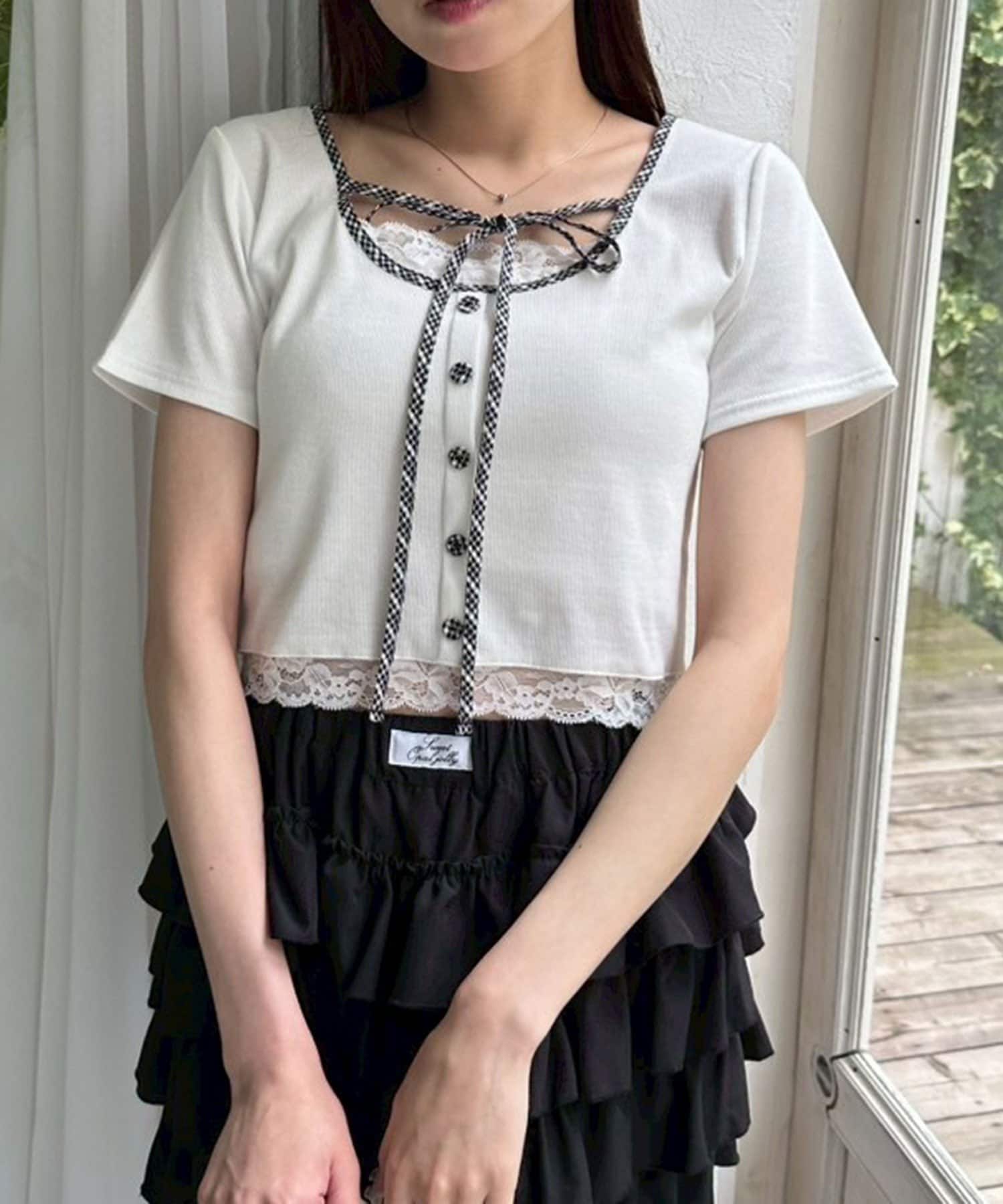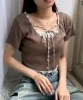 ・胸元と裾にはレースがあしらわれ、レースインナーをレイヤードしている風に見えます。
