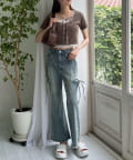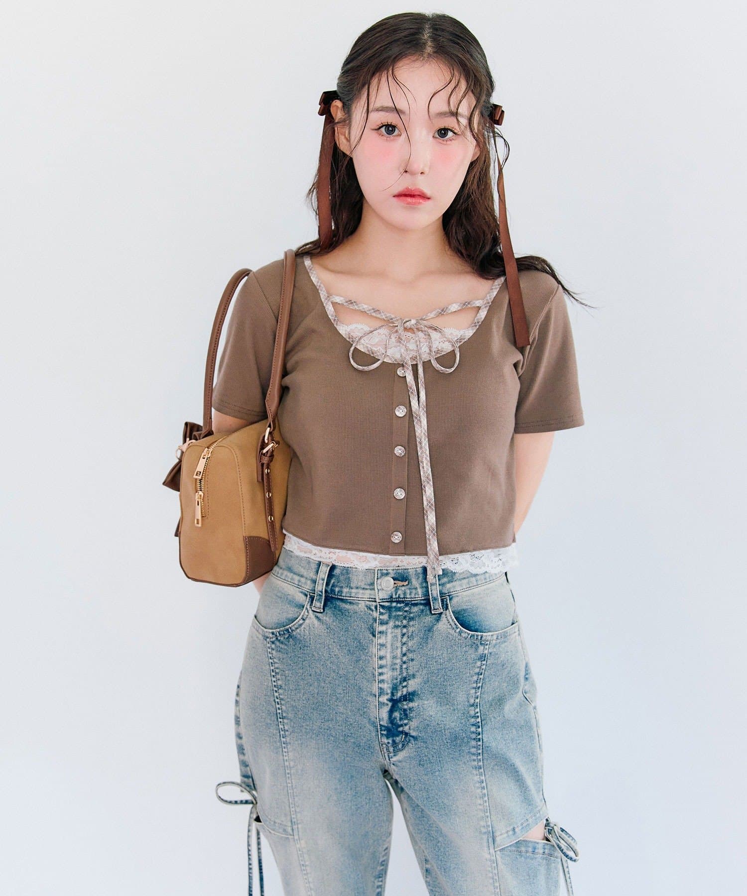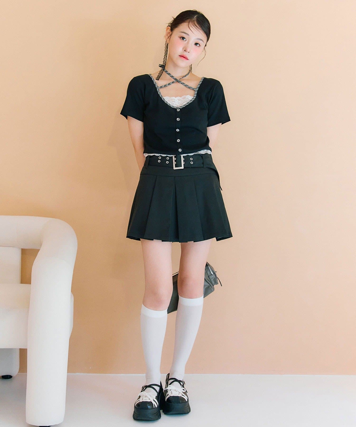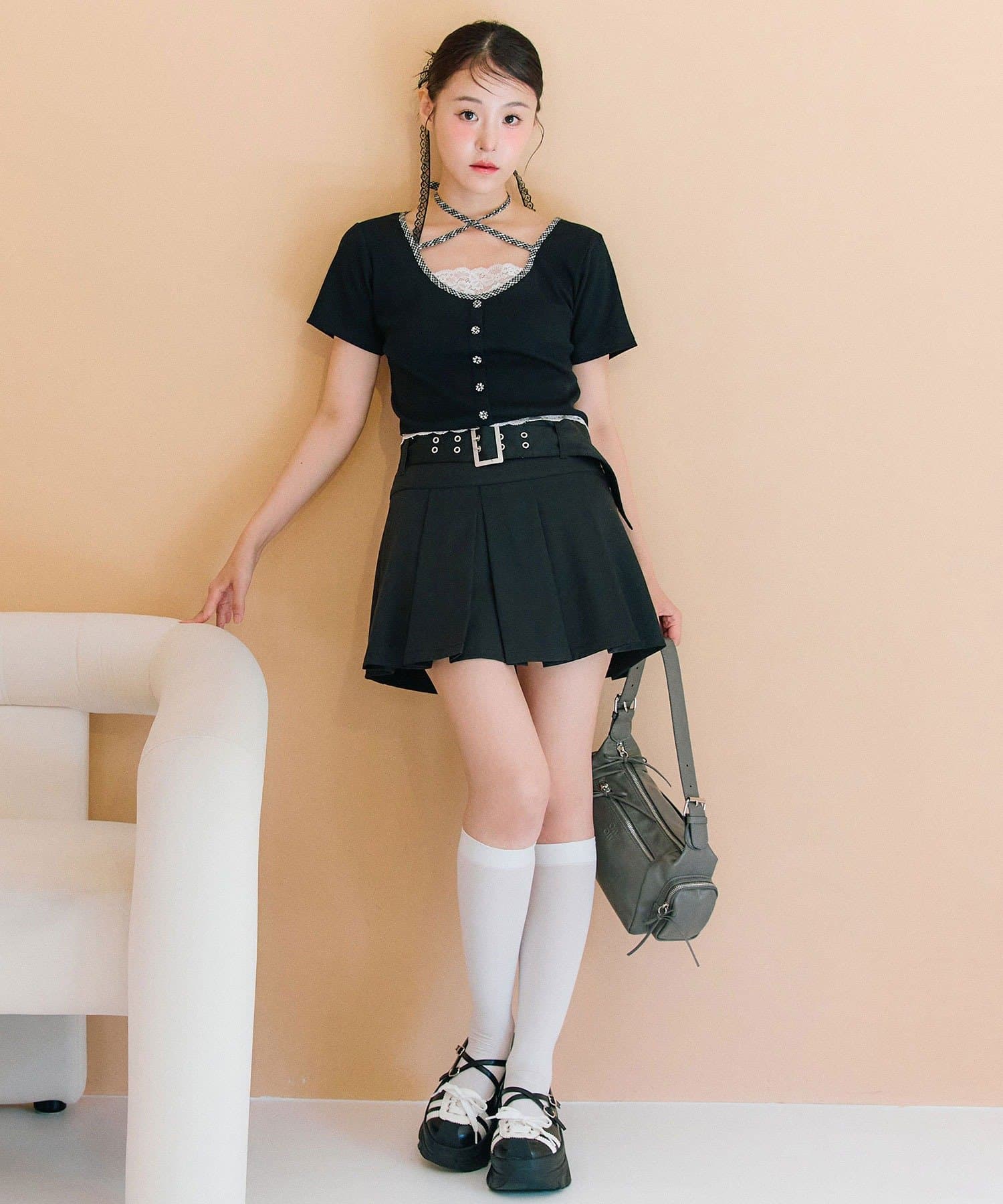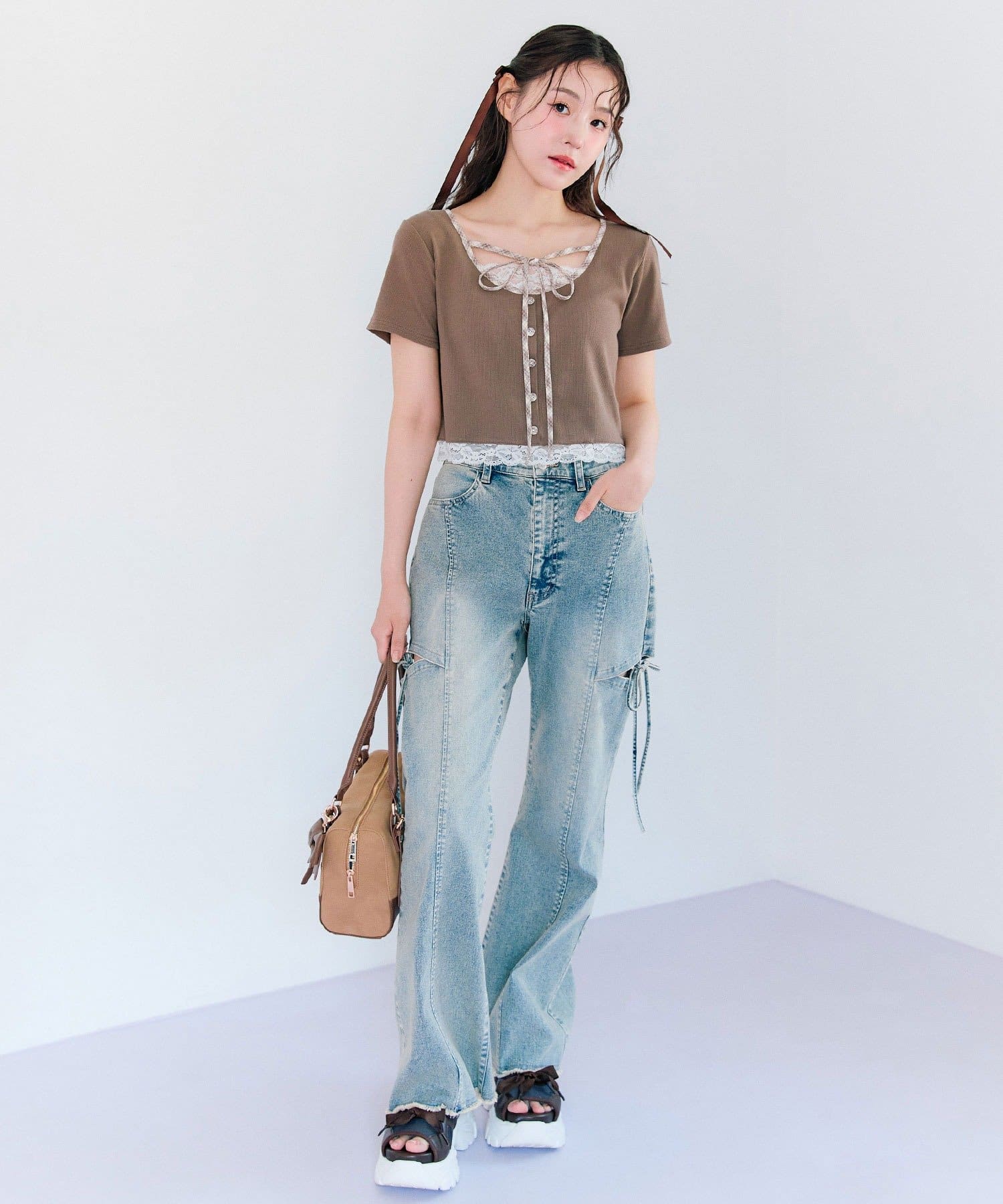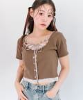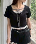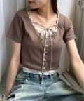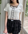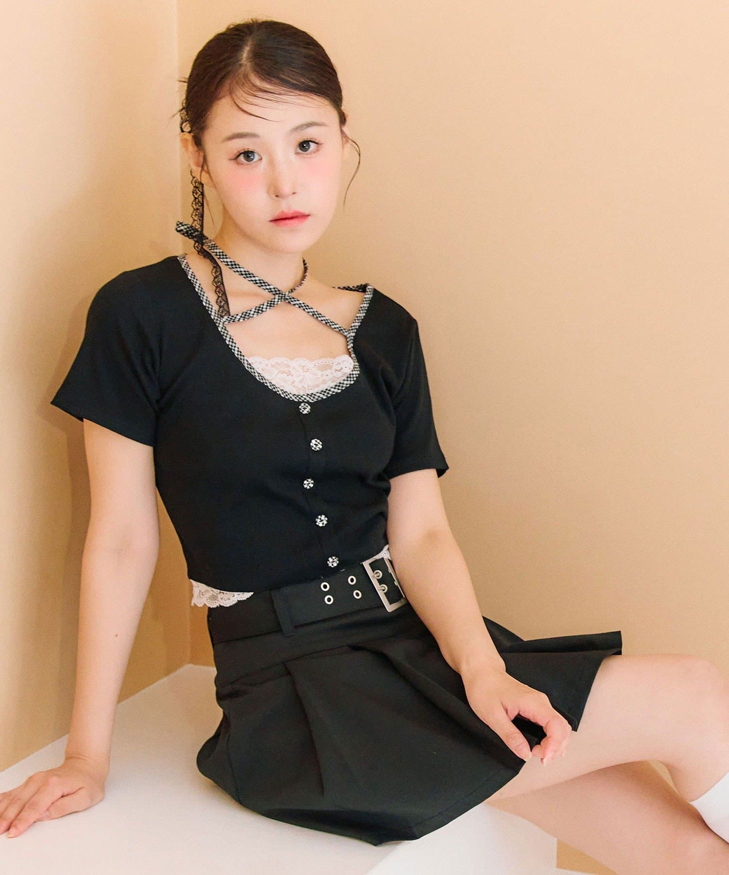 ・胸元と裾にはレースがあしらわれ、レースインナーをレイヤードしている風に見えます。