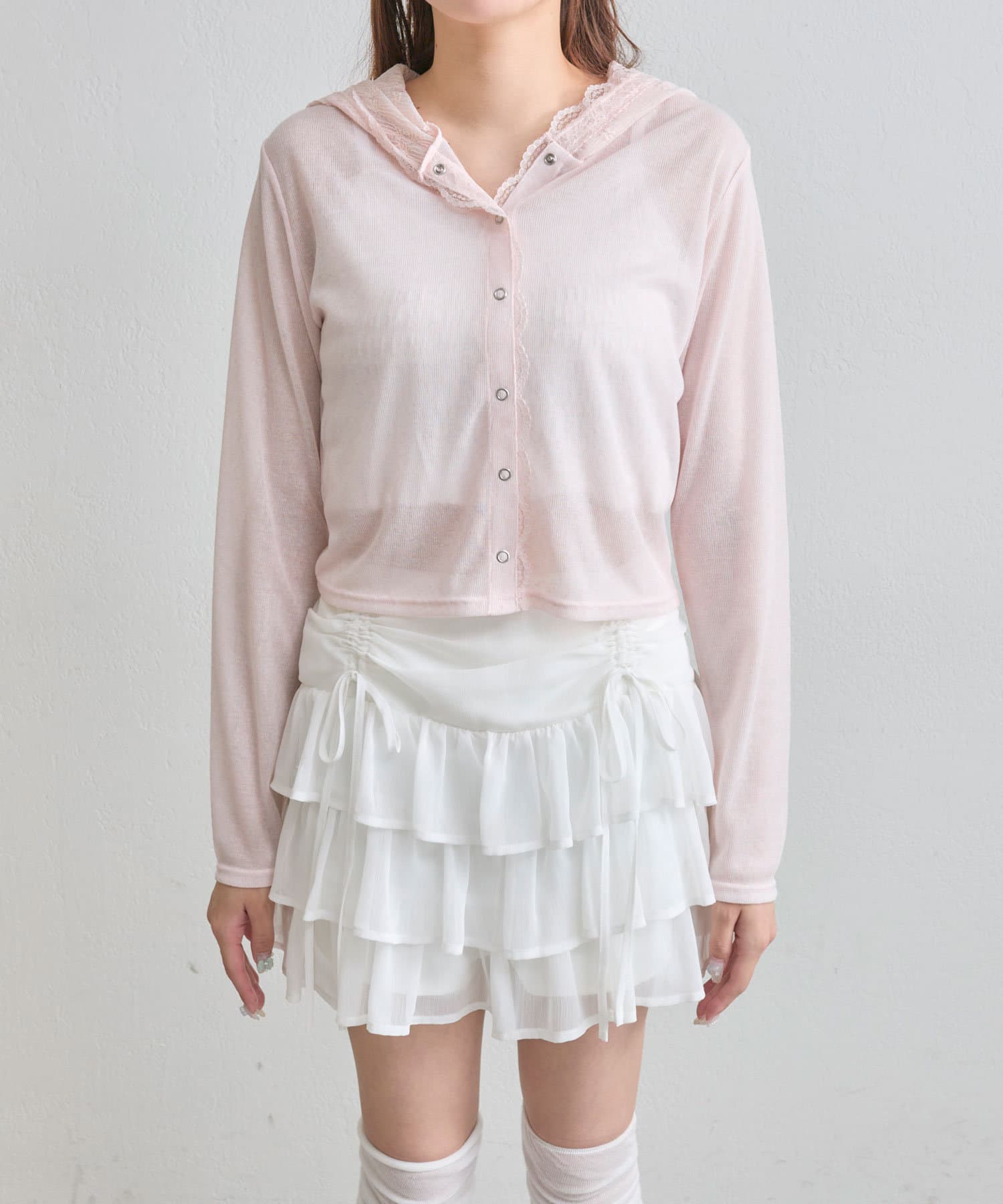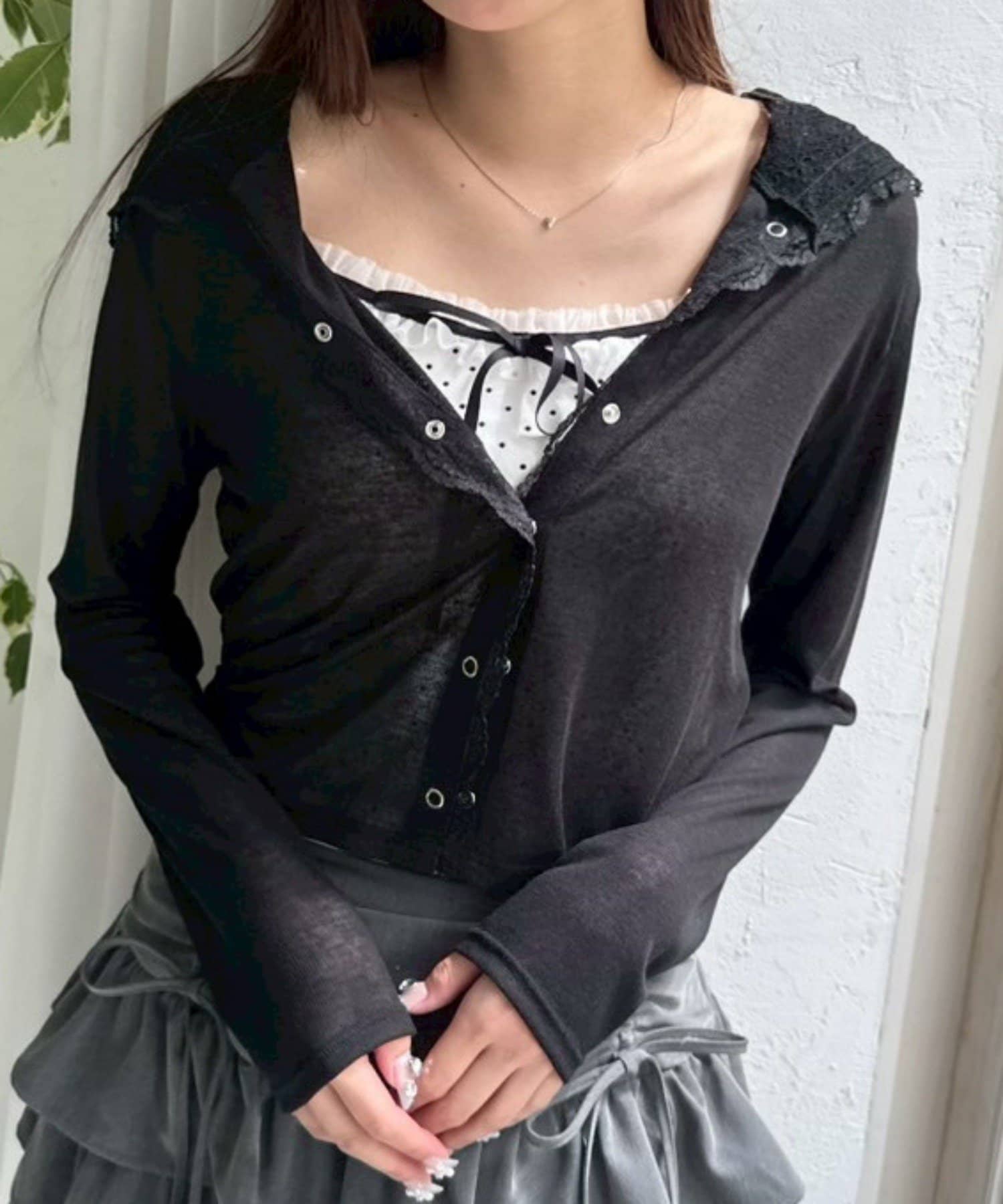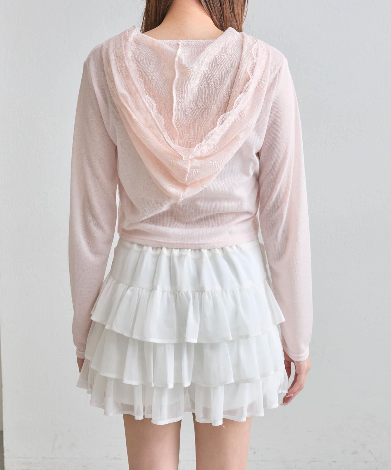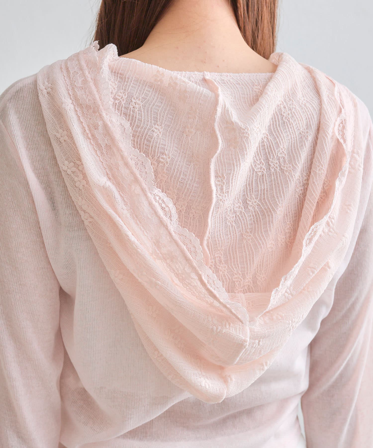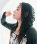 ・透け感のある素材にレースのフード付きで、カジュアルすぎず甘め要素もあるパーカー。