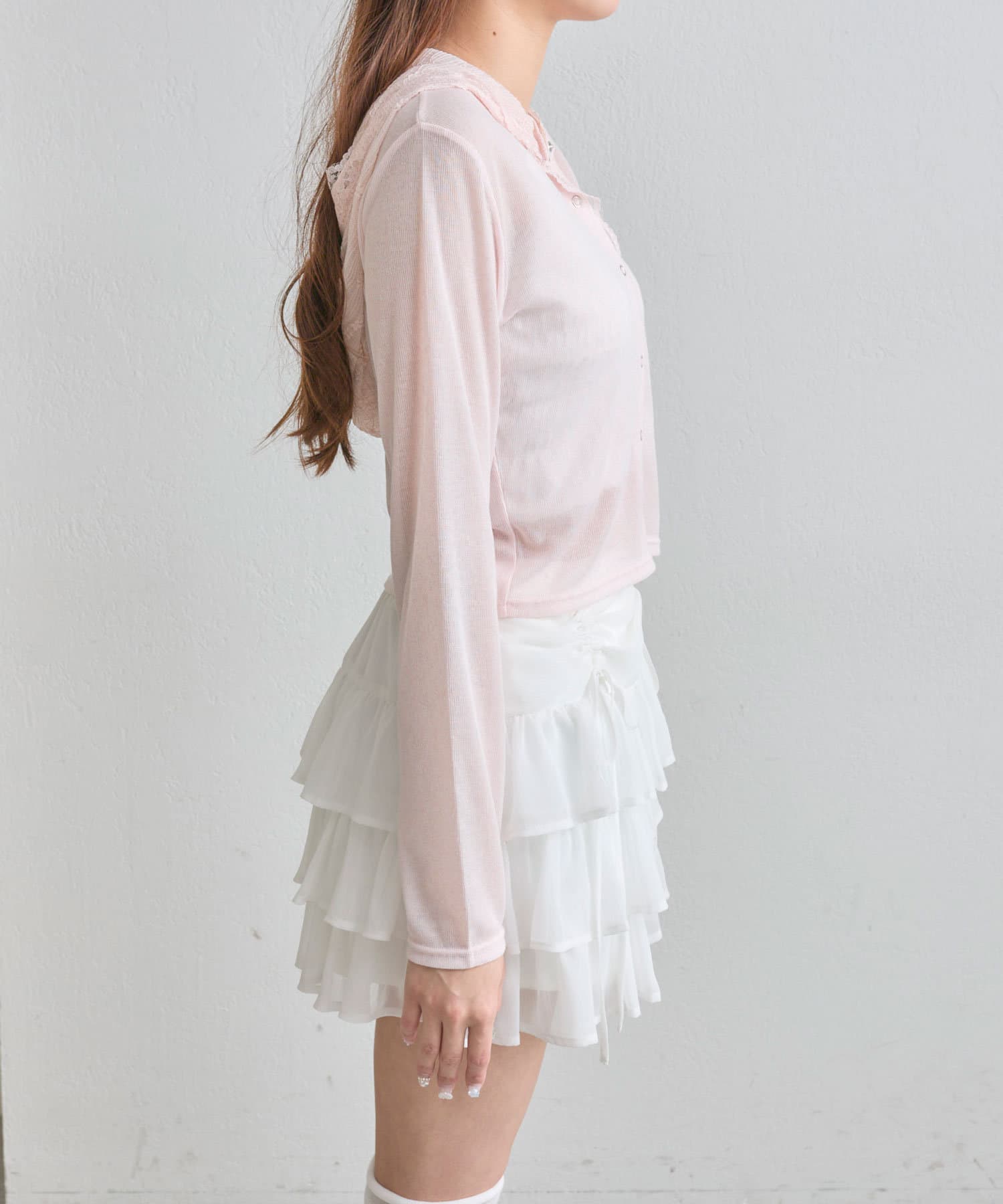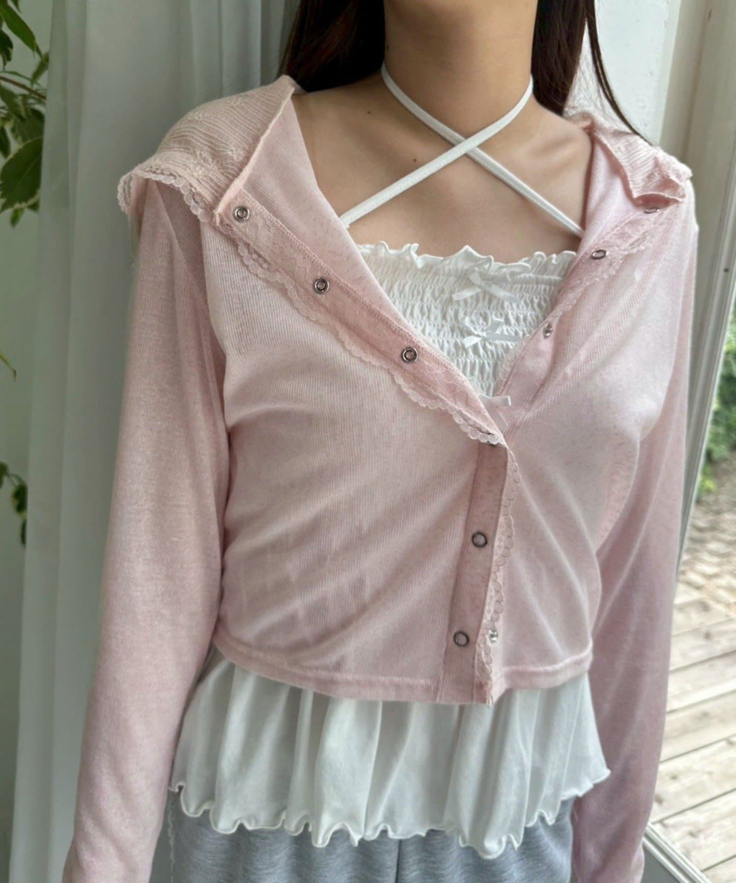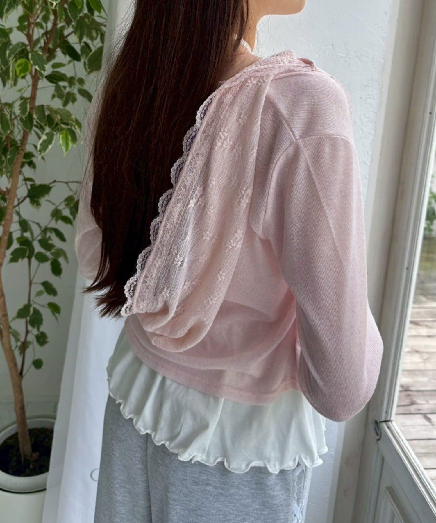 ・透け感のある素材にレースのフード付きで、カジュアルすぎず甘め要素もあるパーカー。