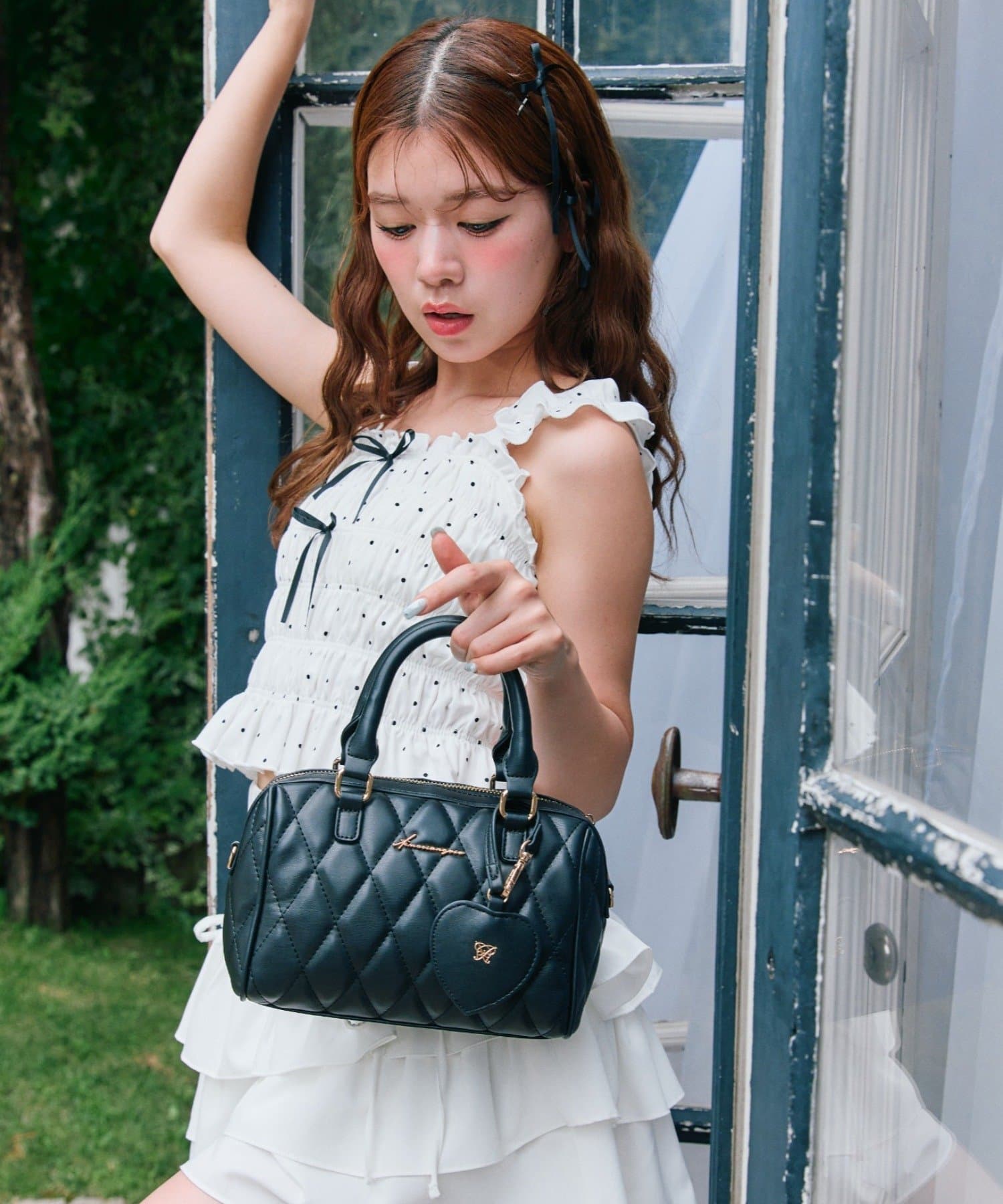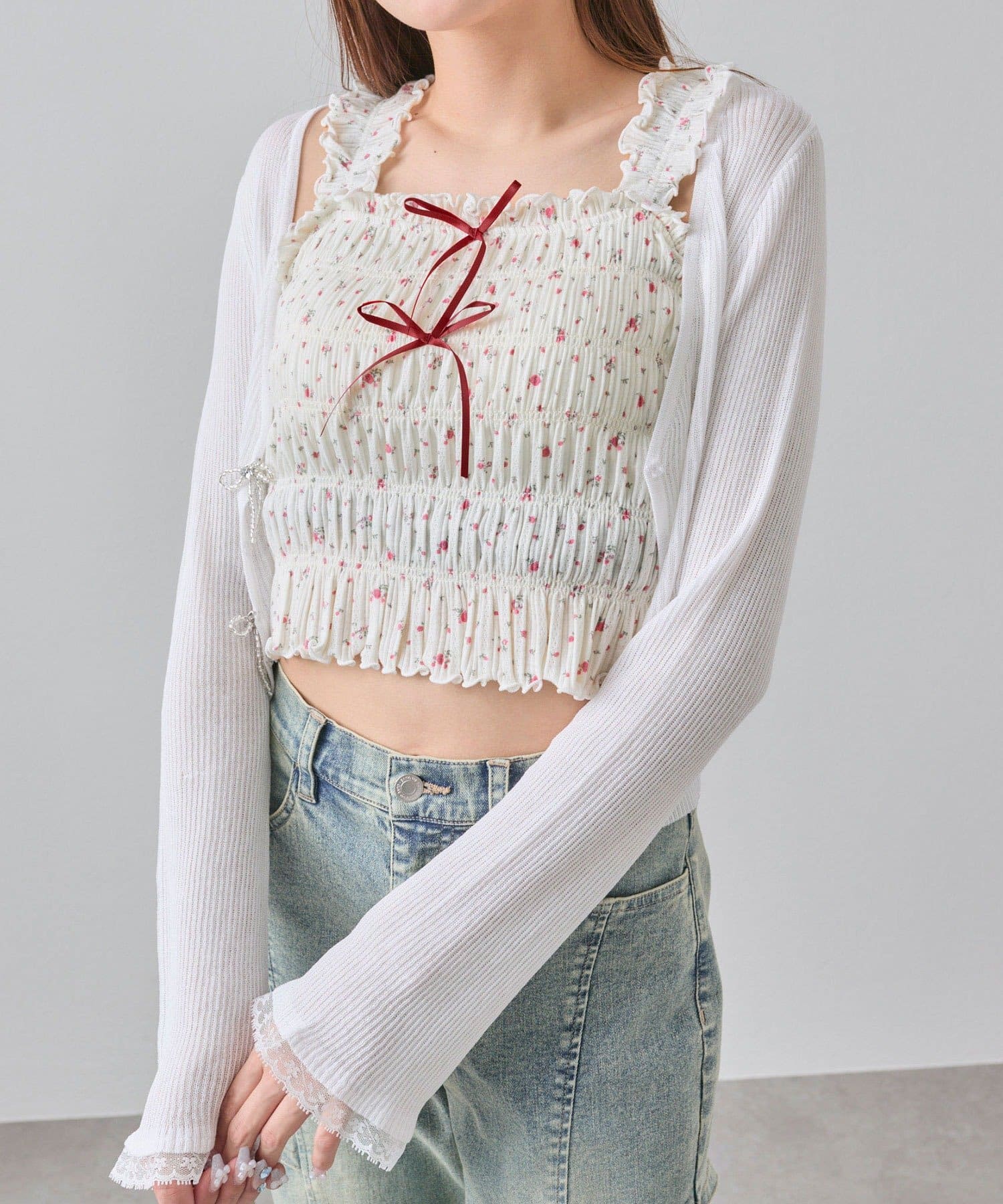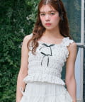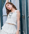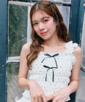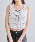 ・肩のフリルと胸元のリボンでガーリーデザインに仕上げました。