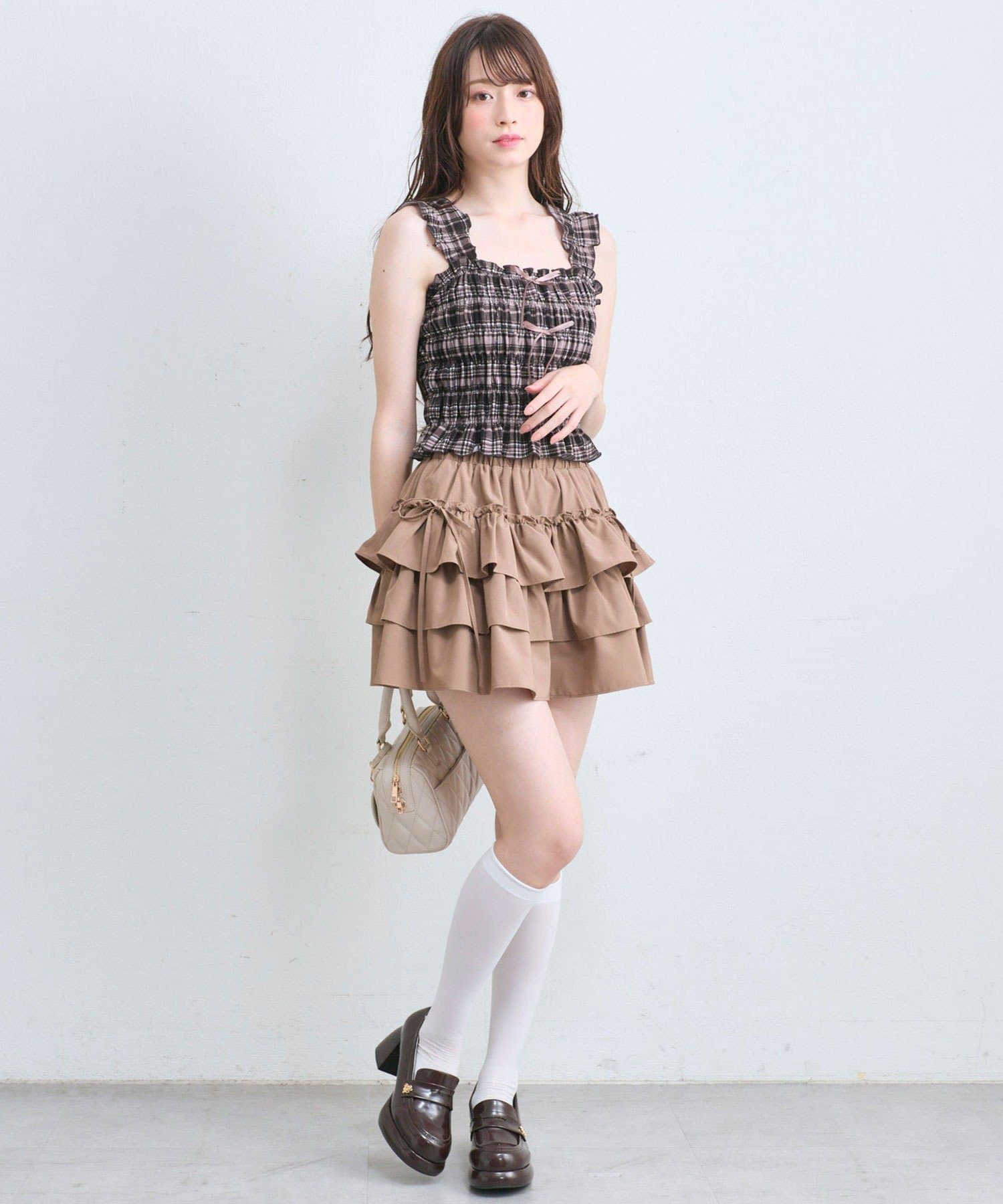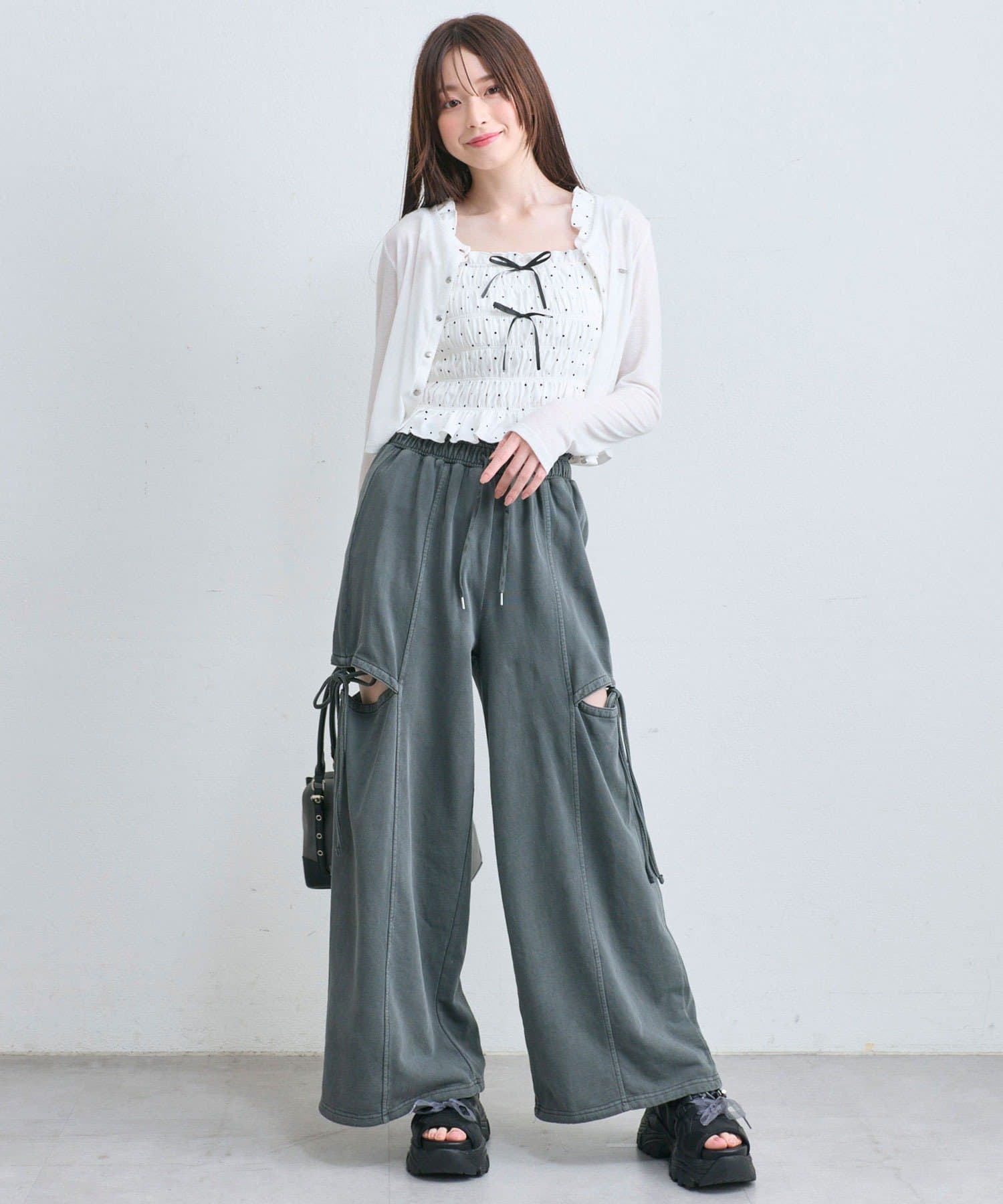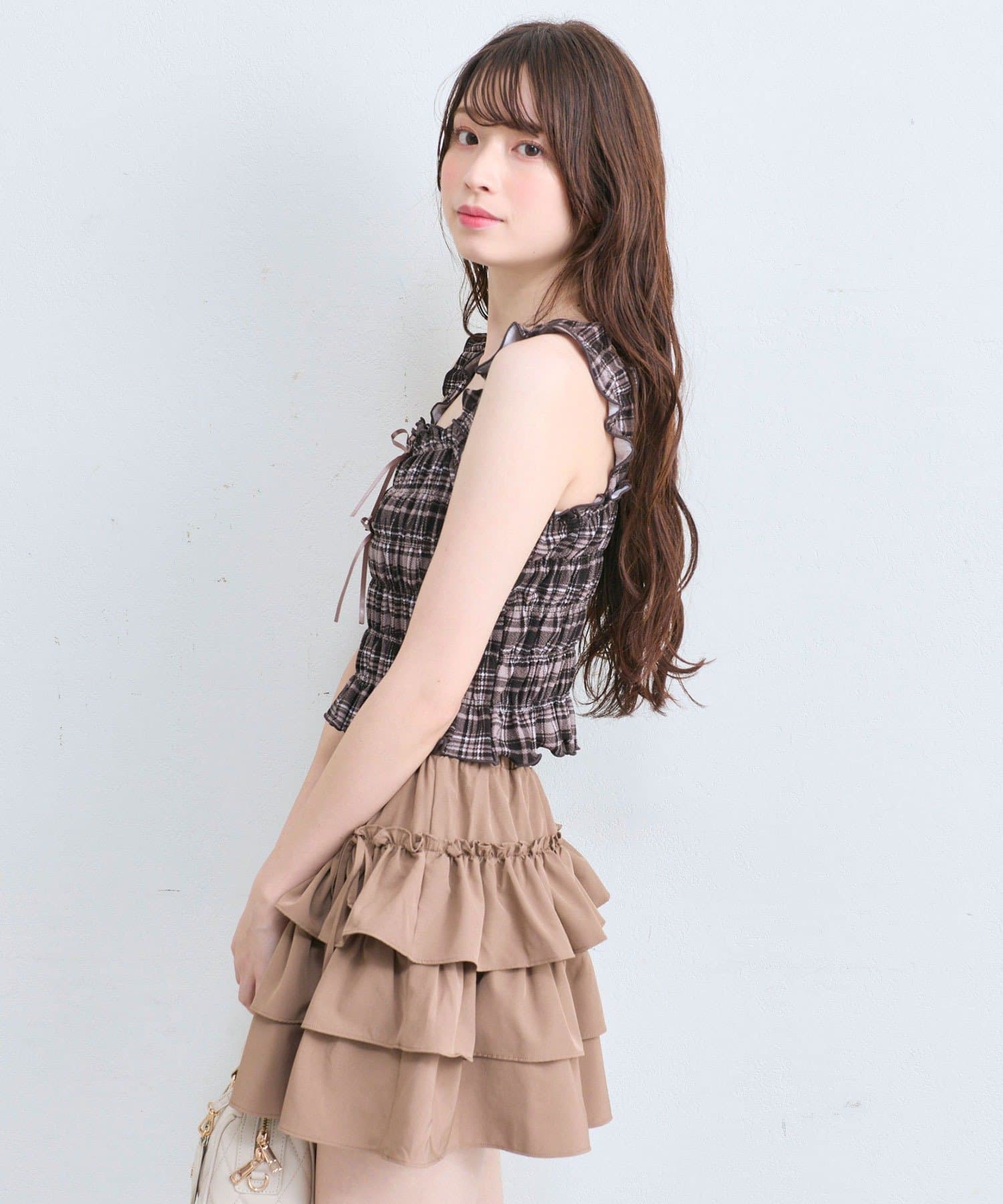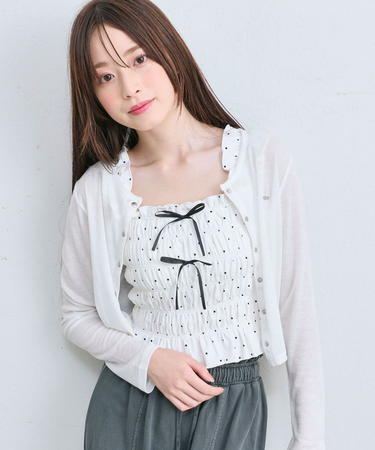 ・肩紐部分は厚みが出にくいフリルなので、カーディガンやシャツなどを羽織りやすいです。