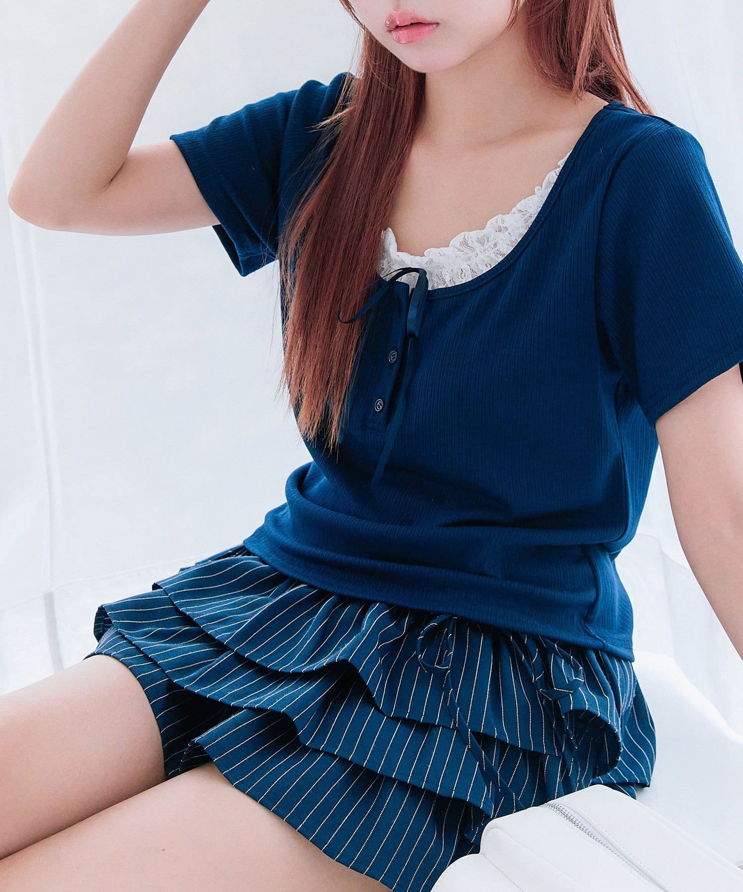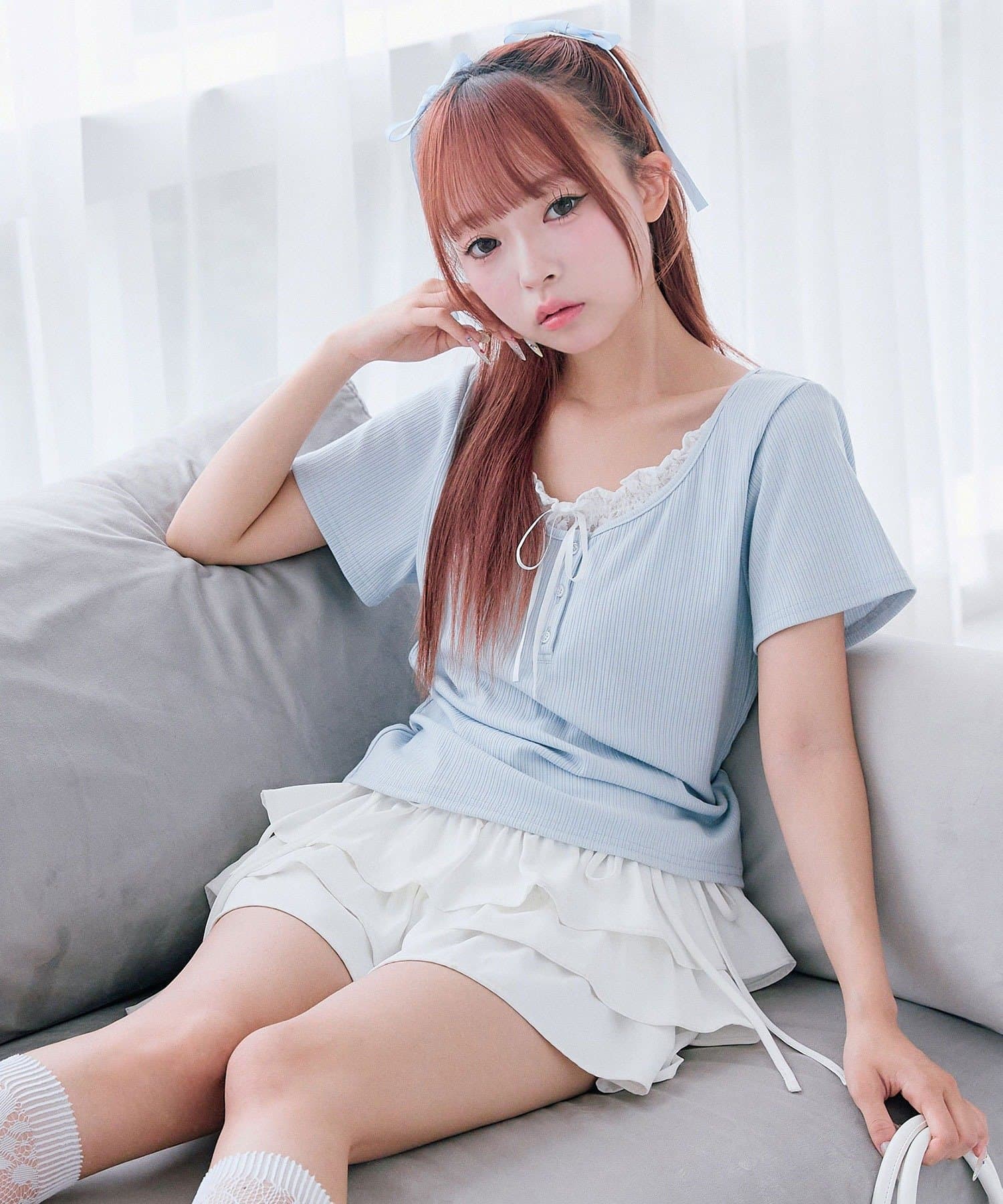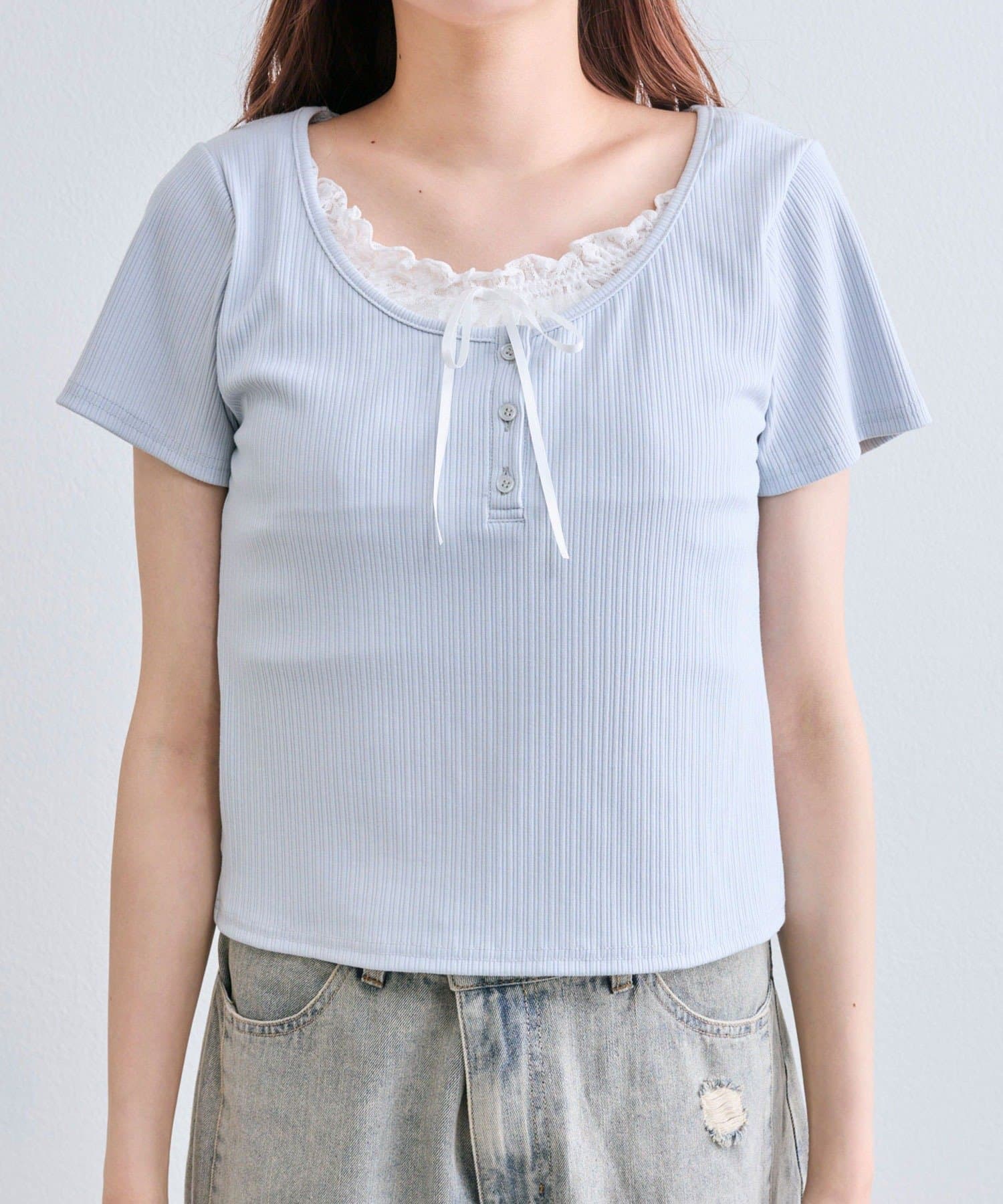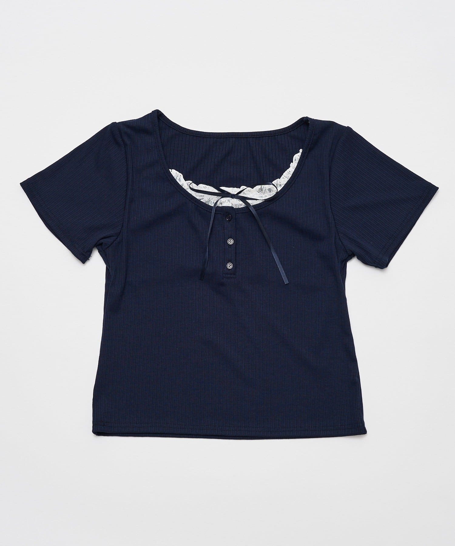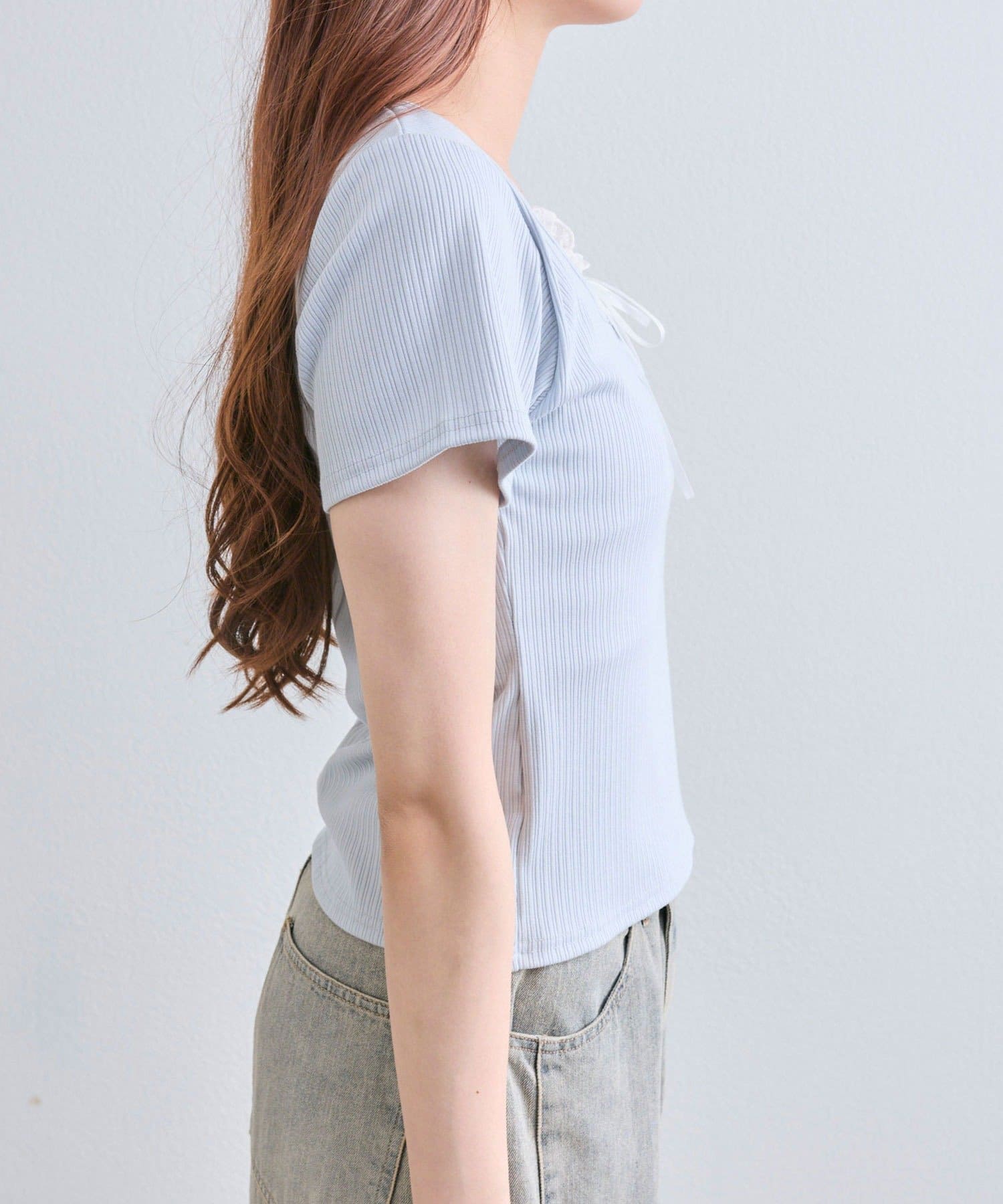 ・リボン付きのレースインナーがくっついたデザインで、1枚でレイヤードコーデが完成します。