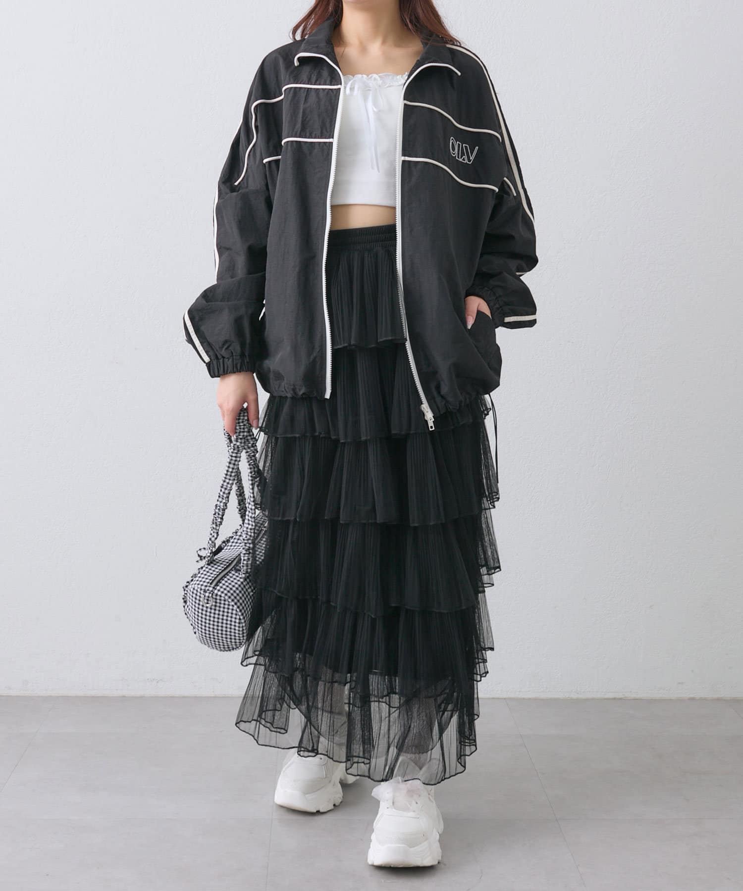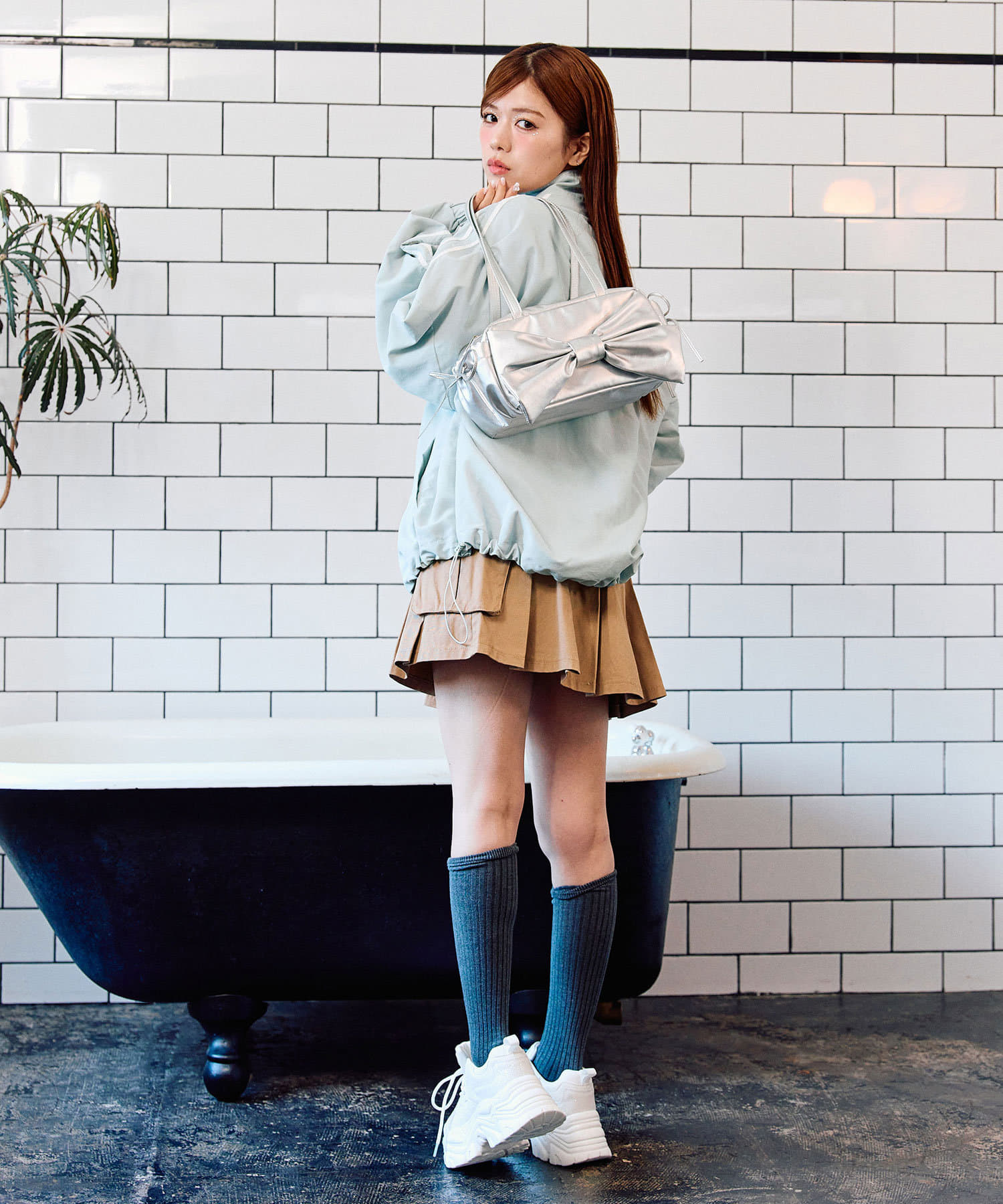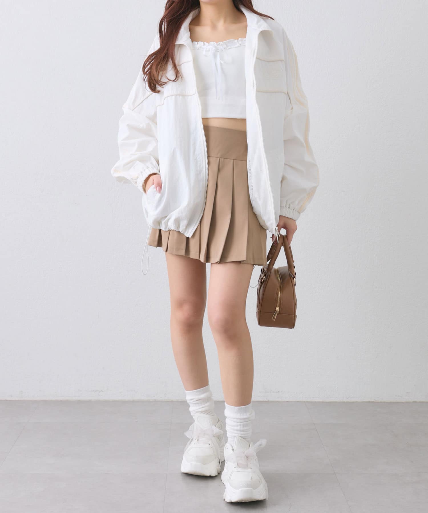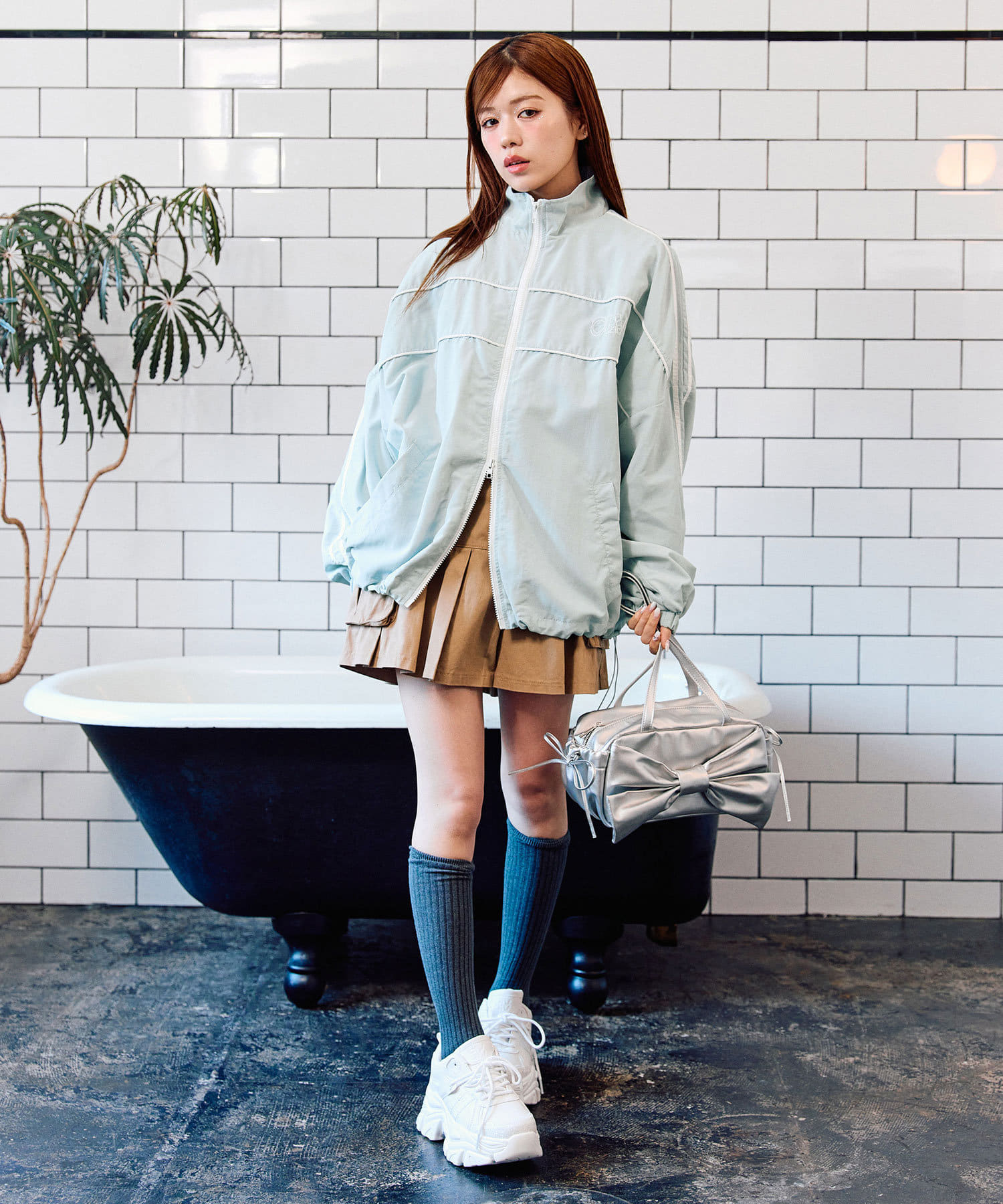・足元はハイソックスに厚底スニーカーがおすすめ。