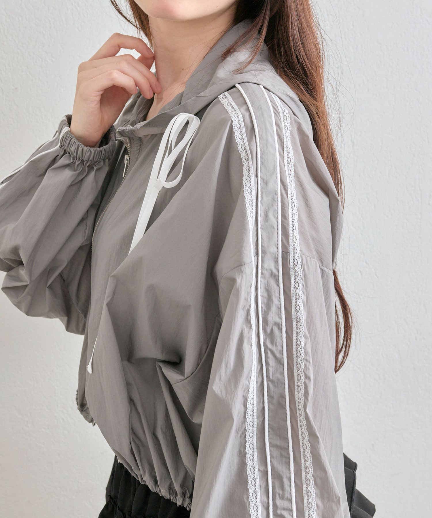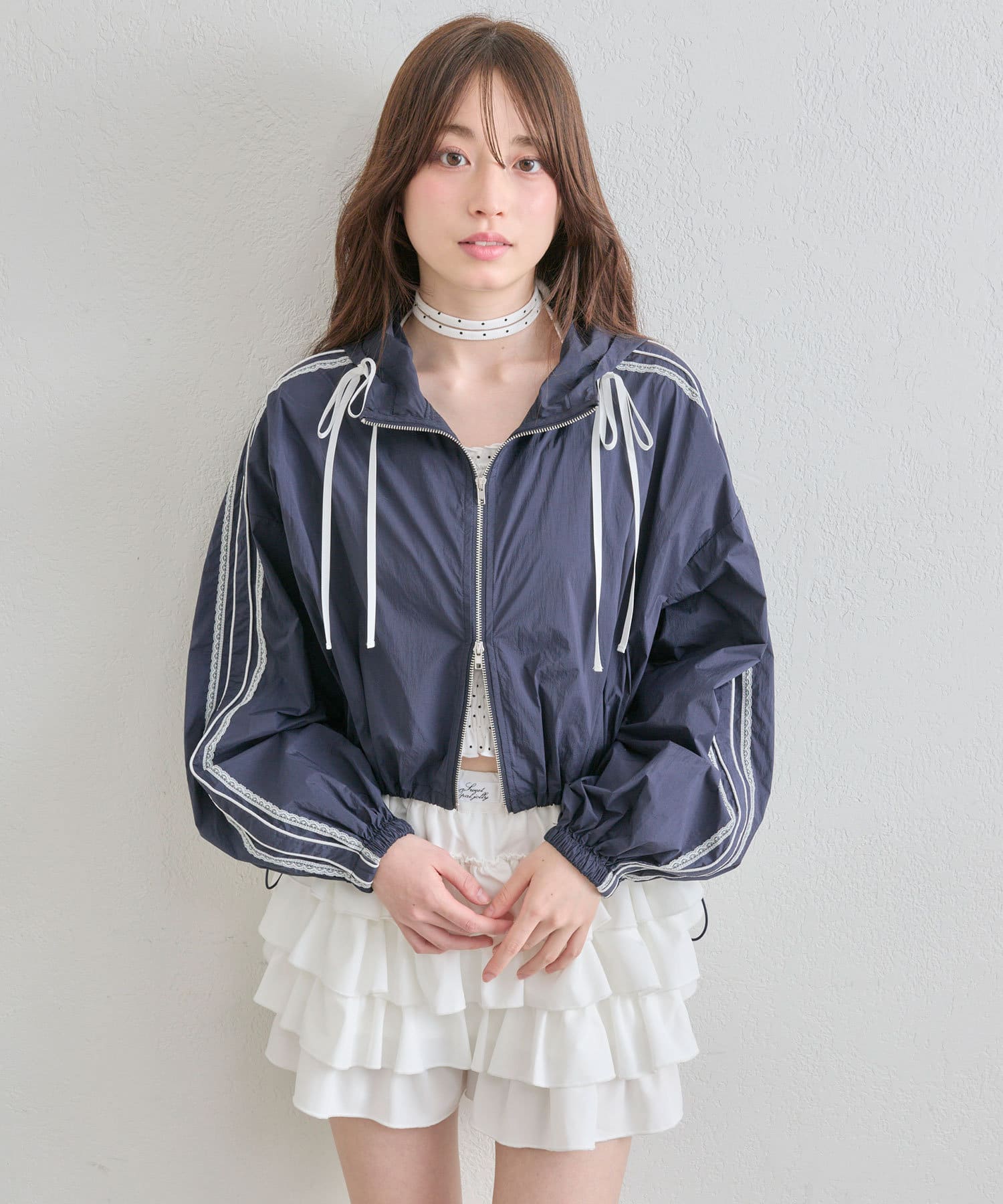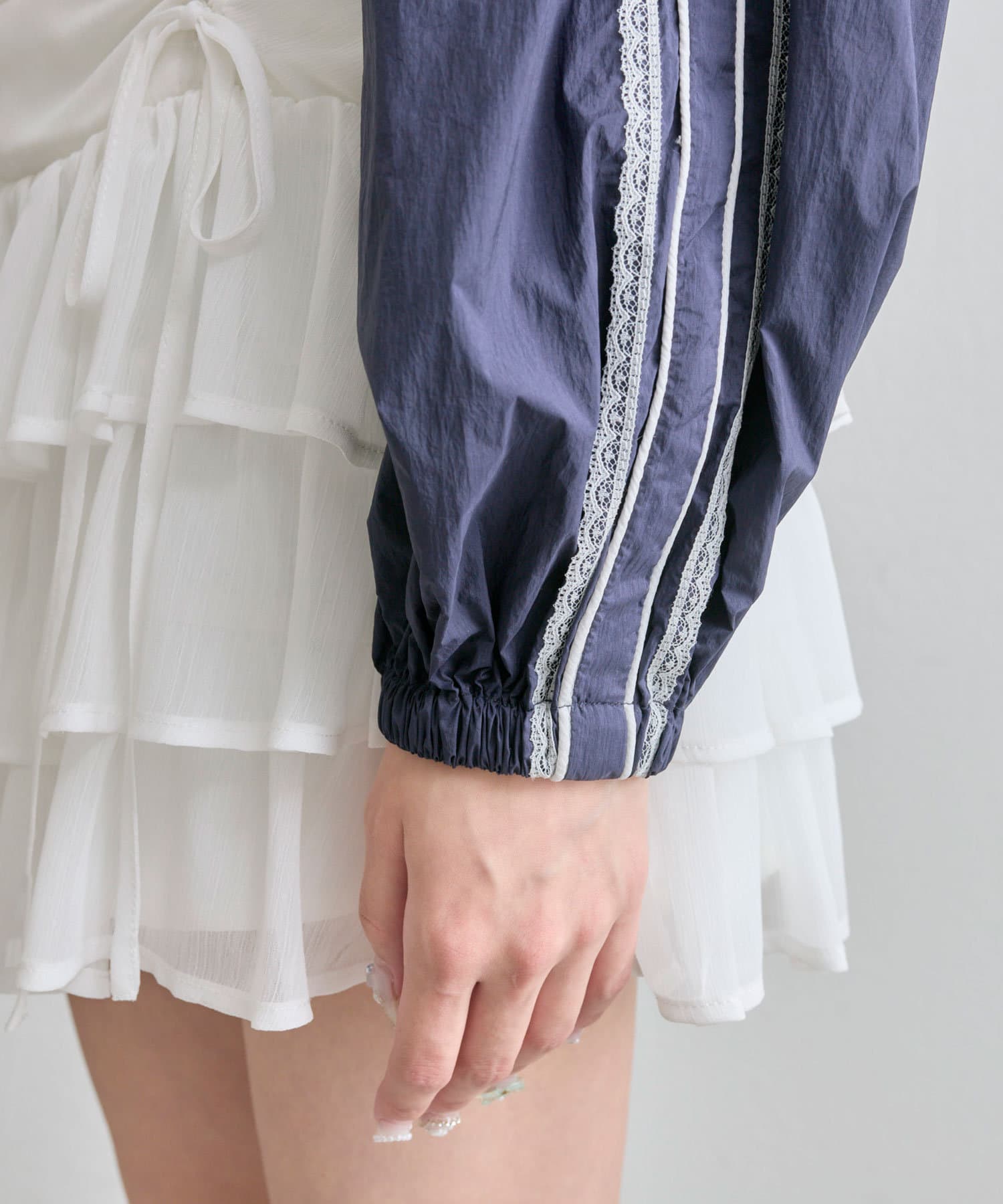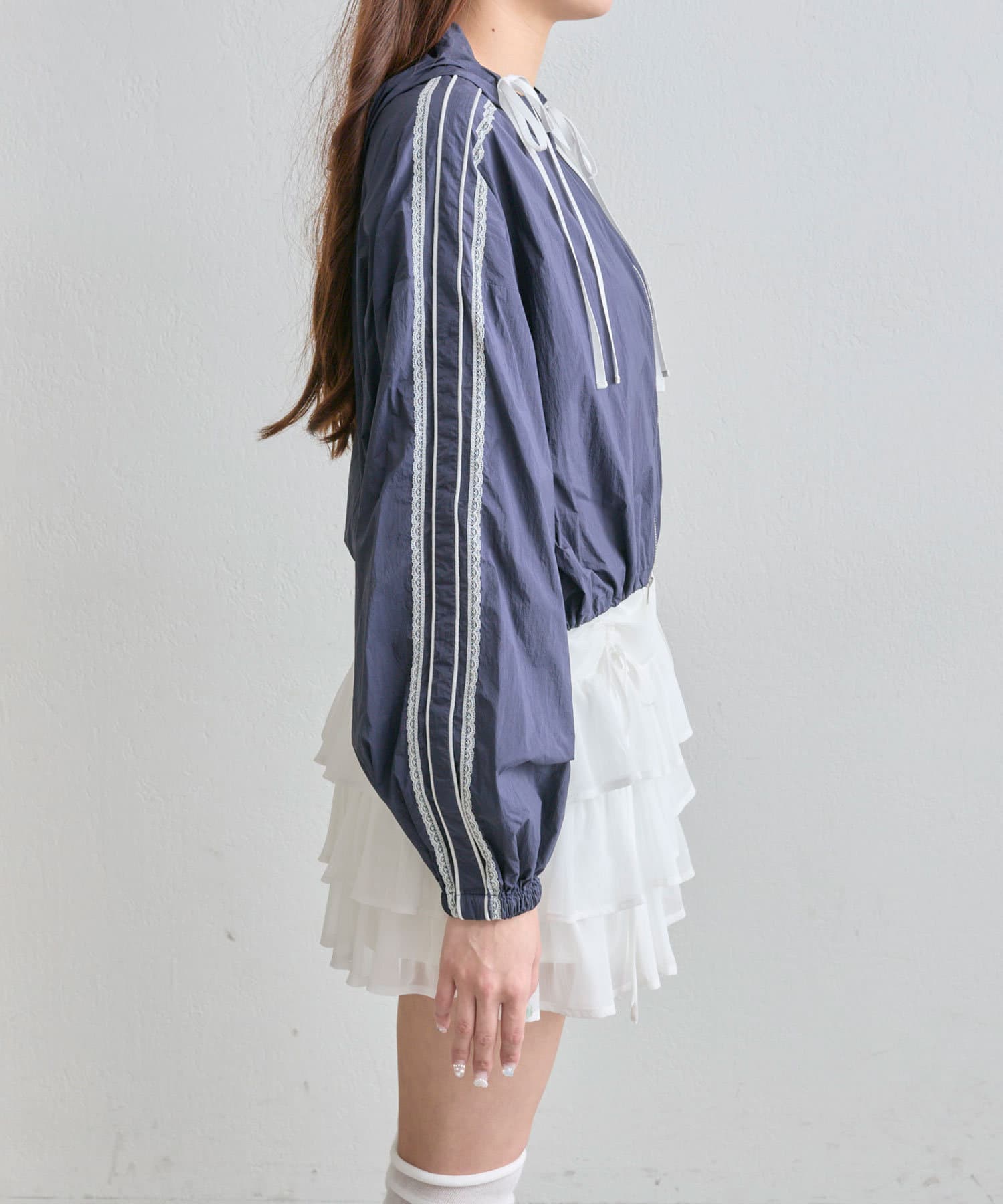 ・スポーティになりがちなブルゾンですが、袖のラインをレースにしたりリボンを施すことでガーリー要素をプラスしたデザインです。