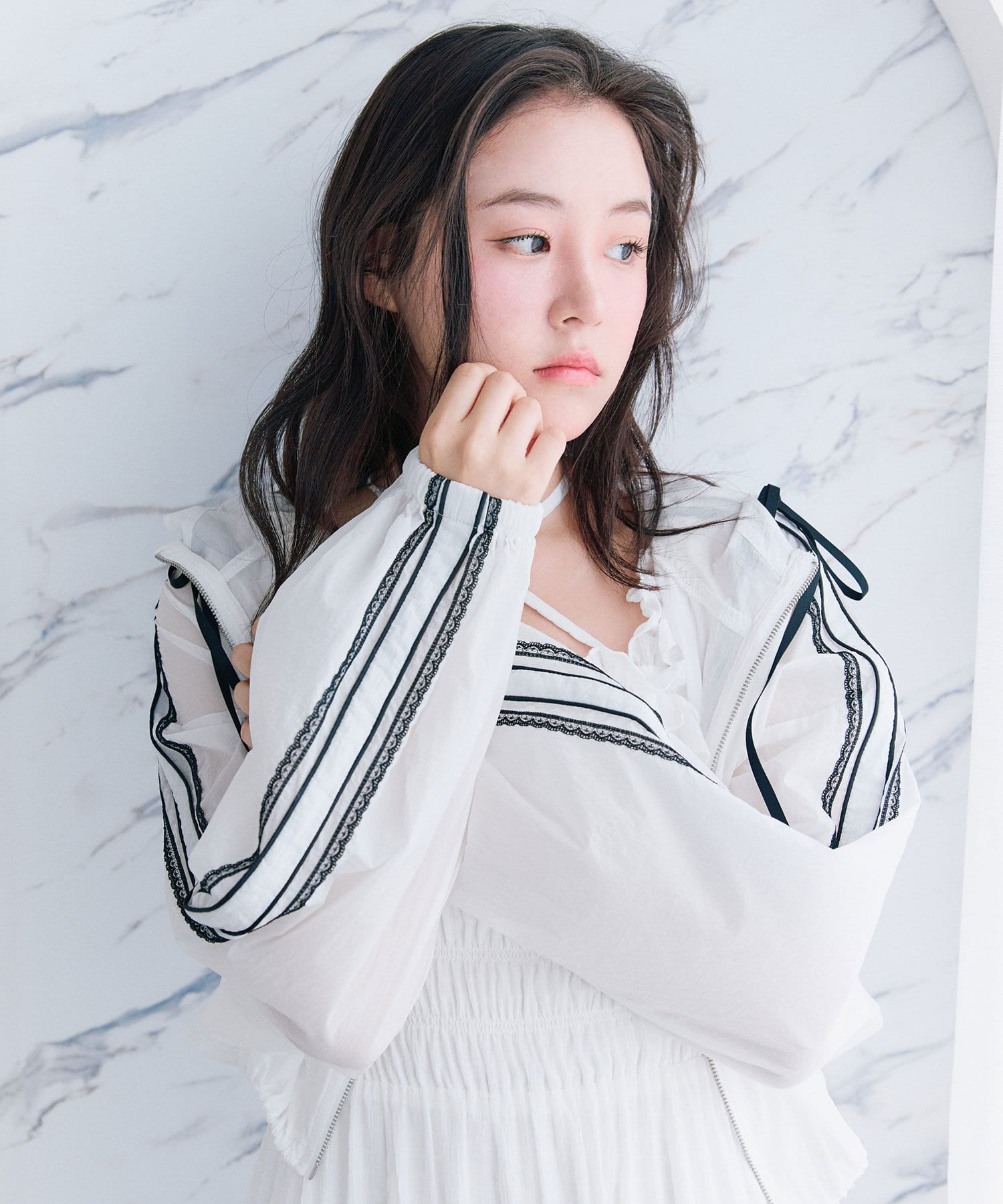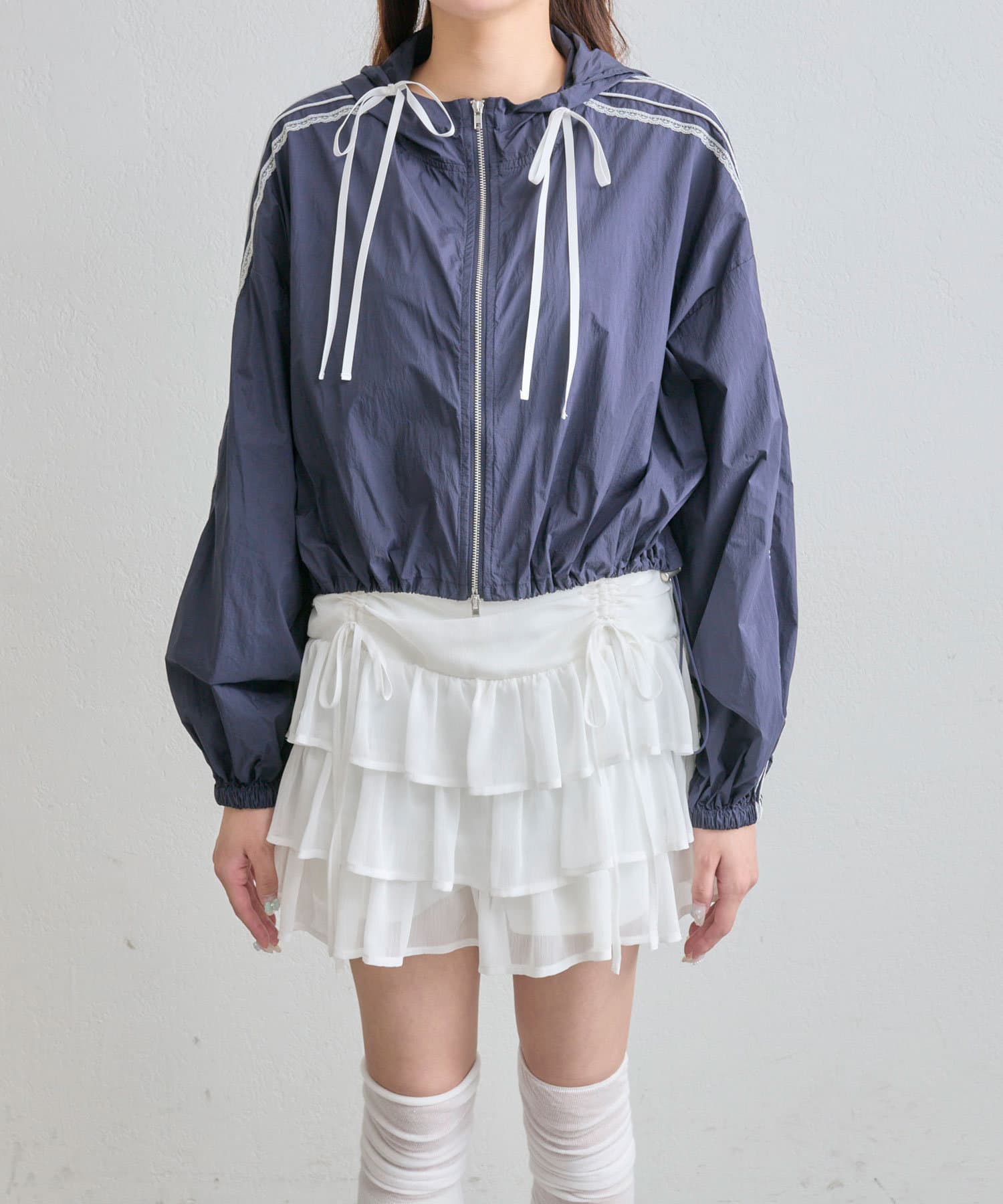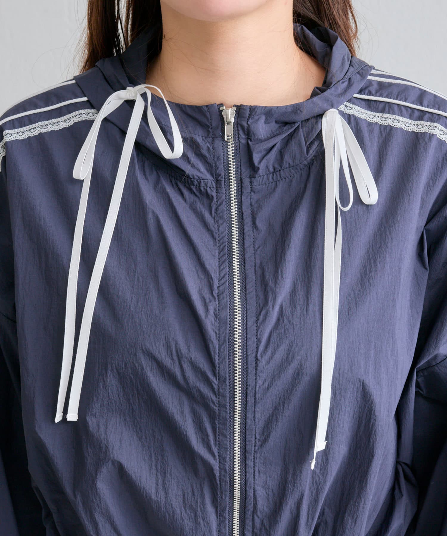 ・スポーティになりがちなブルゾンですが、袖のラインをレースにしたりリボンを施すことでガーリー要素をプラスしたデザインです。