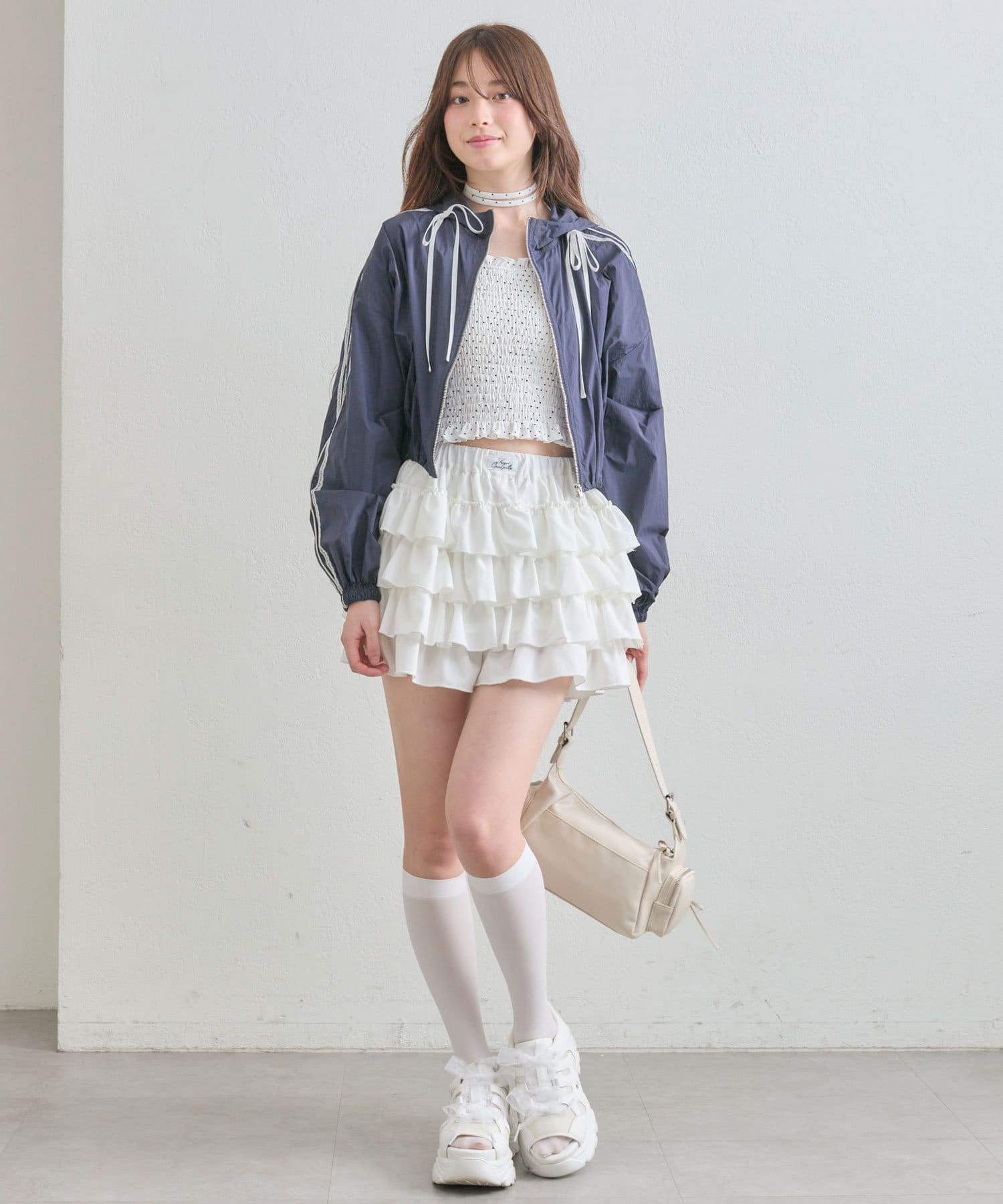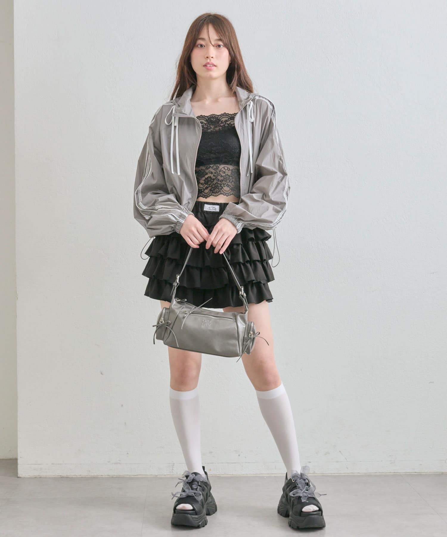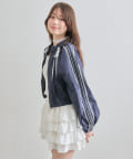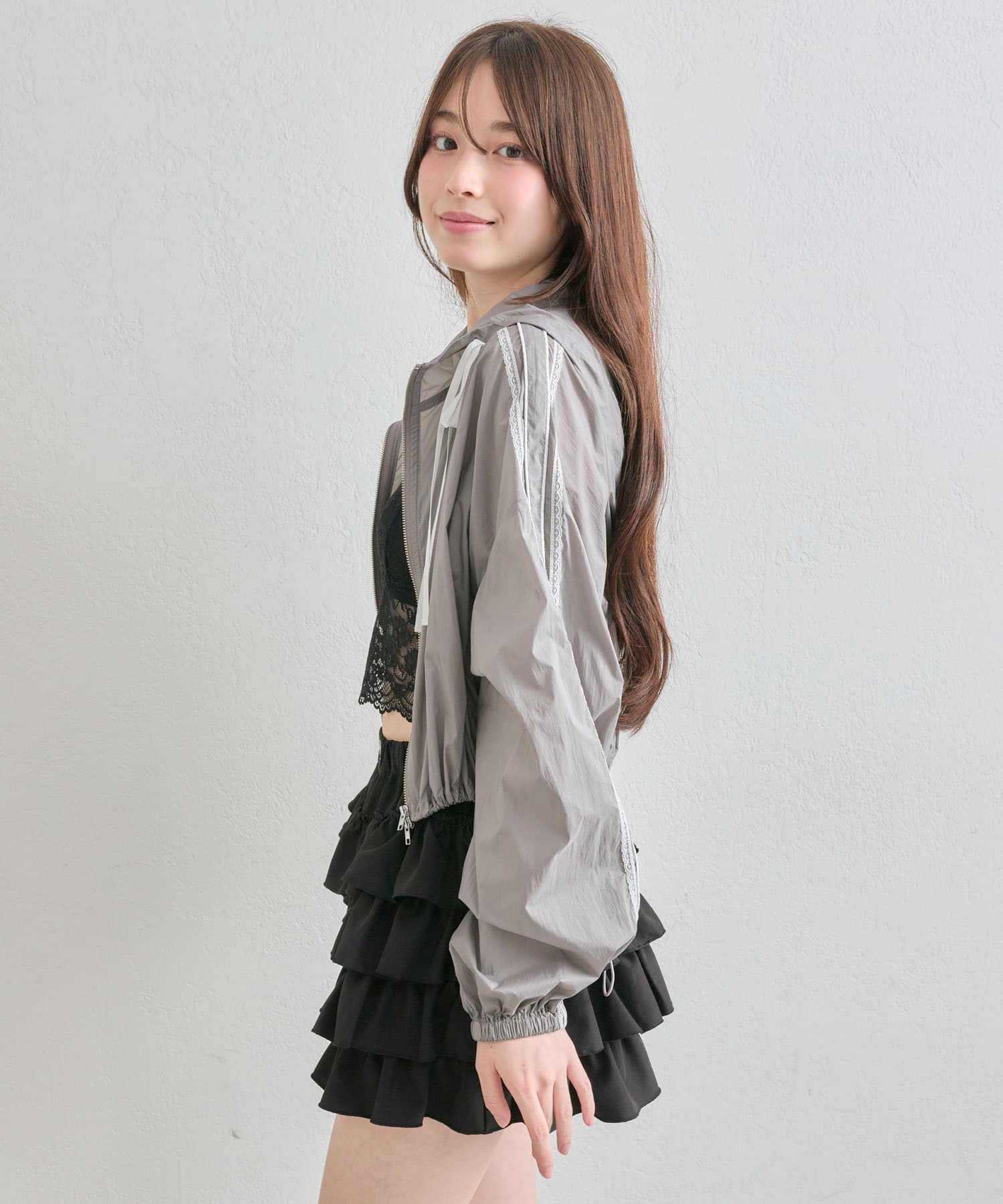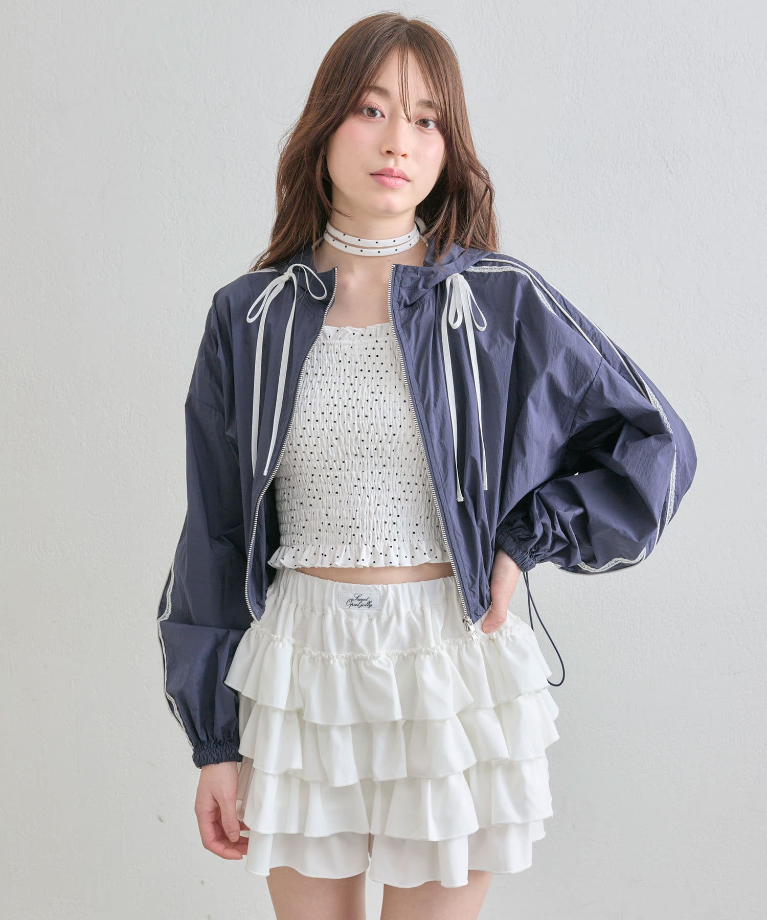 ・スポーティになりがちなブルゾンですが、袖のラインをレースにしたりリボンを施すことでガーリー要素をプラスしたデザインです。
