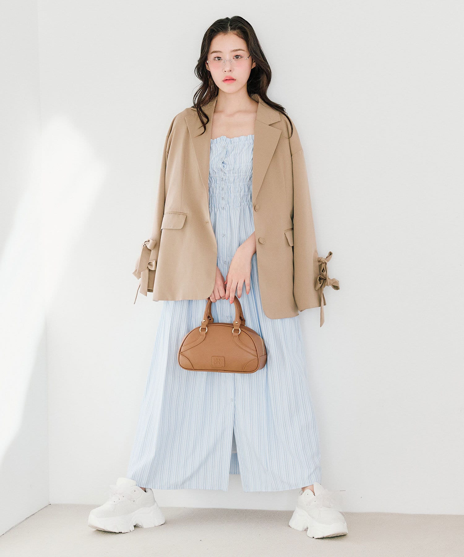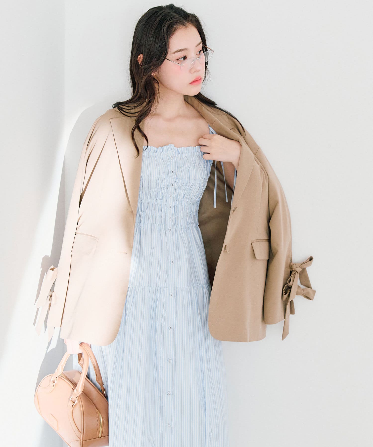 ・アイボリーは小花柄、サックスはストライプ、オフとブラックは無地で春にぴったりなカラー展開です。