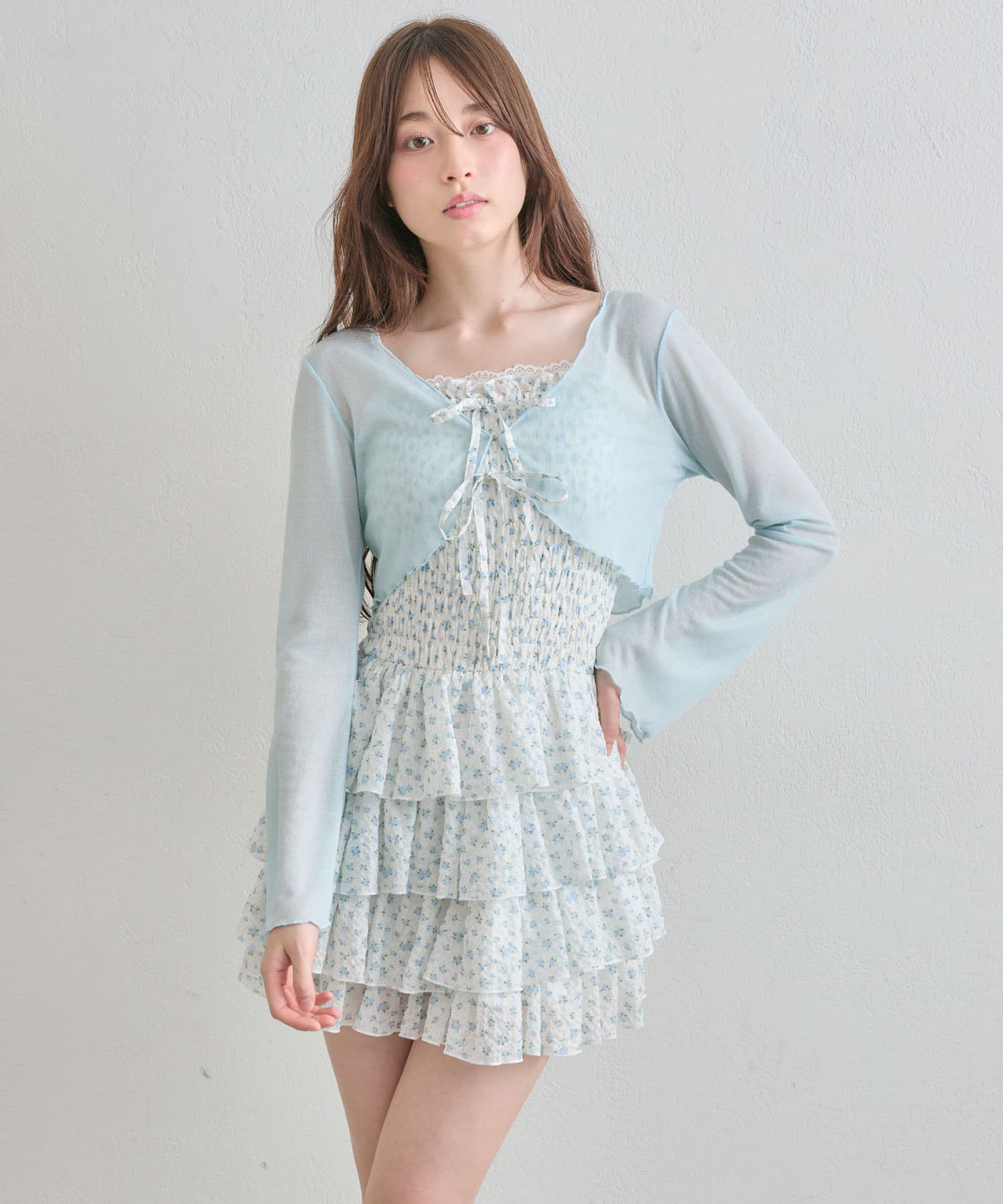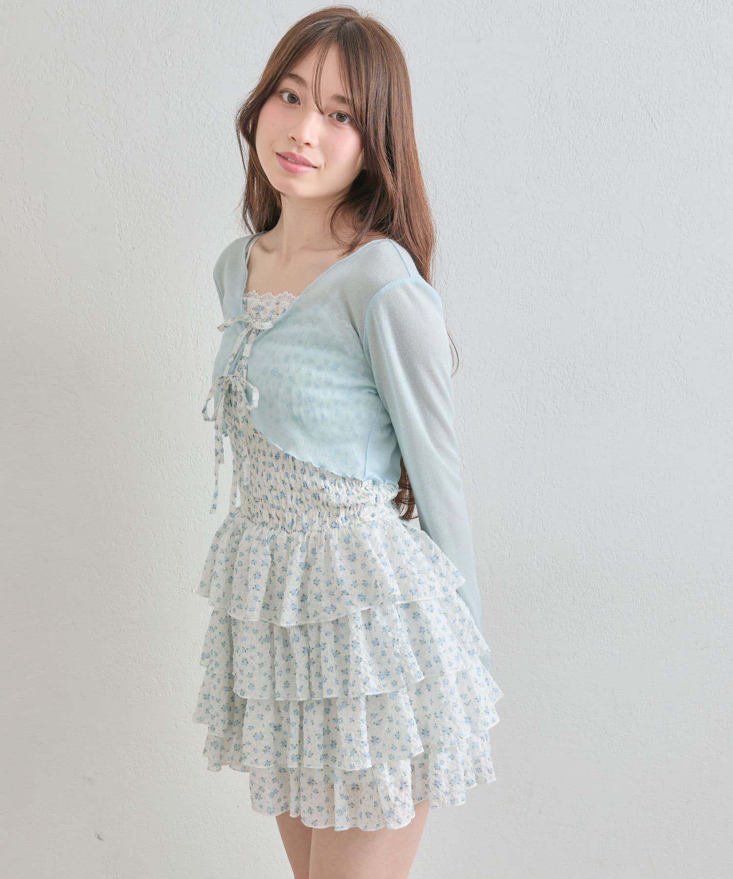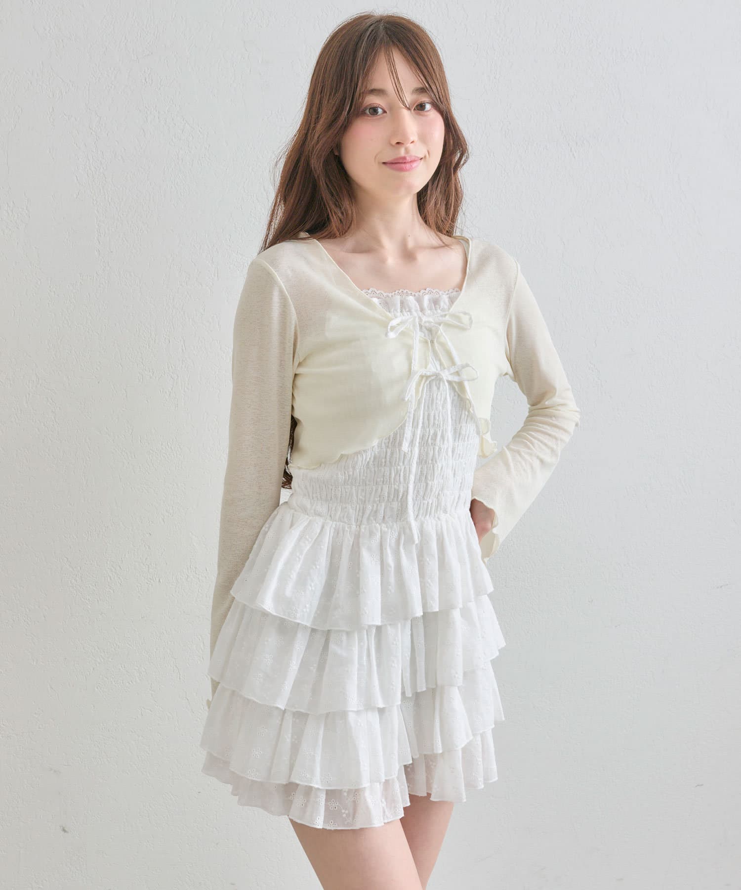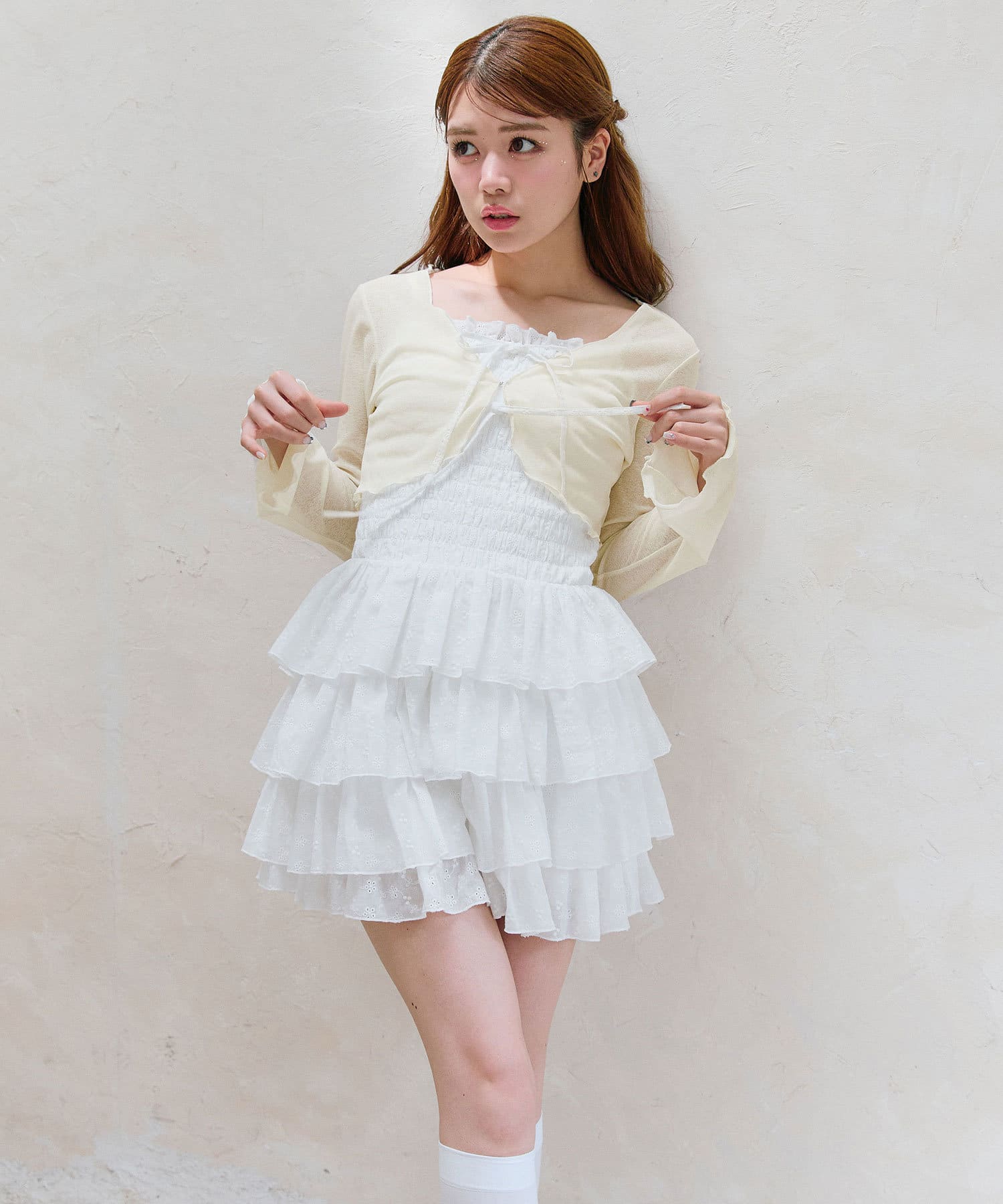・程よい透け感のボレロと、ふわっと広がるシルエットがかわいいキャミワンピースのセット。