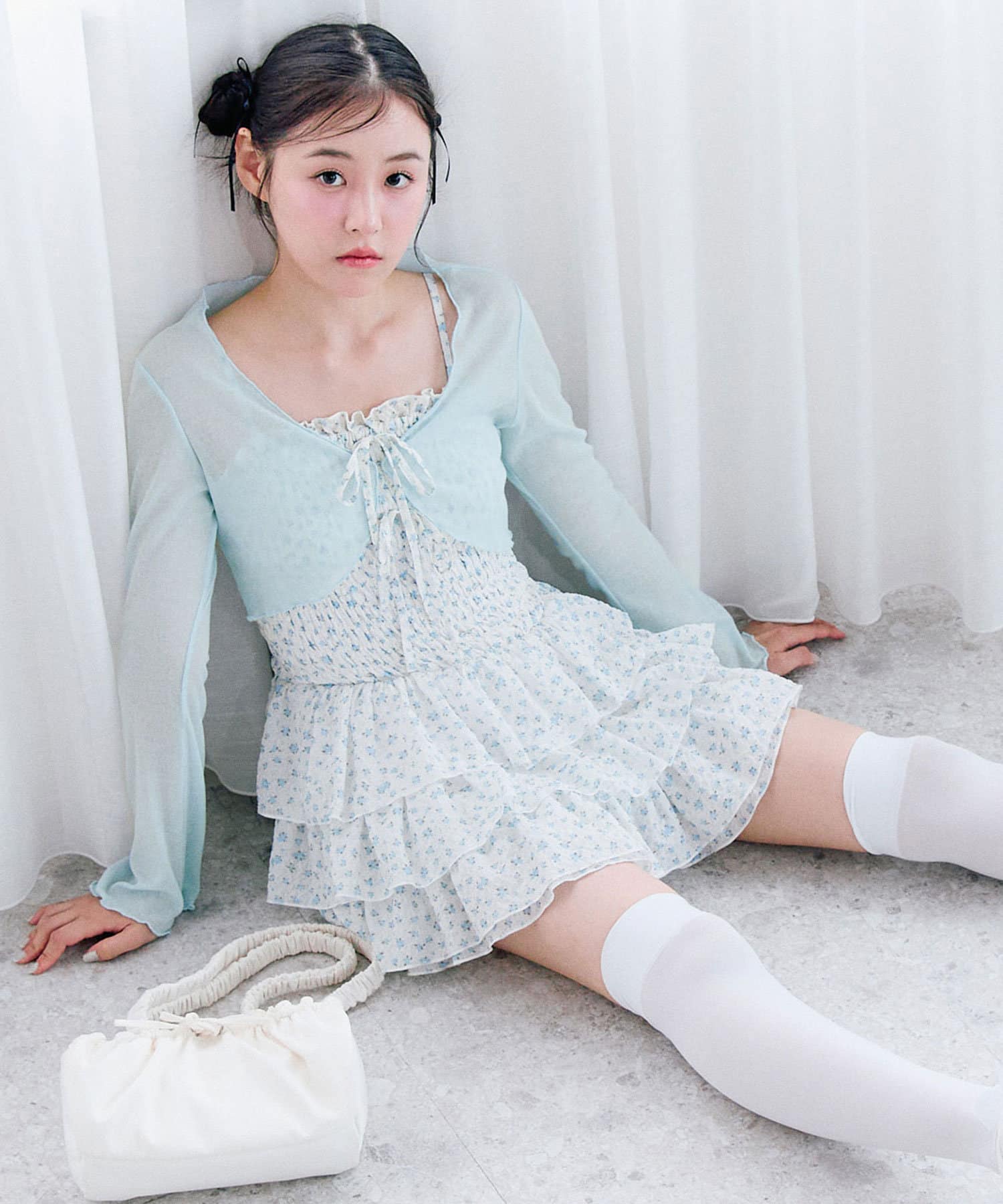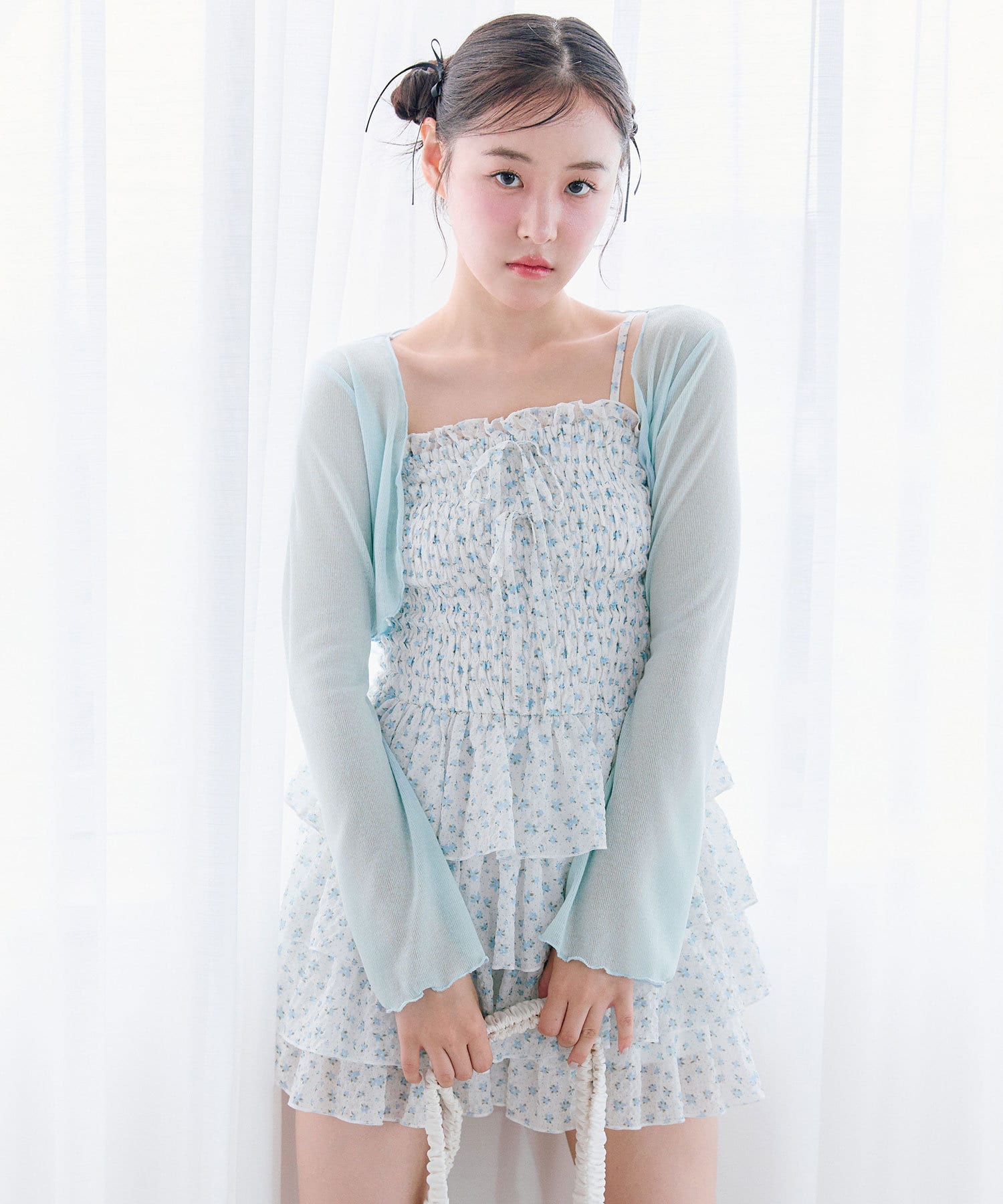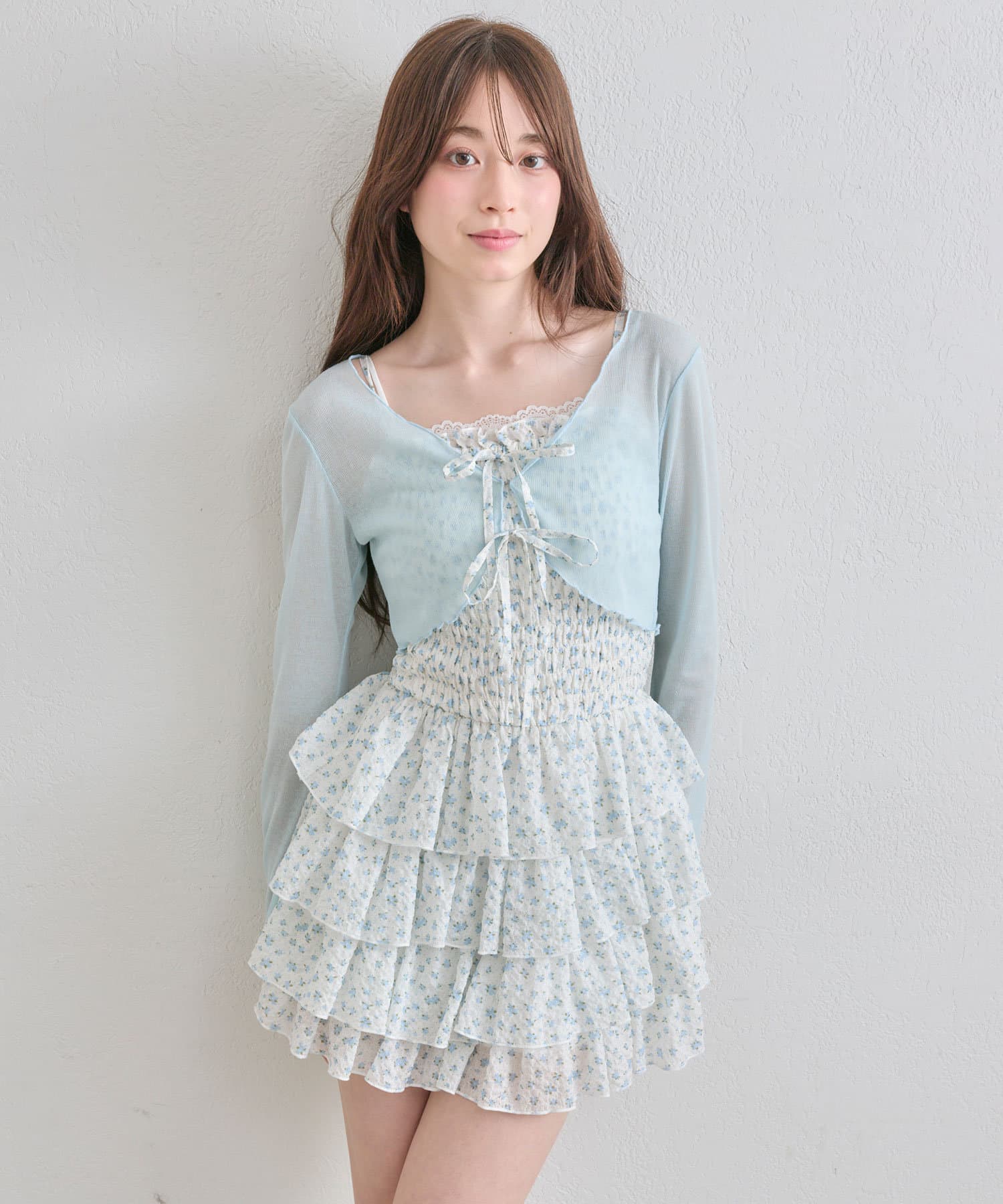 ・程よい透け感のボレロと、ふわっと広がるシルエットがかわいいキャミワンピースのセット。