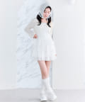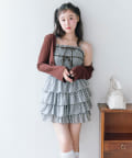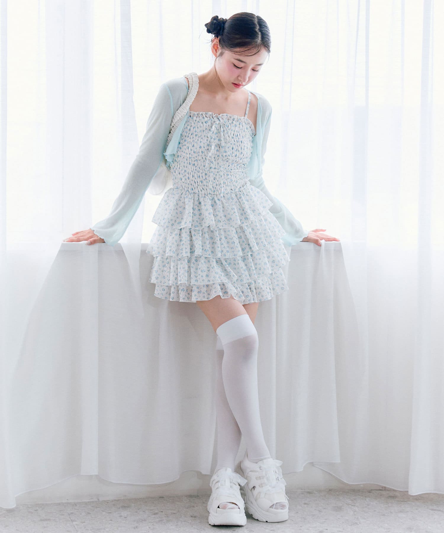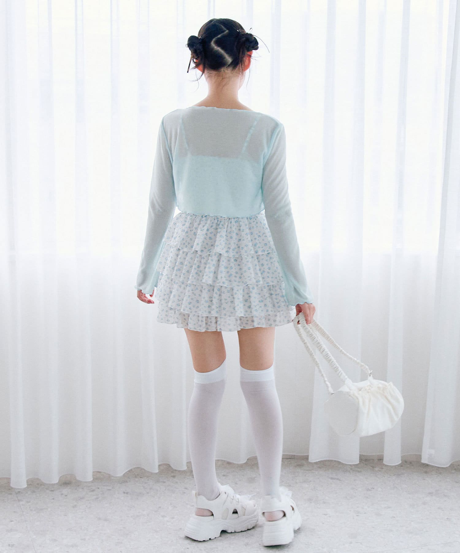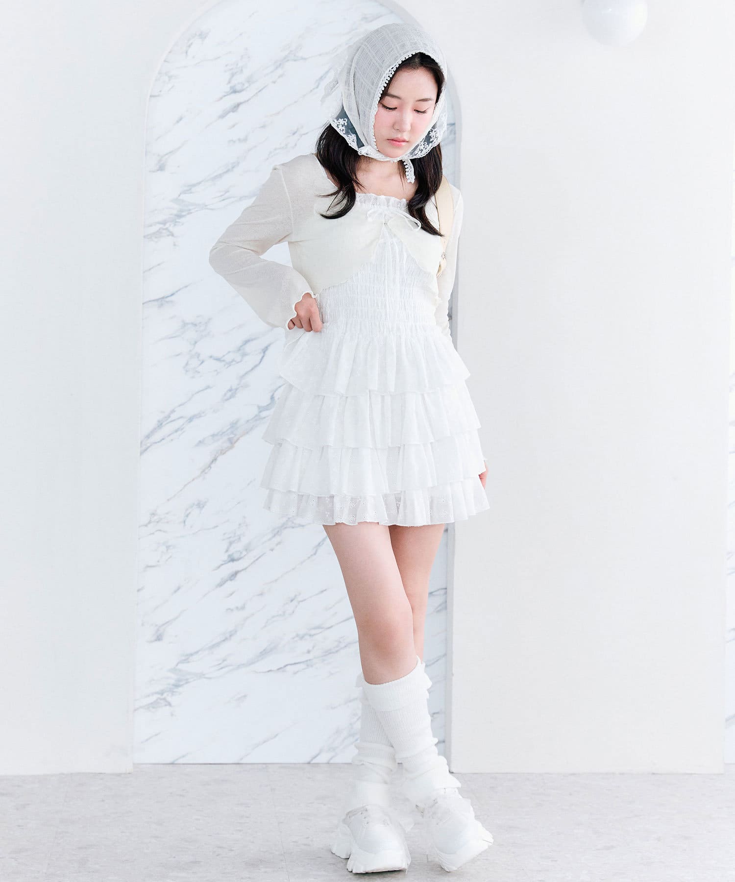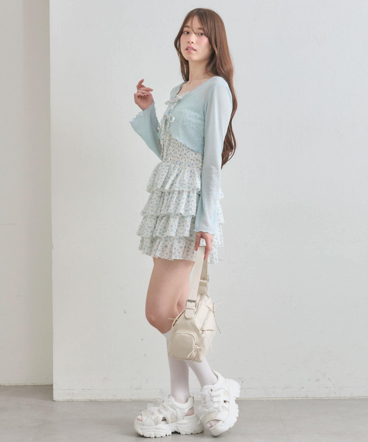 ・程よい透け感のボレロと、ふわっと広がるシルエットがかわいいキャミワンピースのセット。