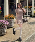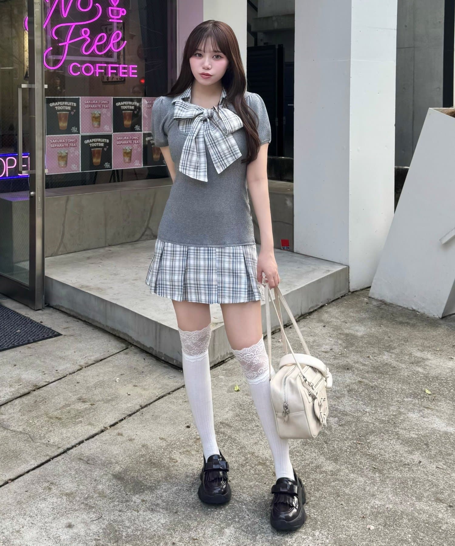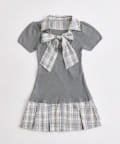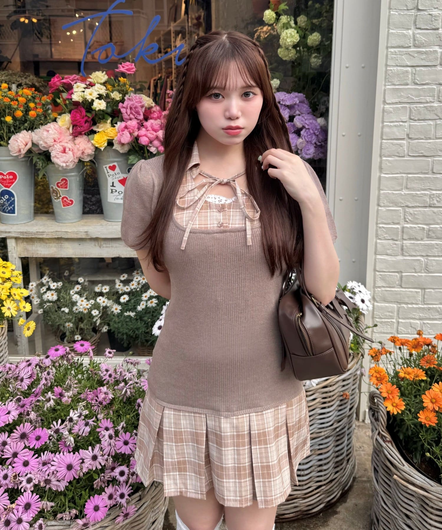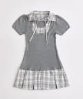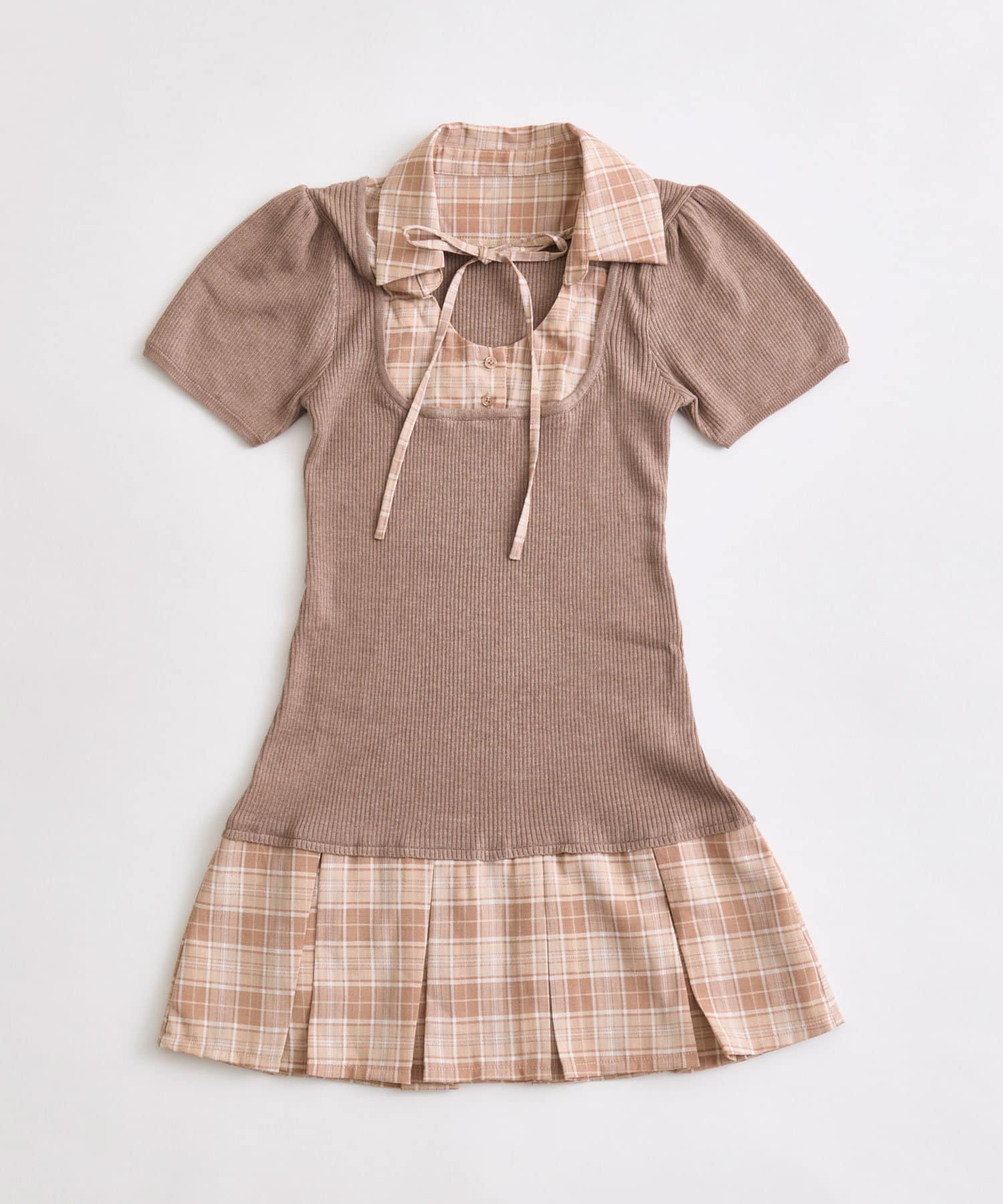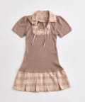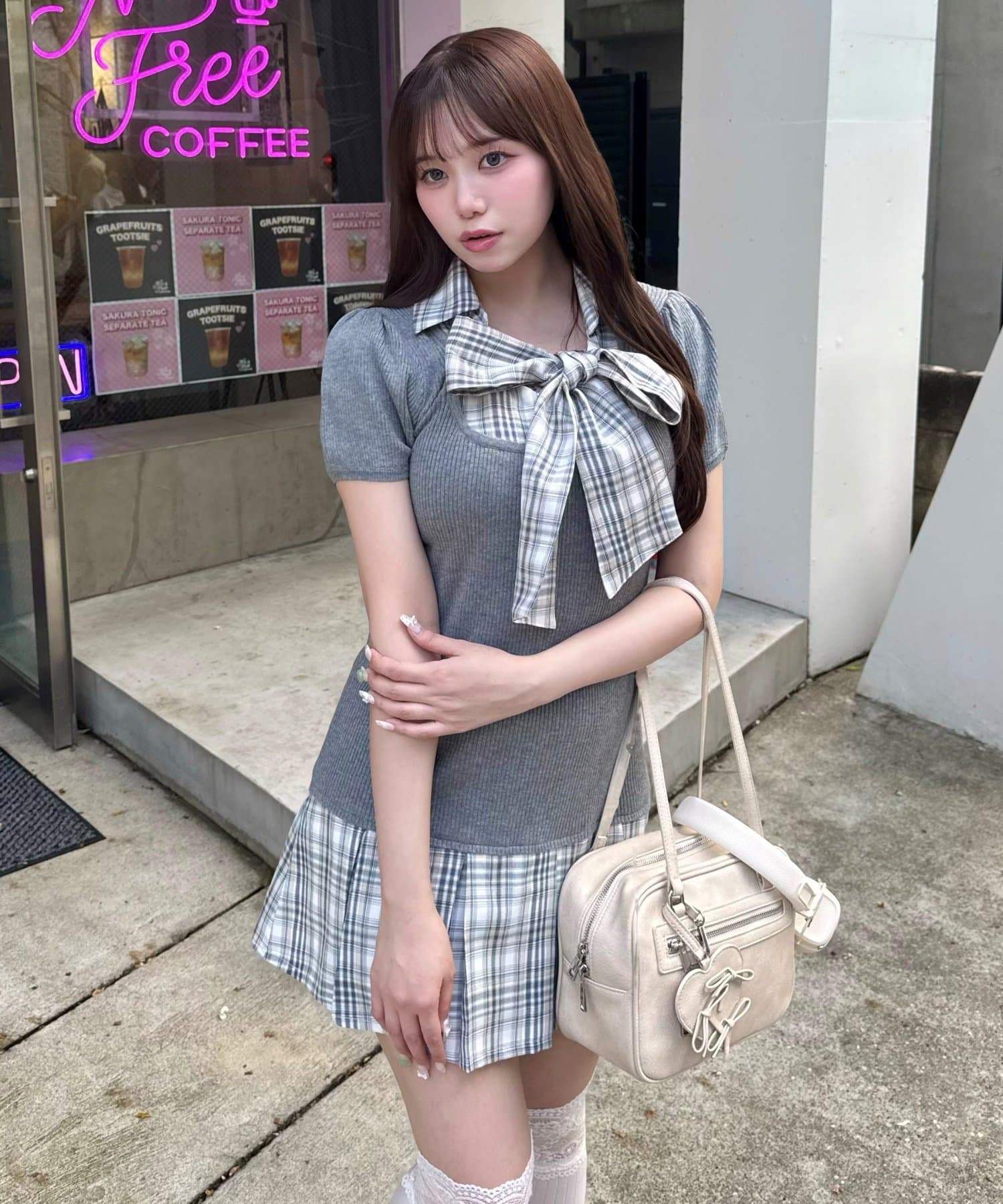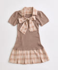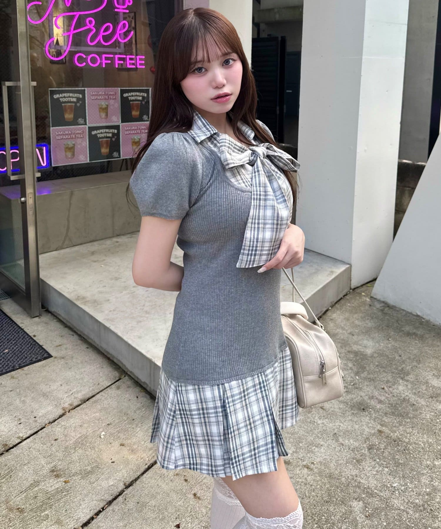 素材 【ニット部分】アクリル55%, 綿45%  【シャツ・スカート部分】[トップグレー]表地: ポリエステル78%, レーヨン17%, ポリウレタン5%  裏地: ポリエステル100%  [ネイビー]表地: ポリエステル80%, 綿20%  裏地: ポリエステル100%  [ブラウン]表地: ポリエステル85%, レーヨン10%, ポリウレタン5%  裏地: ポリエステル100%