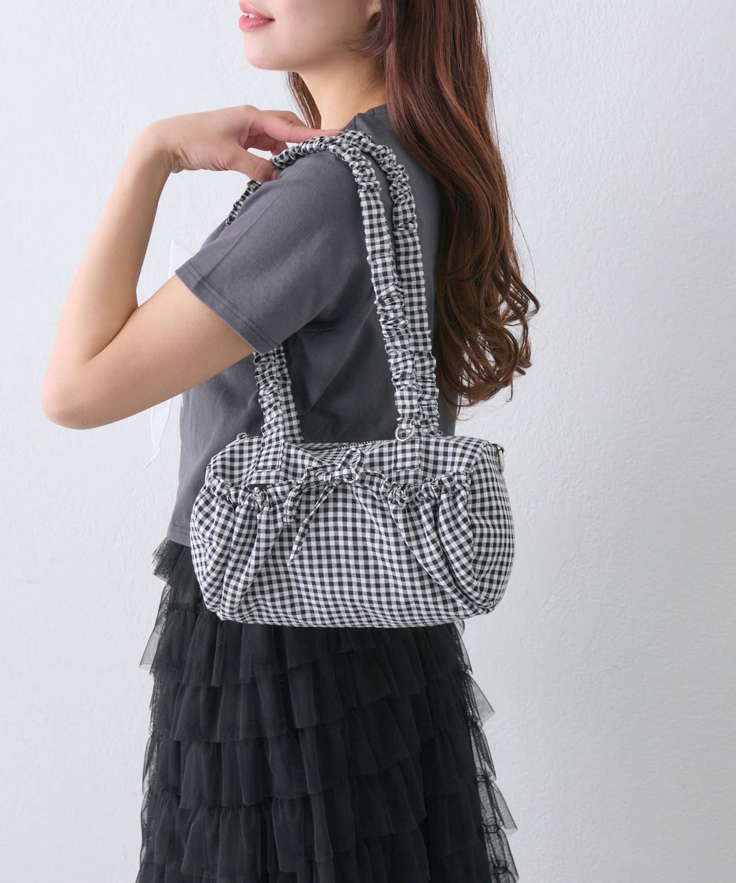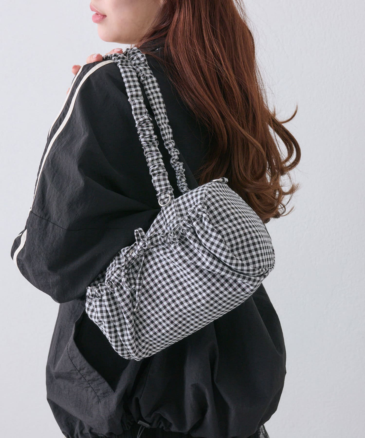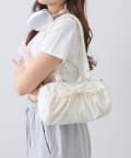 ・取り外し可能なショルダー紐付きで、くしゅくしゅの持ち手は長さがあるので肩掛けしやすいです。